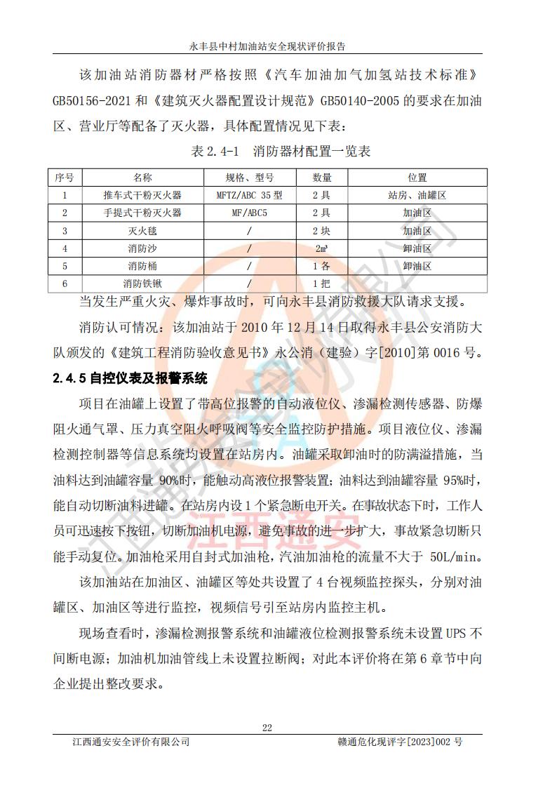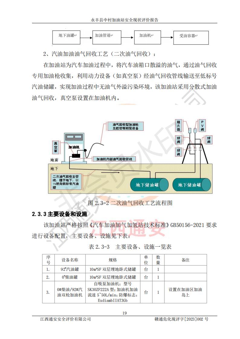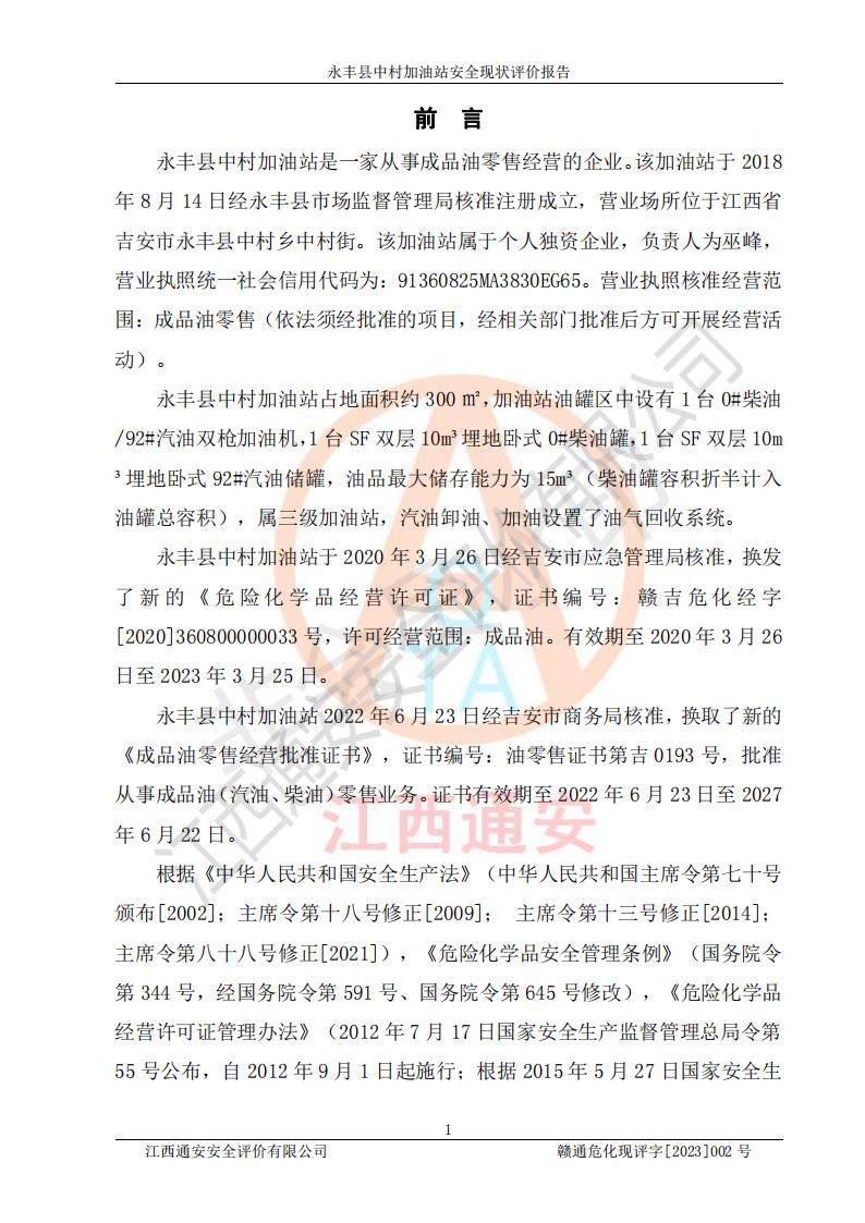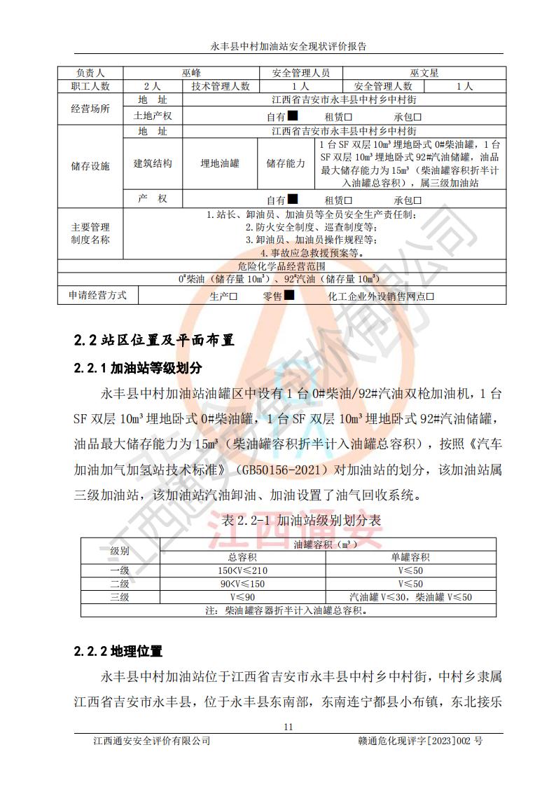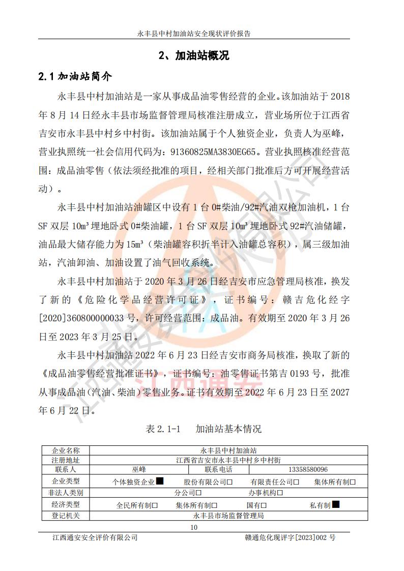 永丰县中村加油站是一家从事成品油零售经营的企业。该加油站于2018年8月14日经永丰县市场监督管理局核准注册成立,营业场所位于江西省吉安市永丰县中村乡中村街。该加油站属于个人独资企业,负责人为巫峰,营业执照统一社会信用代码为:91360825MA3830EG65。营业执照核准经营范围:成品油零售(依法须经批准的项目,经相关部门批准后方可开展经营活动)。 永丰县中村加油站占地面积约300㎡,加油站油罐区中设有1台0#柴油/92#汽油双枪加油机,1台SF双层10m³埋地卧式0#柴油罐,1台SF双层10m³埋地卧式92#汽油储罐,油品至大储存能力为15m³(柴油罐容积折半计入油罐总容积),属三级加油站,汽油卸油、加油设置了油气回收系统。 |