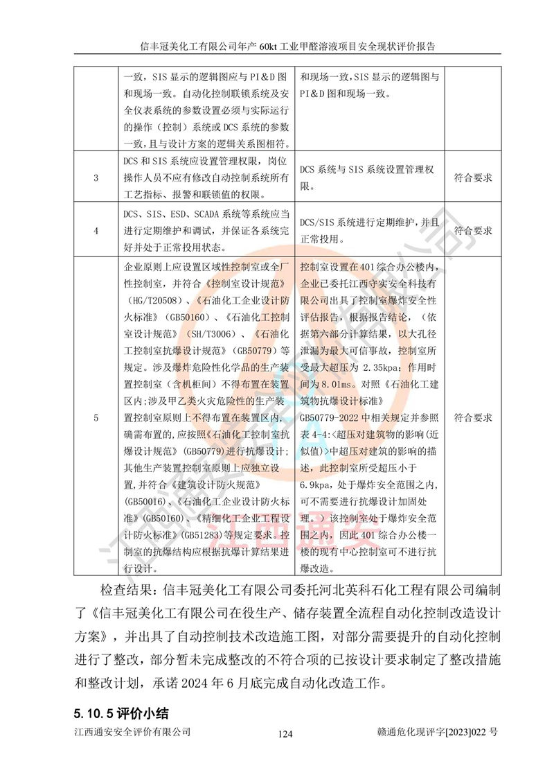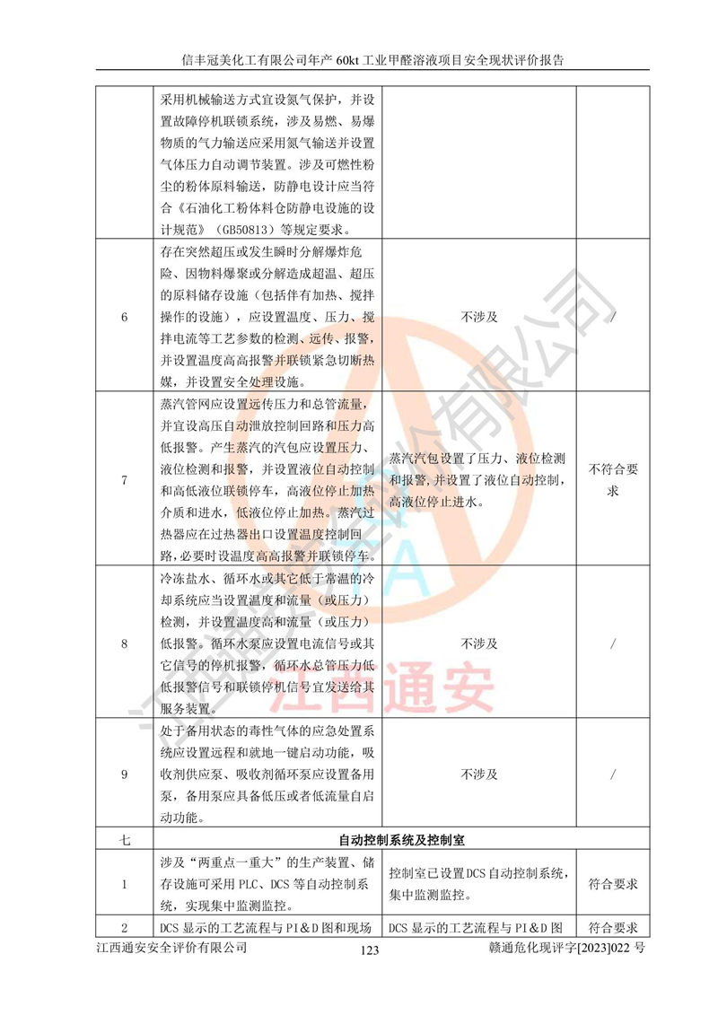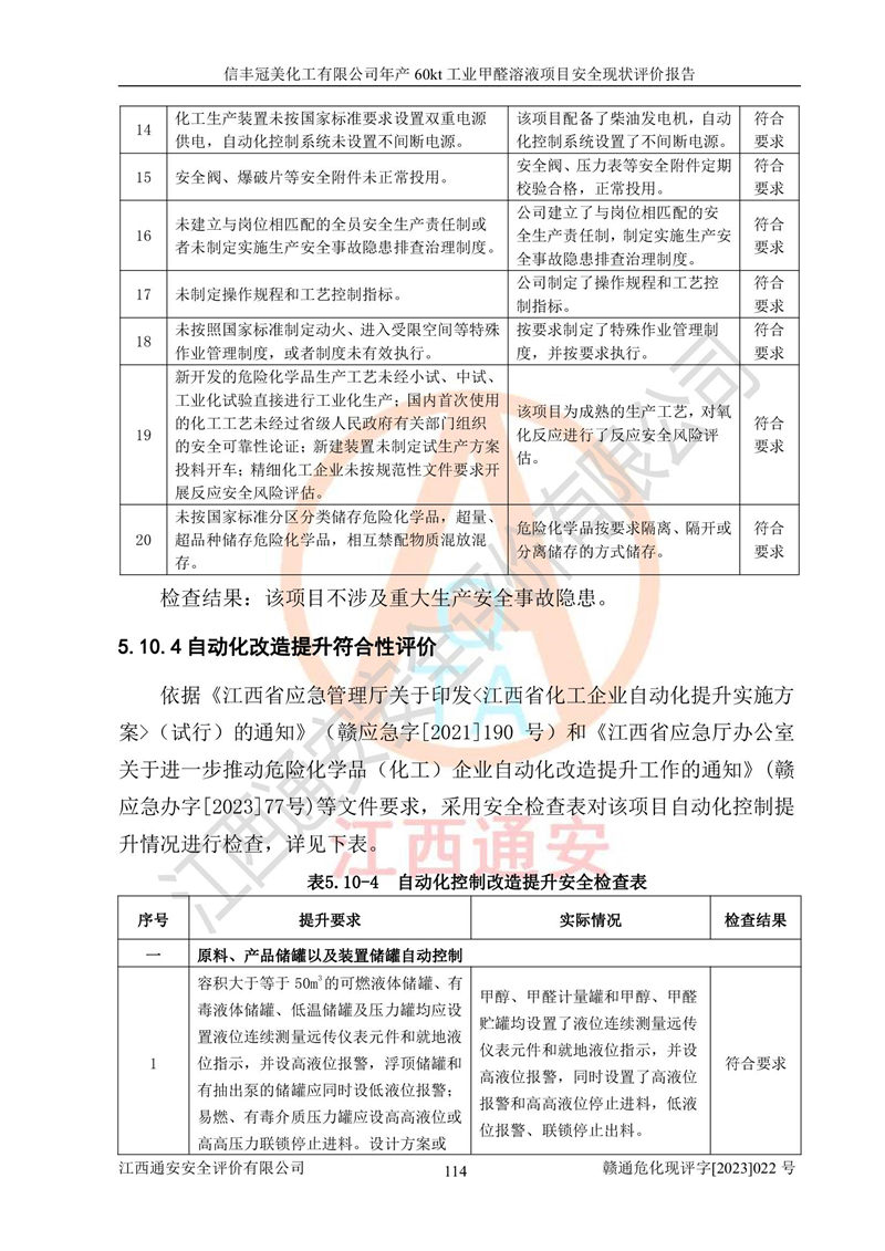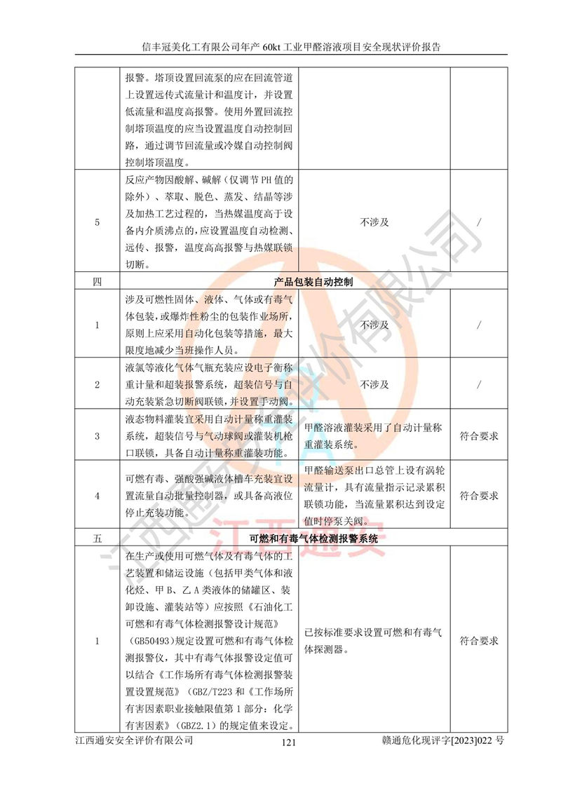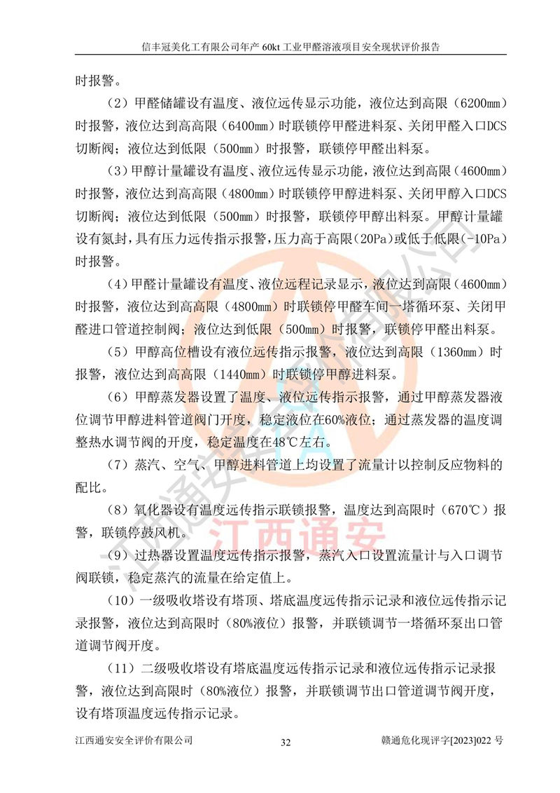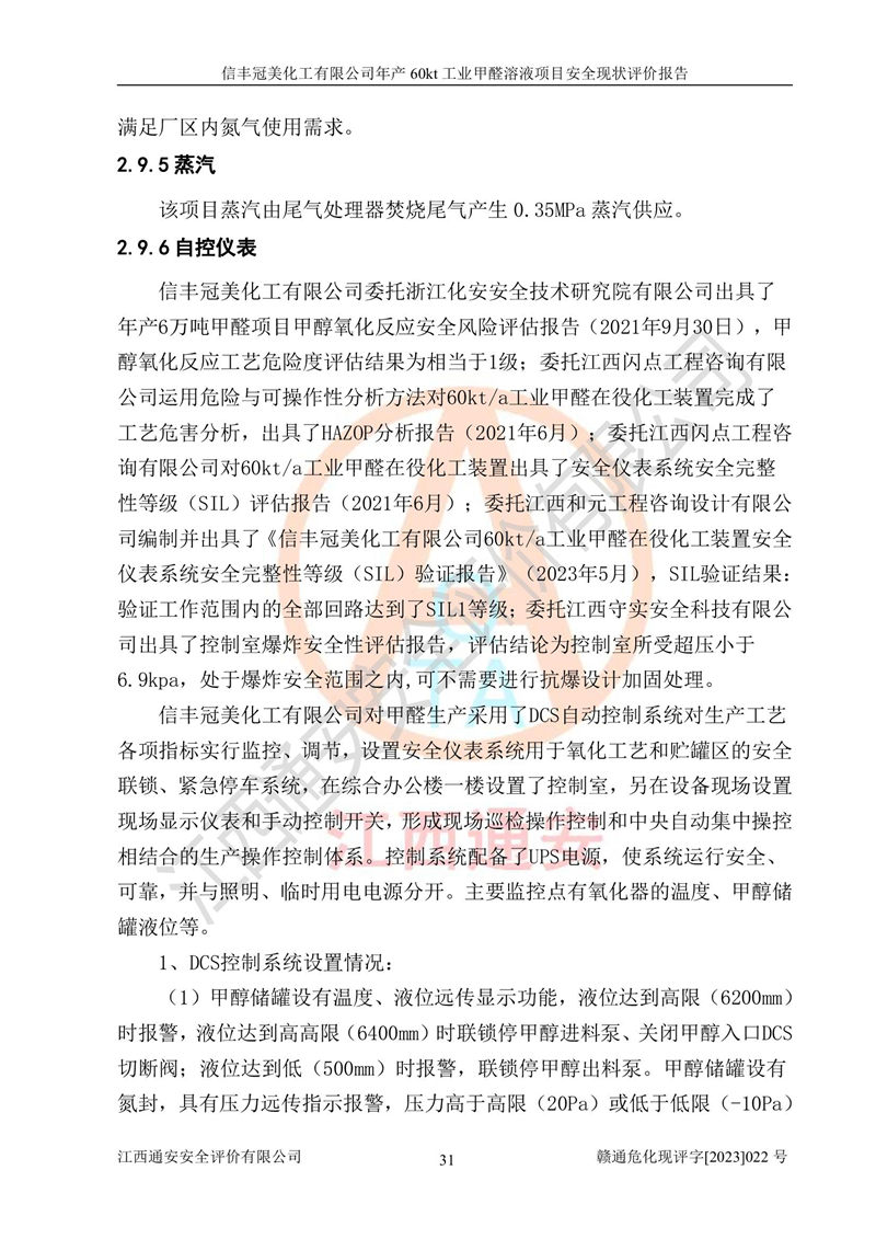 评价结论 | 信丰冠美化工有限公司年产60kt工业甲醛溶液项目现场情况与设计图纸一致,DCS和SIS系统设计符合要求、运行正常,有关从业人员资质符合《江西省危险化学品安全专项整治三年行动实施方案》要求,安全设施及安全管理符合法律、法规、标准的要求,安全风险是受控制的,其风险程度是可以接受的,安全设施符合安全生产条件,能够满足安全生产的要求。 | ||||||