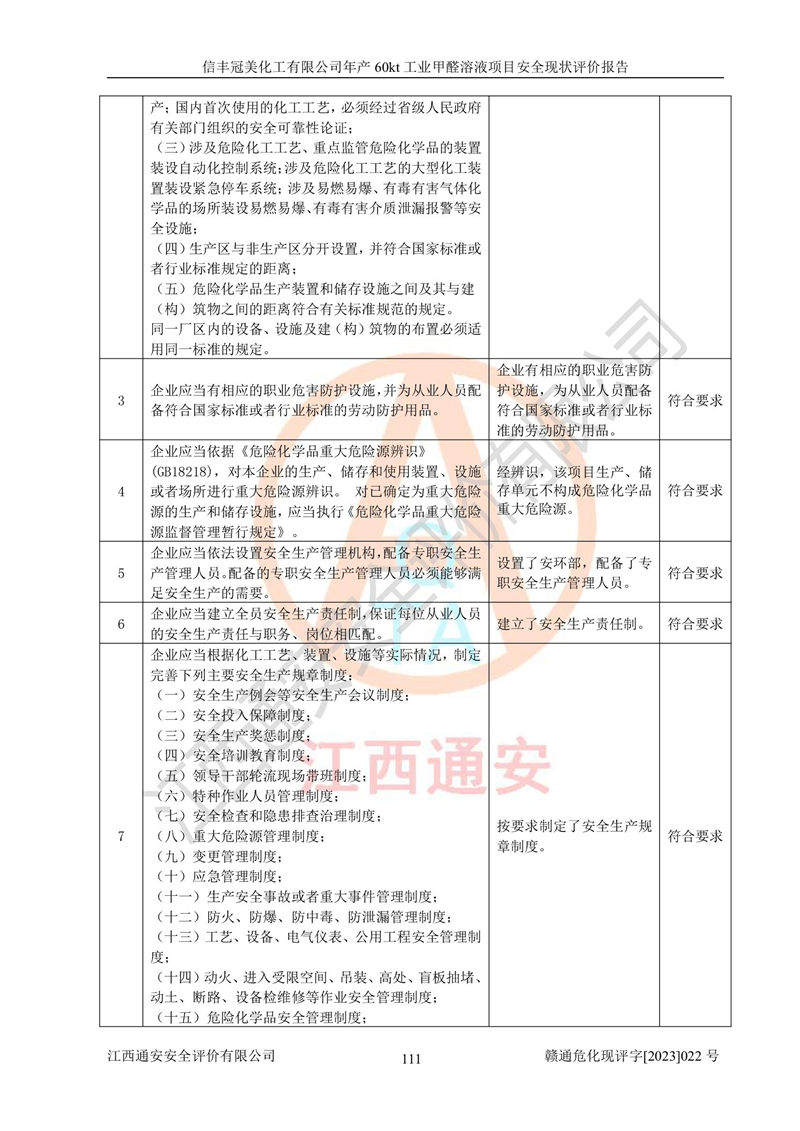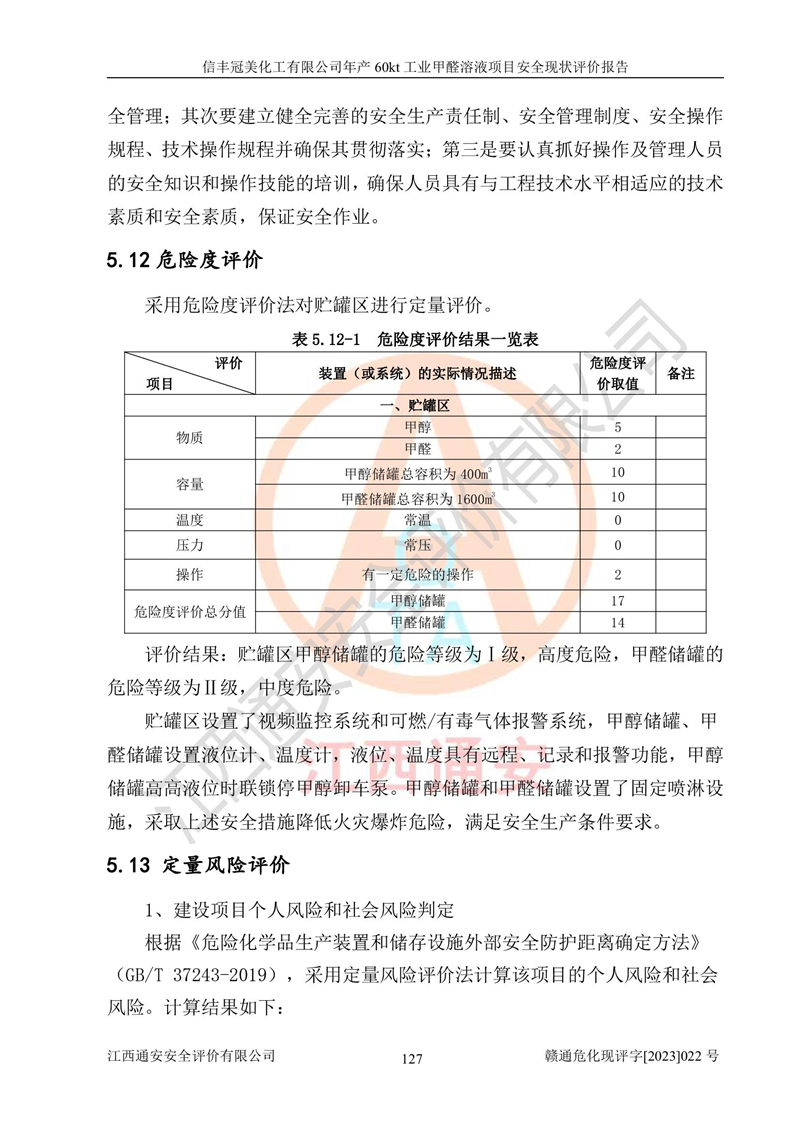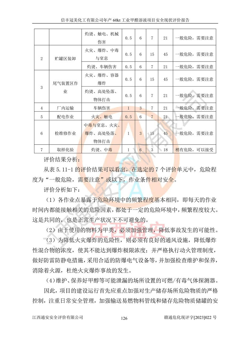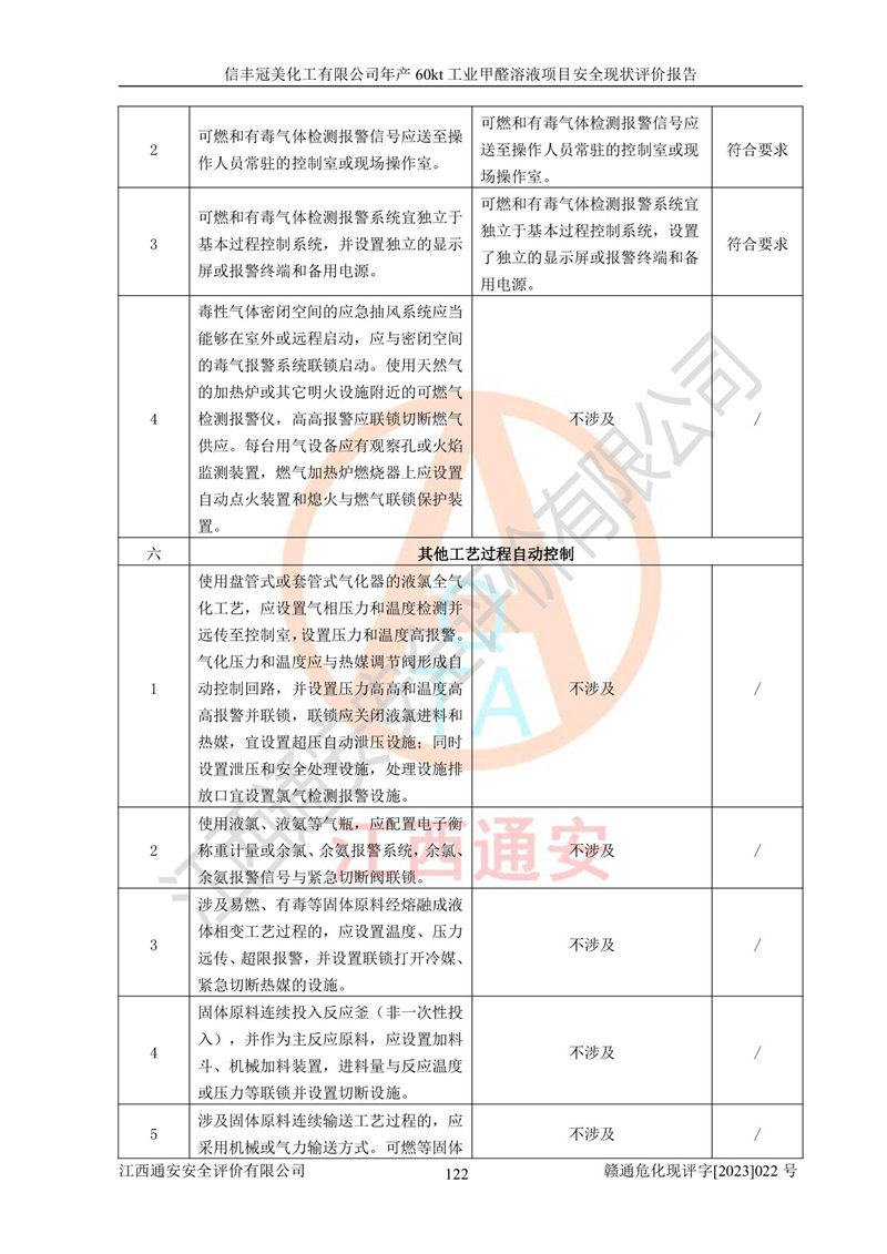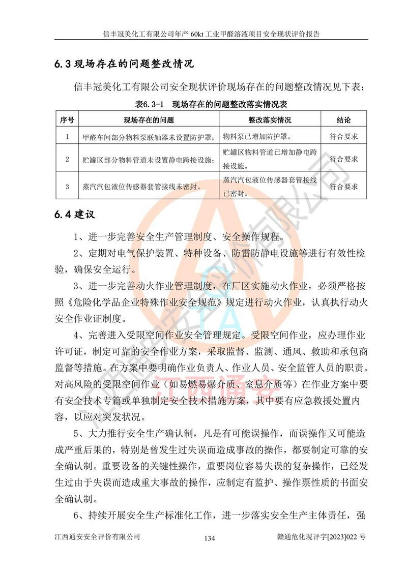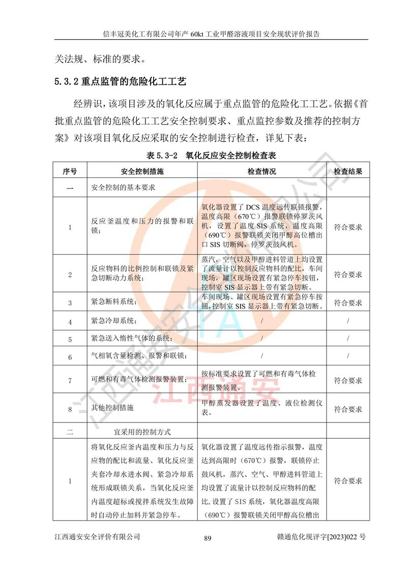 评价结论 | 信丰冠美化工有限公司年产60kt工业甲醛溶液项目现场情况与设计图纸一致,DCS和SIS系统设计符合要求、运行正常,有关从业人员资质符合《江西省危险化学品安全专项整治三年行动实施方案》要求,安全设施及安全管理符合法律、法规、标准的要求,安全风险是受控制的,其风险程度是可以接受的,安全设施符合安全生产条件,能够满足安全生产的要求。 | ||||||