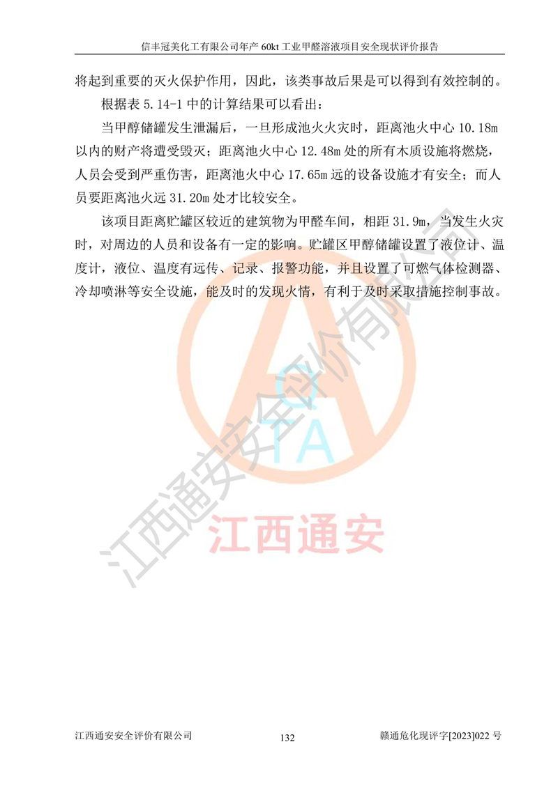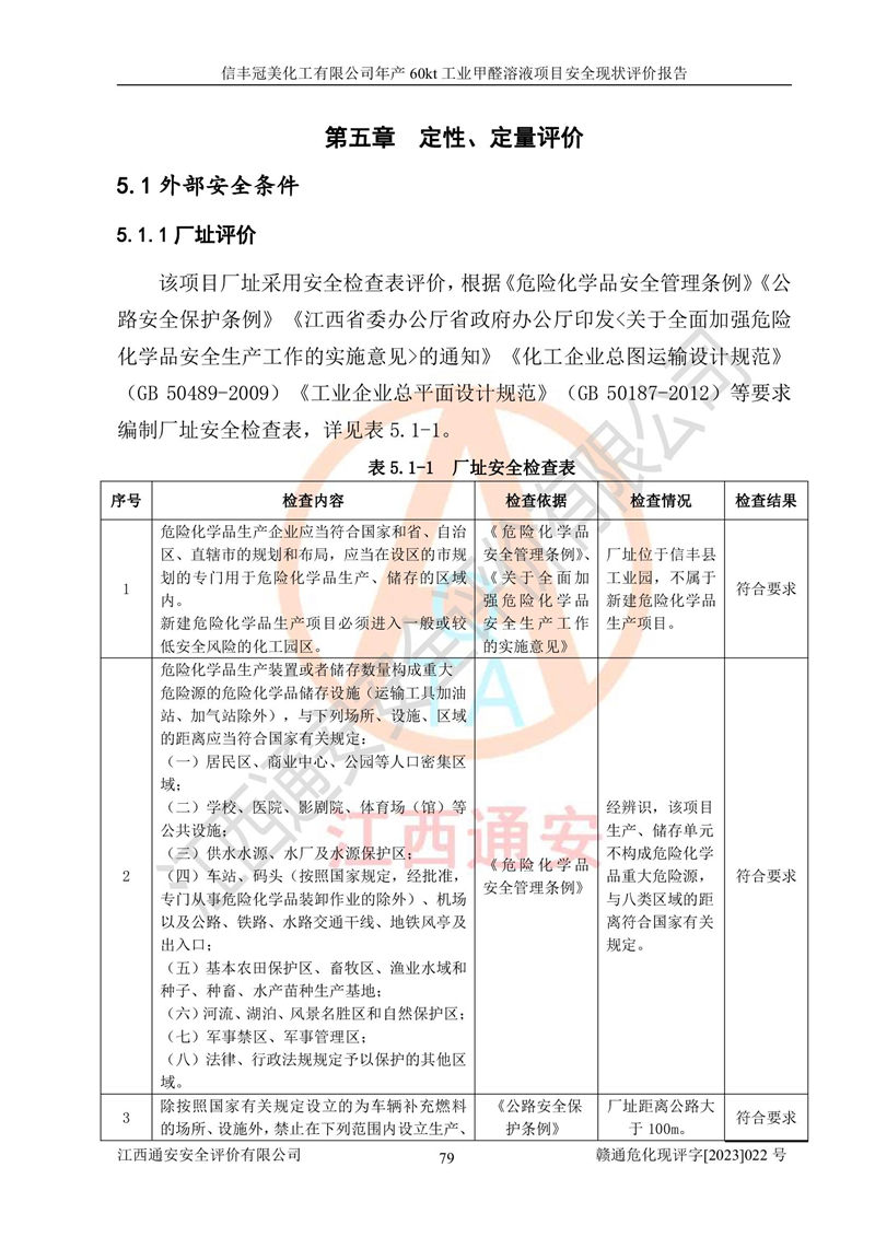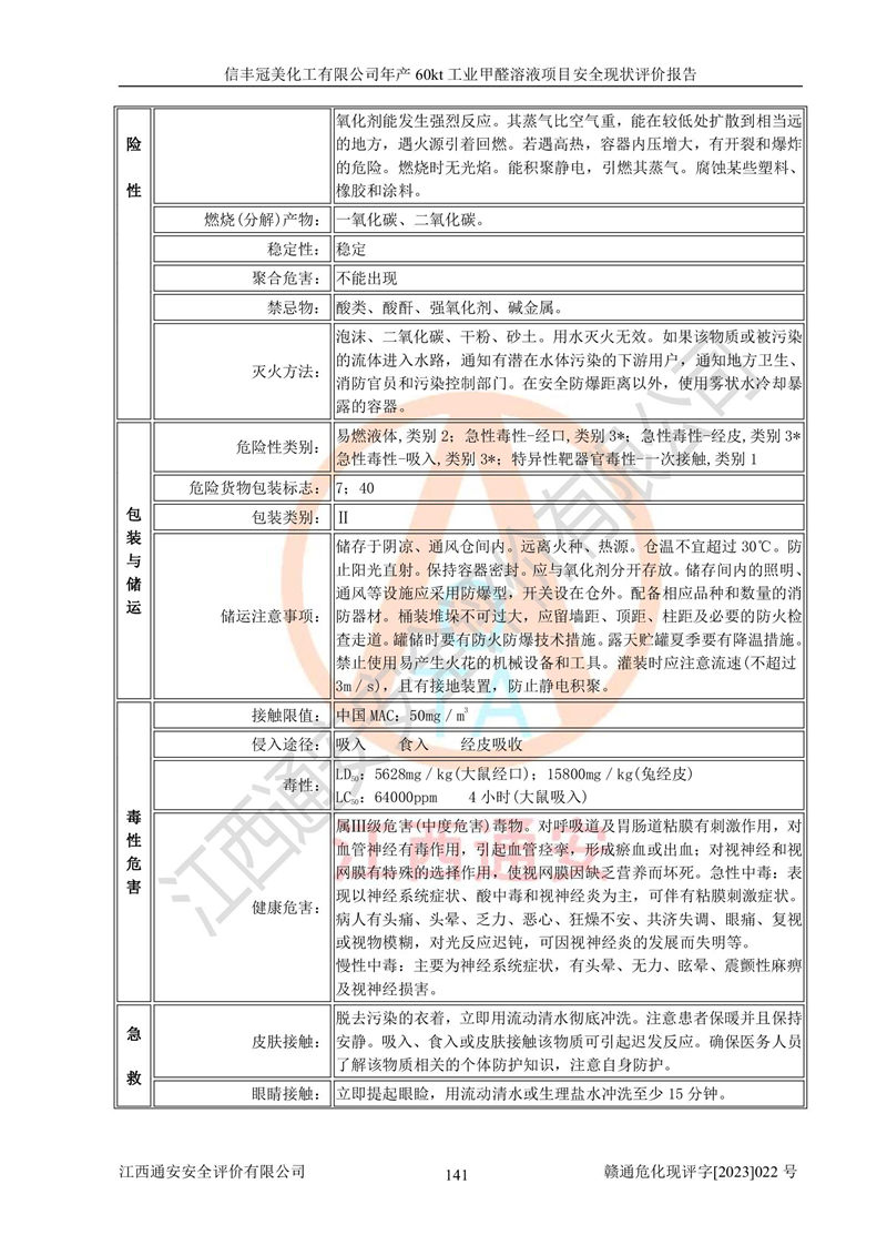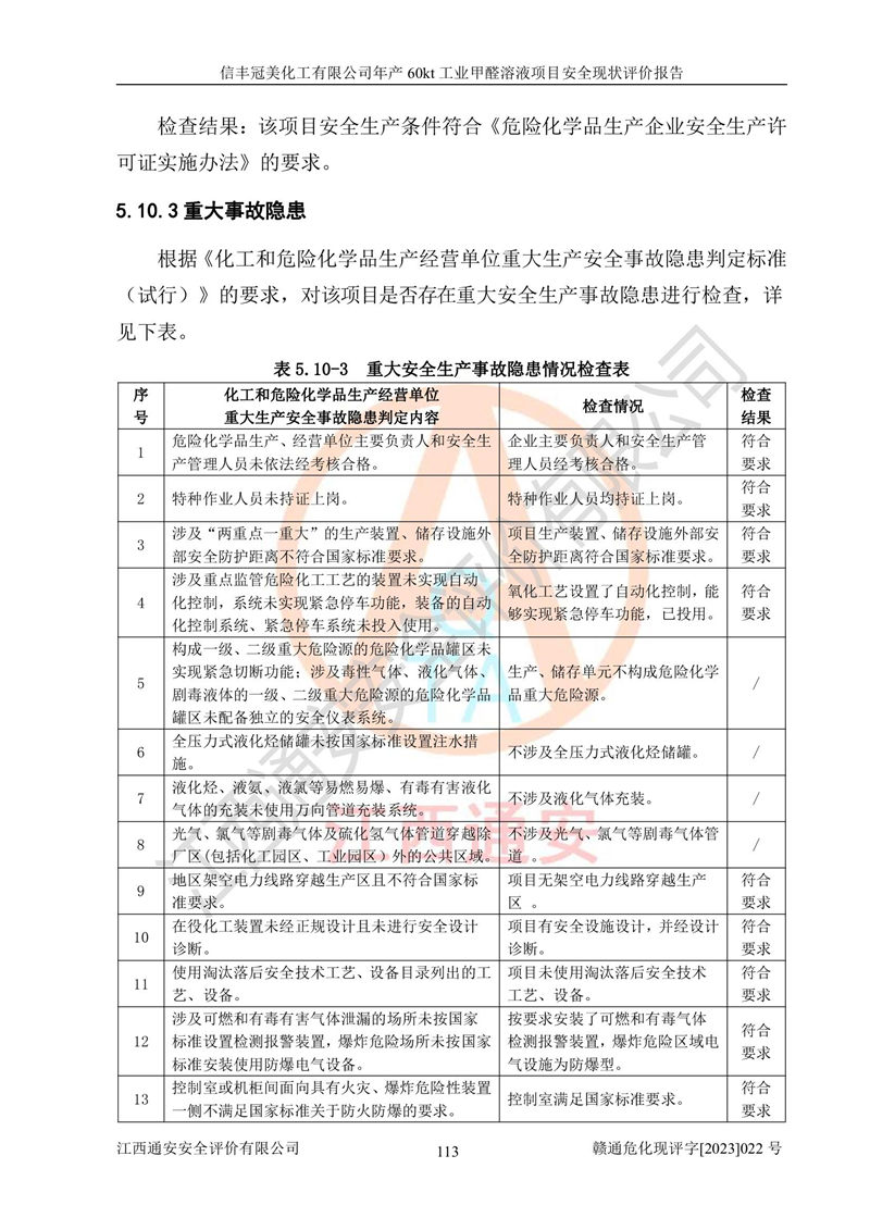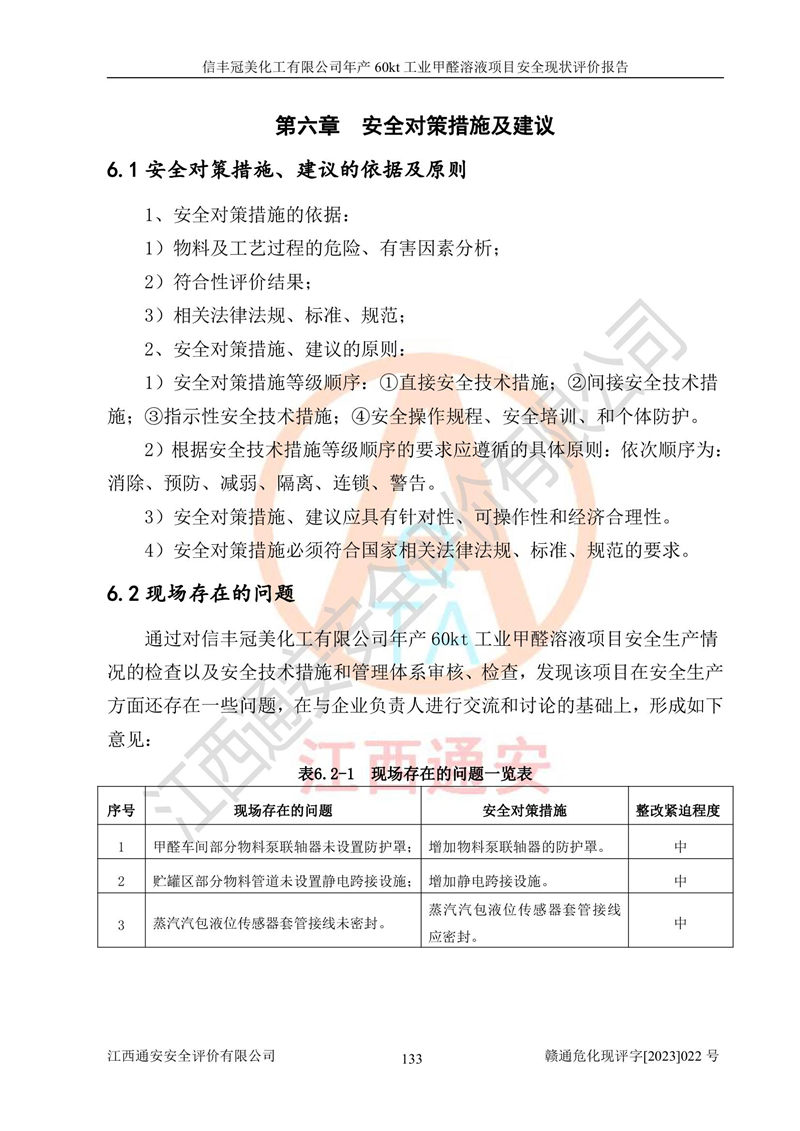 评价结论 | 信丰冠美化工有限公司年产60kt工业甲醛溶液项目现场情况与设计图纸一致,DCS和SIS系统设计符合要求、运行正常,有关从业人员资质符合《江西省危险化学品安全专项整治三年行动实施方案》要求,安全设施及安全管理符合法律、法规、标准的要求,安全风险是受控制的,其风险程度是可以接受的,安全设施符合安全生产条件,能够满足安全生产的要求。 | ||||||