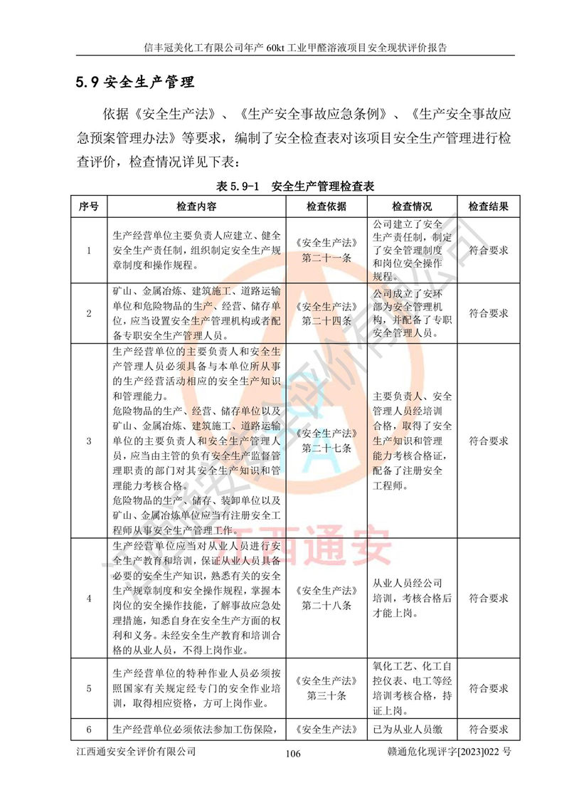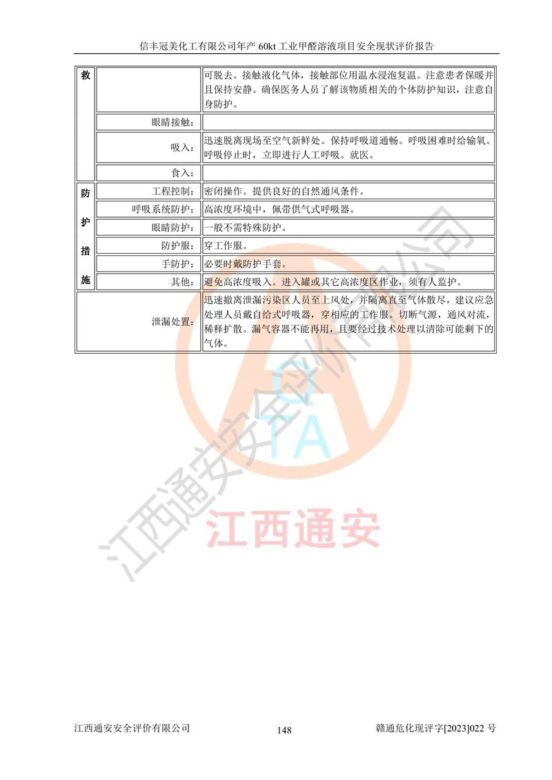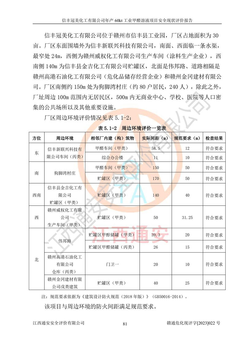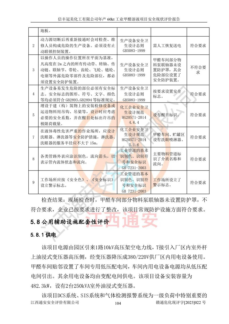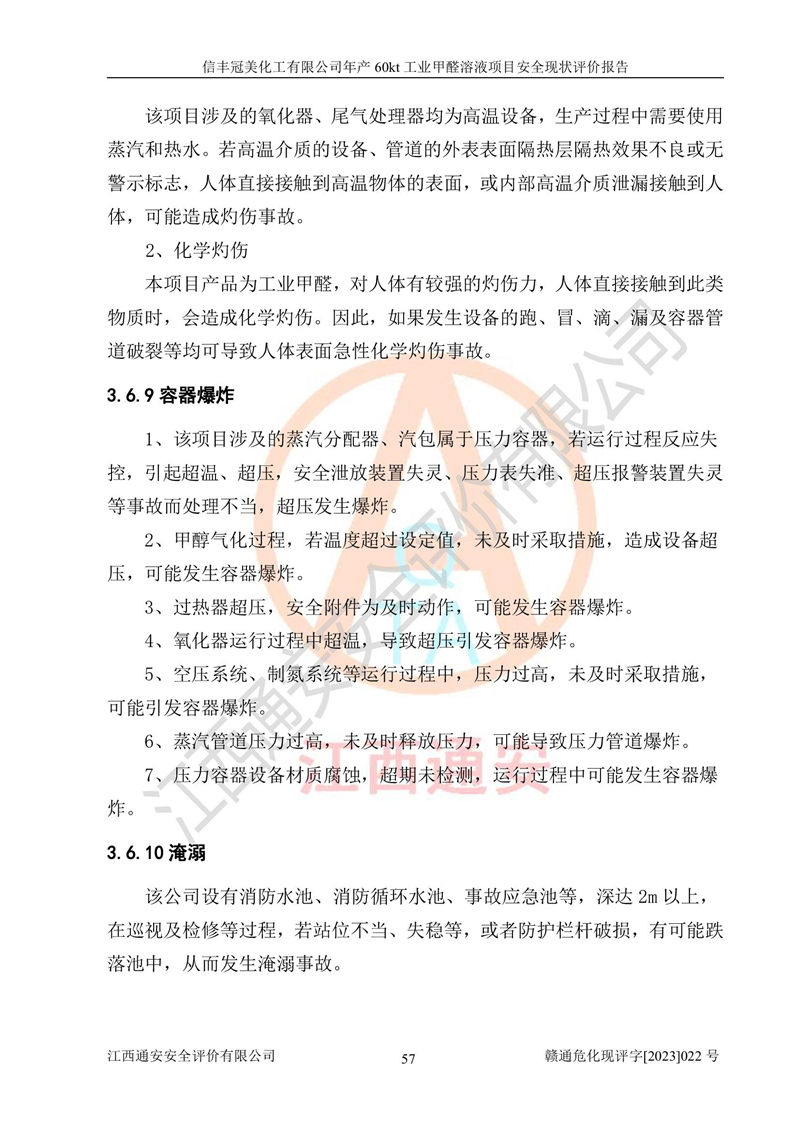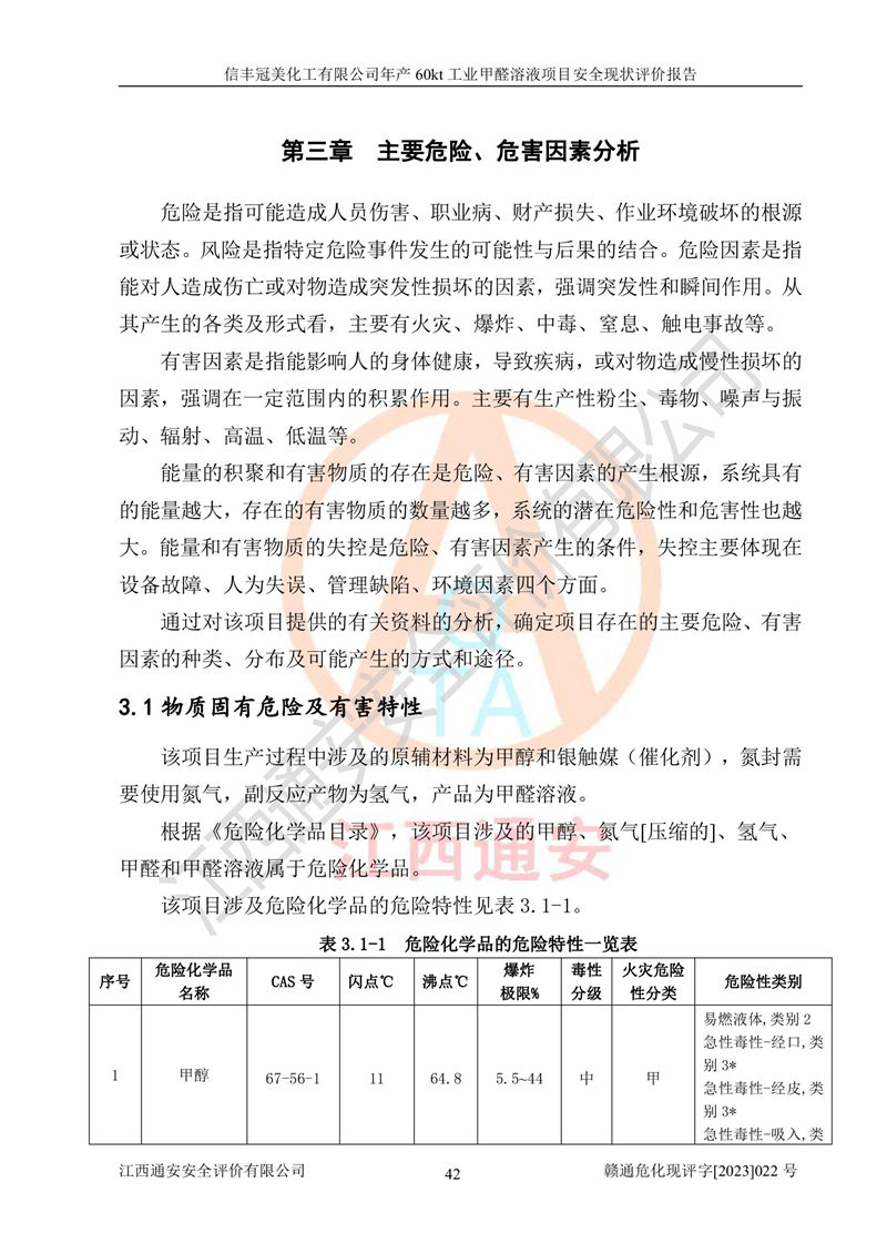 评价结论 | 信丰冠美化工有限公司年产60kt工业甲醛溶液项目现场情况与设计图纸一致,DCS和SIS系统设计符合要求、运行正常,有关从业人员资质符合《江西省危险化学品安全专项整治三年行动实施方案》要求,安全设施及安全管理符合法律、法规、标准的要求,安全风险是受控制的,其风险程度是可以接受的,安全设施符合安全生产条件,能够满足安全生产的要求。 | ||||||