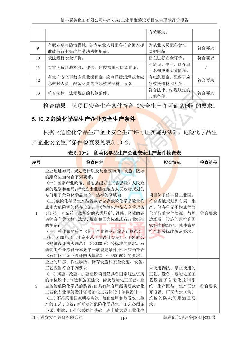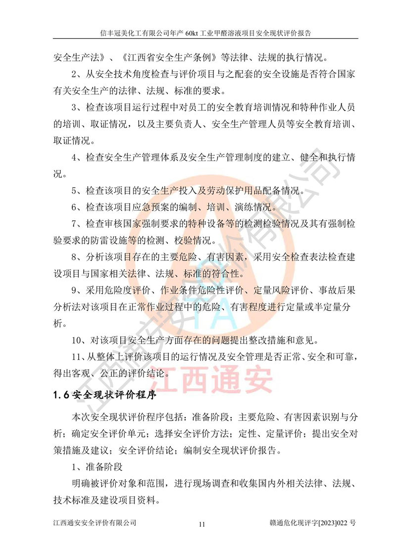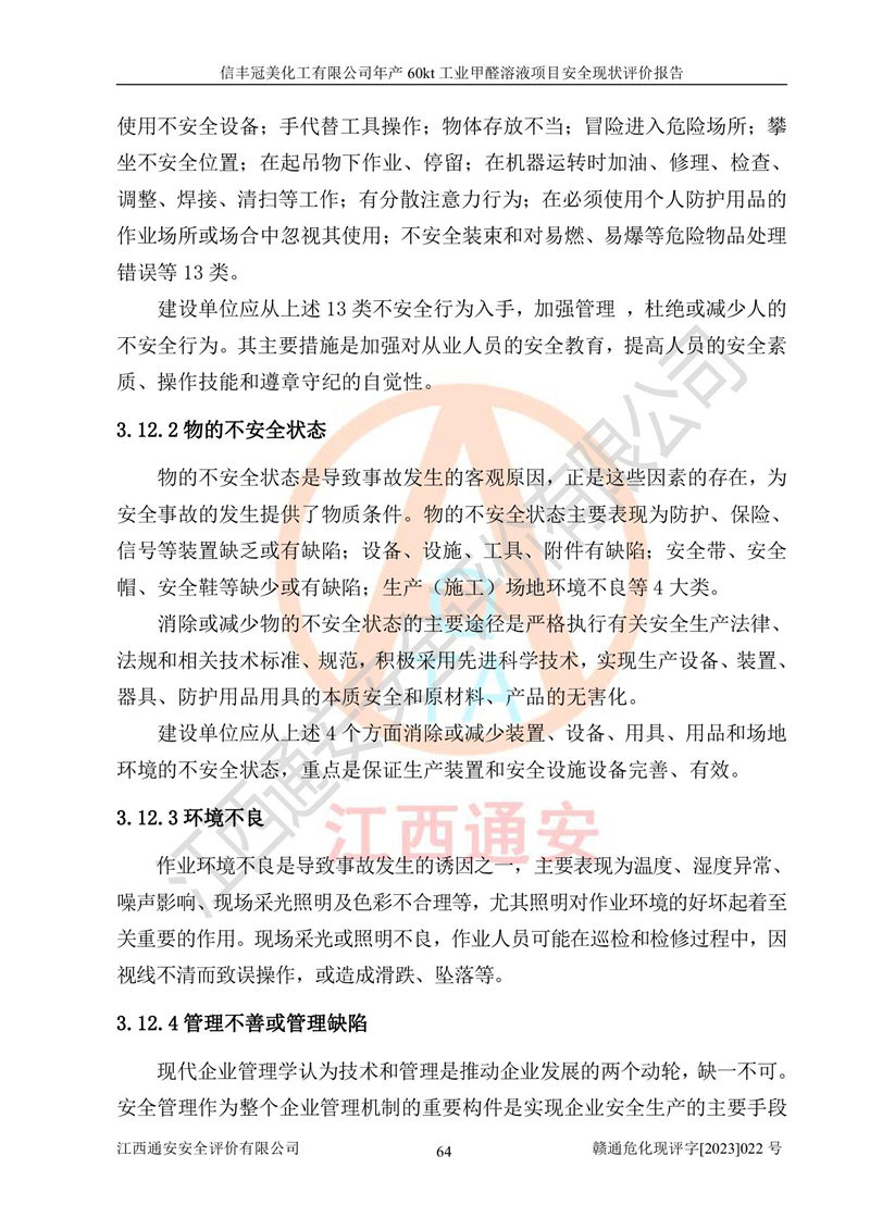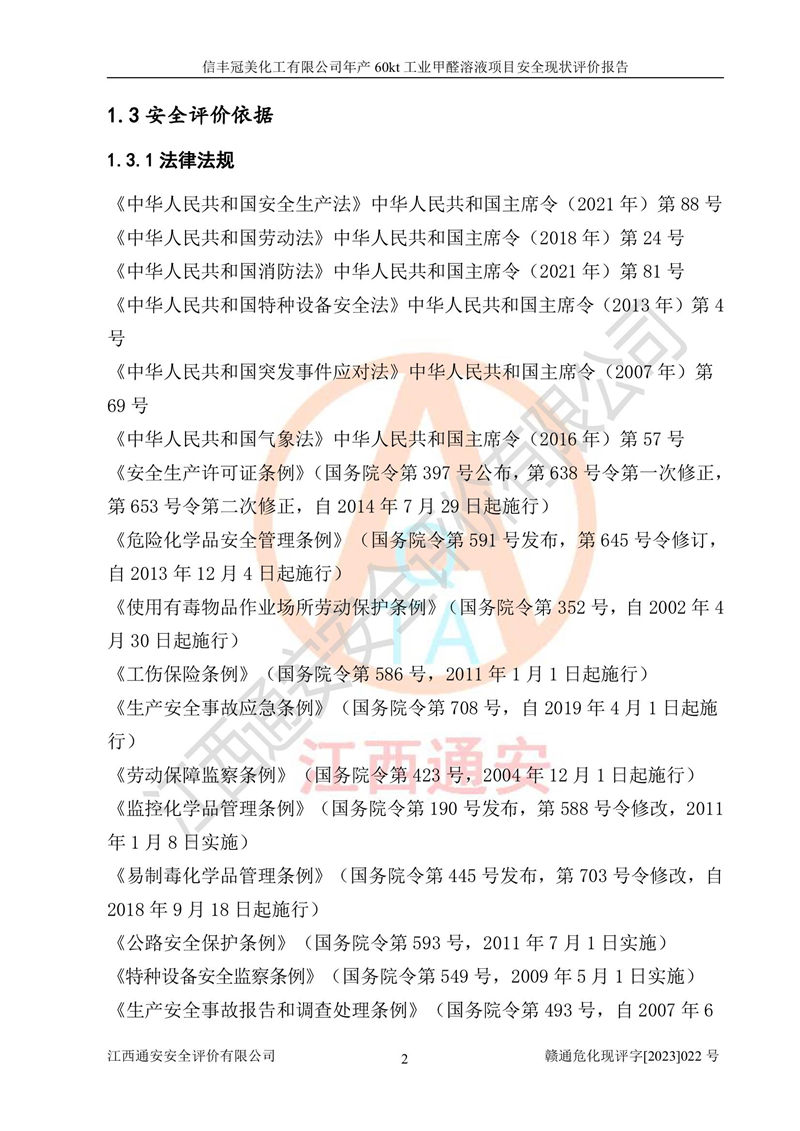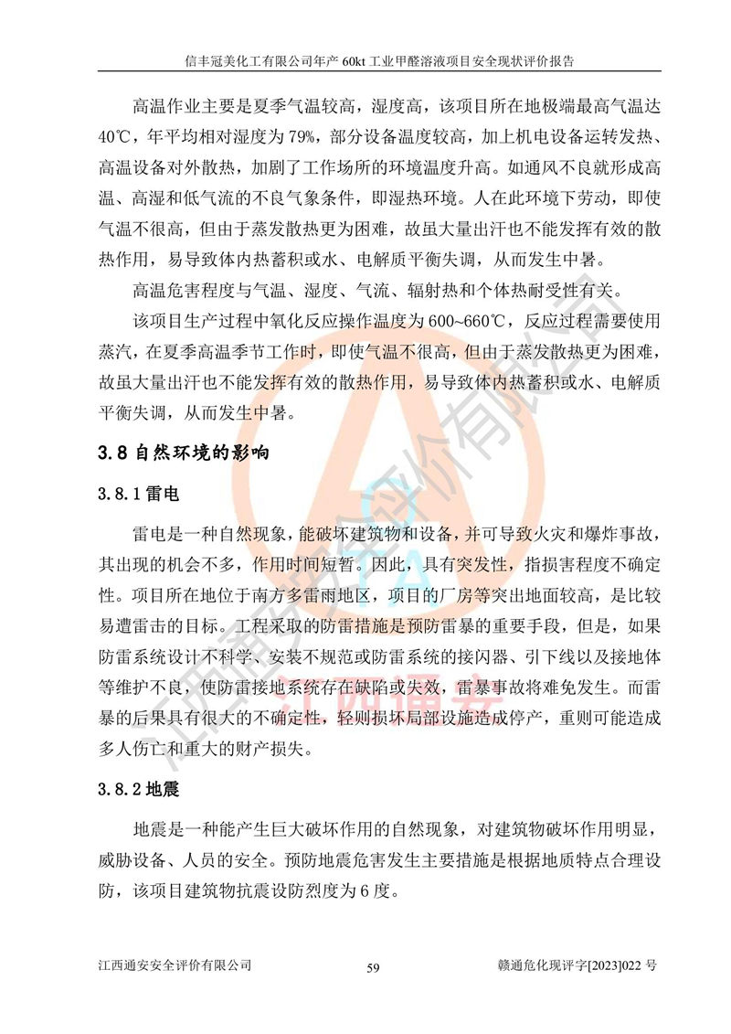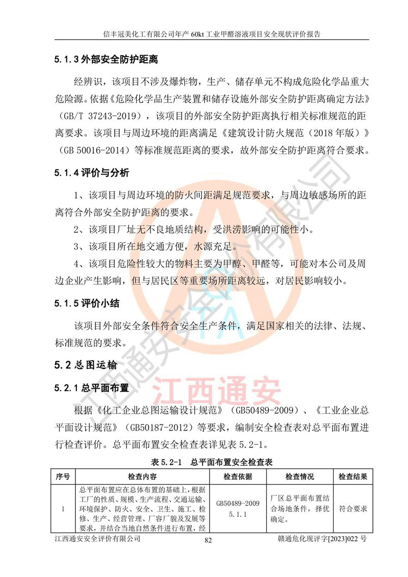 评价结论 | 信丰冠美化工有限公司年产60kt工业甲醛溶液项目现场情况与设计图纸一致,DCS和SIS系统设计符合要求、运行正常,有关从业人员资质符合《江西省危险化学品安全专项整治三年行动实施方案》要求,安全设施及安全管理符合法律、法规、标准的要求,安全风险是受控制的,其风险程度是可以接受的,安全设施符合安全生产条件,能够满足安全生产的要求。 | ||||||