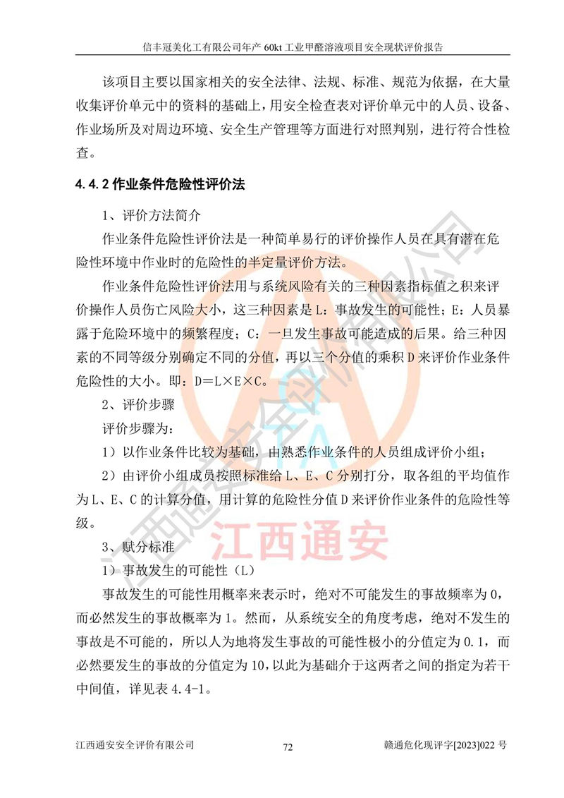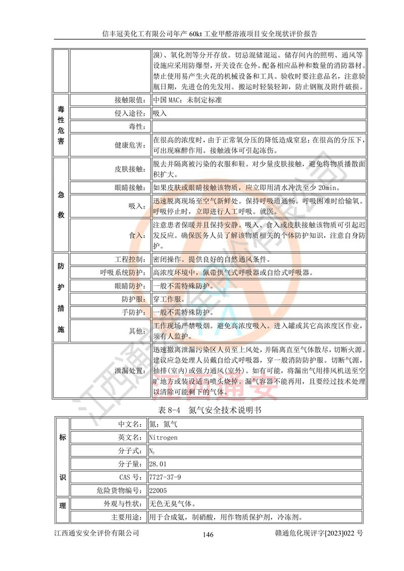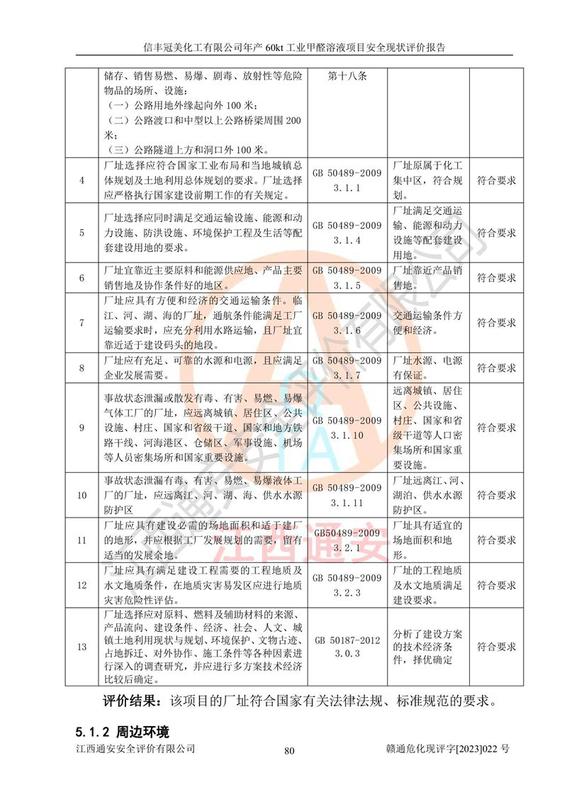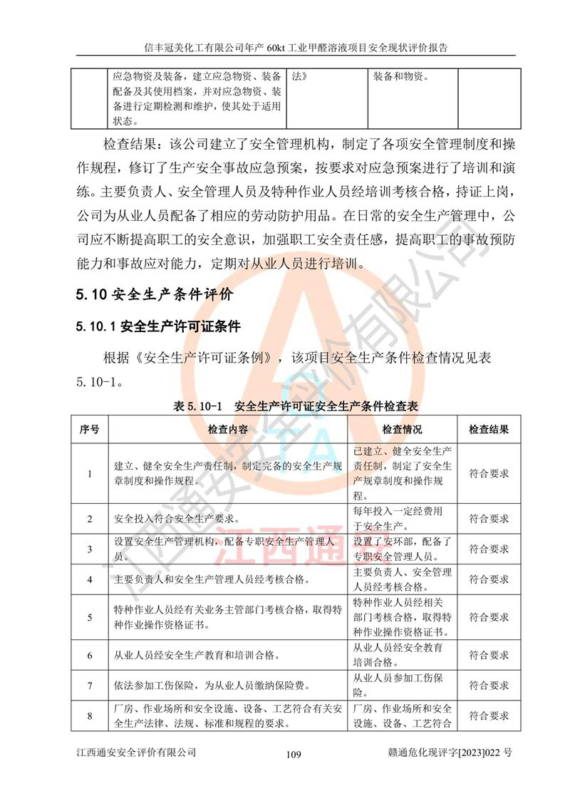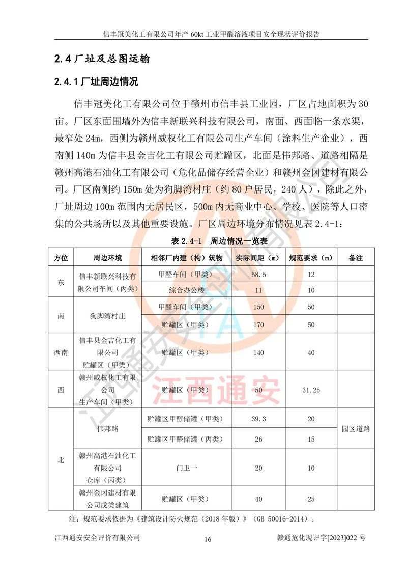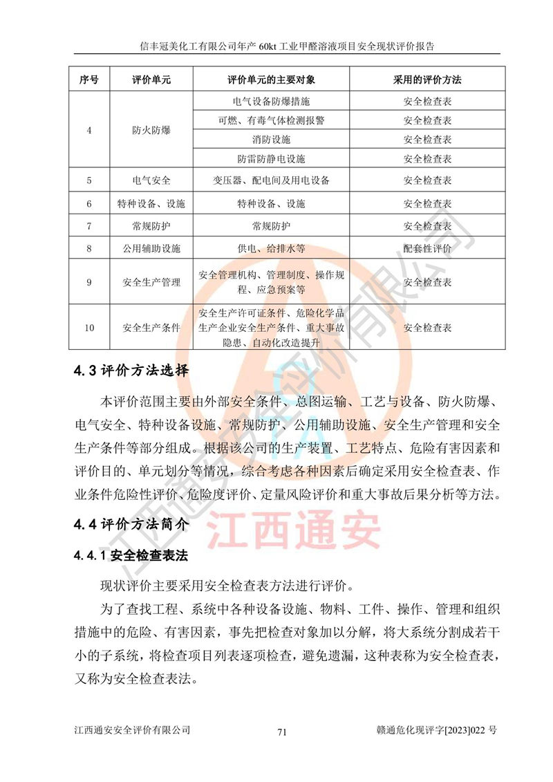 评价结论 | 信丰冠美化工有限公司年产60kt工业甲醛溶液项目现场情况与设计图纸一致,DCS和SIS系统设计符合要求、运行正常,有关从业人员资质符合《江西省危险化学品安全专项整治三年行动实施方案》要求,安全设施及安全管理符合法律、法规、标准的要求,安全风险是受控制的,其风险程度是可以接受的,安全设施符合安全生产条件,能够满足安全生产的要求。 | ||||||