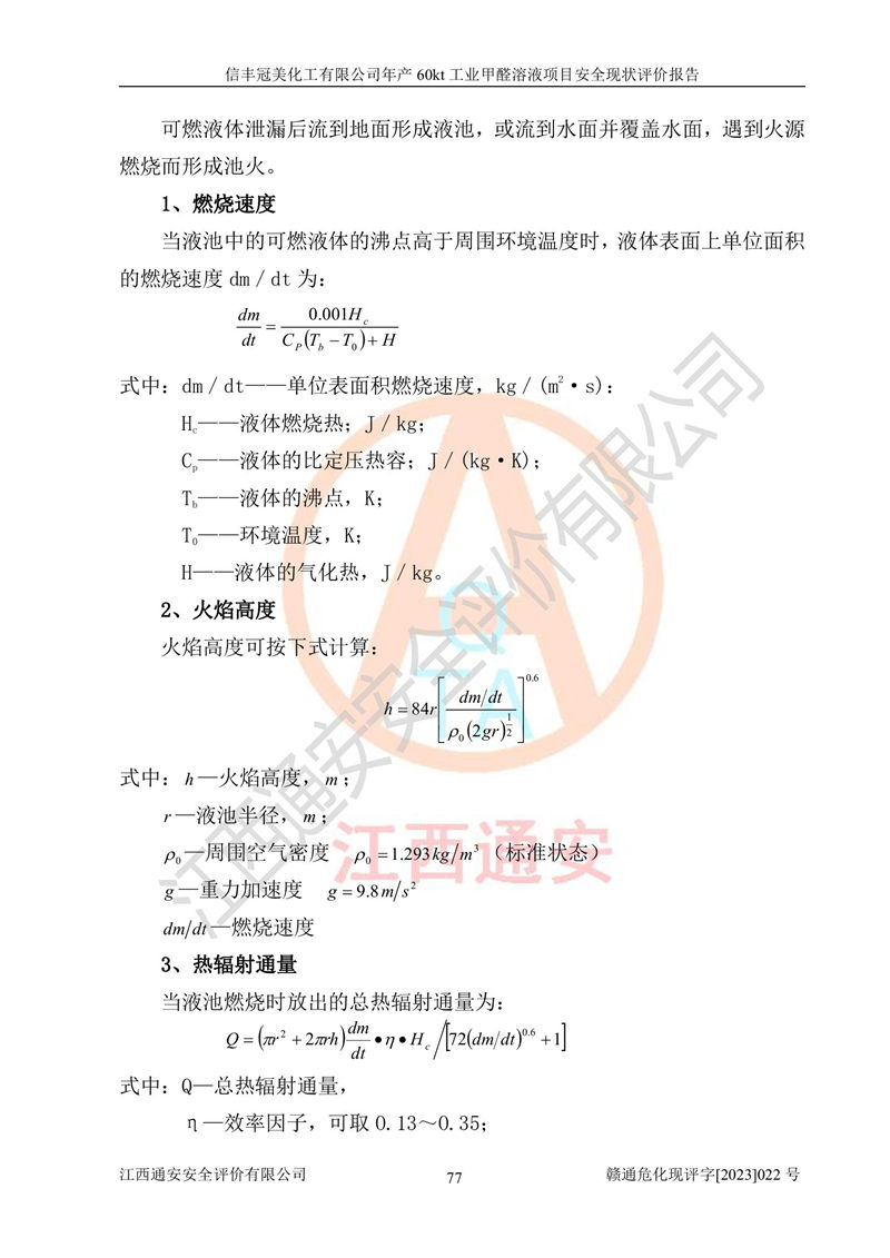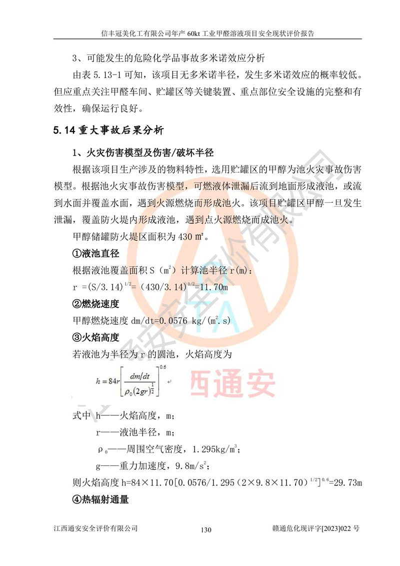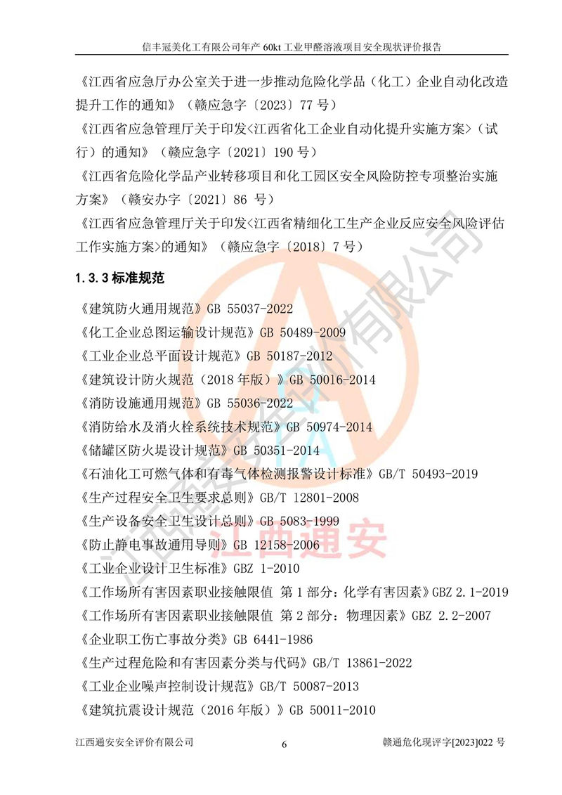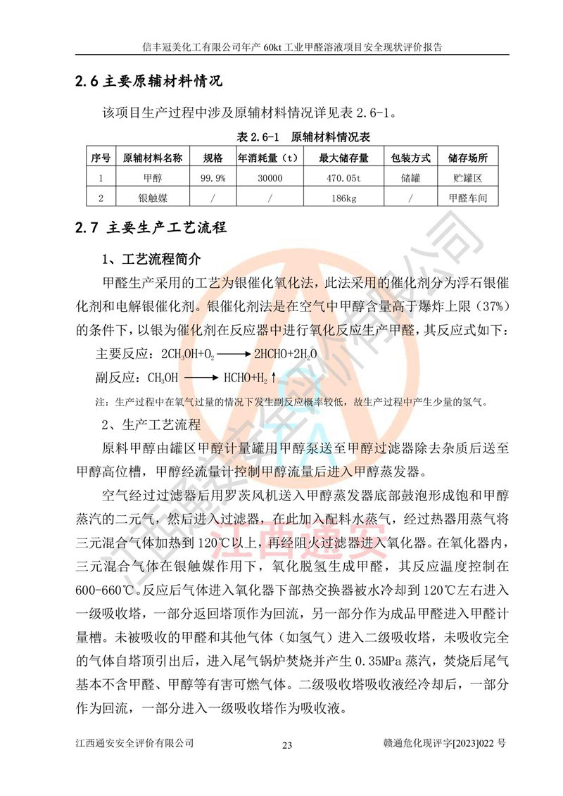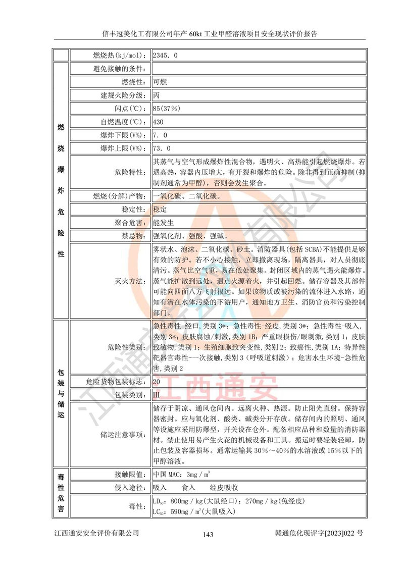 项目简介 | 信丰冠美化工有限公司位于江西省赣州市信丰县工业园伟邦路,法定**人为汪学斌,成立于2007年04月09日,注册资本壹仟万元整,营业执照经营范围为工业甲醛、尿醛树脂胶生产、销售(凭许可证经营)等。 信丰冠美化工有限公司2020年07月23日取得了《安全生产许可证》,许可证编号:(赣)WH安许证字[2008]0500号,许可范围为工业甲醛溶液(60kt/a),**期2020年08月06日至2023年08月05日。该公司2022年8月30日取得了安全生产标准化证书,证书编号:赣AQBWⅡ[2022]015,**期至2025年8月。该公司现有员工23人,其中专职安全管理人员1人。 根据《江西省危险化学品产业转移项目和化工园区安全风险防控专项整治实施方案》(赣安办字〔2021〕86 号)要求,为提升生产本质安全,减少重大危险源,信丰冠美化工有限公司对贮罐区进行了调整,停用1台甲醇储罐和1台甲醇计量罐,2台甲醇储罐变更为2台甲醛储罐。信丰冠美化工有限公司委托山东富海石化工程有限公司对60kt/a工业甲醛项目出具了在役化工装置安全设计诊断及整改设计文本和图纸(2022年12月),取得了赣州市应急管理局出具的审查意见,并对贮罐区进行了整改。贮罐区整改完成后,经辨识,信丰冠美化工有限公司生产、储存单元不构成危险化学品重大危险源。信丰冠美化工有限公司向信丰县应急管理局申请了重大危险源核销,2023年2月2日取得了核销登记表,核销编号为HX赣360722[2023]001。 信丰冠美化工有限公司年产60kt工业甲醛溶液项目生产过程中涉及的原辅材料为甲醇和银触媒(催化剂),氮封需要使用氮气,副反应产物为氢气,产品为甲醛溶液。根据《危险化学品目录》,该项目涉及的甲醇、氮气[压缩的]、氢气、甲醛和甲醛溶液属于危险化学品。经辨识,甲醇和氢气属于重点监管的危险化学品,甲醛属于高毒物品,甲醇属于特别管控的危险化学品,不涉及监控化学品、易制毒化学品、易制爆危险化学品和剧毒化学品,生产、储存单元不构成危险化学品重大危险源,涉及的氧化反应属于重点监管的危险化工工艺。根据《安全生产许可证条例》、《危险化学品安全管理条例》和《危险化学品生产企业安全生产许可实施办法》的相关规定,该项目甲醛溶液属于危险化学品,需要办理危险化学品安全生产许可证。根据生产工艺特点及物料的理化特性可知,该项目生产过程中存在火灾与爆炸、中毒与窒息、触电、机械伤害等危险有害因素。 该公司自2020年07月23日取得安全生产许可证以来,生产运行正常,未发生一般及以上生产安全事故。 | ||||||