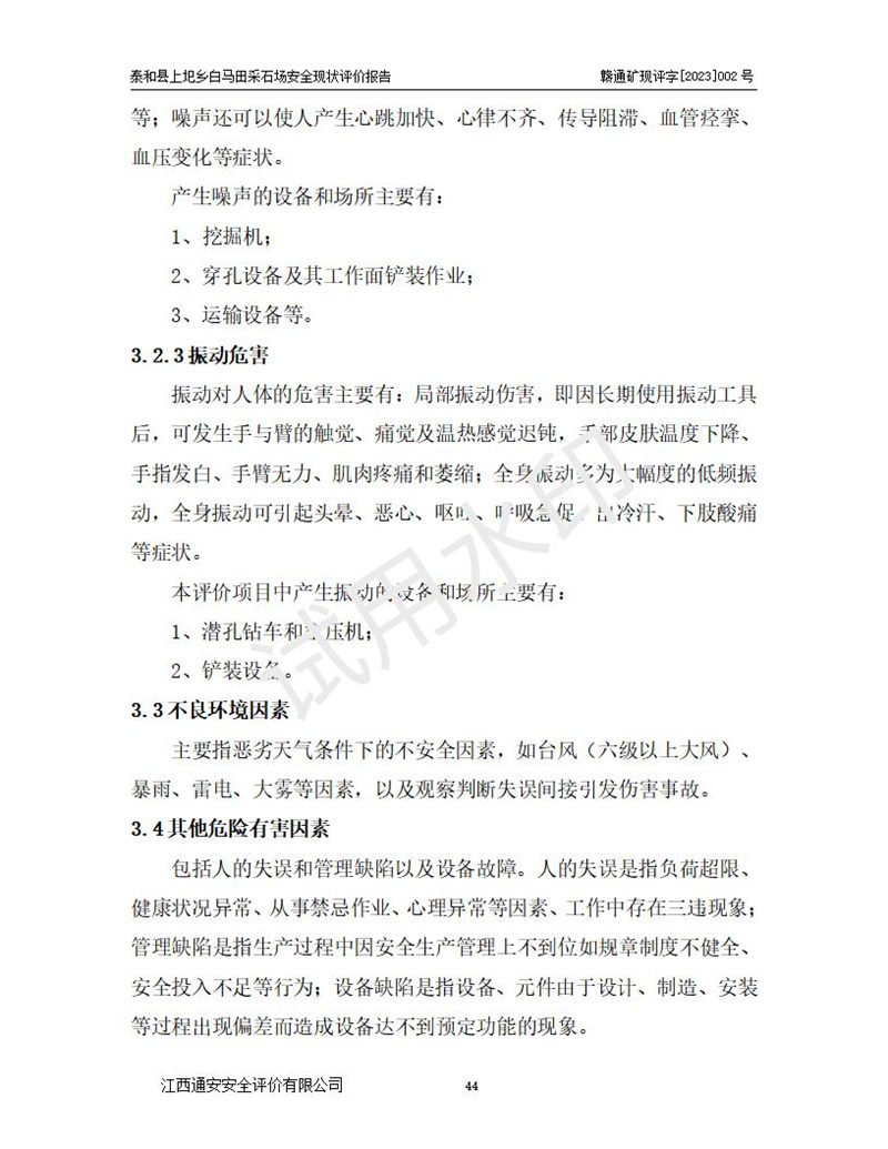 其它 | 1、该评价项目中存在的主要危险因素:爆破伤害、火药爆炸、容器爆炸、滑坡和泥石流、**伤害、高处坠落、物体打击、触电、机械伤害、火灾、坍塌、中毒和窒息、淹溺。 2、该评价项目中存在的有害因素包括:粉尘、噪声与振动、不良作业环境,如高温、雷击对矿山人员的伤害和其他不利的环境因素等。 3、该评价项目为建筑用砂岩露天开采矿山,无瓦斯和自燃发火危险,水文地质条件属简单类型。该矿山无瓦斯和自燃发火危险。该矿山不使用有毒有害危险化学品药剂进行原矿深度加工,矿山开采使用民爆物品不设爆破器材库,一次使用量不*过5t,本建设项目不存在重大危险源。 上述主要危险、有害因素在采取本报告第四章中提出的安全对策措施后,能得到**控制。该项目从安全生产角度符合**有关安全生产法律、法规、规章和技术标准的要求。 | ||||