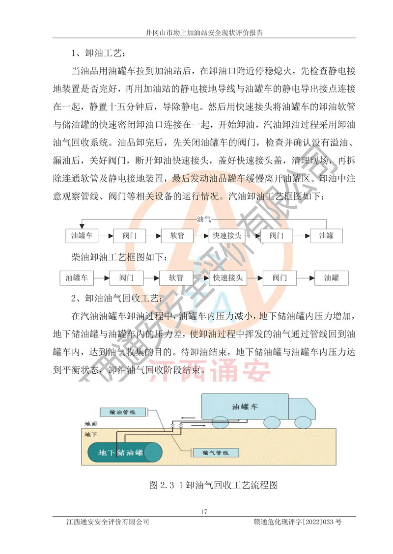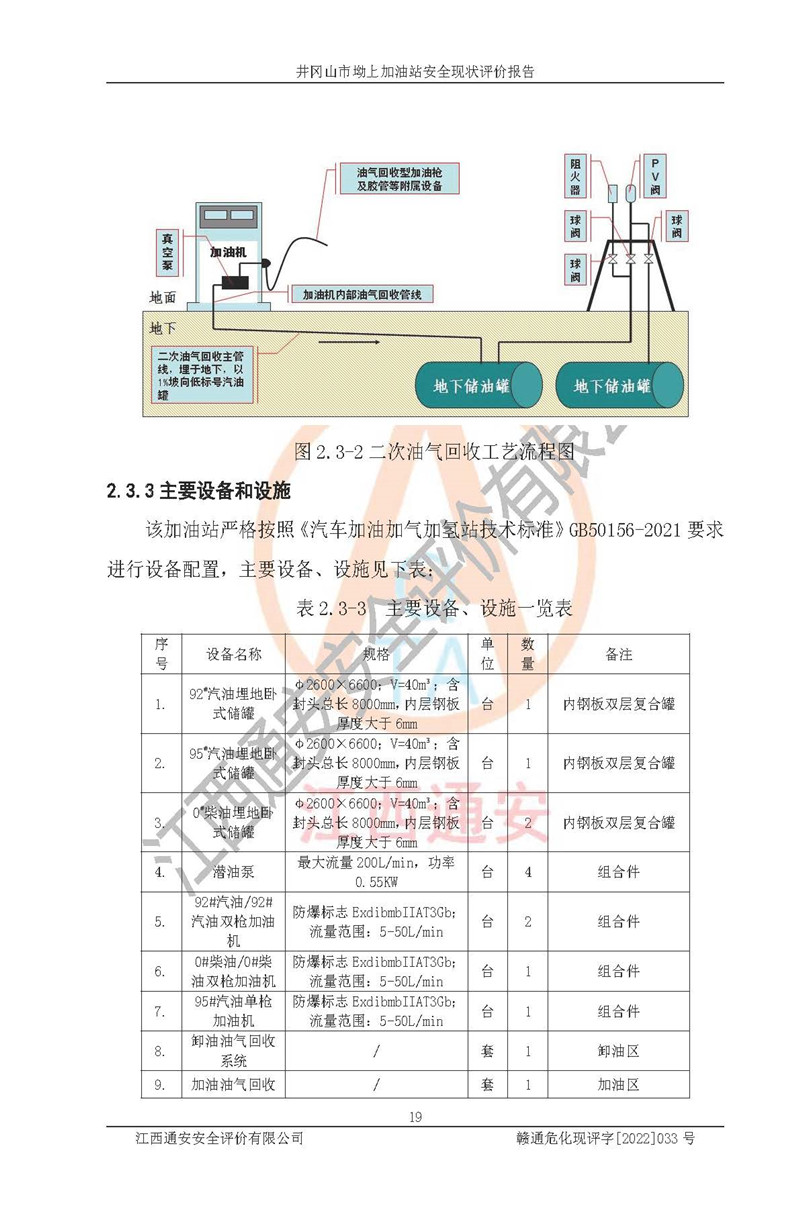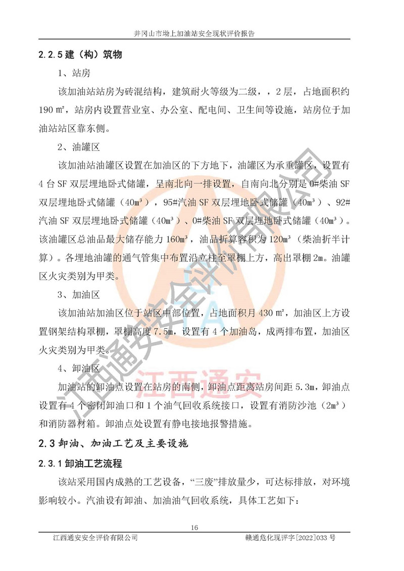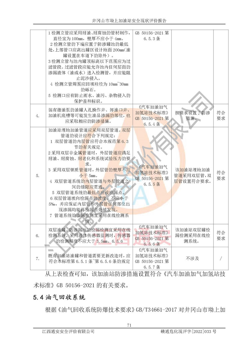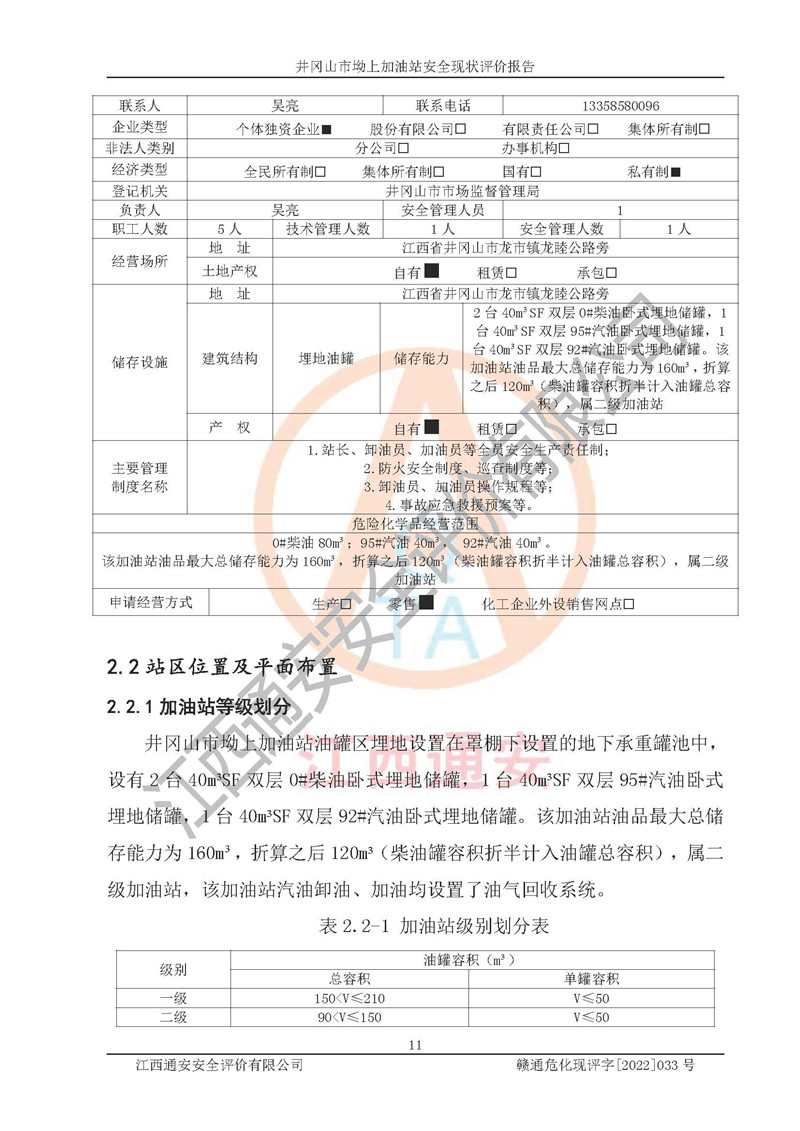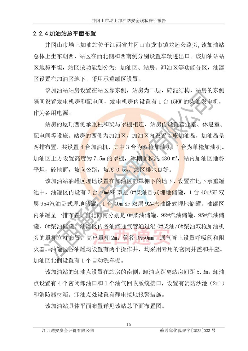 井冈山市坳上加油站占地面积约974㎡,该加油站油罐设置罩棚下的车道下面,在罩棚下设置承重罐池,承重罐池内每个隔池内油罐数量按不多于两台设置,密闭卸油点设在原罐区东北面靠护坡一侧。罩棚下设置的承重罐池设置240m³SF双层0#柴油卧式埋地储罐140m³SF双层95#汽油卧式埋地储罐,140m³SF双层92#汽油卧式埋地储罐。该加油站油品*大总储存能力为160m³,折算之后120m³(柴油罐容积折半计入油罐总容积),属二级加油站该加油站汽油卸油、加油均设置了油气回收系统。