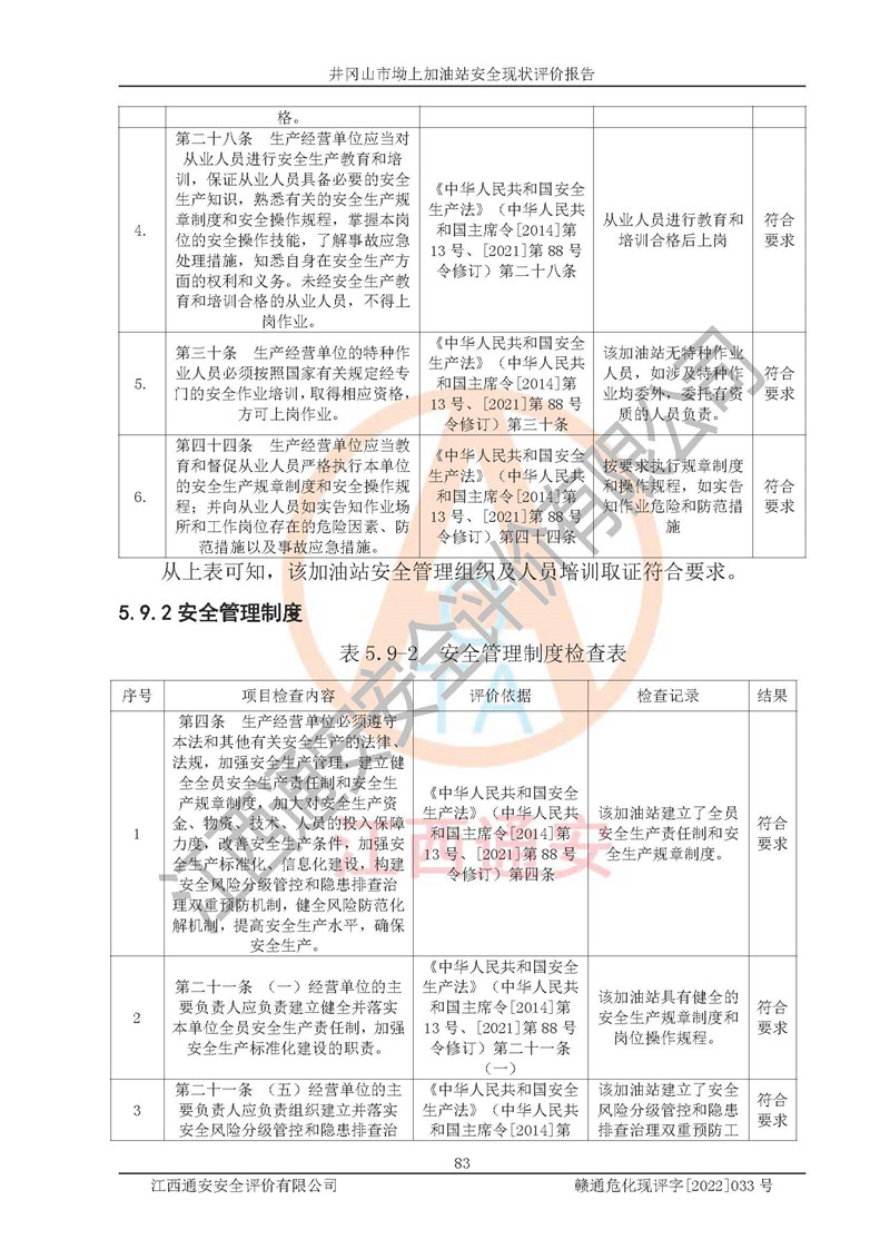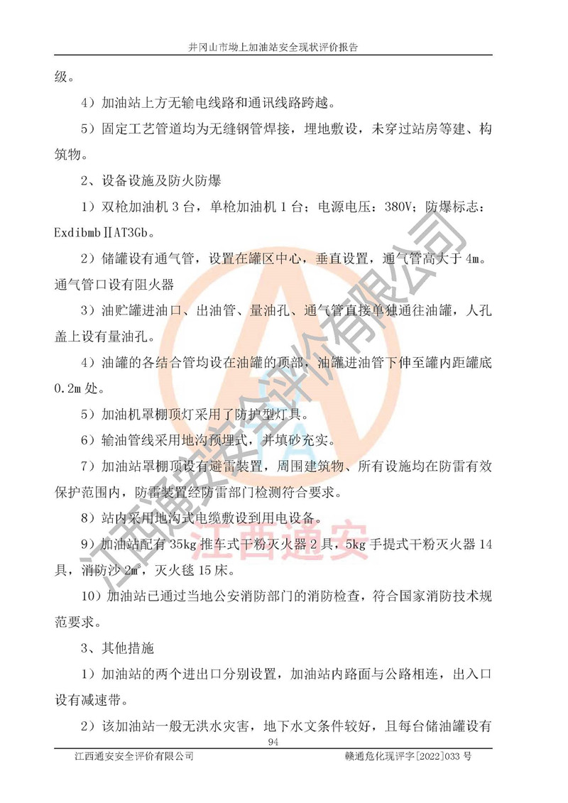井冈山市坳上加油站站址合理,周边环境良好,与敏感防护目标间距符合规范要求站区建构筑物之间的防火间距、耐火等级符合标准要求,与总平面布置图一致加油卸油工艺及设备设施合理,工艺布置得当,防雷设施经检测合格,采取的工艺安全设施符合规范要求;该加油站制定了安全管理制度和操作规程,人员经培训合格后上岗,安全管理人员经考核合格并取得安全合格证,能按照法律法规要求开展安全生产管理工作。