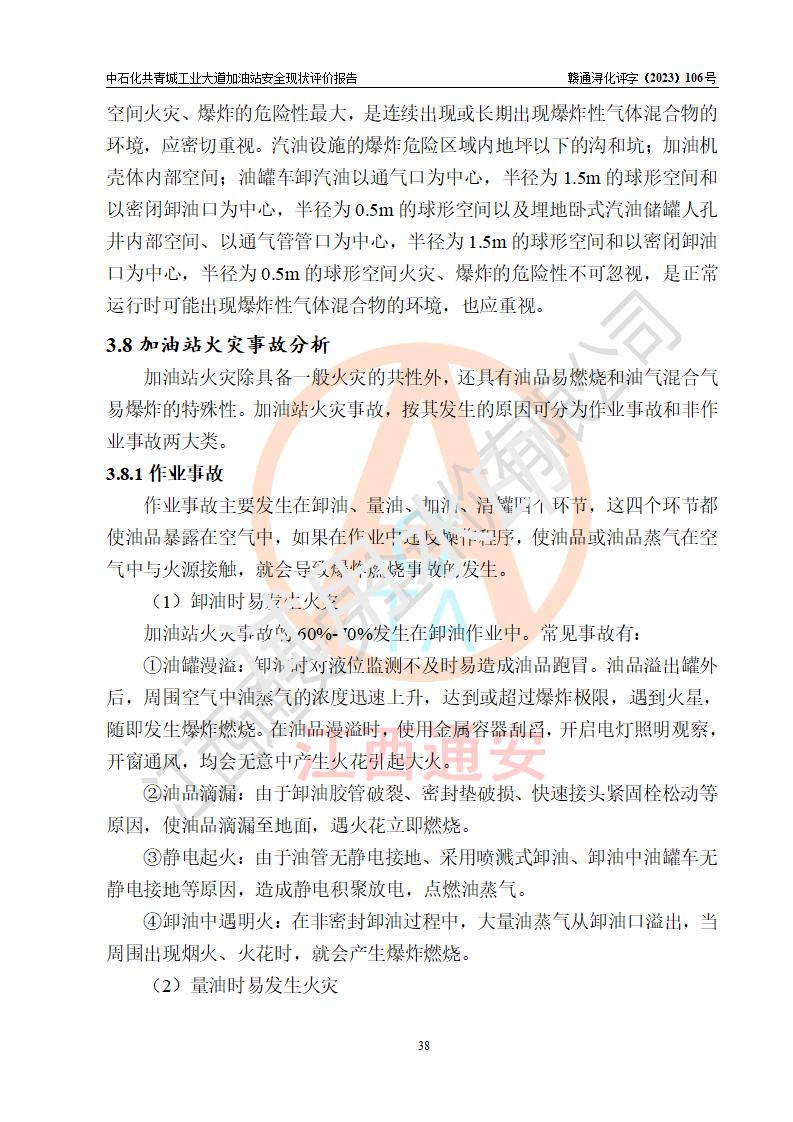 项目简介 | 中国石化销售股份有限公司江西九江共青城石油分公司工业大道加油站是一家专门从事成品油零售经营的有限公司分公司(外商投资企业分公司),经营场所位于江西省九江市共青城市工业新区内共星大道(北纬七路)南侧、工业大道东侧。现有从业人员3名,其中安全管理人员1人,加油站负责人张景飞。 该加油站占地面积4000m2,站区内设置有4台双枪税控燃油加油机及配套的工艺管线,设有SF双层储罐4台,其中30m3的92#汽油储罐1台、30m3的95#汽油储罐1台、30m3的0#柴油储罐2台,油品储罐总容积为120m3(折算成汽油为90m3),按现行《汽车加油加气加氢站技术标准》对加油站的等级划分原则,属三级加油站。 该站由共青城市行政审批局换发《危险化学品经营许可证》(证号:赣共危化经字[2017]000003号),**期限2020年10月31日至2023年10月30日。 | |||