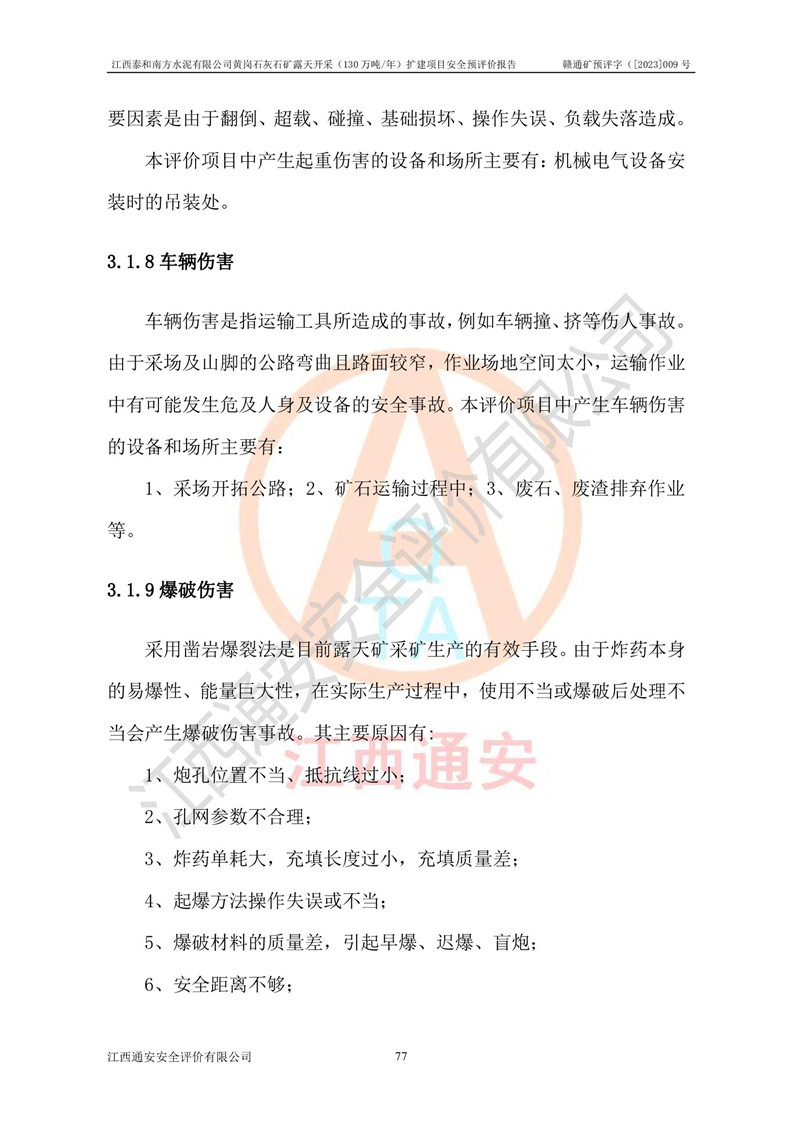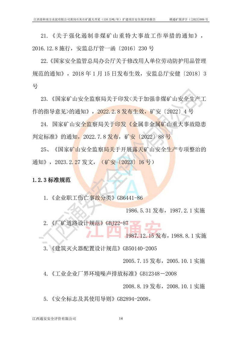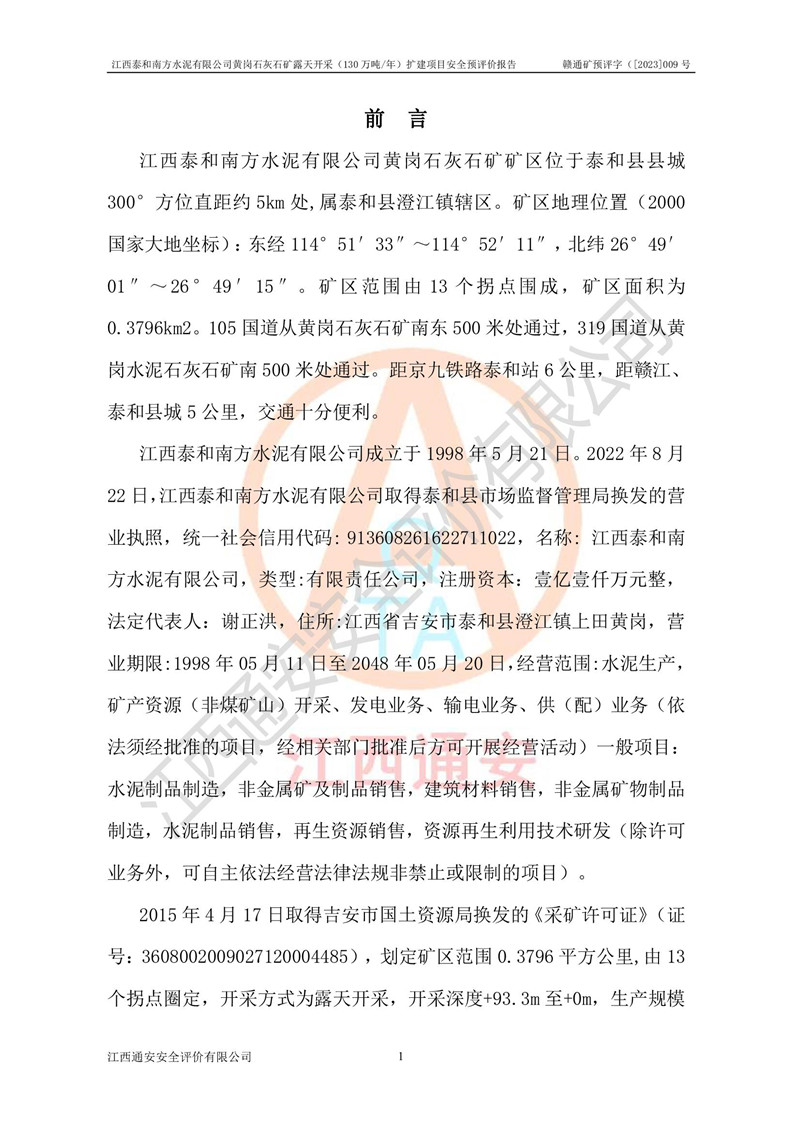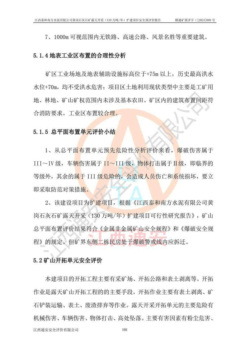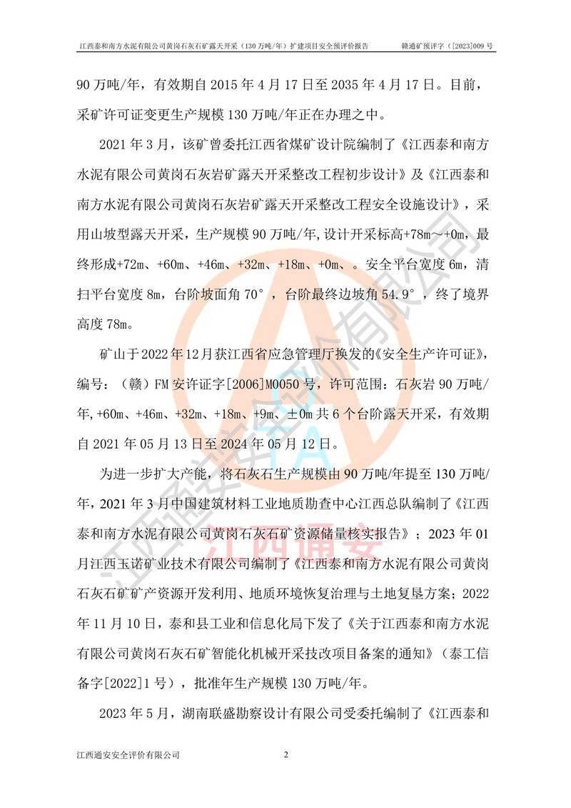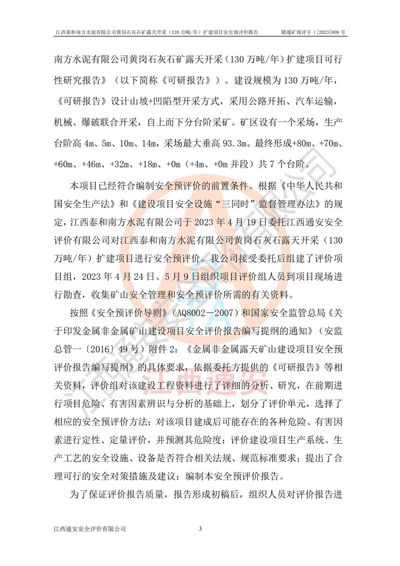 评价报告名称 | 江西泰和南方水泥有限公司黄岗石灰石矿露天开采(130万吨/年)扩建项目安全预评价报告 | ||||