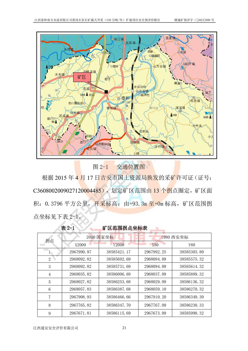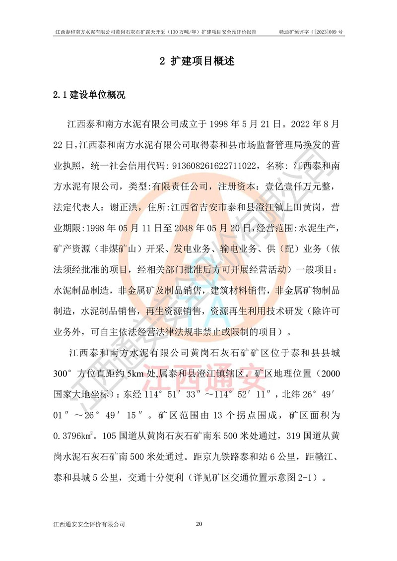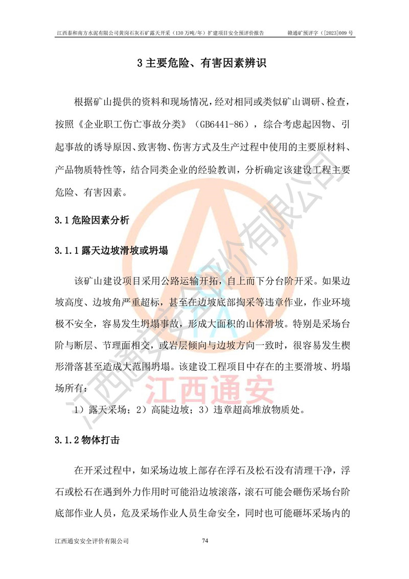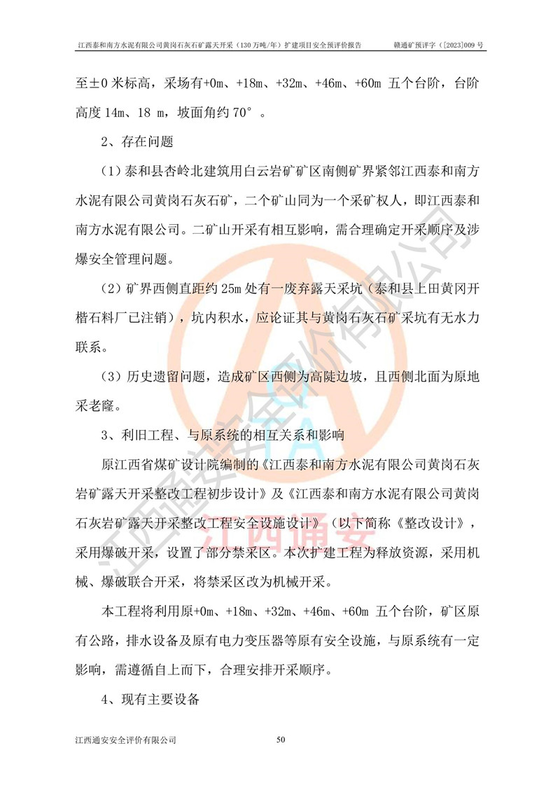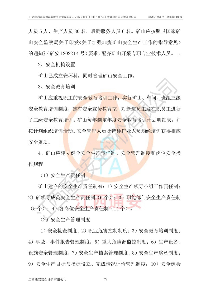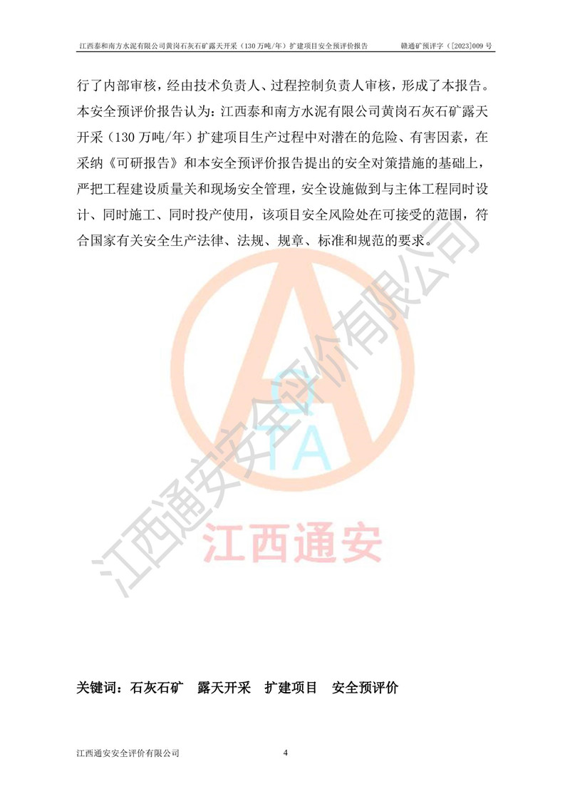 评价报告名称 | 江西泰和南方水泥有限公司黄岗石灰石矿露天开采(130万吨/年)扩建项目安全预评价报告 | ||||
