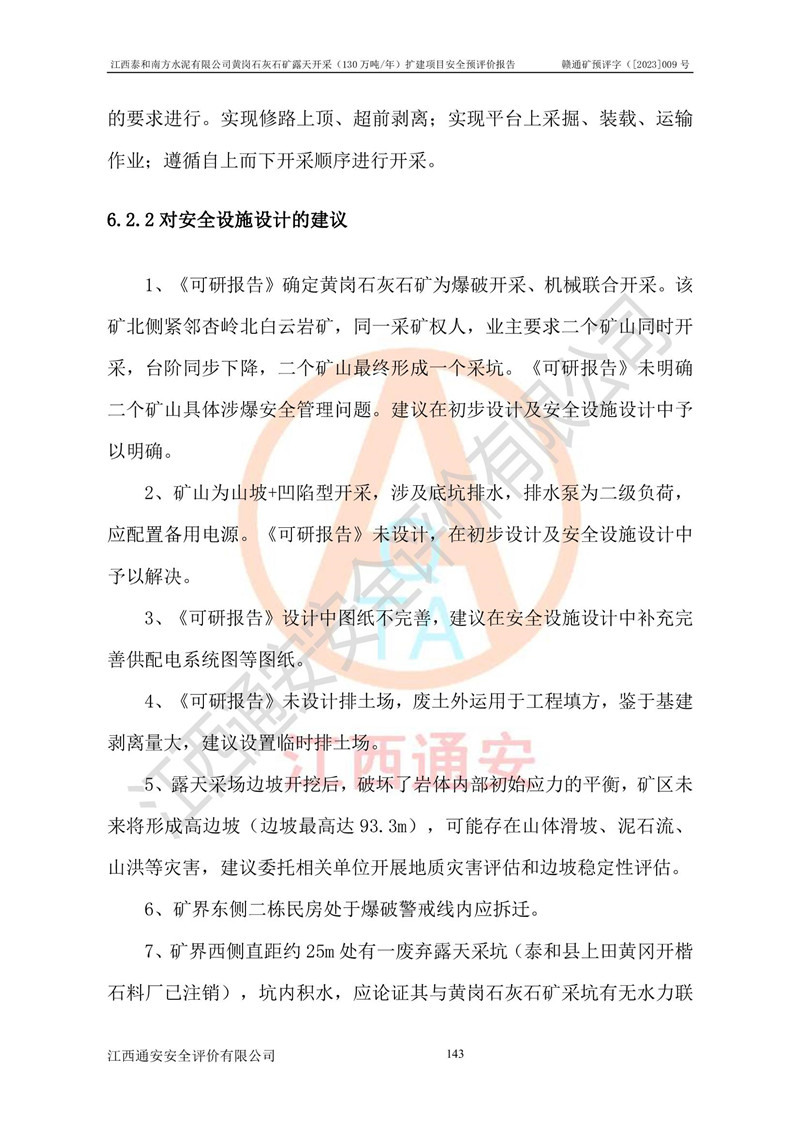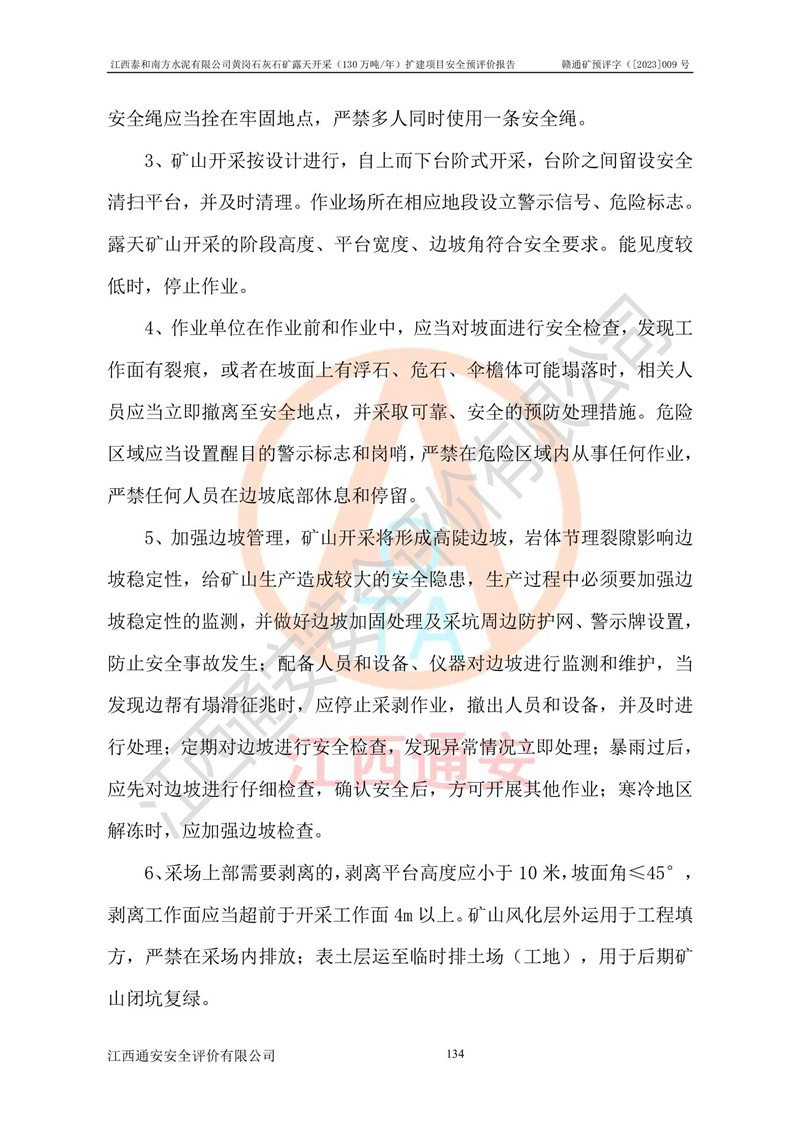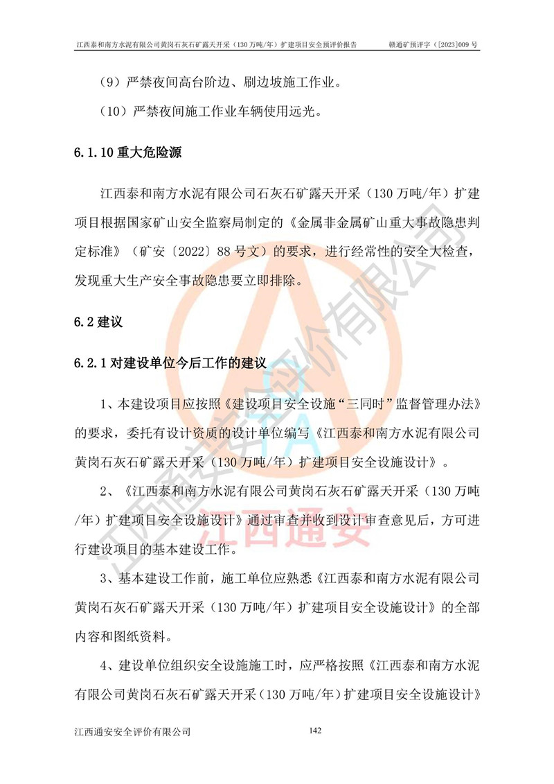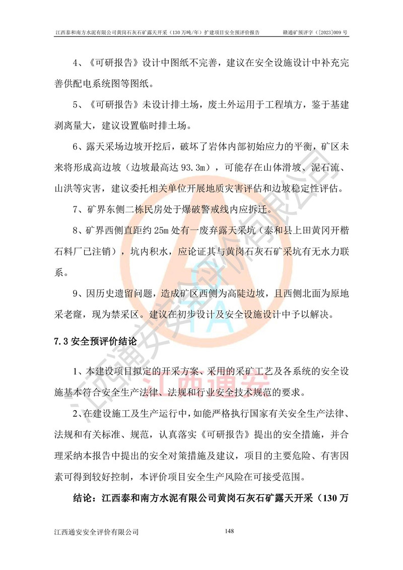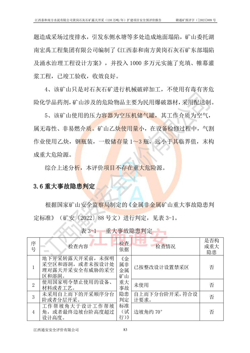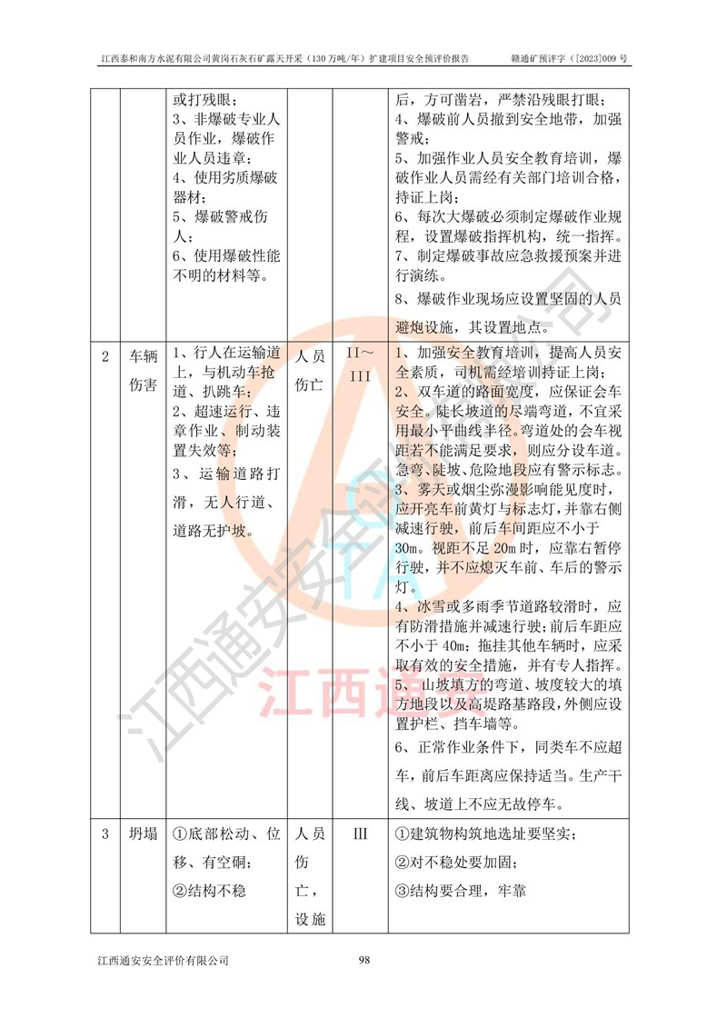 评价结论 | 1、本建设项目拟定的开采方案、采用的采矿工艺及各系统的安全设施基本符合安全生产法律、法规和行业安全技术规范的要求。 2、在建设施工及生产运行中,如能严格执行**有关安全生产法律、法规和有关标准、规范,认真落实《可研报告》提出的安全措施,并合理采纳本报告中提出的安全对策措施及建议,项目的主要危险、有害因素可得到较好控制,本评价项目安全生产风险在可接受范围。 结论:江西泰和南方水泥有限公司黄岗石灰石矿露天开采(130万吨/年)扩建项目从安全生产角度符合**有关安全生产法律、法规、规章、标准和规范的要求,风险可以接受。 | ||||