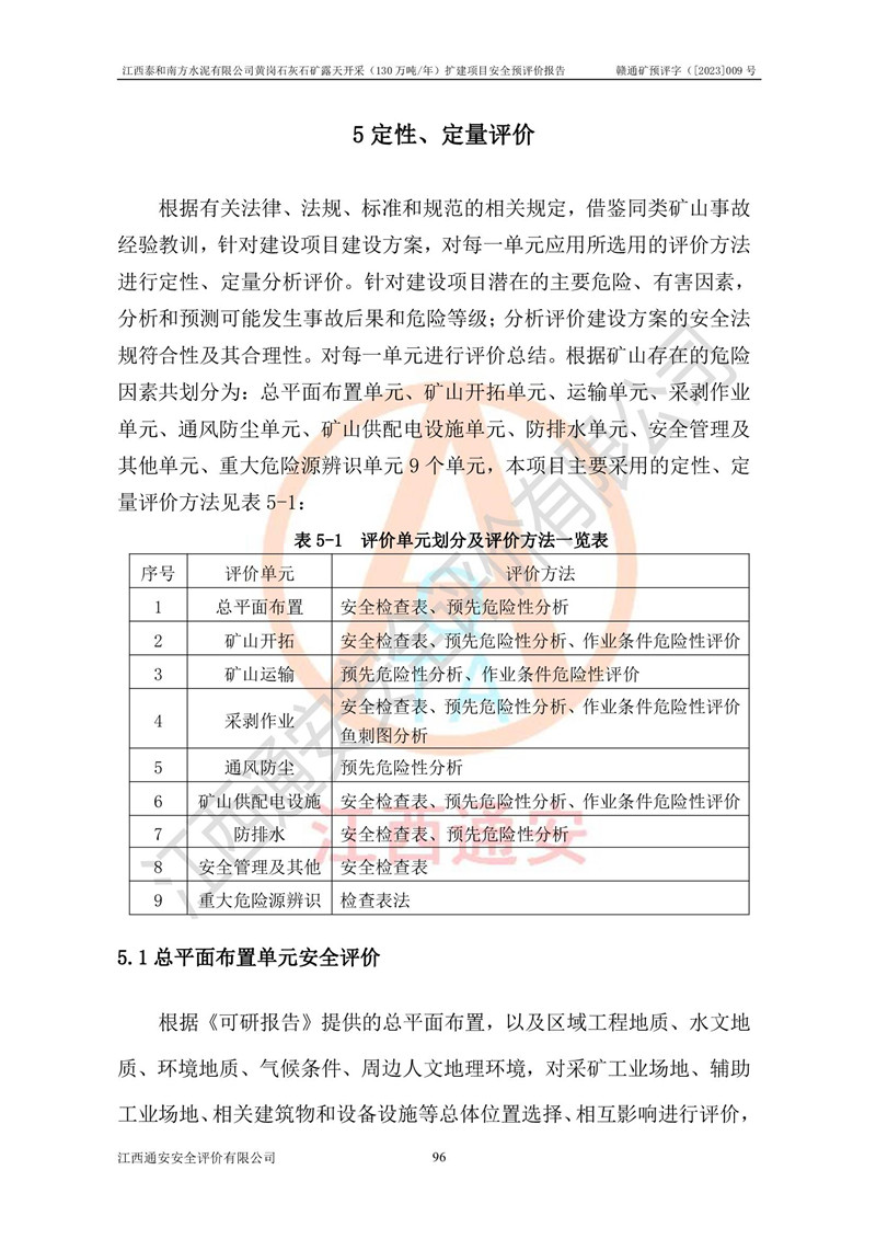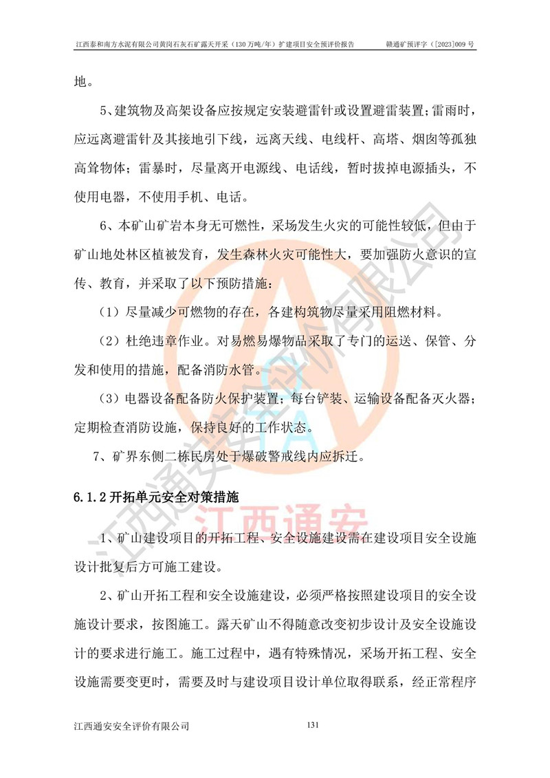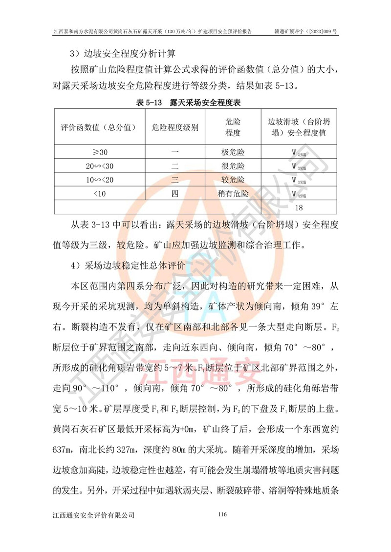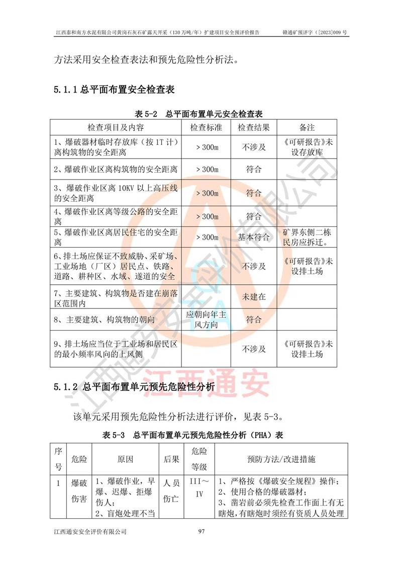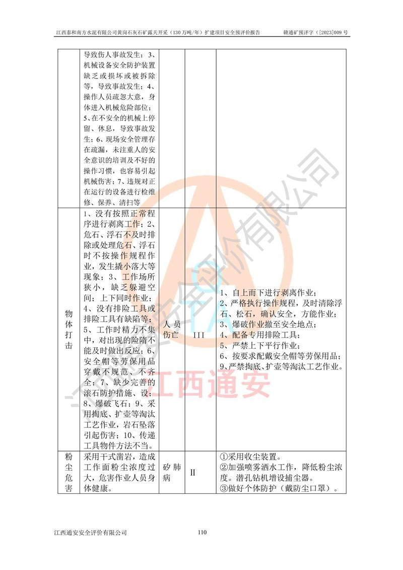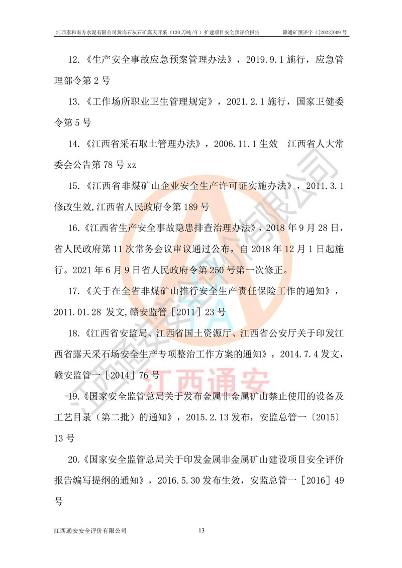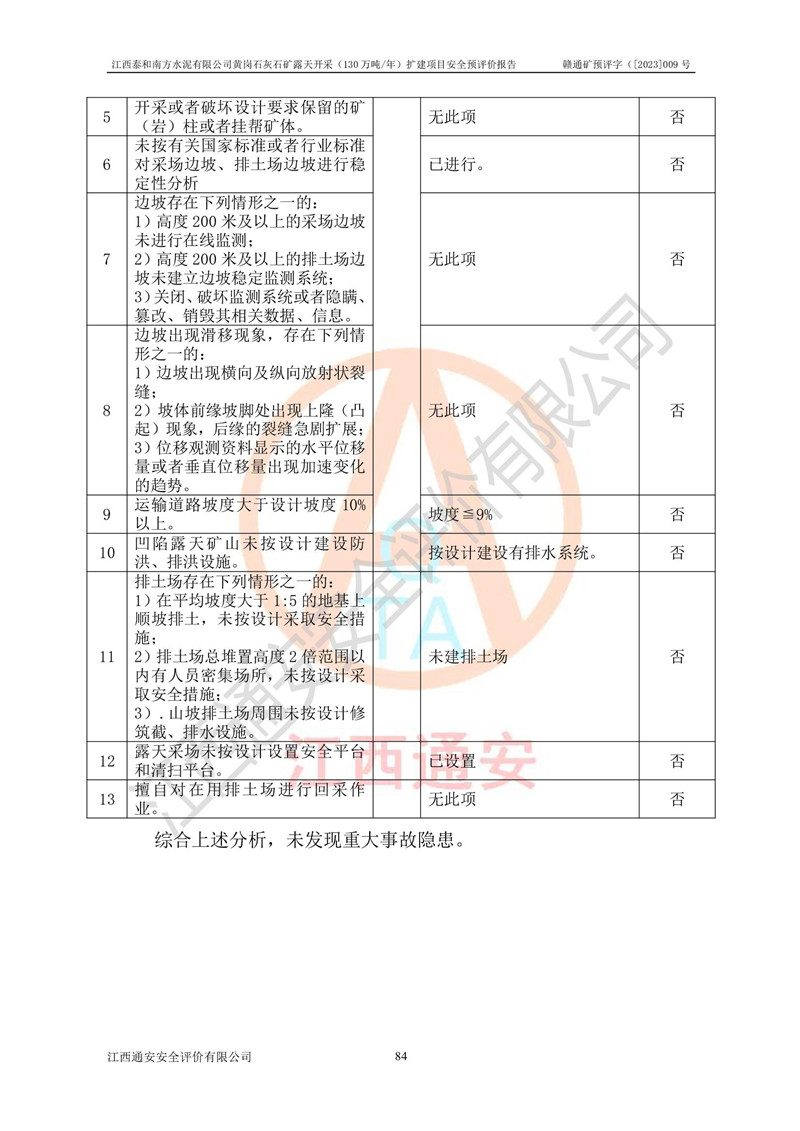评价结论 | 1、本建设项目拟定的开采方案、采用的采矿工艺及各系统的安全设施基本符合安全生产法律、法规和行业安全技术规范的要求。 2、在建设施工及生产运行中,如能严格执行**有关安全生产法律、法规和有关标准、规范,认真落实《可研报告》提出的安全措施,并合理采纳本报告中提出的安全对策措施及建议,项目的主要危险、有害因素可得到较好控制,本评价项目安全生产风险在可接受范围。 结论:江西泰和南方水泥有限公司黄岗石灰石矿露天开采(130万吨/年)扩建项目从安全生产角度符合**有关安全生产法律、法规、规章、标准和规范的要求,风险可以接受。 | ||||