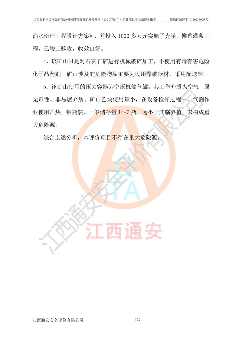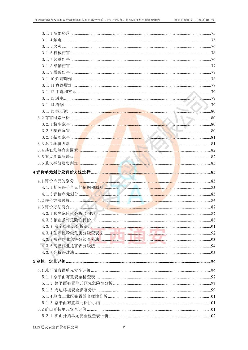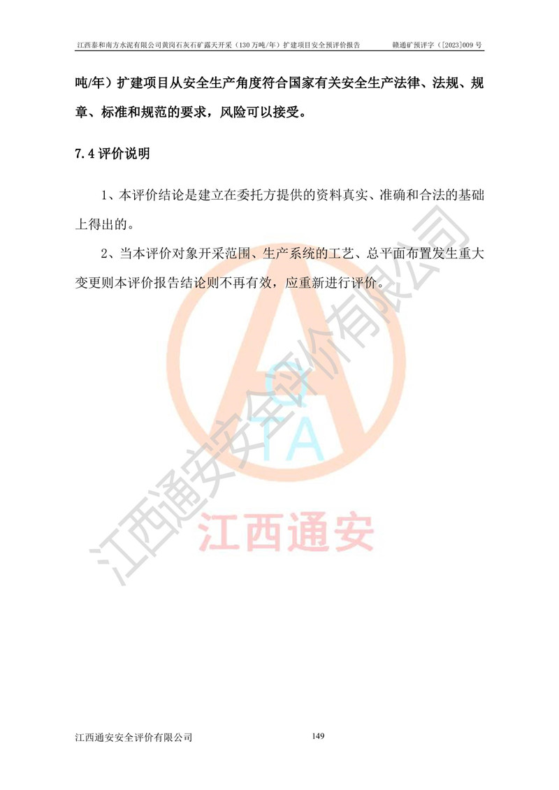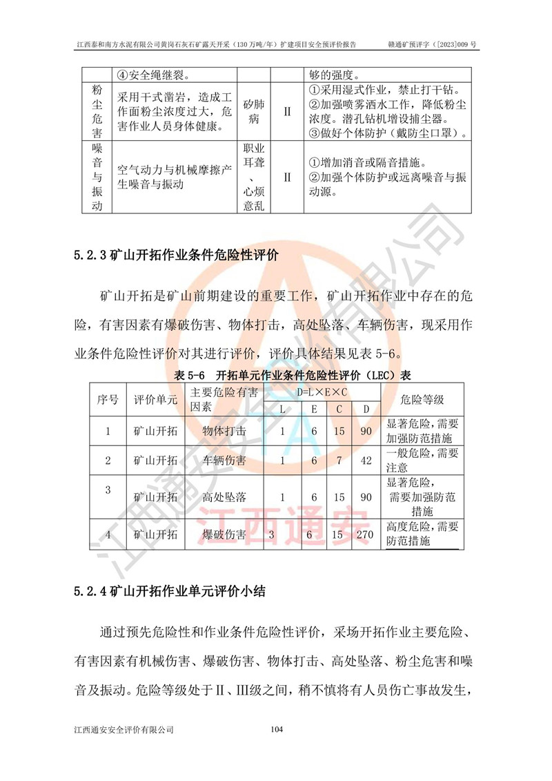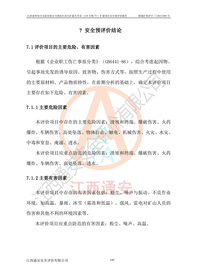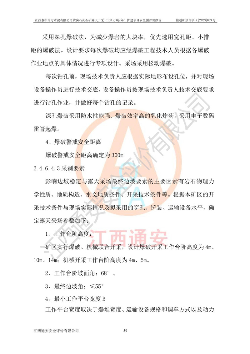 评价结论 | 1、本建设项目拟定的开采方案、采用的采矿工艺及各系统的安全设施基本符合安全生产法律、法规和行业安全技术规范的要求。 2、在建设施工及生产运行中,如能严格执行**有关安全生产法律、法规和有关标准、规范,认真落实《可研报告》提出的安全措施,并合理采纳本报告中提出的安全对策措施及建议,项目的主要危险、有害因素可得到较好控制,本评价项目安全生产风险在可接受范围。 结论:江西泰和南方水泥有限公司黄岗石灰石矿露天开采(130万吨/年)扩建项目从安全生产角度符合**有关安全生产法律、法规、规章、标准和规范的要求,风险可以接受。 | ||||