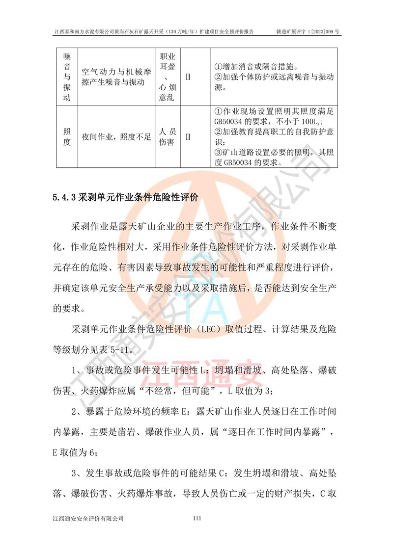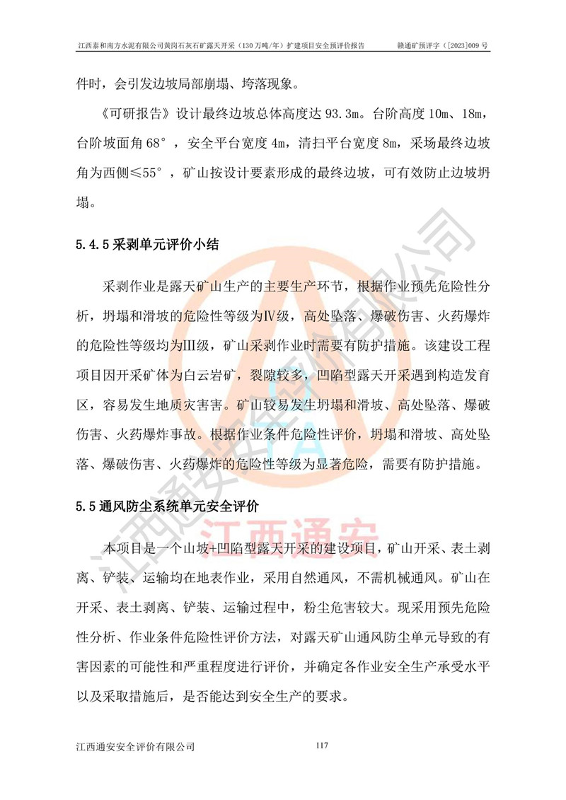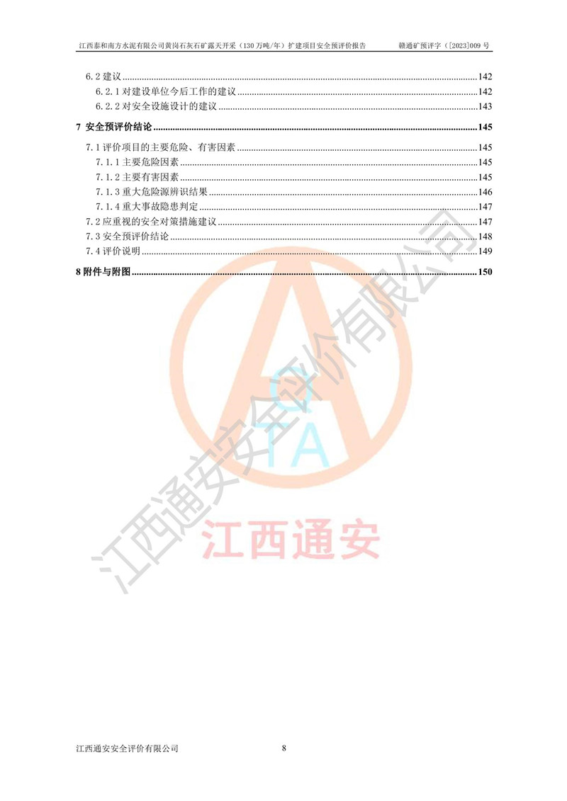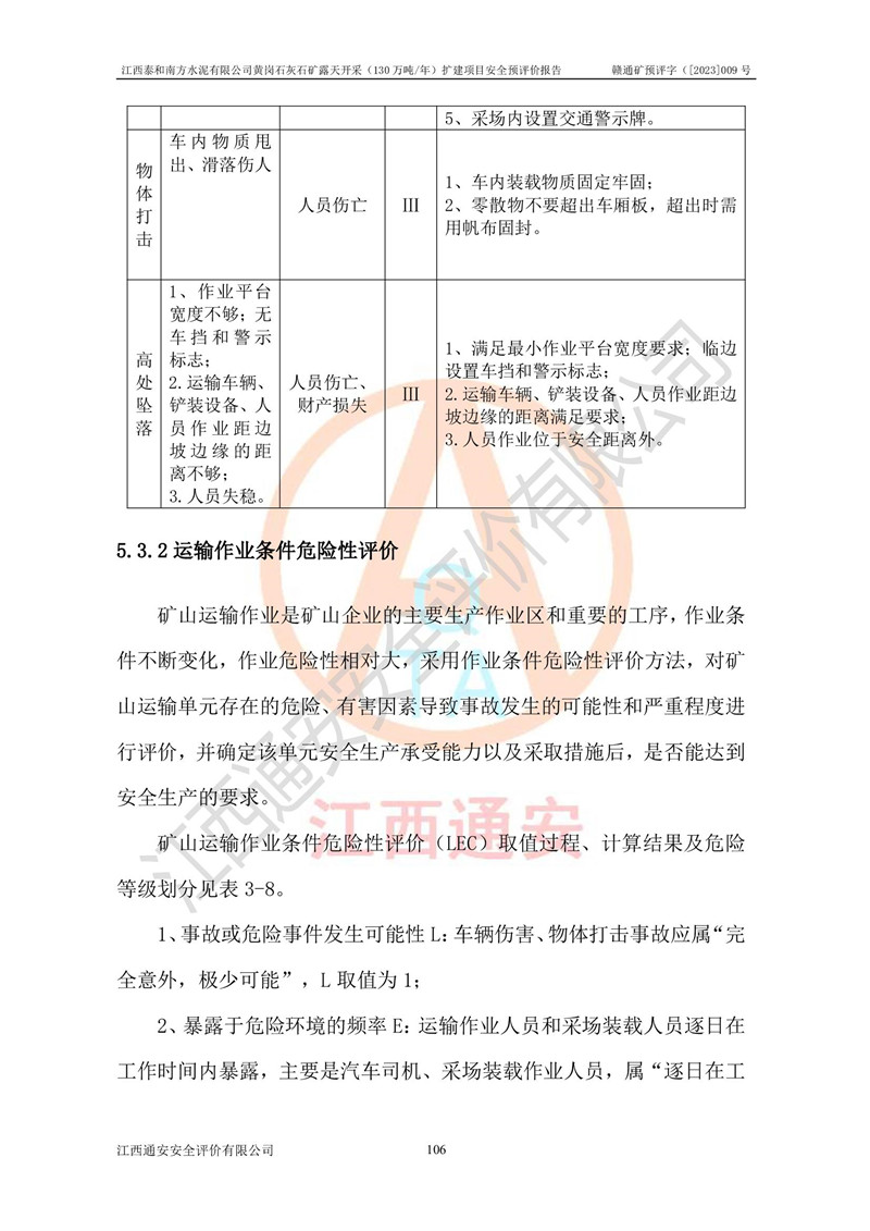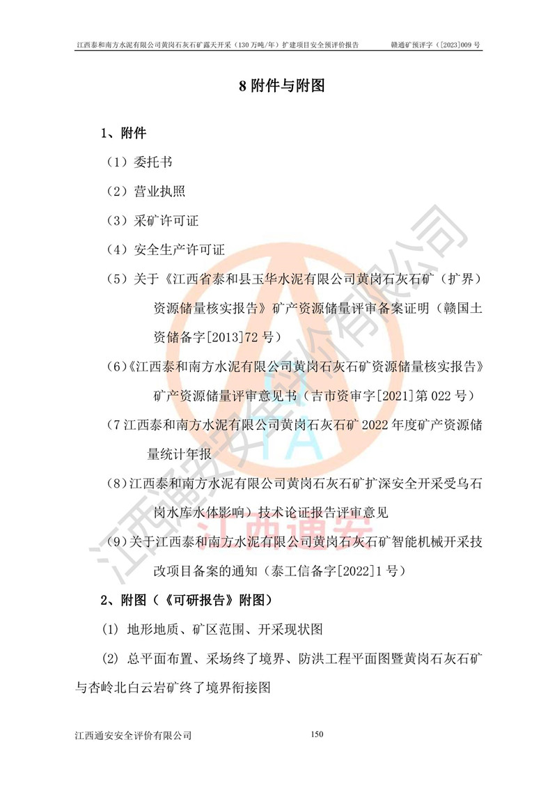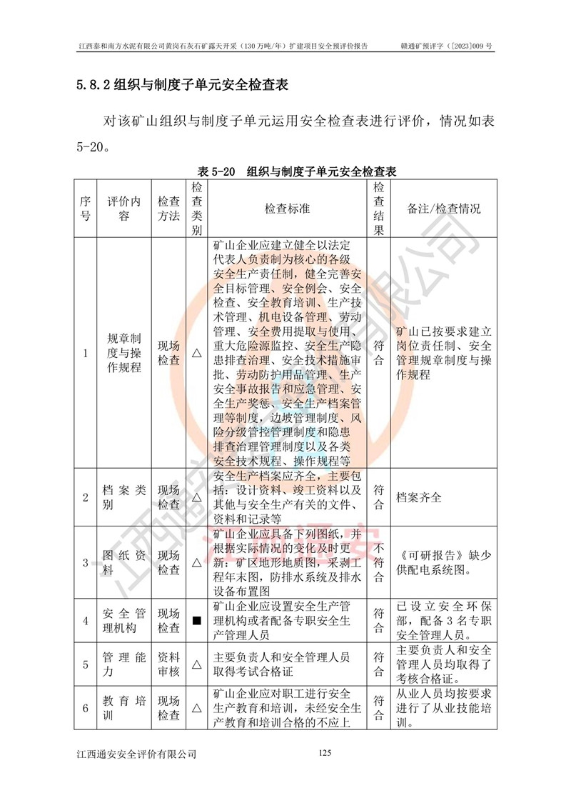 评价结论 | 1、本建设项目拟定的开采方案、采用的采矿工艺及各系统的安全设施基本符合安全生产法律、法规和行业安全技术规范的要求。 2、在建设施工及生产运行中,如能严格执行**有关安全生产法律、法规和有关标准、规范,认真落实《可研报告》提出的安全措施,并合理采纳本报告中提出的安全对策措施及建议,项目的主要危险、有害因素可得到较好控制,本评价项目安全生产风险在可接受范围。 结论:江西泰和南方水泥有限公司黄岗石灰石矿露天开采(130万吨/年)扩建项目从安全生产角度符合**有关安全生产法律、法规、规章、标准和规范的要求,风险可以接受。 | ||||
