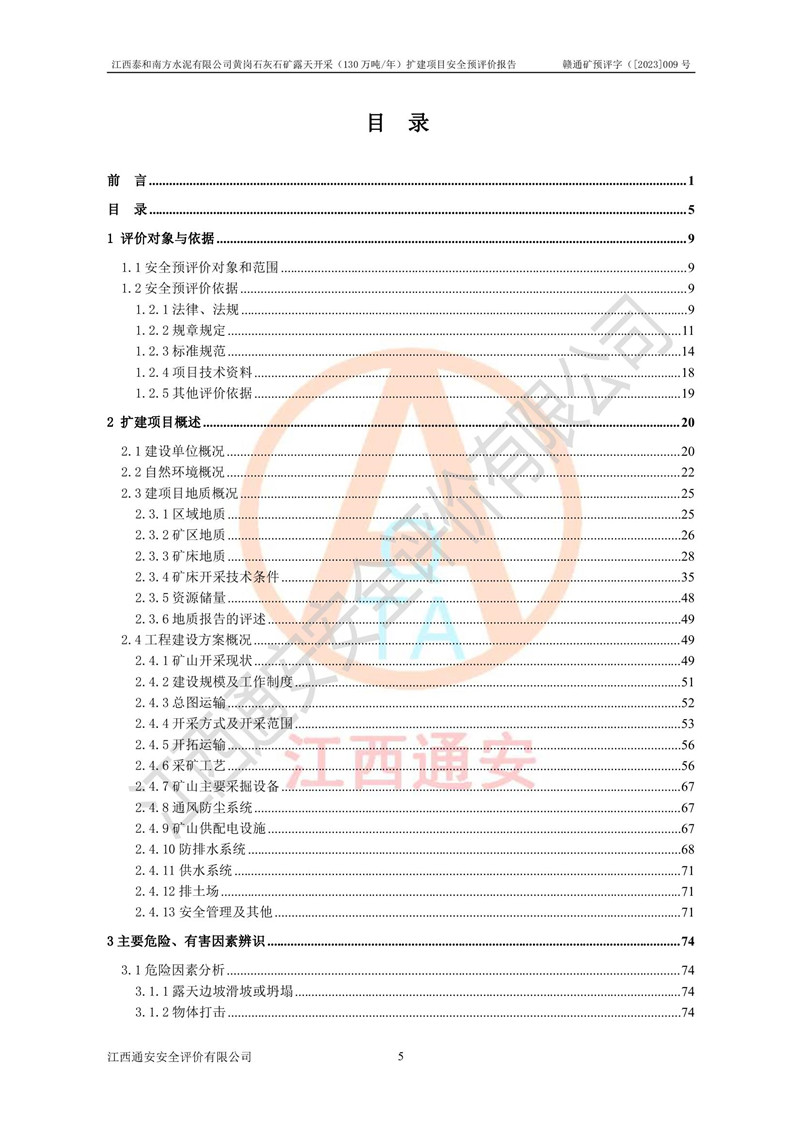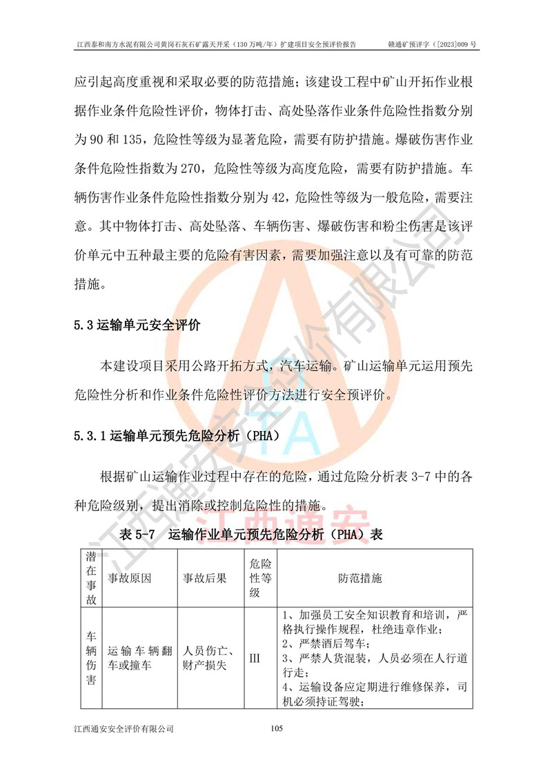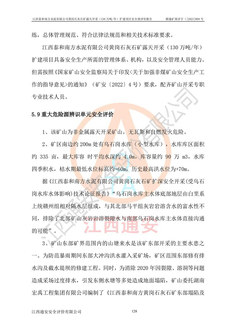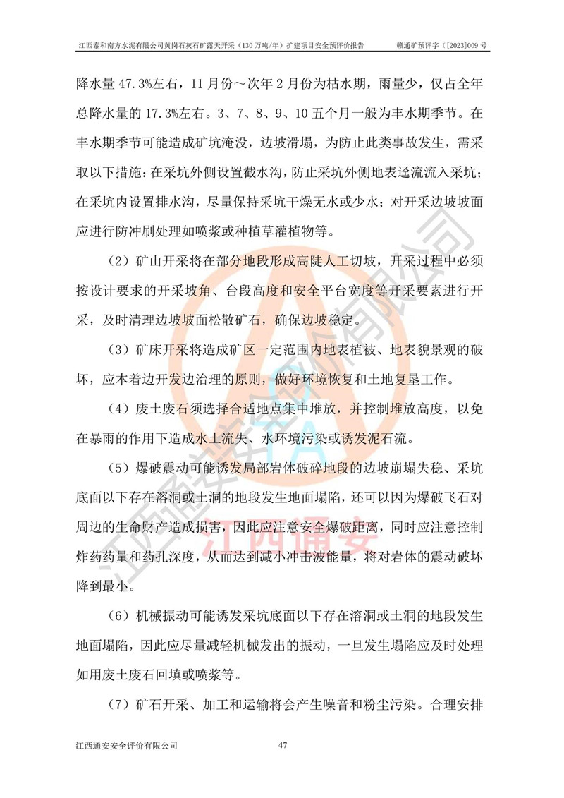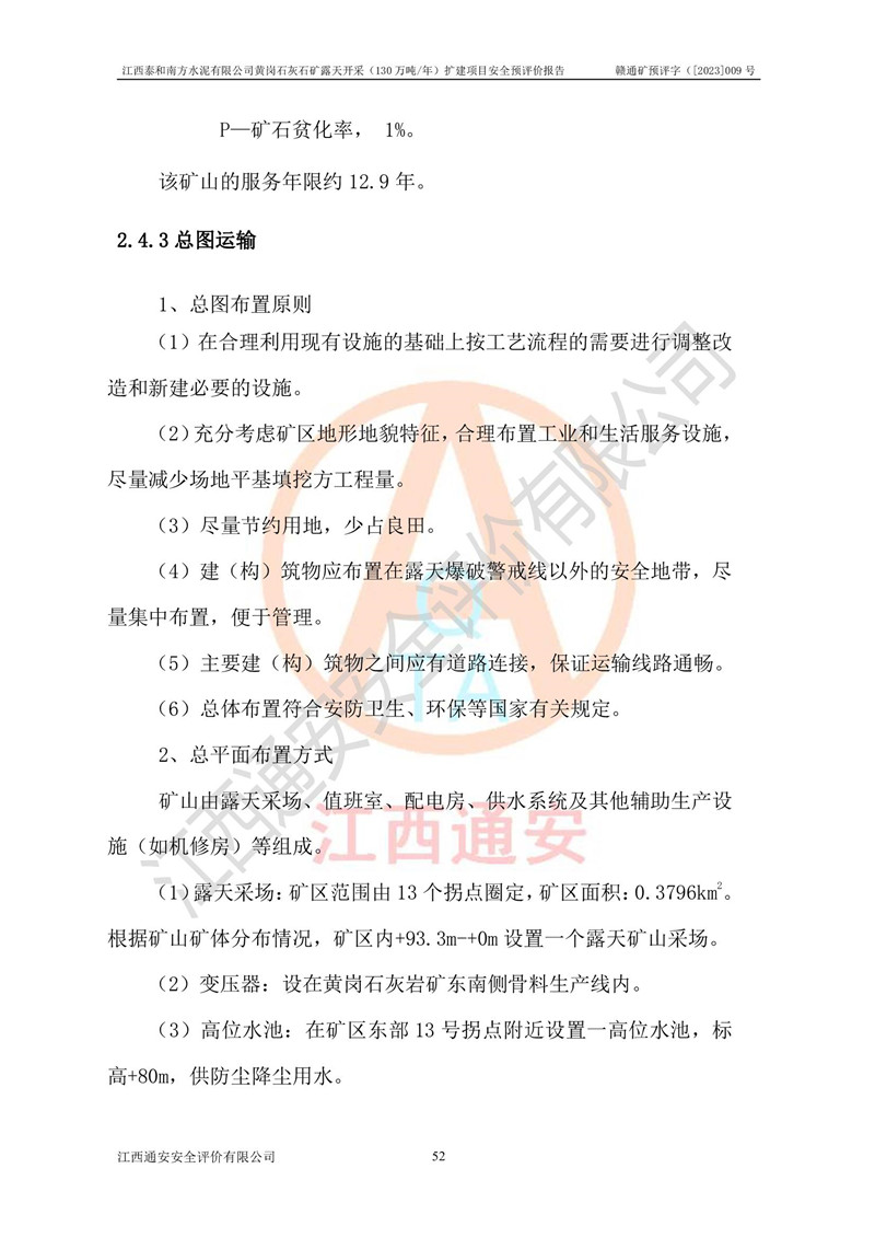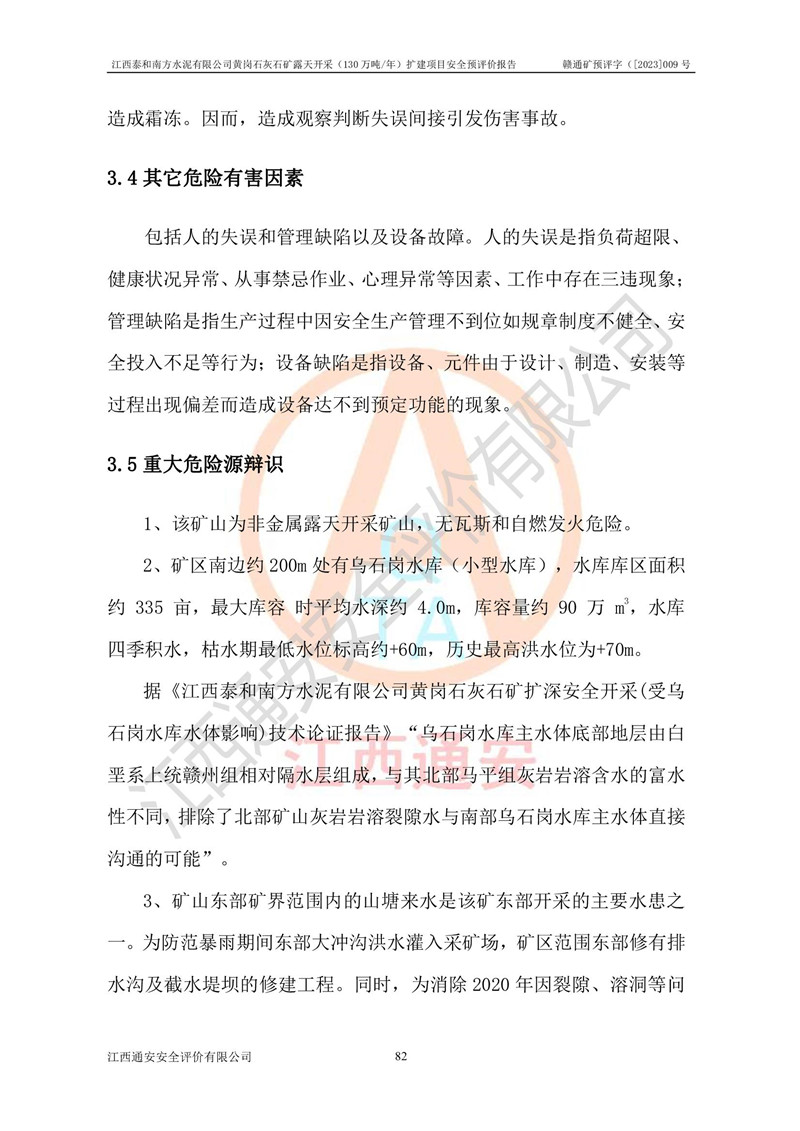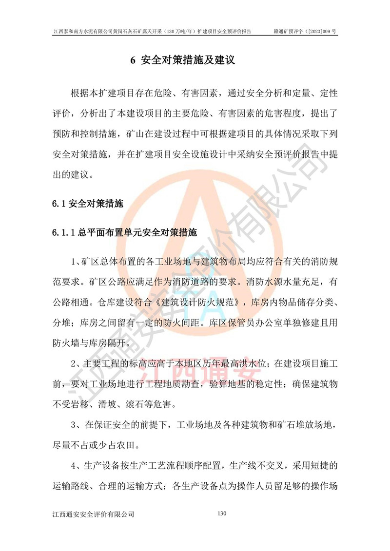 评价结论 | 1、本建设项目拟定的开采方案、采用的采矿工艺及各系统的安全设施基本符合安全生产法律、法规和行业安全技术规范的要求。 2、在建设施工及生产运行中,如能严格执行**有关安全生产法律、法规和有关标准、规范,认真落实《可研报告》提出的安全措施,并合理采纳本报告中提出的安全对策措施及建议,项目的主要危险、有害因素可得到较好控制,本评价项目安全生产风险在可接受范围。 结论:江西泰和南方水泥有限公司黄岗石灰石矿露天开采(130万吨/年)扩建项目从安全生产角度符合**有关安全生产法律、法规、规章、标准和规范的要求,风险可以接受。 | ||||
