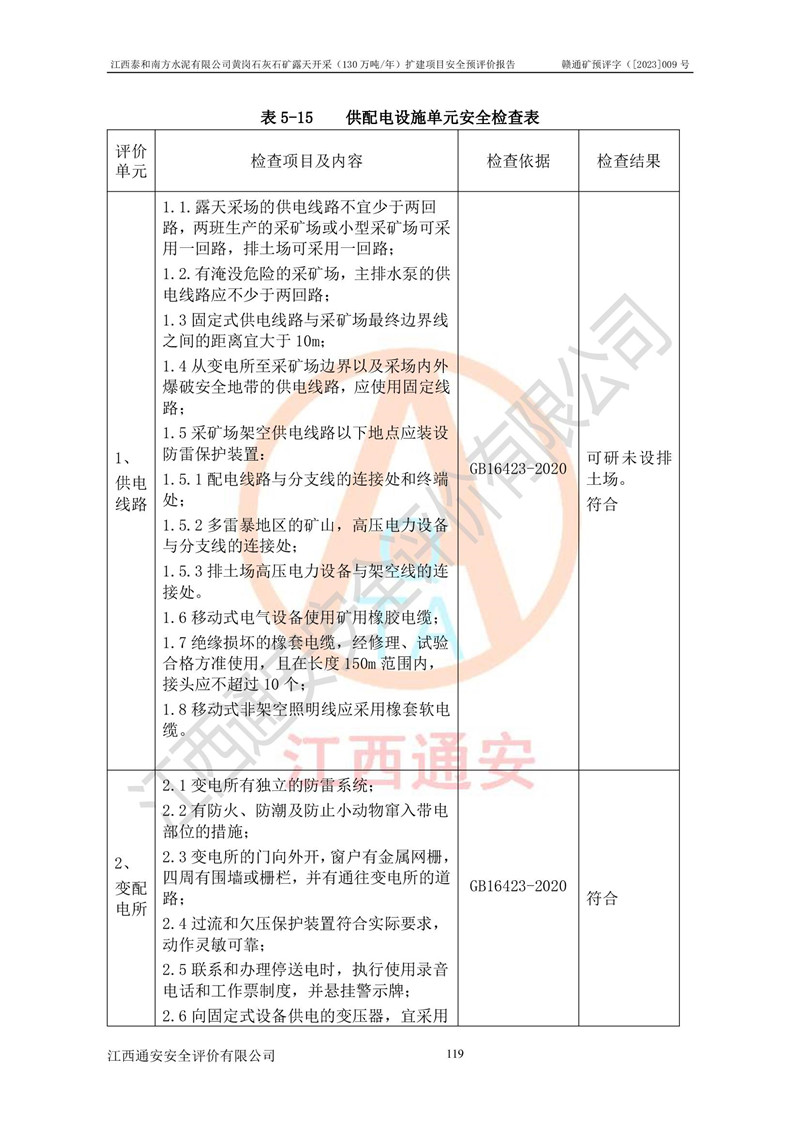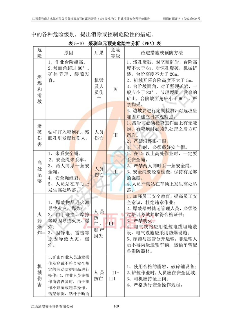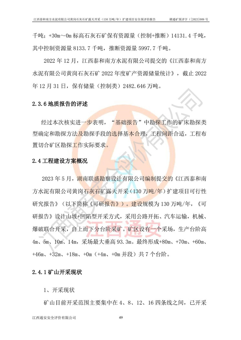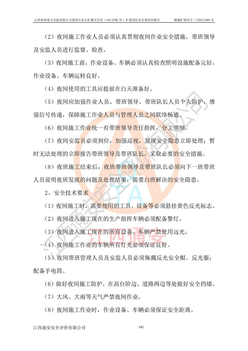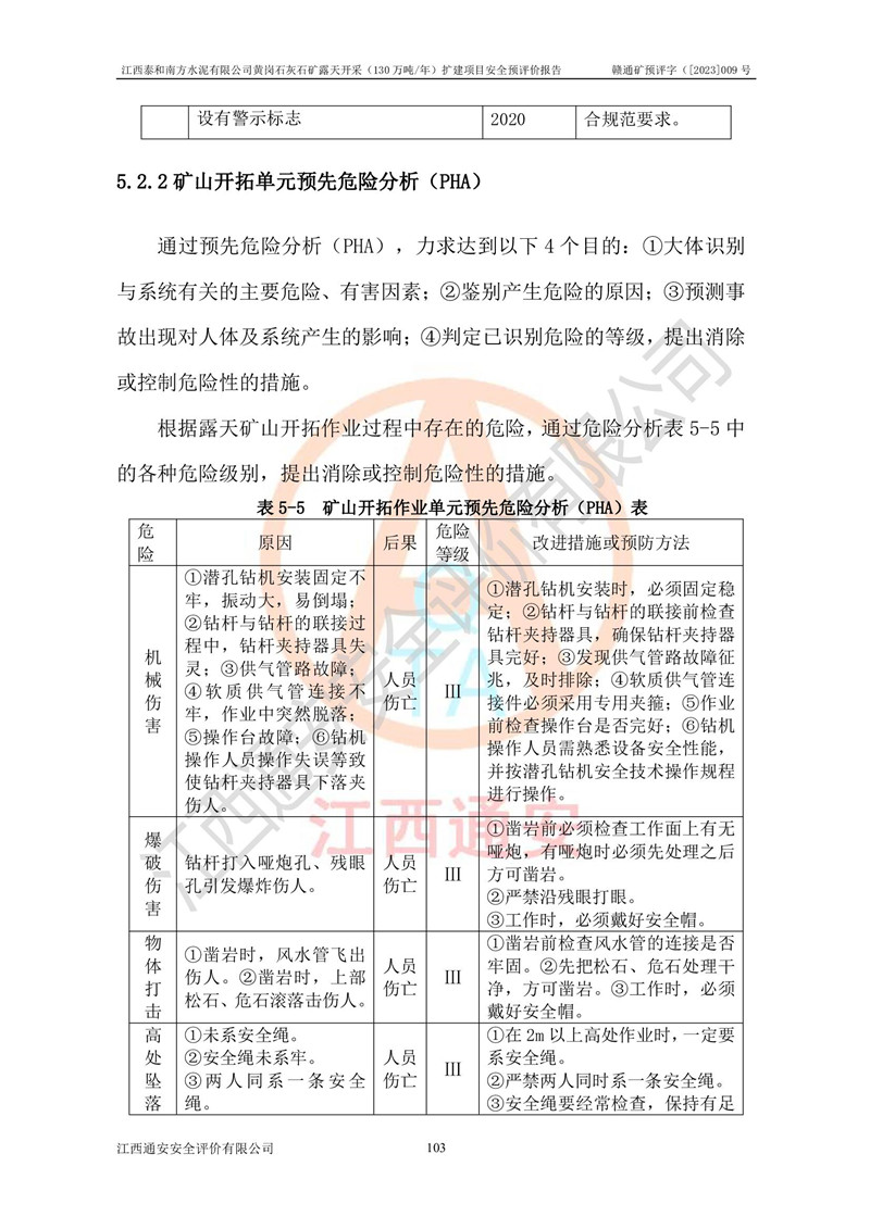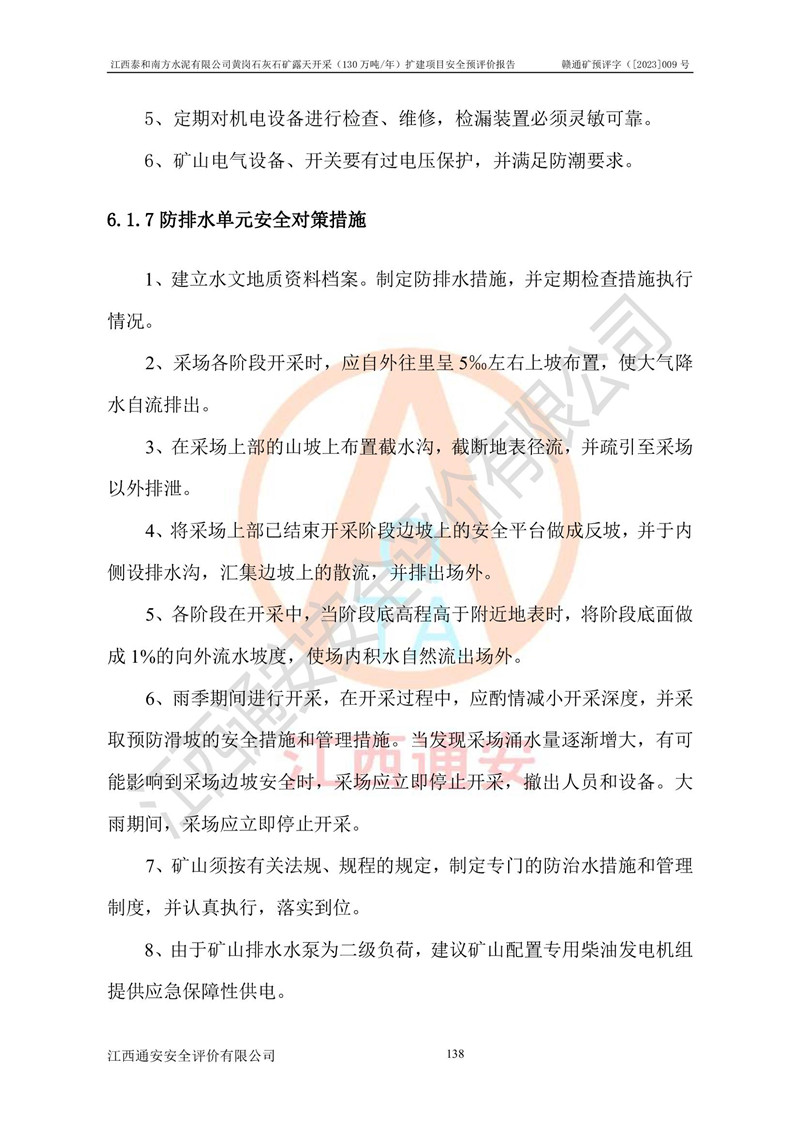 评价结论 | 1、本建设项目拟定的开采方案、采用的采矿工艺及各系统的安全设施基本符合安全生产法律、法规和行业安全技术规范的要求。 2、在建设施工及生产运行中,如能严格执行**有关安全生产法律、法规和有关标准、规范,认真落实《可研报告》提出的安全措施,并合理采纳本报告中提出的安全对策措施及建议,项目的主要危险、有害因素可得到较好控制,本评价项目安全生产风险在可接受范围。 结论:江西泰和南方水泥有限公司黄岗石灰石矿露天开采(130万吨/年)扩建项目从安全生产角度符合**有关安全生产法律、法规、规章、标准和规范的要求,风险可以接受。 | ||||