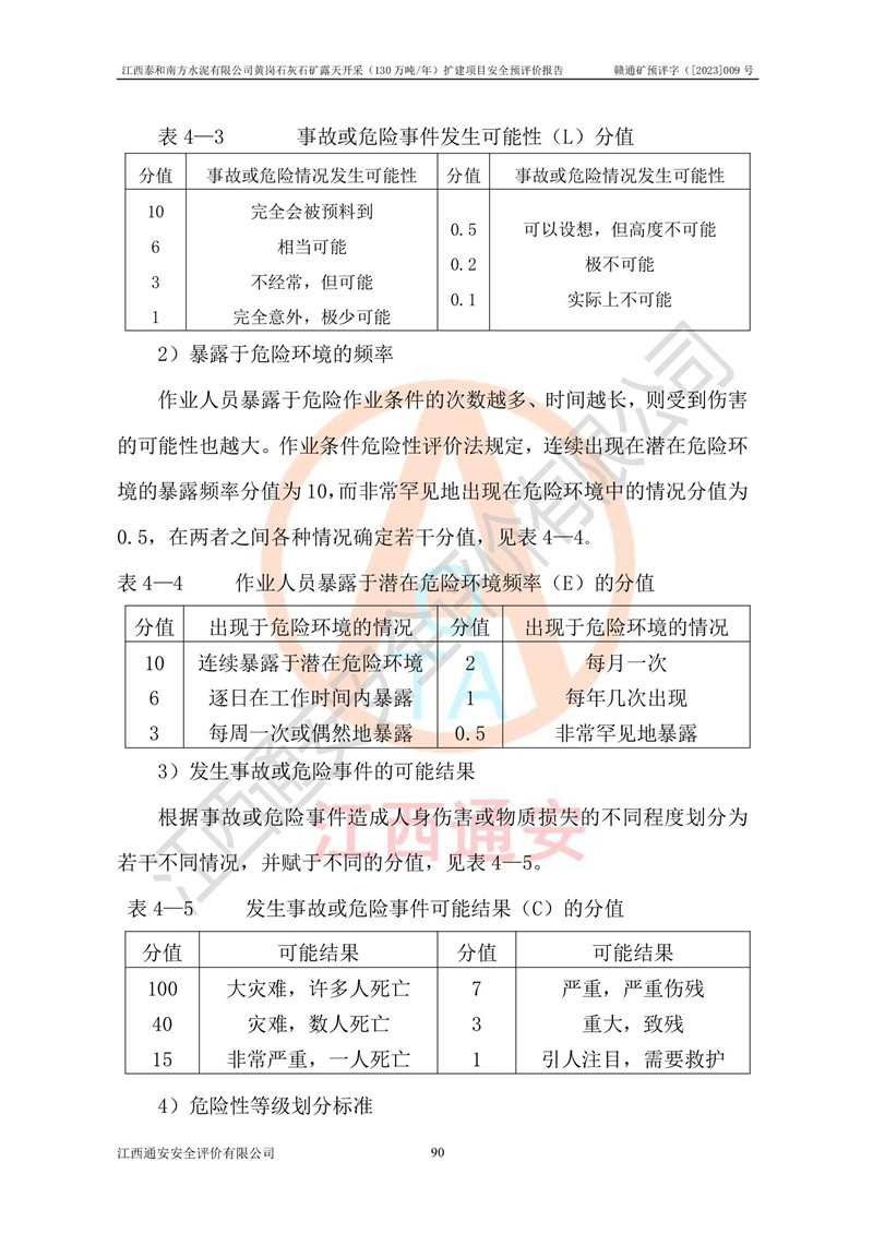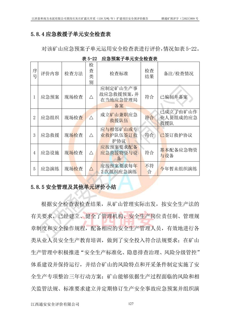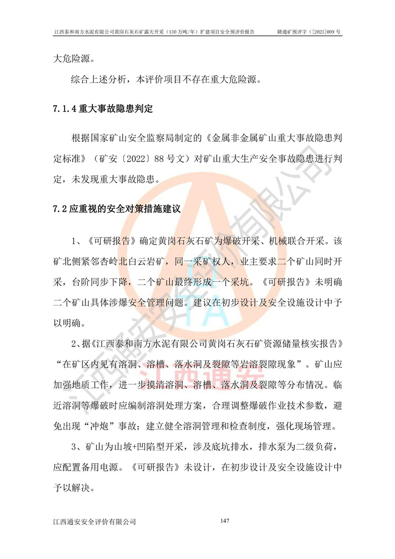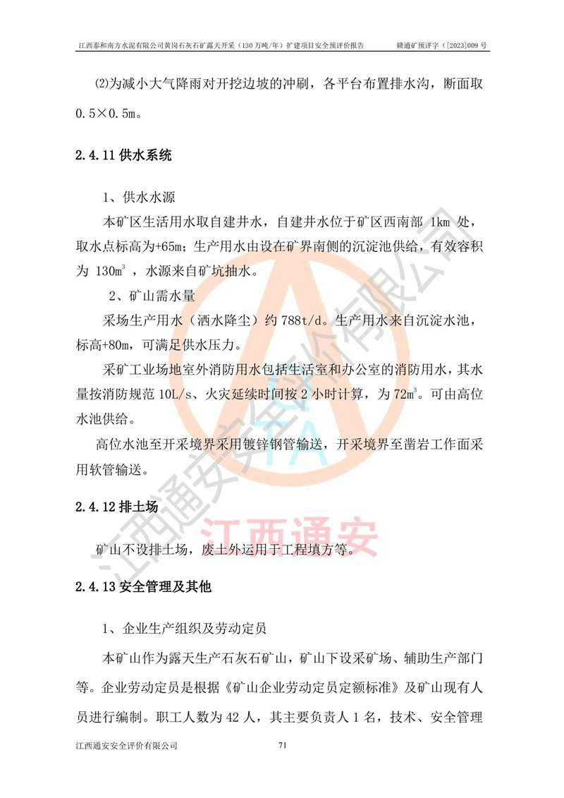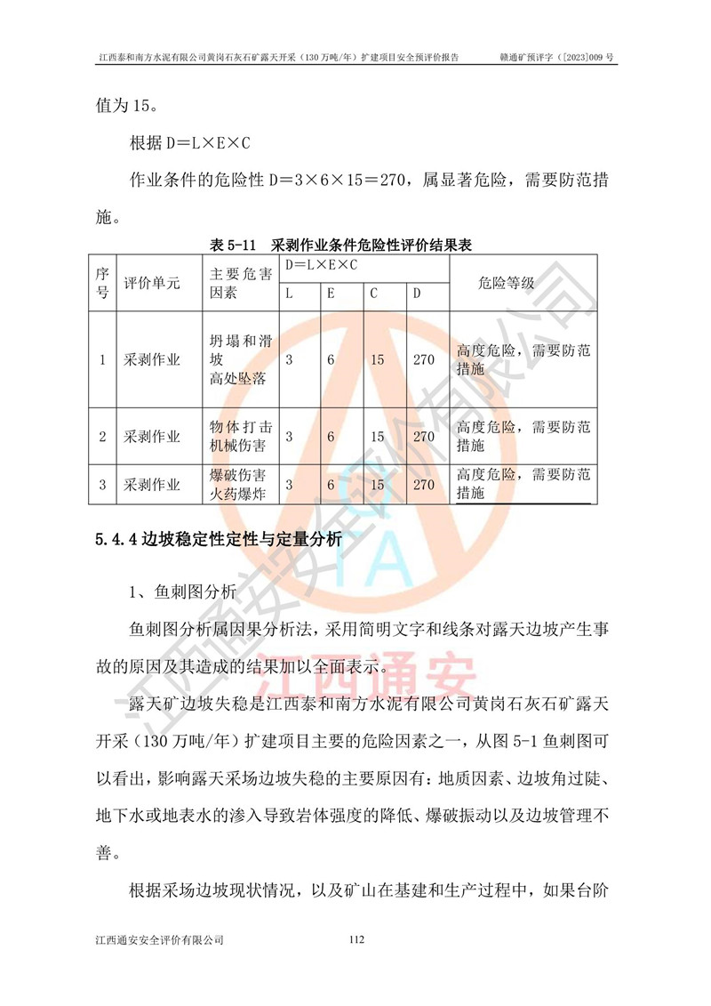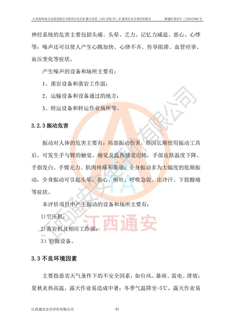 评价结论 | 1、本建设项目拟定的开采方案、采用的采矿工艺及各系统的安全设施基本符合安全生产法律、法规和行业安全技术规范的要求。 2、在建设施工及生产运行中,如能严格执行**有关安全生产法律、法规和有关标准、规范,认真落实《可研报告》提出的安全措施,并合理采纳本报告中提出的安全对策措施及建议,项目的主要危险、有害因素可得到较好控制,本评价项目安全生产风险在可接受范围。 结论:江西泰和南方水泥有限公司黄岗石灰石矿露天开采(130万吨/年)扩建项目从安全生产角度符合**有关安全生产法律、法规、规章、标准和规范的要求,风险可以接受。 | ||||