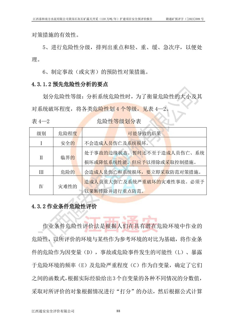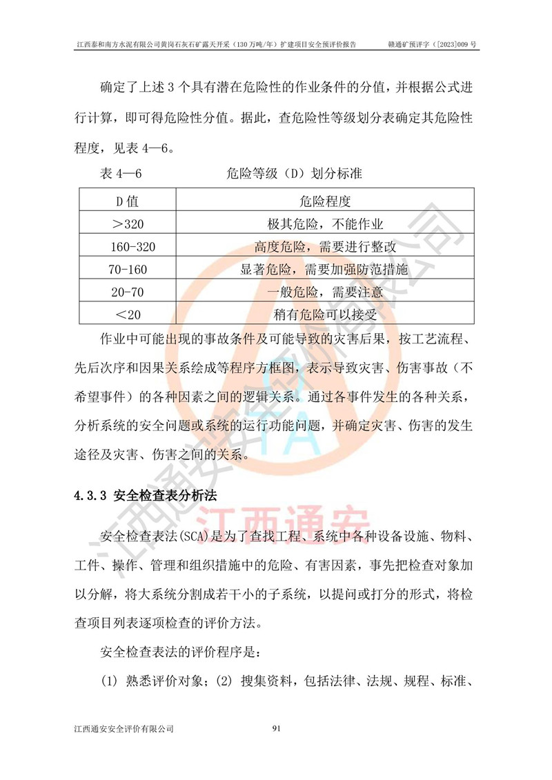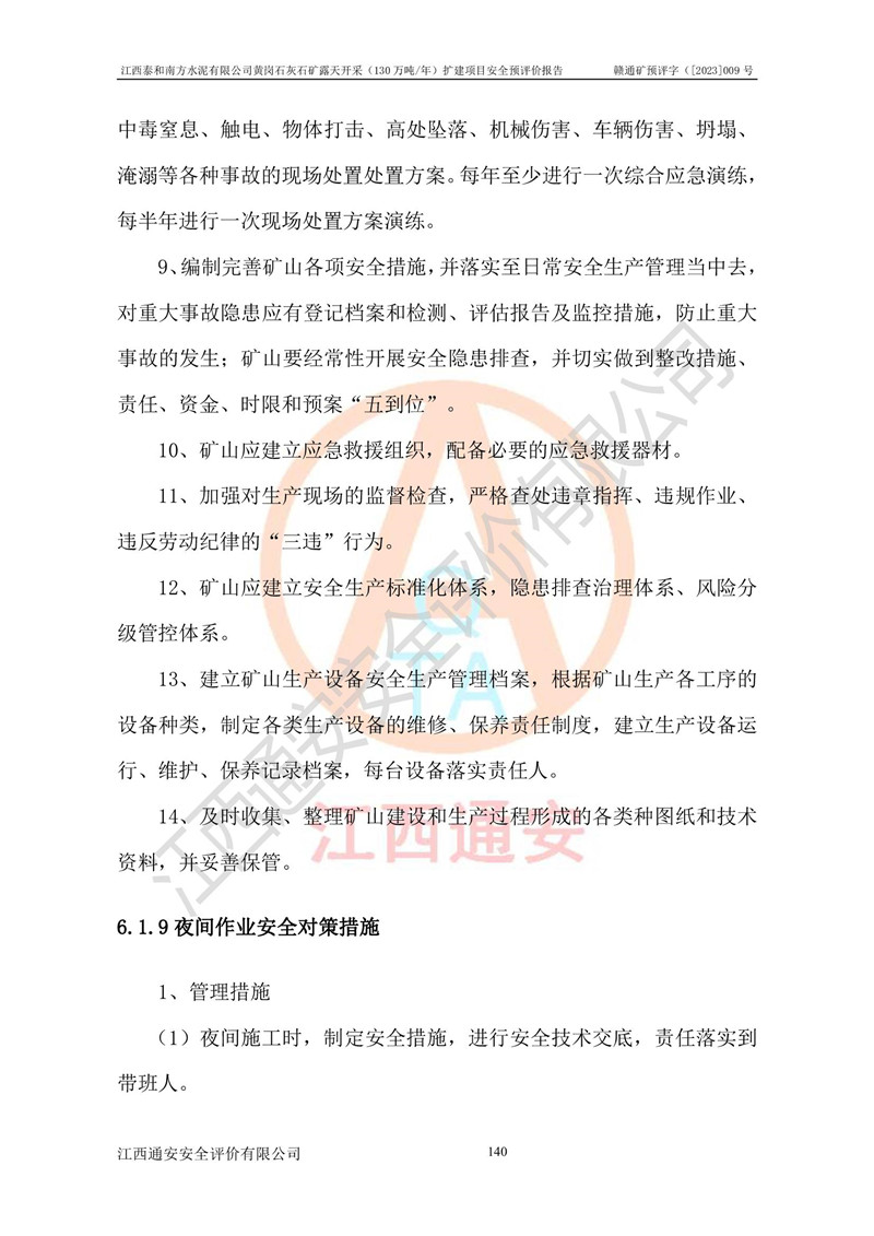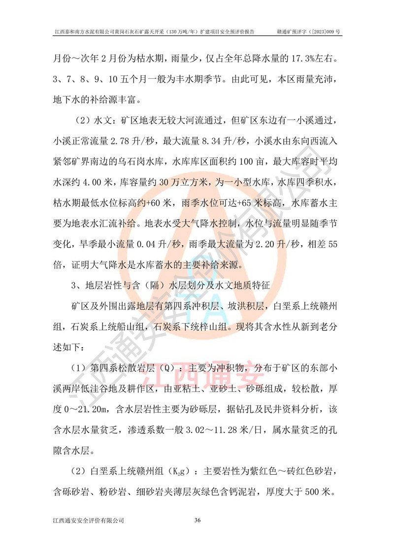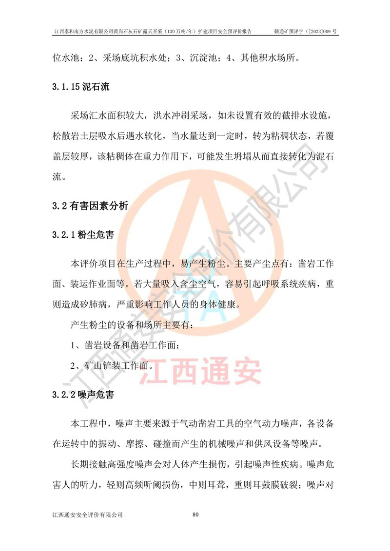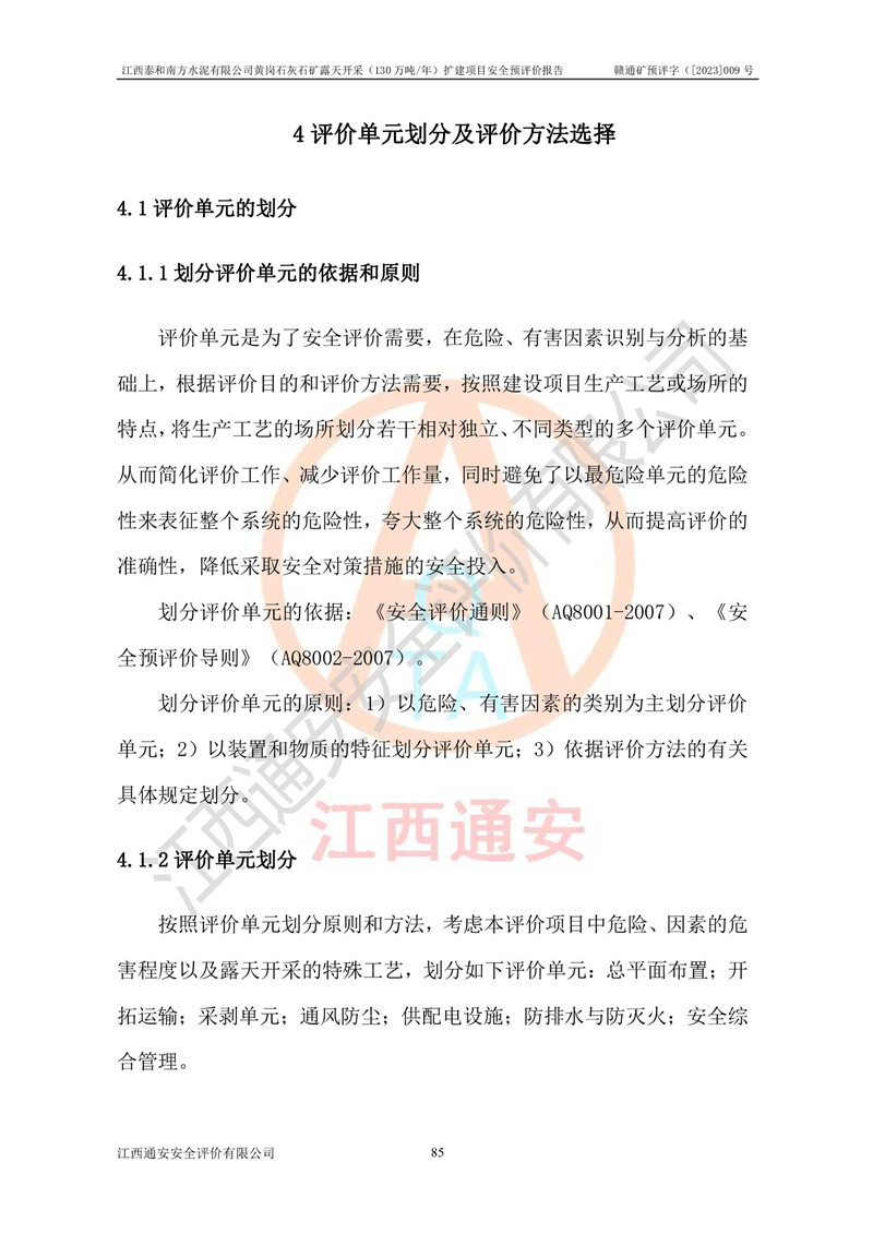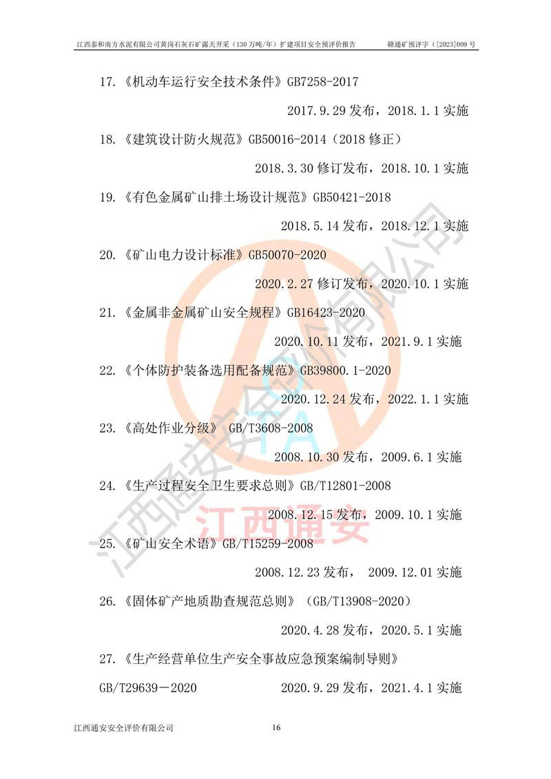 评价结论 | 1、本建设项目拟定的开采方案、采用的采矿工艺及各系统的安全设施基本符合安全生产法律、法规和行业安全技术规范的要求。 2、在建设施工及生产运行中,如能严格执行**有关安全生产法律、法规和有关标准、规范,认真落实《可研报告》提出的安全措施,并合理采纳本报告中提出的安全对策措施及建议,项目的主要危险、有害因素可得到较好控制,本评价项目安全生产风险在可接受范围。 结论:江西泰和南方水泥有限公司黄岗石灰石矿露天开采(130万吨/年)扩建项目从安全生产角度符合**有关安全生产法律、法规、规章、标准和规范的要求,风险可以接受。 | ||||