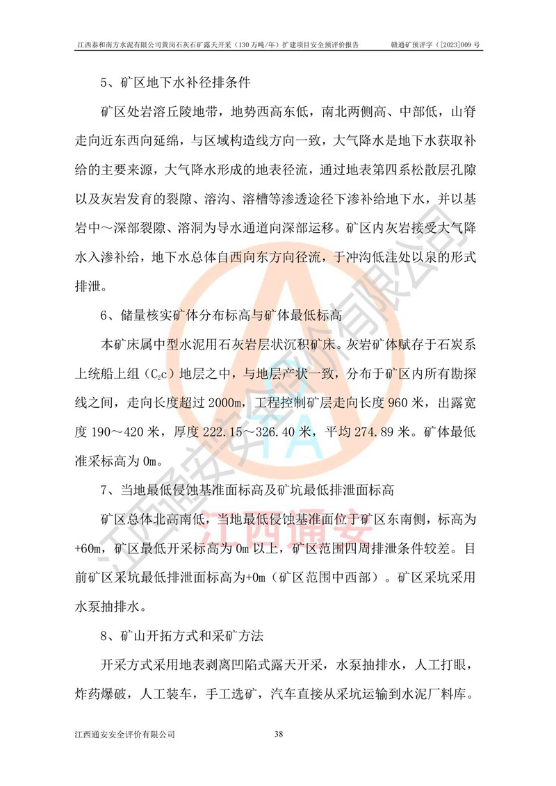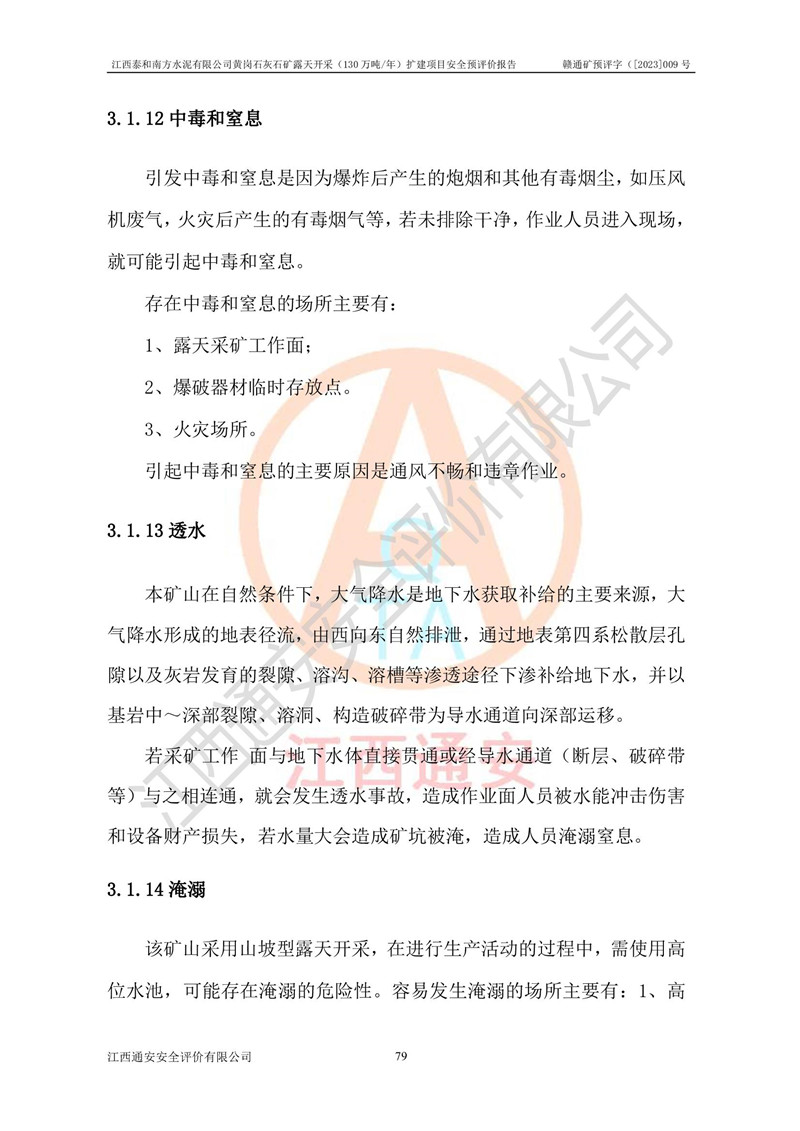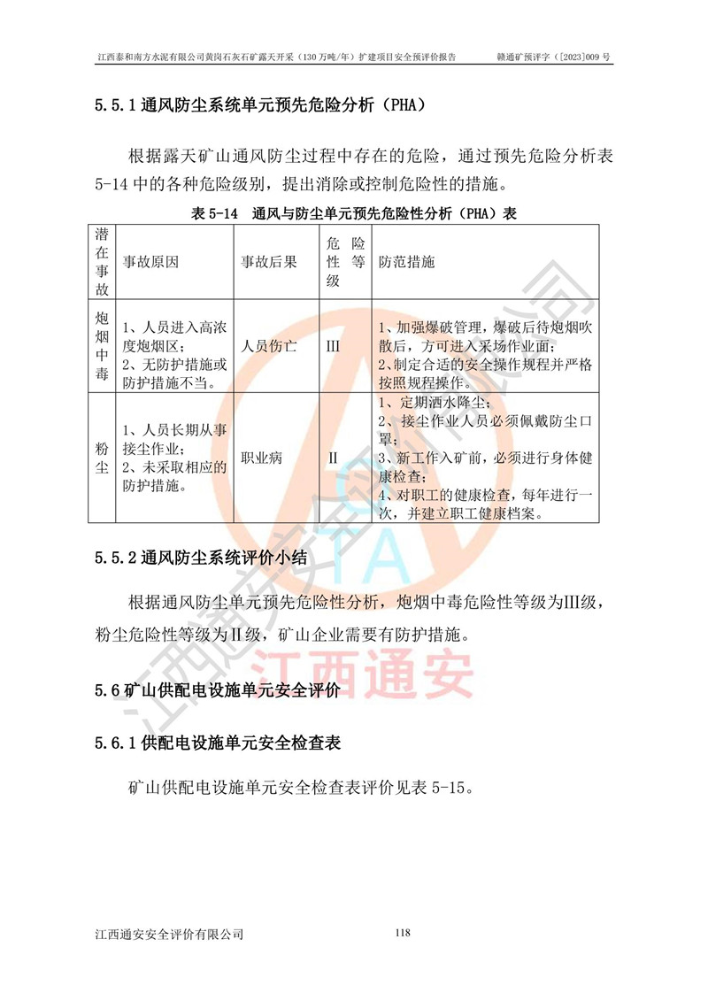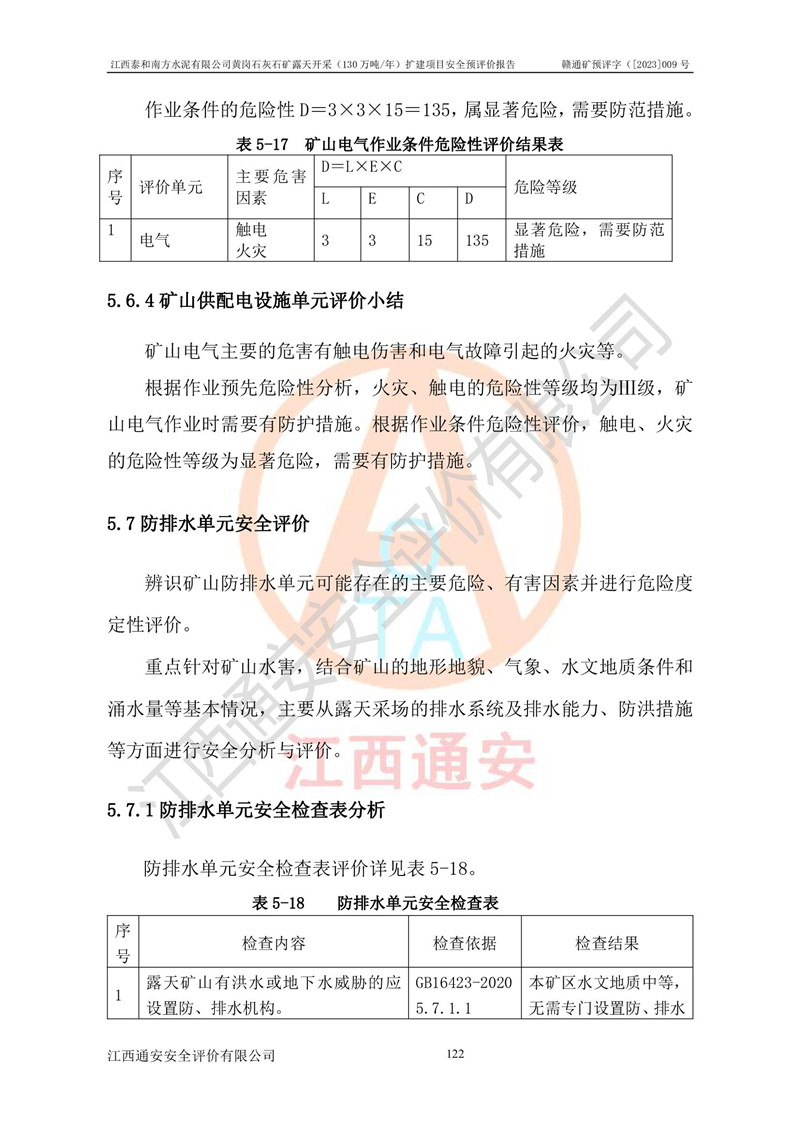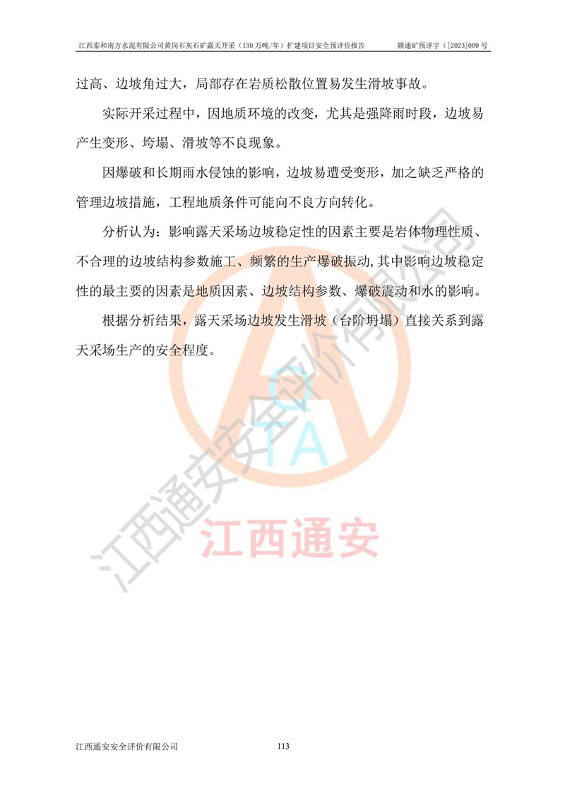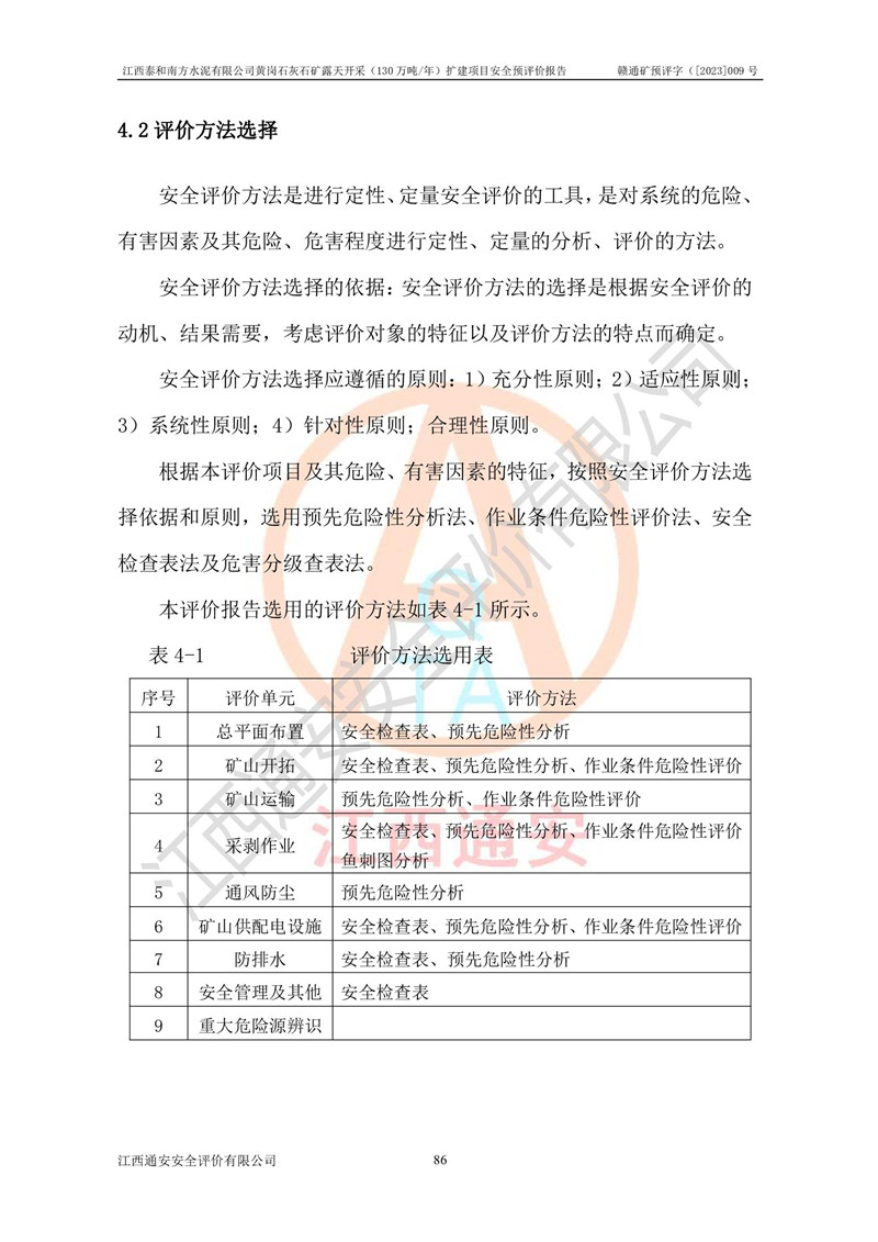 评价结论 | 1、本建设项目拟定的开采方案、采用的采矿工艺及各系统的安全设施基本符合安全生产法律、法规和行业安全技术规范的要求。 2、在建设施工及生产运行中,如能严格执行**有关安全生产法律、法规和有关标准、规范,认真落实《可研报告》提出的安全措施,并合理采纳本报告中提出的安全对策措施及建议,项目的主要危险、有害因素可得到较好控制,本评价项目安全生产风险在可接受范围。 结论:江西泰和南方水泥有限公司黄岗石灰石矿露天开采(130万吨/年)扩建项目从安全生产角度符合**有关安全生产法律、法规、规章、标准和规范的要求,风险可以接受。 | ||||