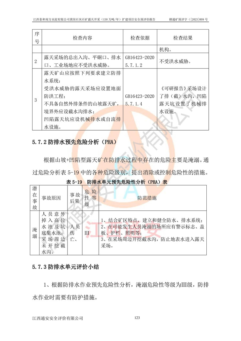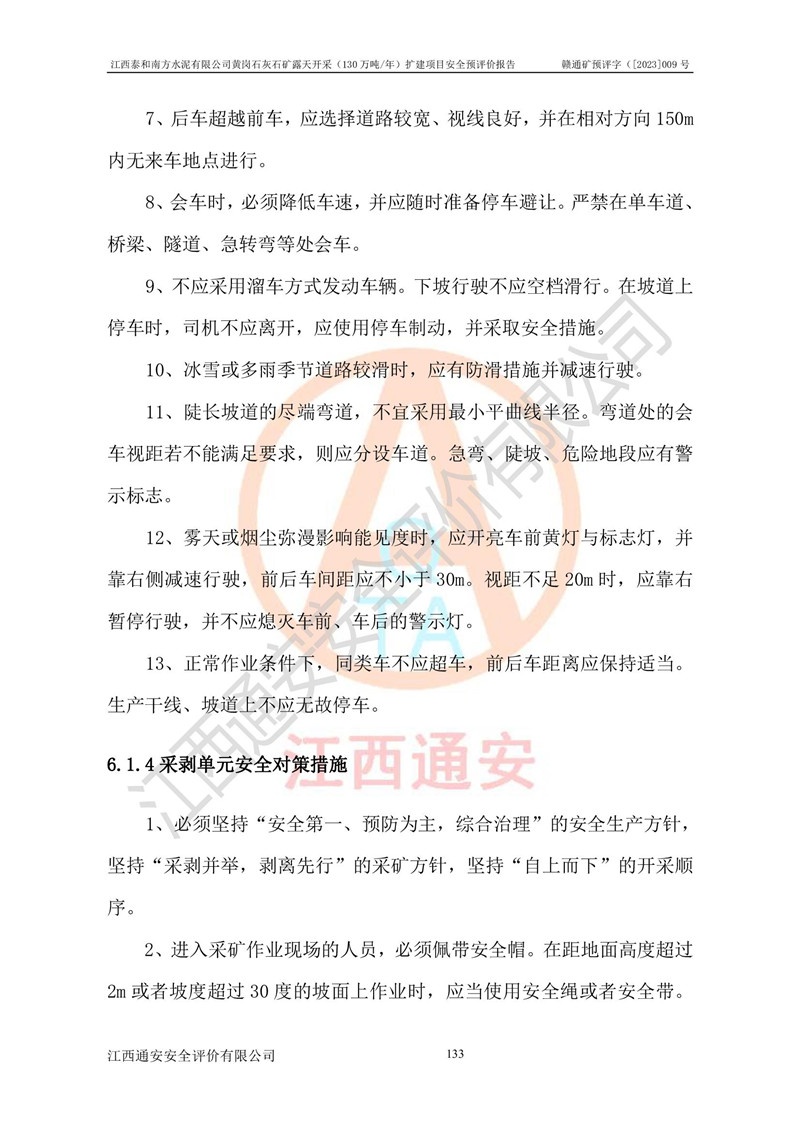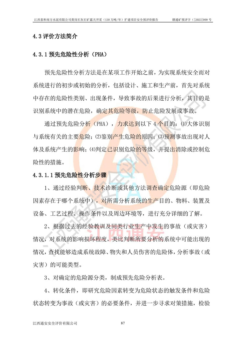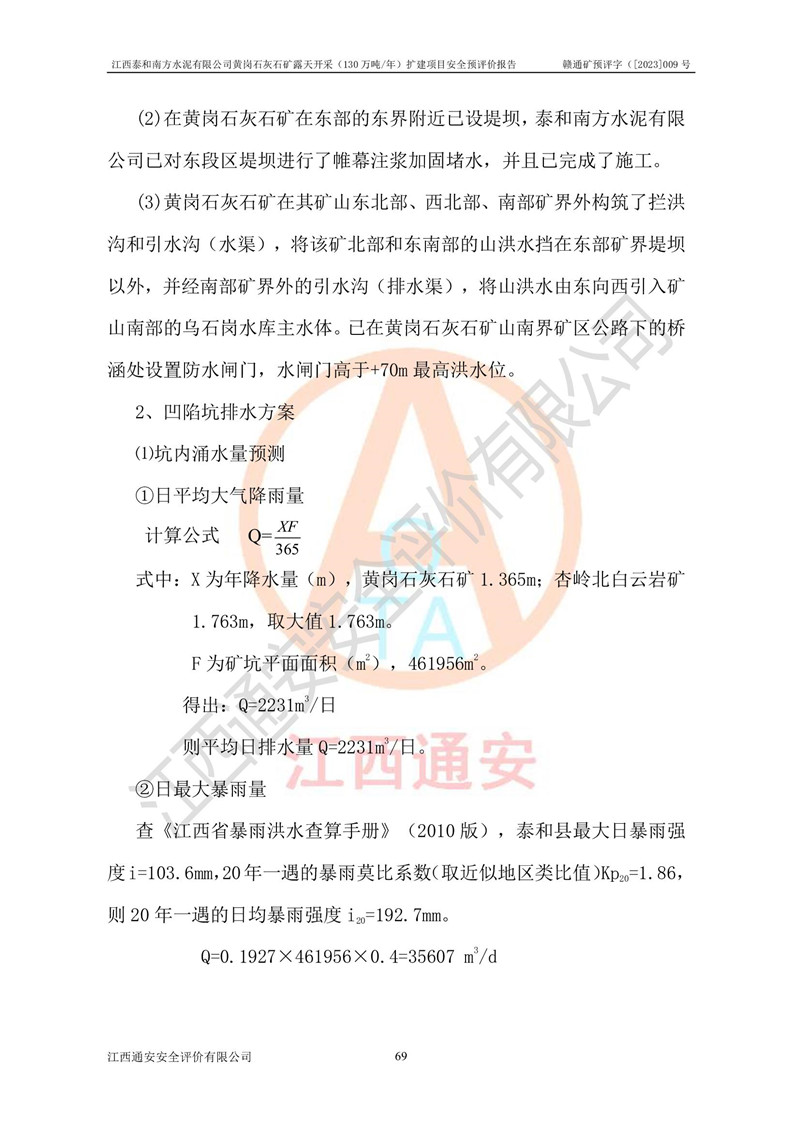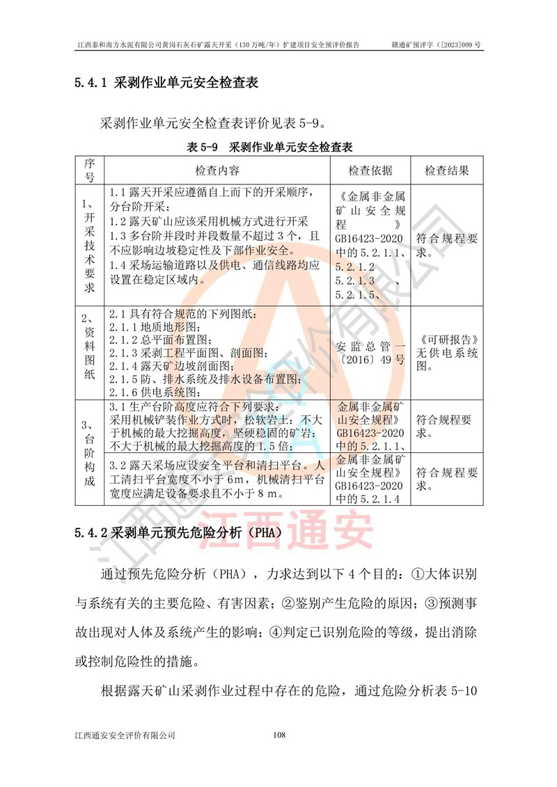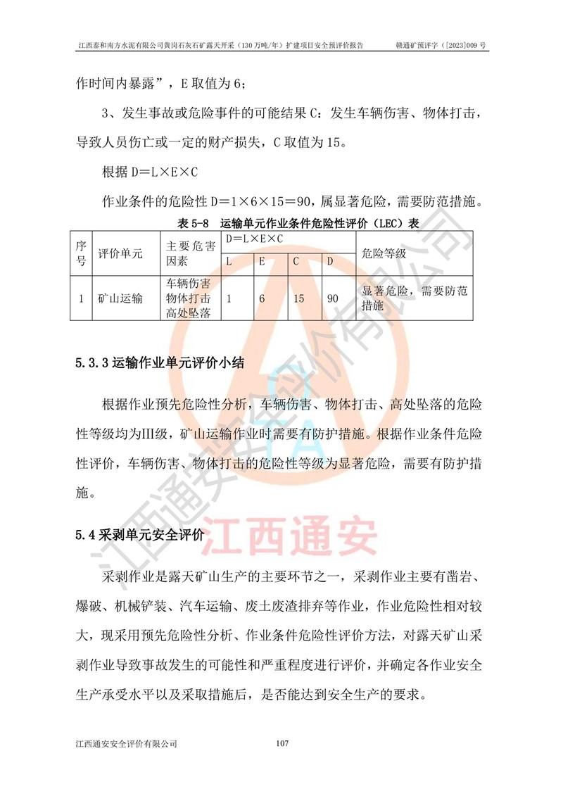 评价结论 | 1、本建设项目拟定的开采方案、采用的采矿工艺及各系统的安全设施基本符合安全生产法律、法规和行业安全技术规范的要求。 2、在建设施工及生产运行中,如能严格执行**有关安全生产法律、法规和有关标准、规范,认真落实《可研报告》提出的安全措施,并合理采纳本报告中提出的安全对策措施及建议,项目的主要危险、有害因素可得到较好控制,本评价项目安全生产风险在可接受范围。 结论:江西泰和南方水泥有限公司黄岗石灰石矿露天开采(130万吨/年)扩建项目从安全生产角度符合**有关安全生产法律、法规、规章、标准和规范的要求,风险可以接受。 | ||||