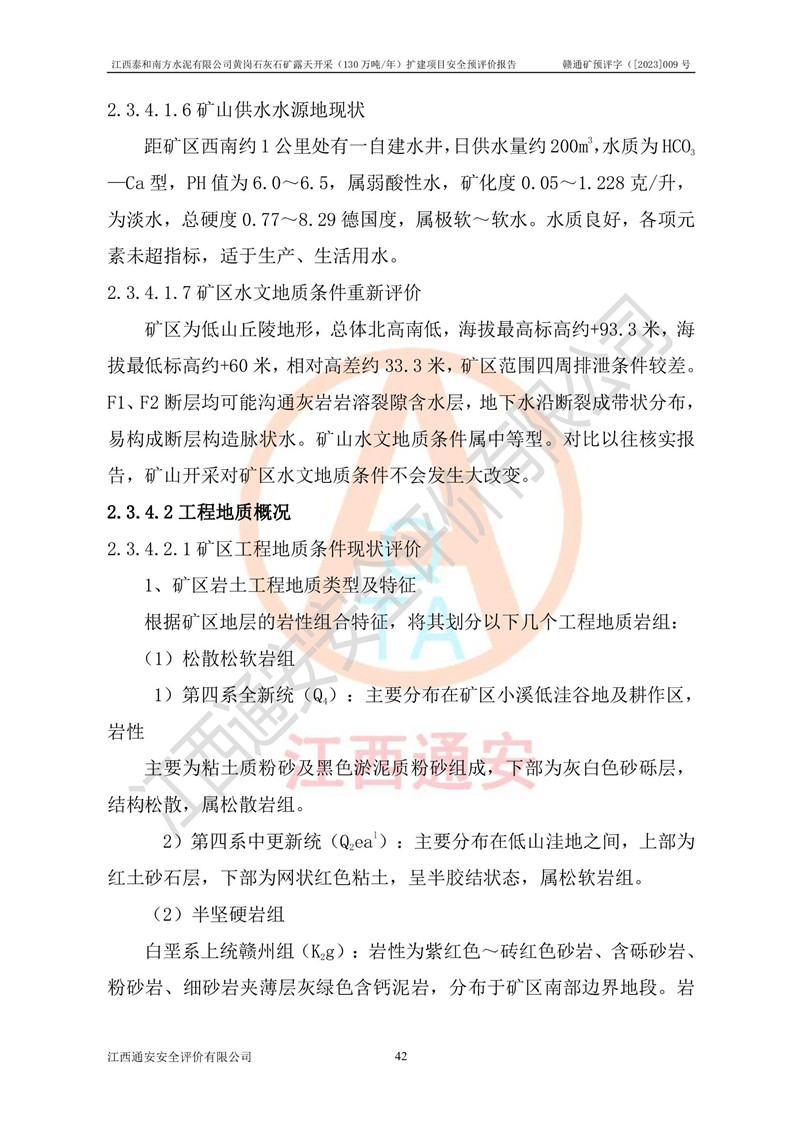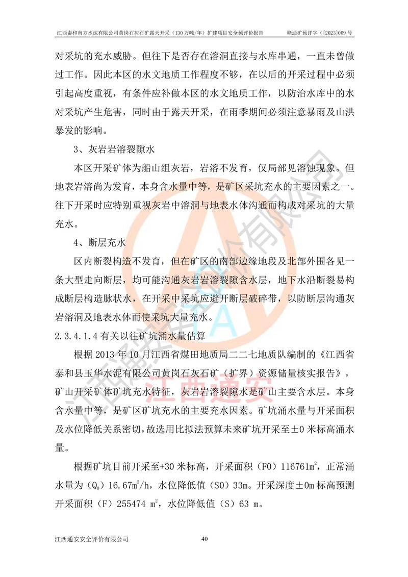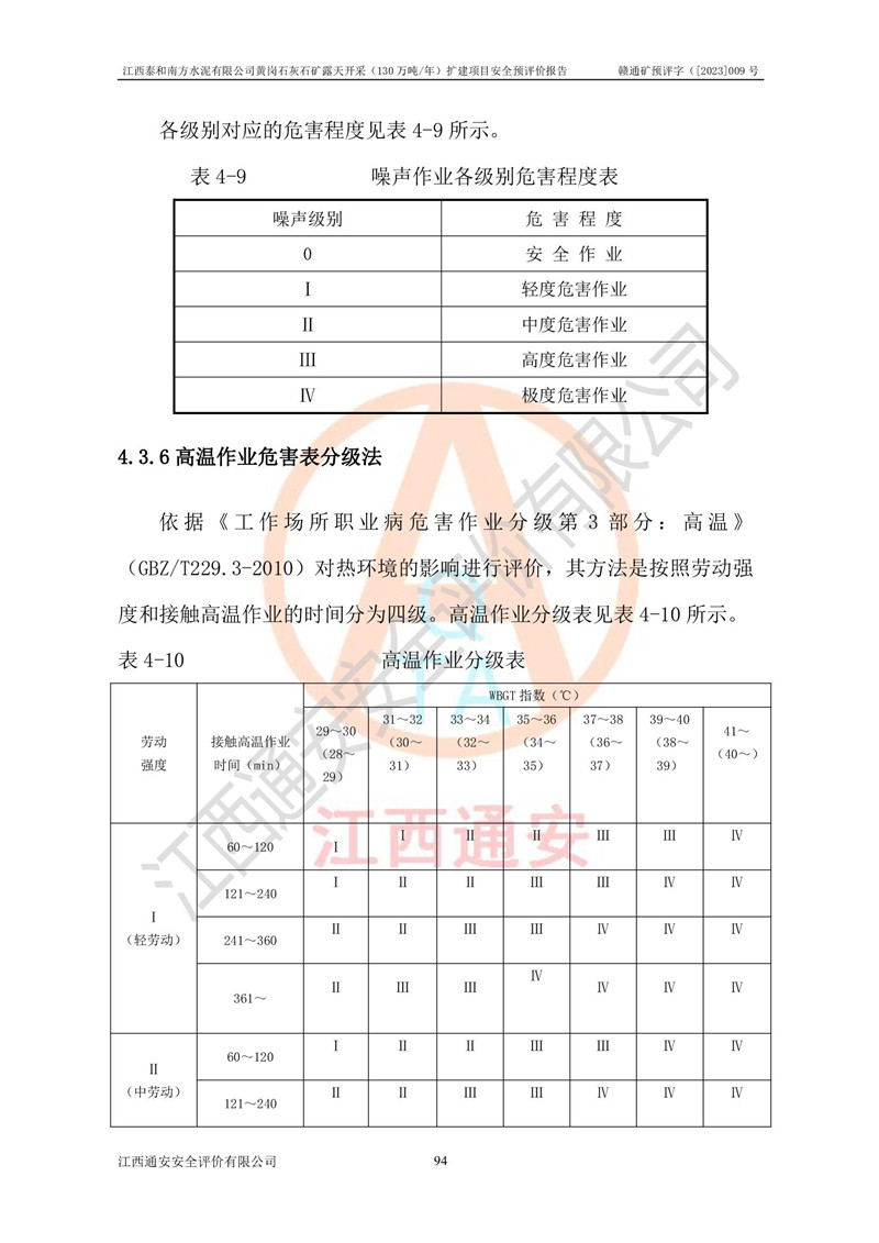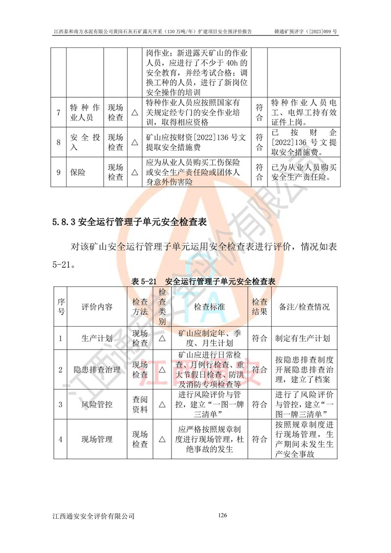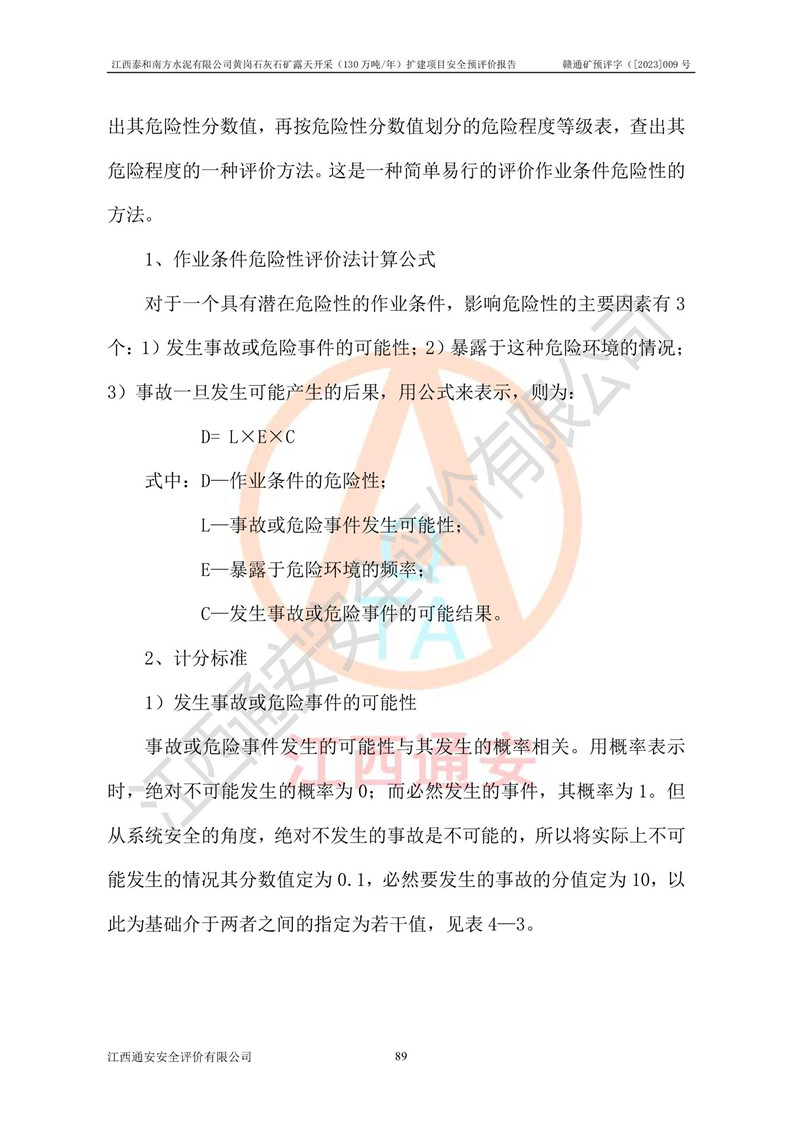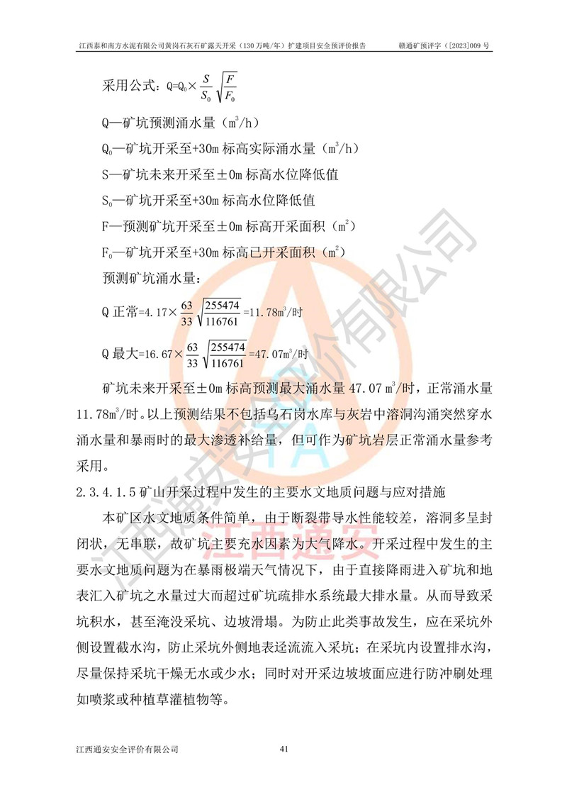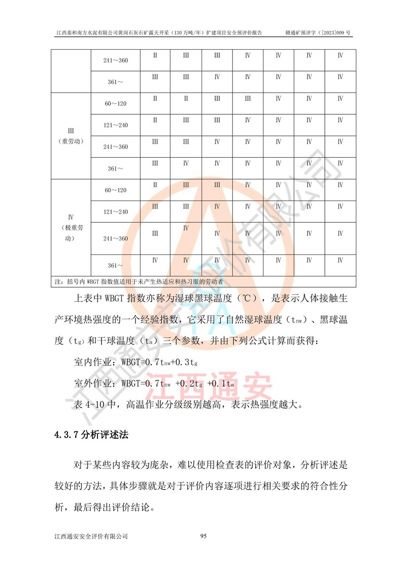 评价结论 | 1、本建设项目拟定的开采方案、采用的采矿工艺及各系统的安全设施基本符合安全生产法律、法规和行业安全技术规范的要求。 2、在建设施工及生产运行中,如能严格执行**有关安全生产法律、法规和有关标准、规范,认真落实《可研报告》提出的安全措施,并合理采纳本报告中提出的安全对策措施及建议,项目的主要危险、有害因素可得到较好控制,本评价项目安全生产风险在可接受范围。 结论:江西泰和南方水泥有限公司黄岗石灰石矿露天开采(130万吨/年)扩建项目从安全生产角度符合**有关安全生产法律、法规、规章、标准和规范的要求,风险可以接受。 | ||||