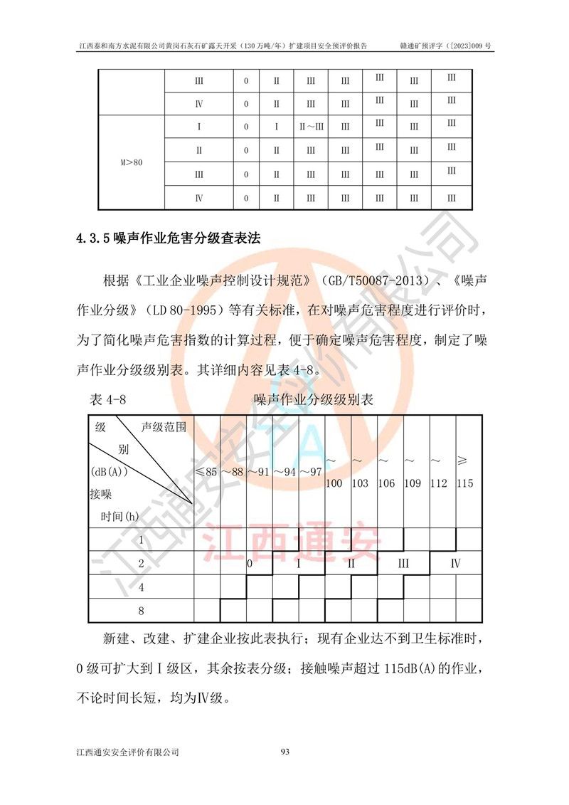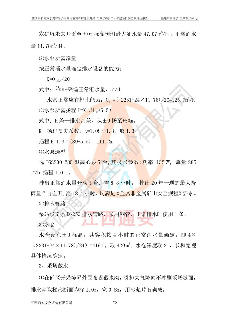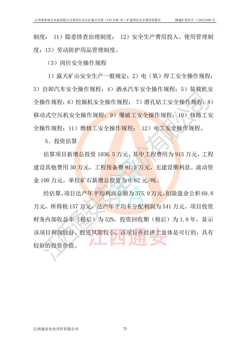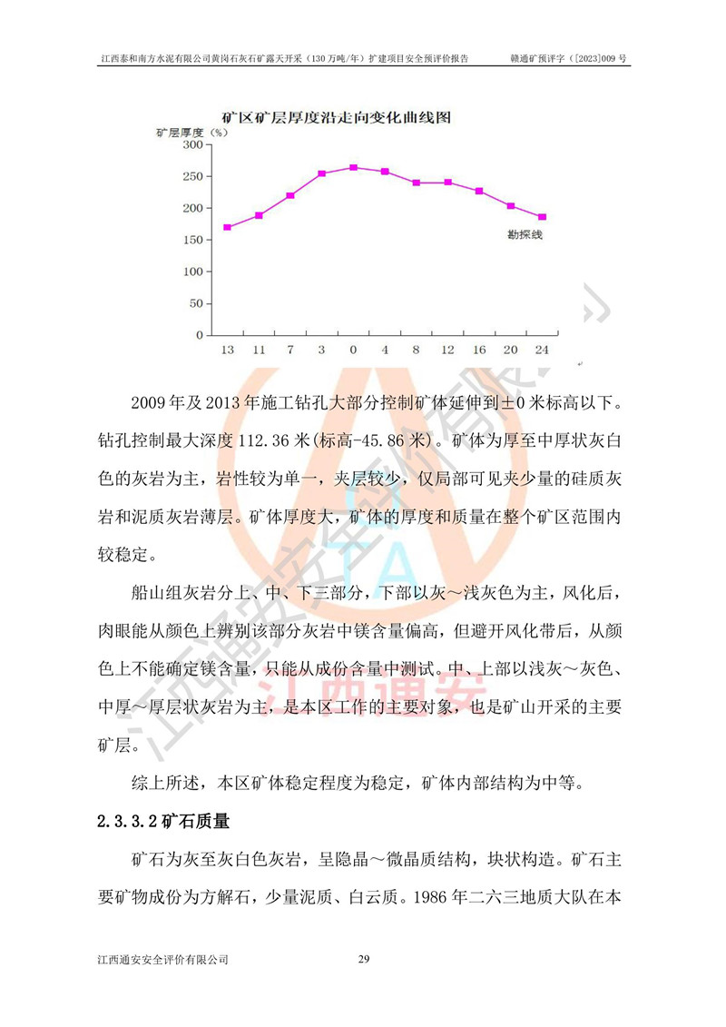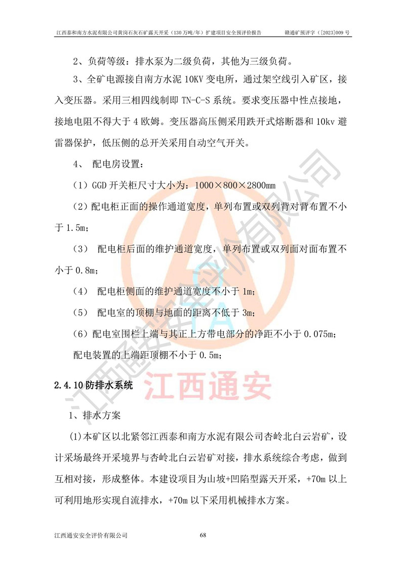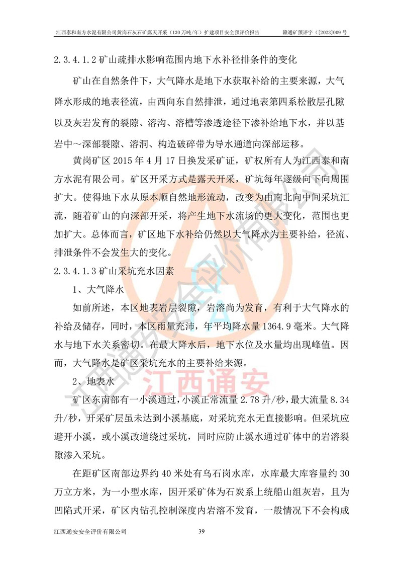 评价结论 | 1、本建设项目拟定的开采方案、采用的采矿工艺及各系统的安全设施基本符合安全生产法律、法规和行业安全技术规范的要求。 2、在建设施工及生产运行中,如能严格执行**有关安全生产法律、法规和有关标准、规范,认真落实《可研报告》提出的安全措施,并合理采纳本报告中提出的安全对策措施及建议,项目的主要危险、有害因素可得到较好控制,本评价项目安全生产风险在可接受范围。 结论:江西泰和南方水泥有限公司黄岗石灰石矿露天开采(130万吨/年)扩建项目从安全生产角度符合**有关安全生产法律、法规、规章、标准和规范的要求,风险可以接受。 | ||||