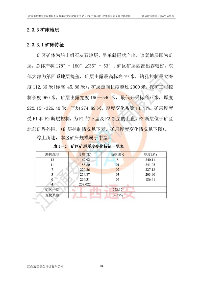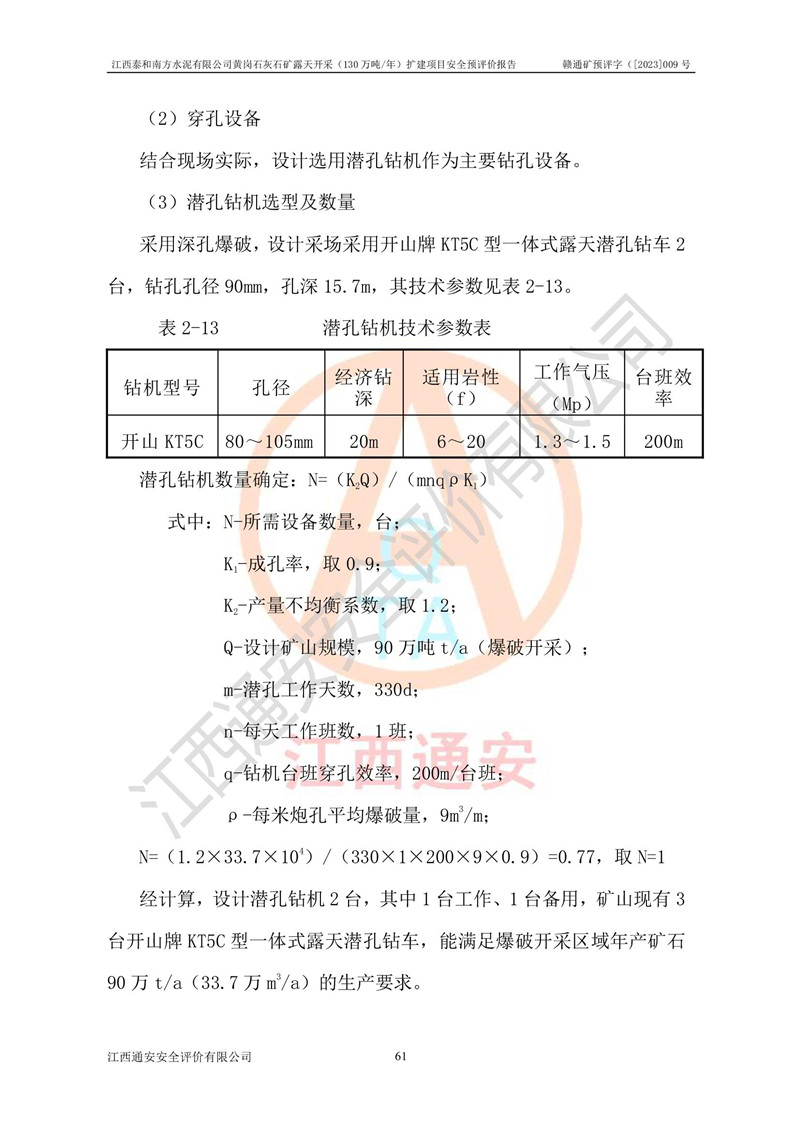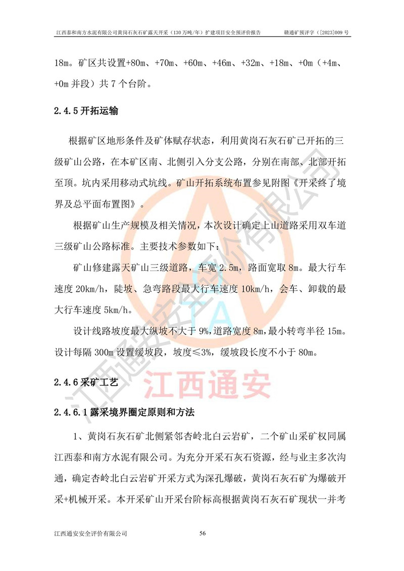 项目简介 | 江西泰和南方水泥有限公司黄岗石灰石矿矿区位于泰和县县城300°方位直距约5km处,属泰和县澄江镇辖区。矿区地理位置(2000**大地坐标):东经114°51′33″~114°52′11″,北纬26°49′01″~26°49′15″。矿区范围由13个拐点围成,矿区面积为0.3796km2。105国道从黄岗石灰石矿南东500米处通过,319国道从黄岗水泥石灰石矿南500米处通过。距京九铁路泰和站6**,距赣江、泰和县城5**,交通十分便利。 江西泰和南方水泥有限公司成立于1998年5月21日。2022年8月22日,江西泰和南方水泥有限公司取得泰和县市场监督管理局换发的营业执照,统一社会信用代码: 913608261622711022,名称: 江西泰和南方水泥有限公司,类型:有限责任公司,注册资本:壹亿壹仟万元整,法定**人:谢正洪,住所:江西省吉安市泰和县澄江镇上田黄岗,营业期限:1998年05月11日至2048年05月20日,经营范围:水泥生产,矿产资源(非煤矿山)开采、发电业务、输电业务、供(配)业务(依法须经批准的项目,经相关部门批准后方可开展经营活动)一般项目:水泥制品制造,非金属矿及制品销售,建筑材料销售,非金属矿物制品制造,水泥制品销售,再生资源销售,资源再生利用技术研发(除许可业务外,可自主依法经营法律法规非禁止或限制的项目)。 该矿现持原吉安市国土资源局于2015年4月17日为其延续换发的《采矿许可证》(证号:3608002009027120004485),划定矿区范围0.3796平方**,由13个拐点圈定,开采方式为露天开采,开采深度+93.3m至+0m,生产规模90万吨/年,**期自2015年4月17日至2035年4月17日。目前,采矿许可证变更生产规模130万吨/年正在办理之中。 2021年3月,该矿曾委托江西省煤矿设计院编制了《江西泰和南方水泥有限公司黄岗石灰岩矿露天开采整改工程初步设计》及《江西泰和南方水泥有限公司黄岗石灰岩矿露天开采整改工程安全设施设计》,采用山坡型露天开采,生产规模90万吨/年,设计开采标高+78m~+0m,*终形成+72m、+60m、+46m、+32m、+18m、+0m、。安全平台宽度6m,清扫平台宽度8m,台阶坡面角70°,台阶*终边坡角54.9°,终了境界**78m。 矿山于2022年12月获江西省应急管理厅换发的《安全生产许可证》,编号:(赣)FM安许证字[2006]M0050号,许可范围:石灰岩90万吨/年,+60m、+46m、+32m、+18m、+9m、±0m共6个台阶露天开采,**期自2021年05月13日至2024年05月12日。 为进一步扩大产能,将石灰石生产规模由90万吨/年提至130万吨/年,2021年3月中国建筑材料工业地质勘查中心江西总队编制了《江西泰和南方水泥有限公司黄岗石灰石矿资源储量核实报告》;2021年11月江西合成矿业有限公司编制了《江西泰和南方水泥有限公司黄岗石灰石矿矿产资源开发利用、地质环境恢复治理与土地复垦方案》;2022年11月10日,泰和县工业和信息化局下发了《关于江西泰和南方水泥有限公司黄岗石灰石矿智能化机械开采技改项目备案的通知》(泰工信备字[2022]1号),批准年生产规模130万吨/年。 2023年5月,湖南联盛勘察设计有限公司受委托编制了《江西泰和南方水泥有限公司黄岗石灰石矿露天开采(130万吨/年)扩建项目可行性研究报告》(以下简称《可研报告》)。建设规模为130万吨/年,《可研报告》设计山坡+凹陷型开采方式,采用公路开拓、汽车运输,机械、爆破联合开采,自上而下分台阶采矿。矿区设有一个采场,生产台阶高4m、5m、10m、14m,采场*大垂高93.3m。*终形成+80m、+70m、+60m、+46m、+32m、+18m、+0m(+4m、+0m并段)共7个台阶。 评价范围:2023年5月湖南联盛勘察设计有限公司编制的《江西泰和南方水泥有限公司石灰石矿露天开采(130万吨/年)扩建项目可行性研究报告》设计范围内开采、运输等生产及生产辅助系统配套的安全设施。 本安全预评价不包含破碎工业场地设施、加油站、危险化学品使用场所。 | ||||