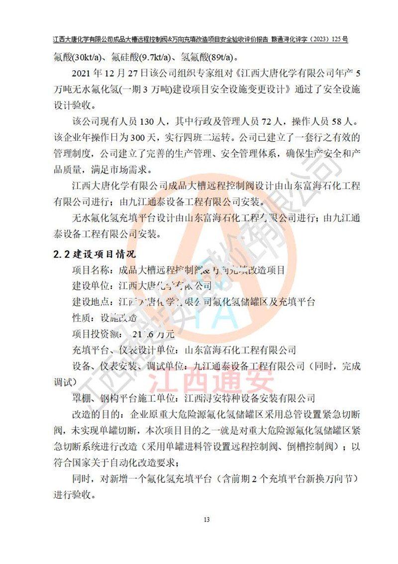 项目简介 | 项目名称:成品大槽远程控制阀&万向充填改造项目 建设单位:江西大唐化学有限公司 建设地点:江西大唐化学有限公司氟化氢储罐区及充填平台 性质:设施改造 项目投资额: 211.6万元 充填平台、仪表设计单位:山东富海石化工程有限公司 设备、仪表安装、调试单位:九江通泰设备工程有限公司 罩棚、钢构平台施工单位:江西浔安特种设备安装有限公司 | ||||
