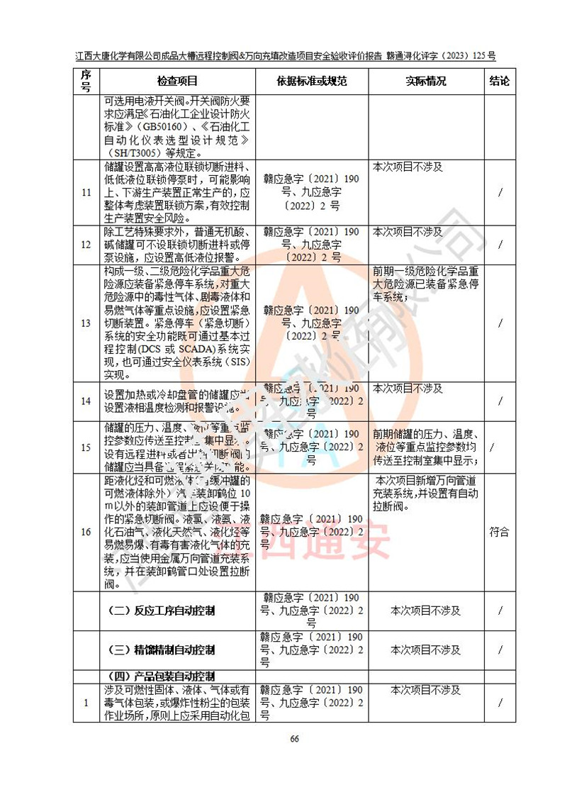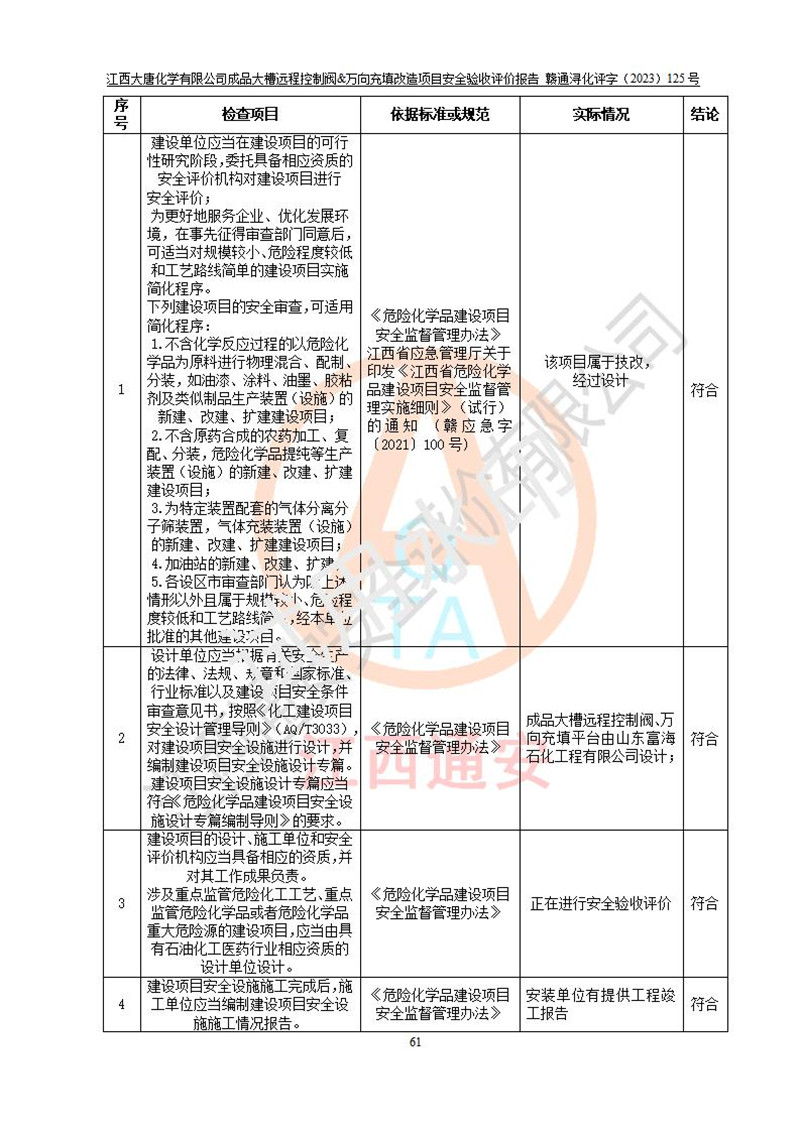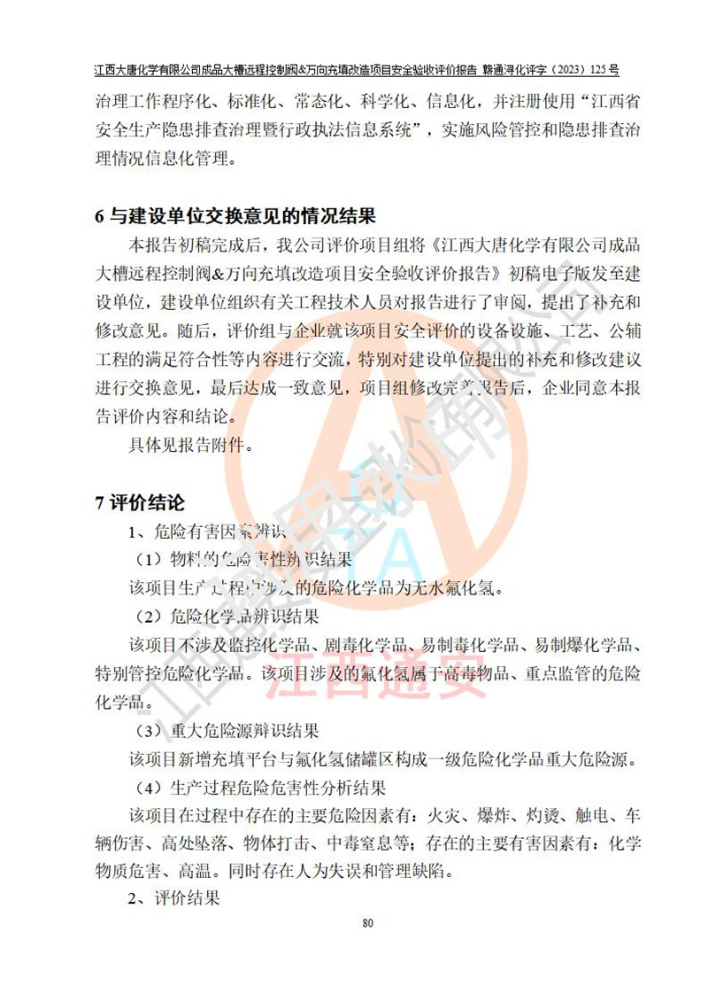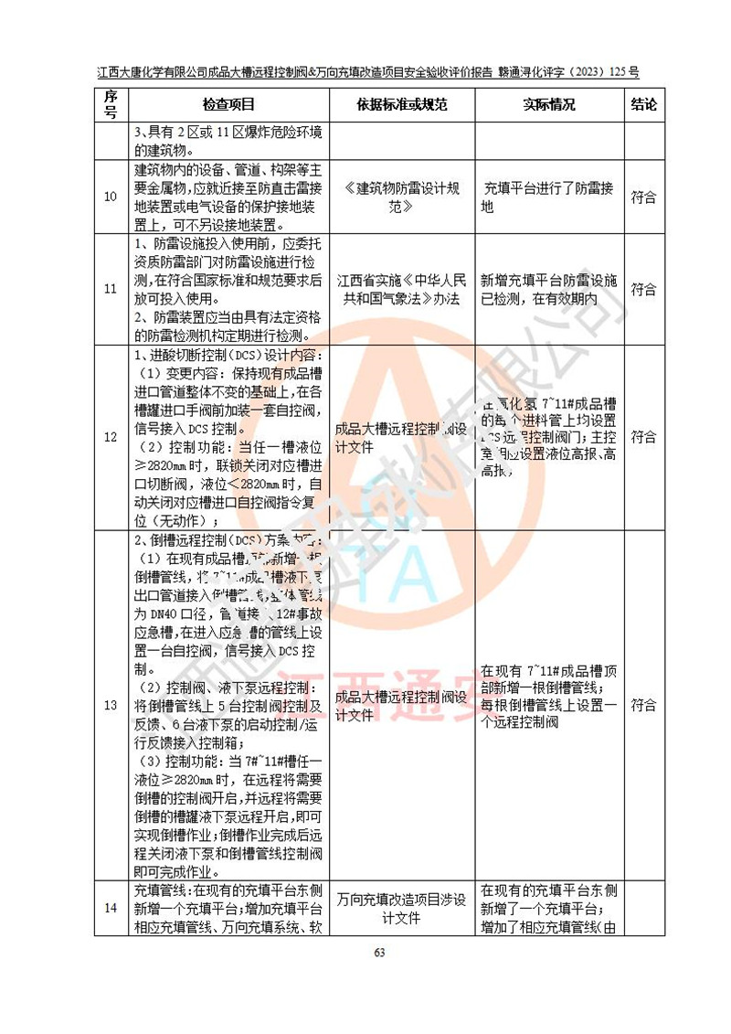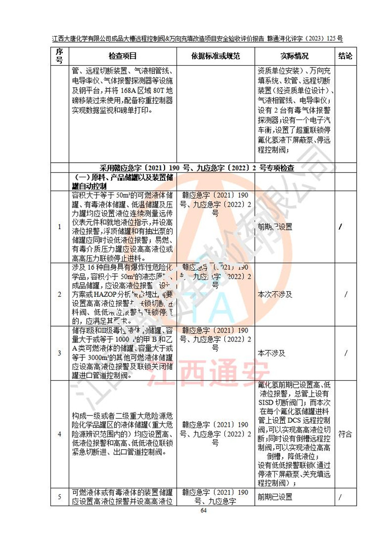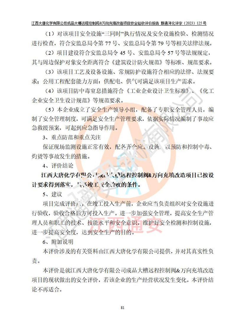 评价结论 | 江西大唐化学有限公司成品大槽远程控制阀&万向充填改造项目已按设计要求得到落实,具备竣工安全验收的条件。 | ||||