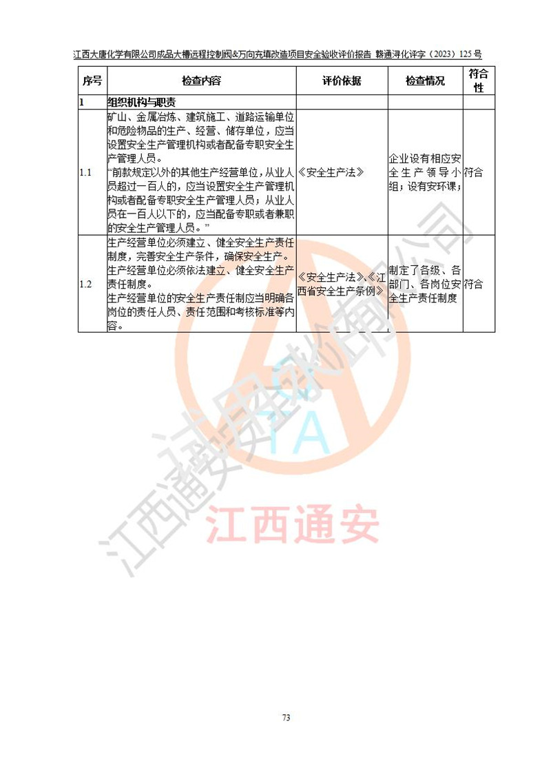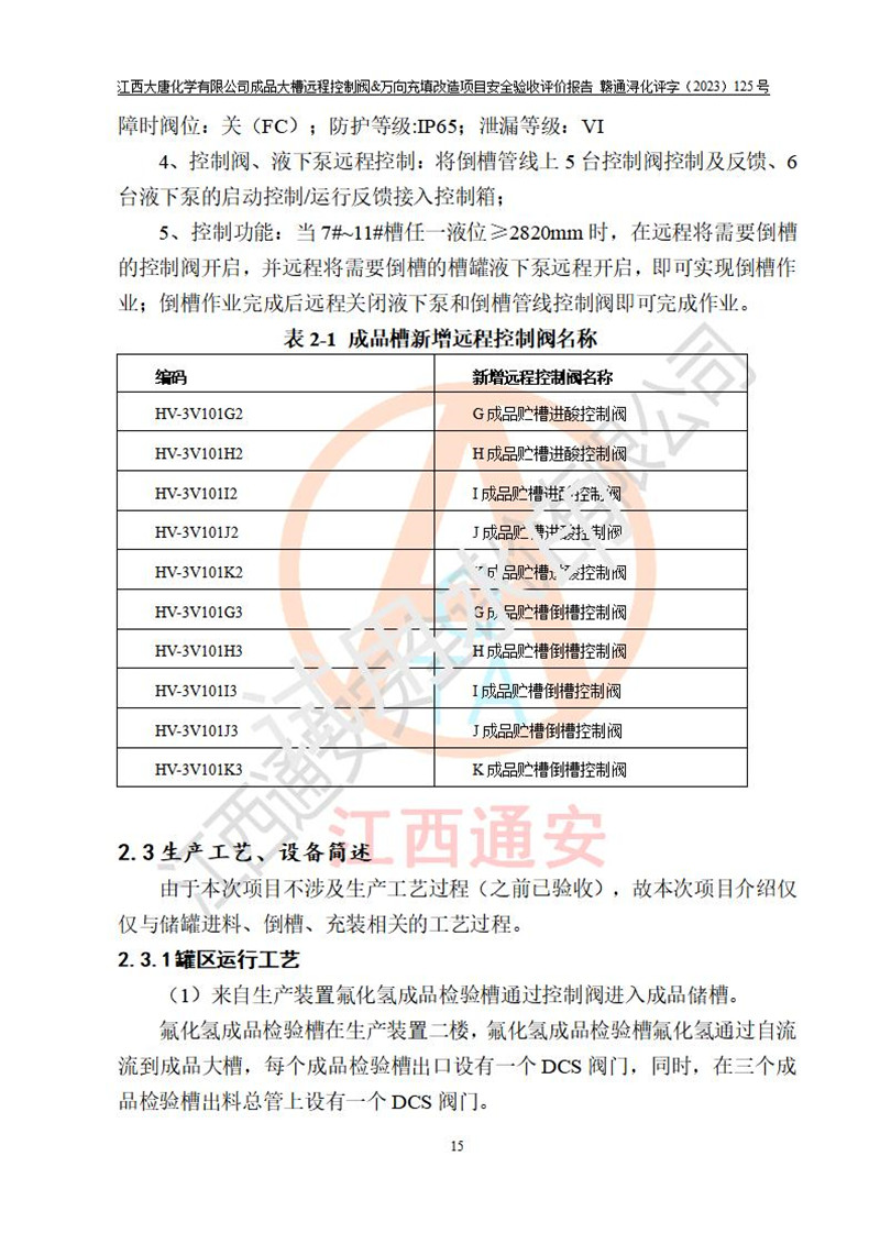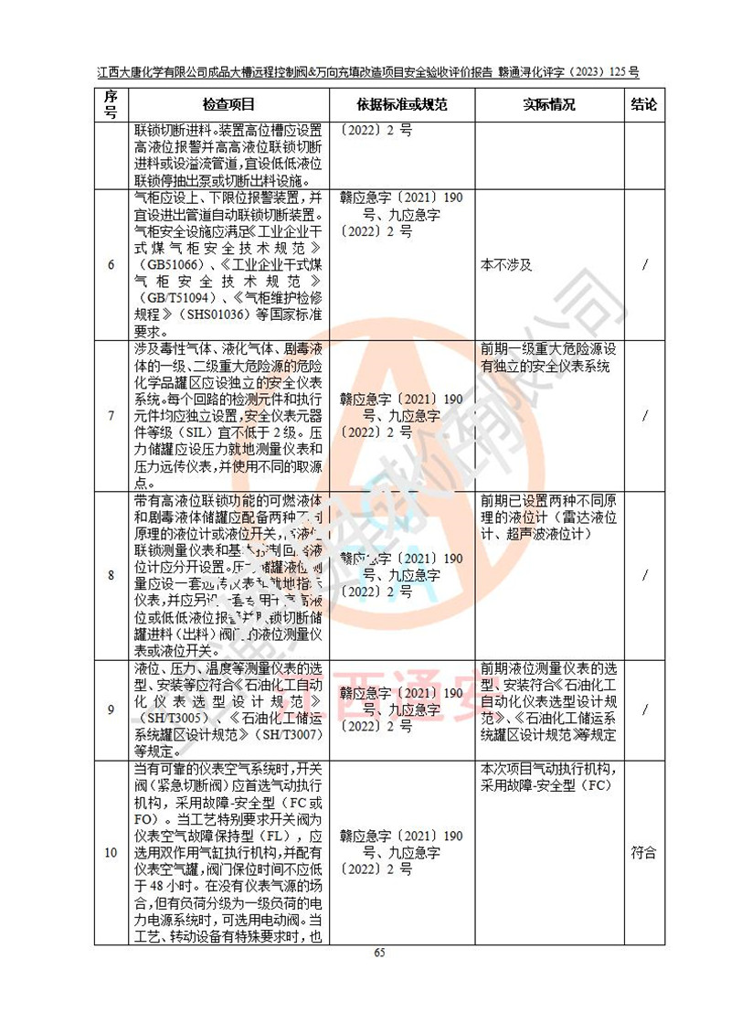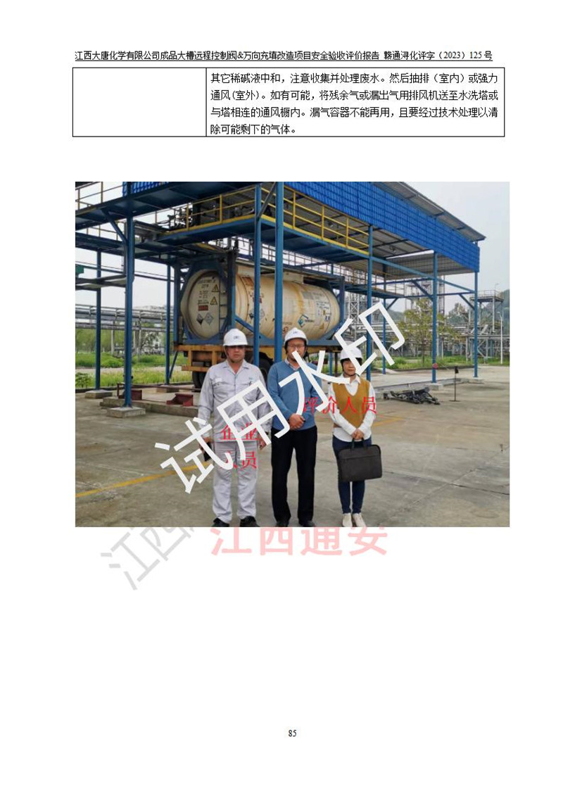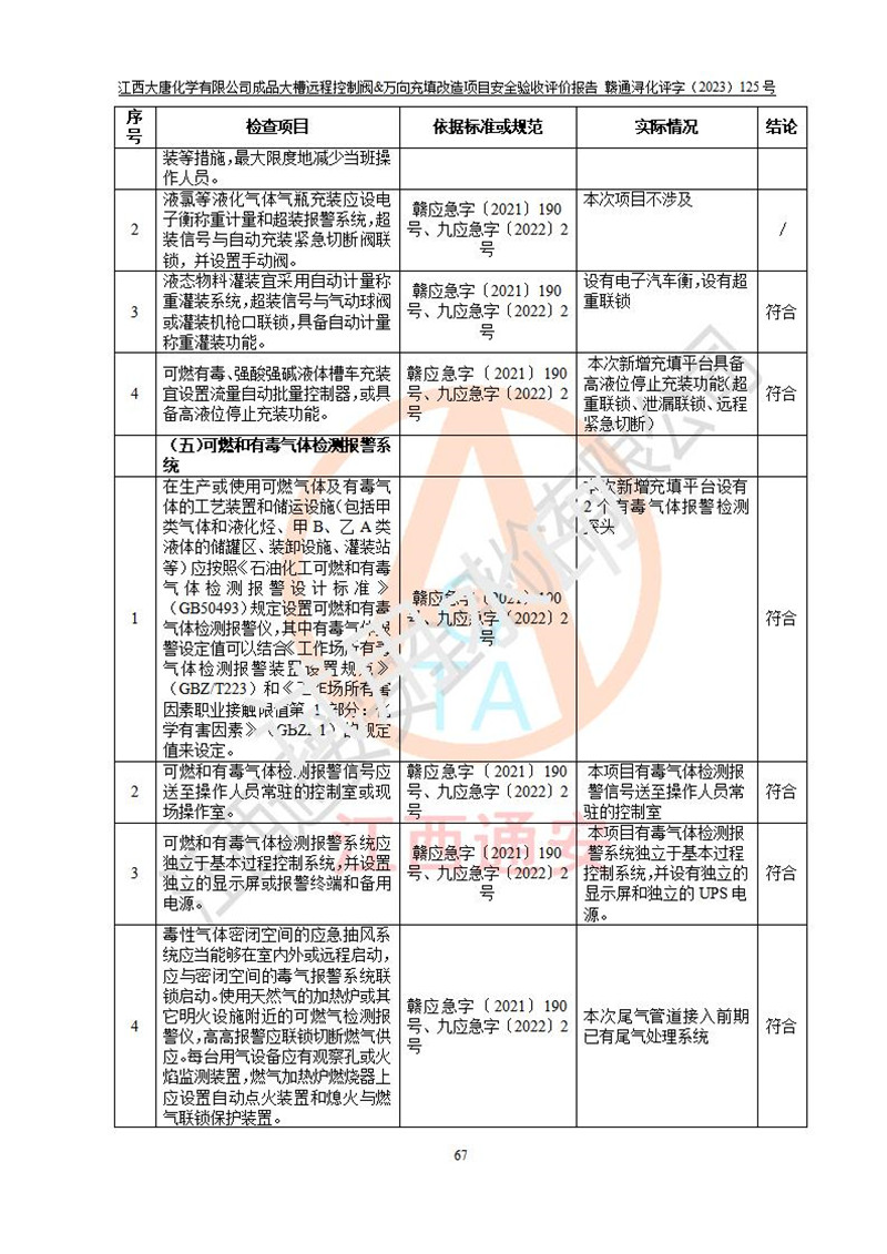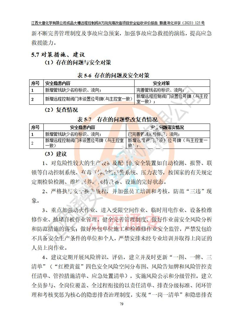 评价结论 | 江西大唐化学有限公司成品大槽远程控制阀&万向充填改造项目已按设计要求得到落实,具备竣工安全验收的条件。 | ||||