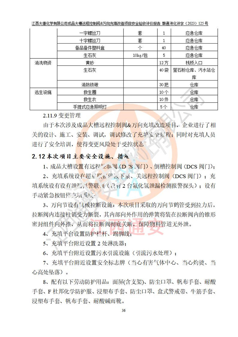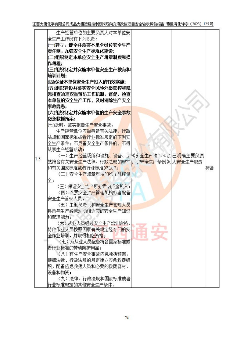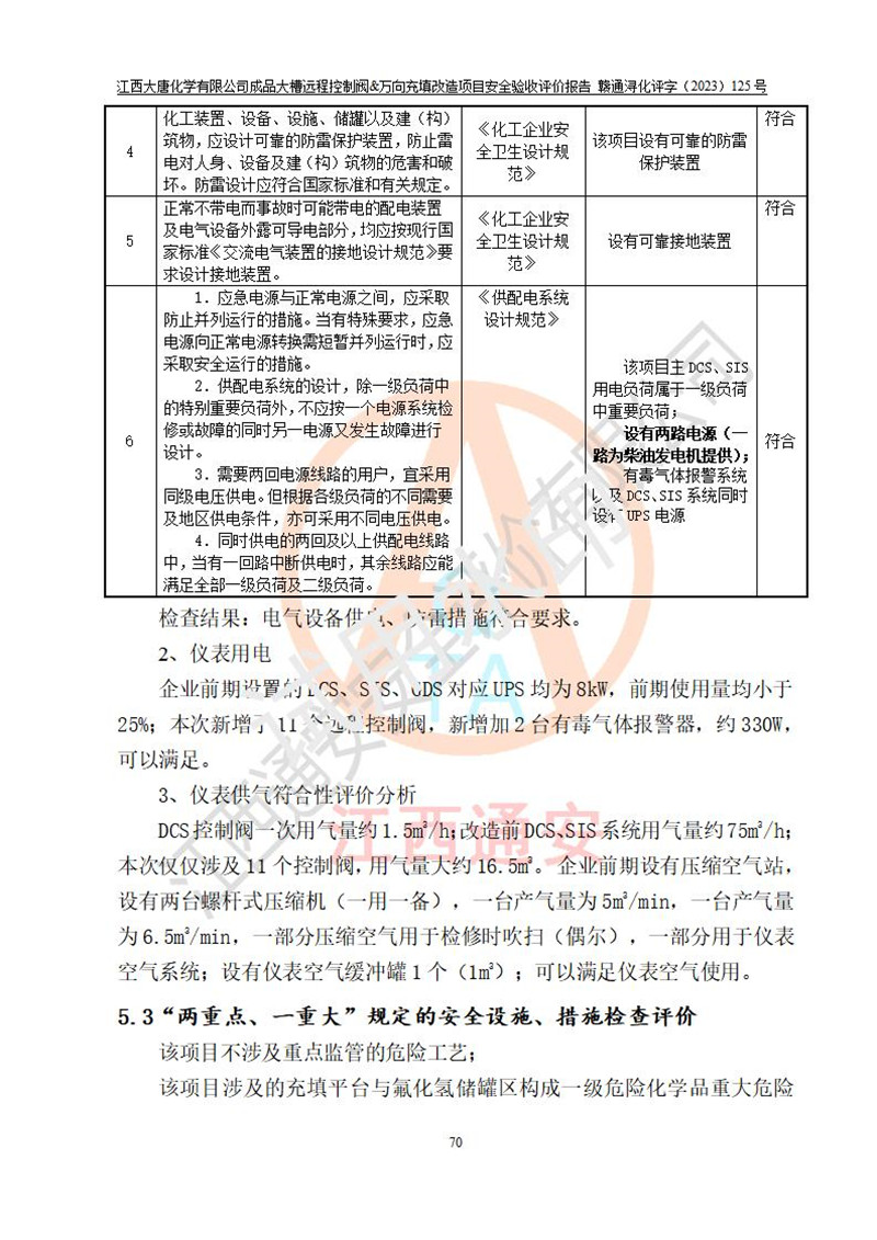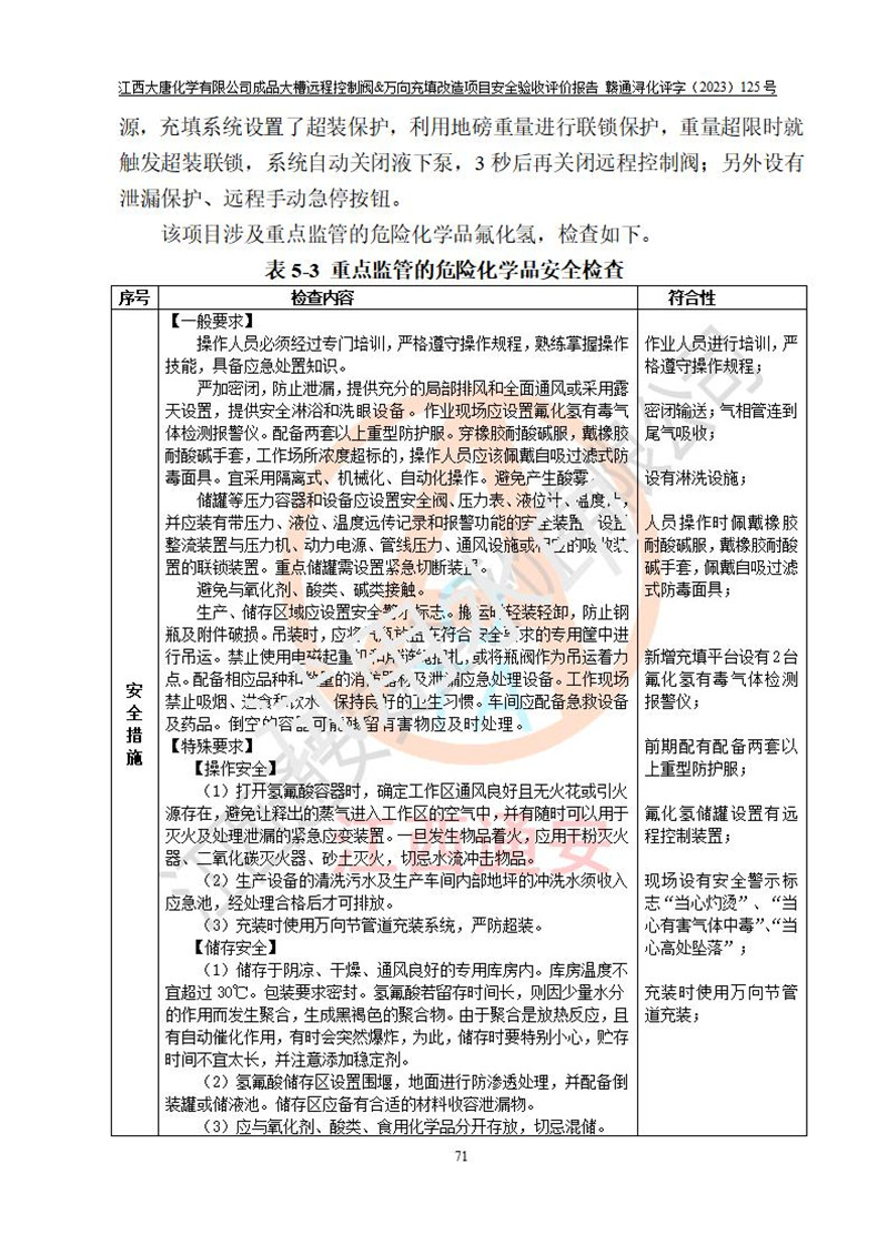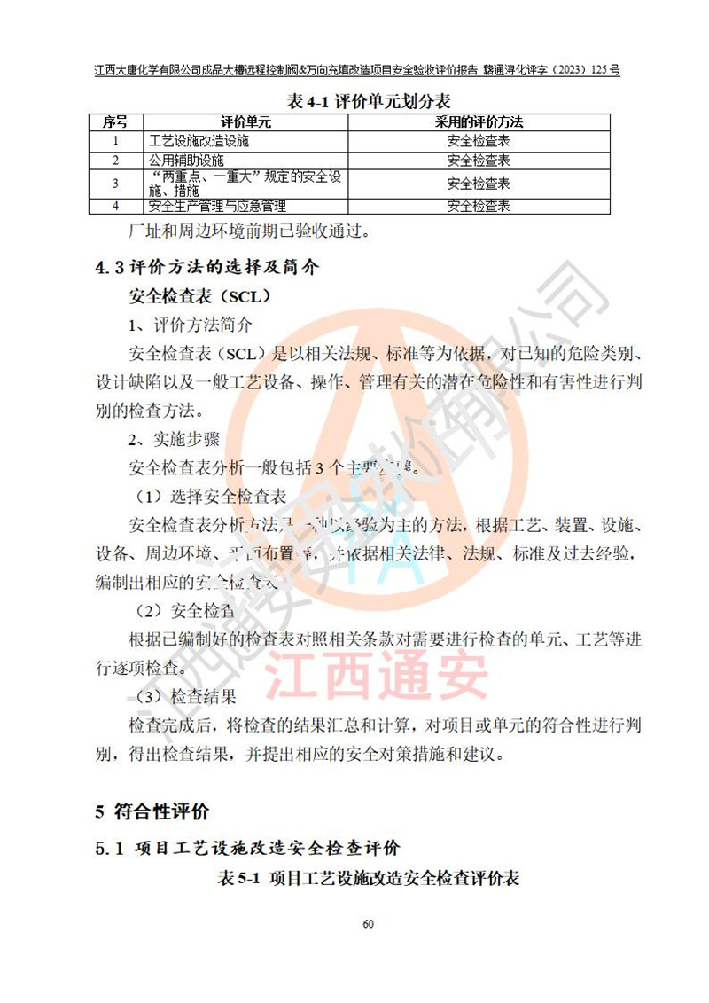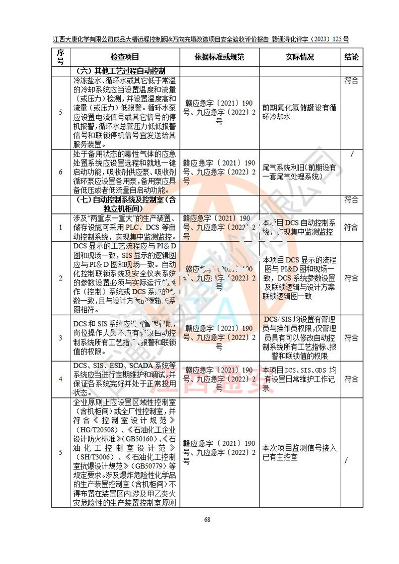 评价结论 | 江西大唐化学有限公司成品大槽远程控制阀&万向充填改造项目已按设计要求得到落实,具备竣工安全验收的条件。 | ||||