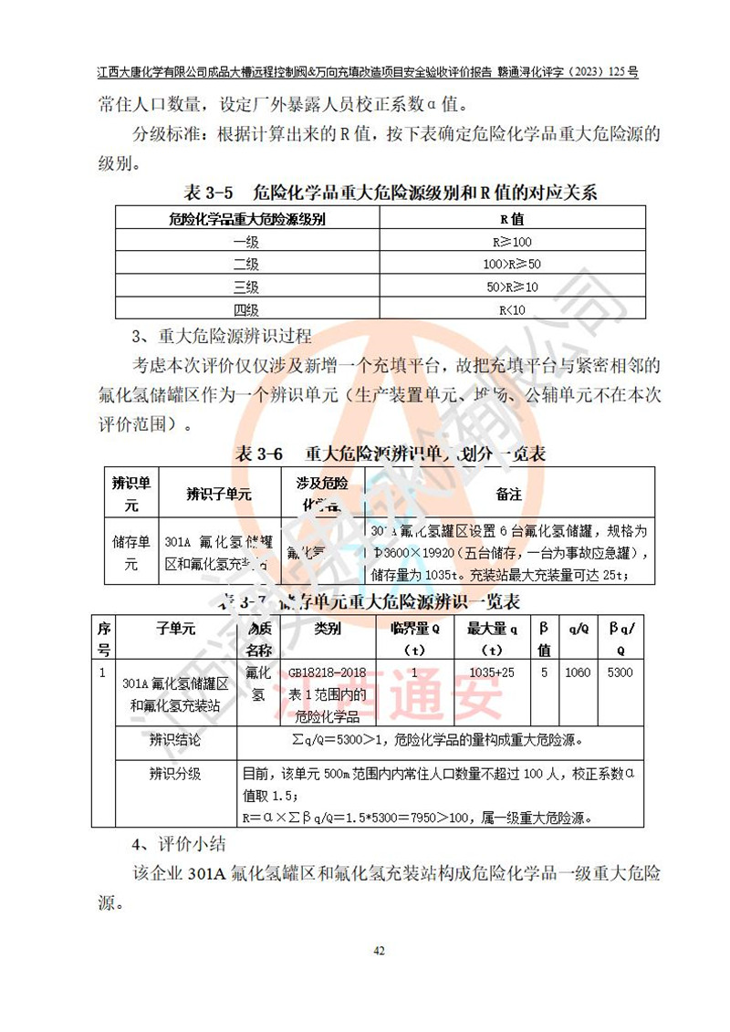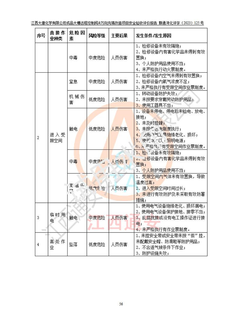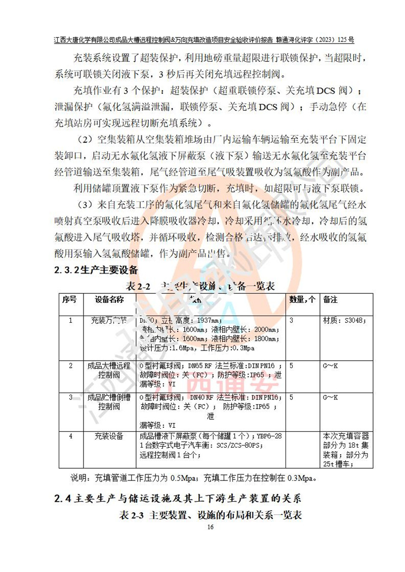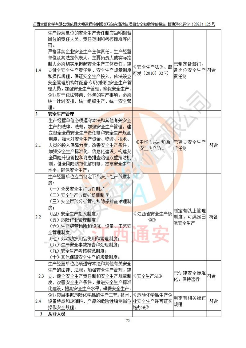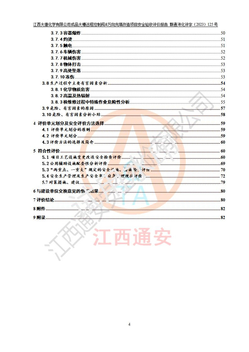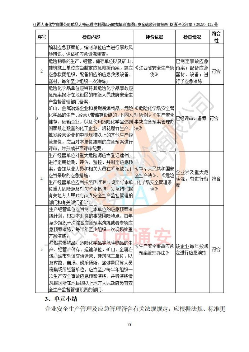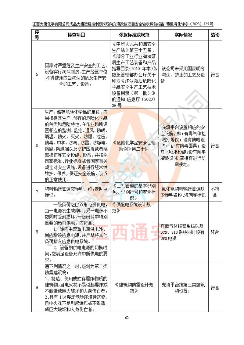评价结论 | 江西大唐化学有限公司成品大槽远程控制阀&万向充填改造项目已按设计要求得到落实,具备竣工安全验收的条件。 | ||||