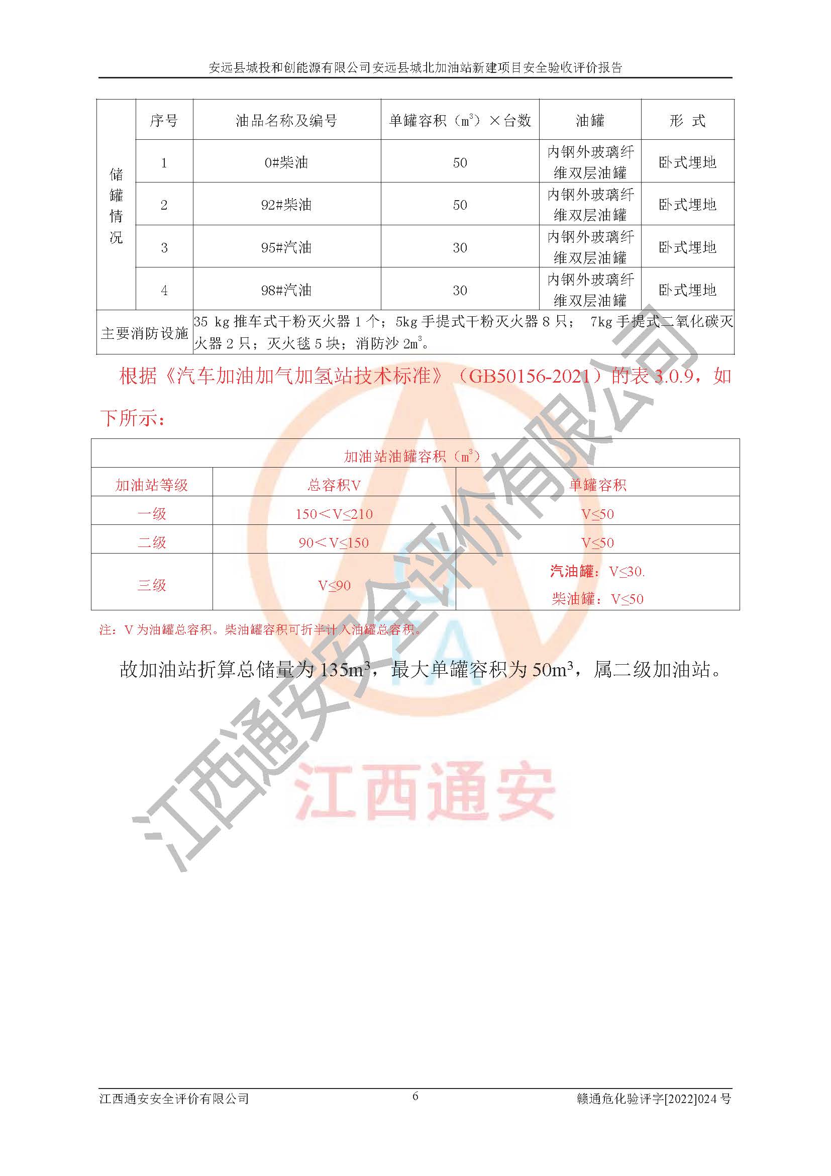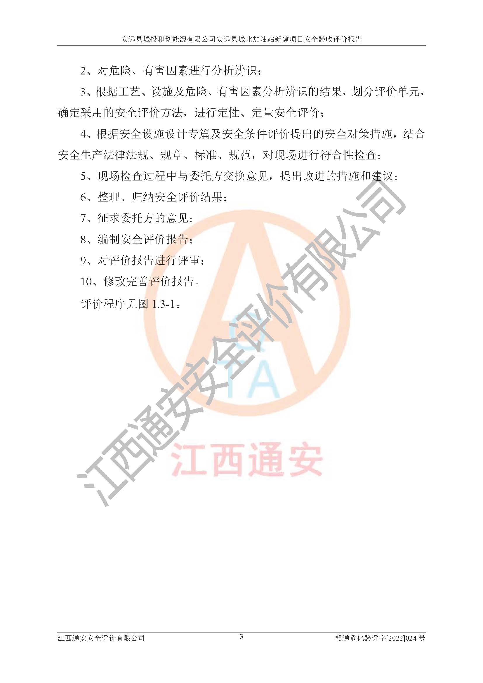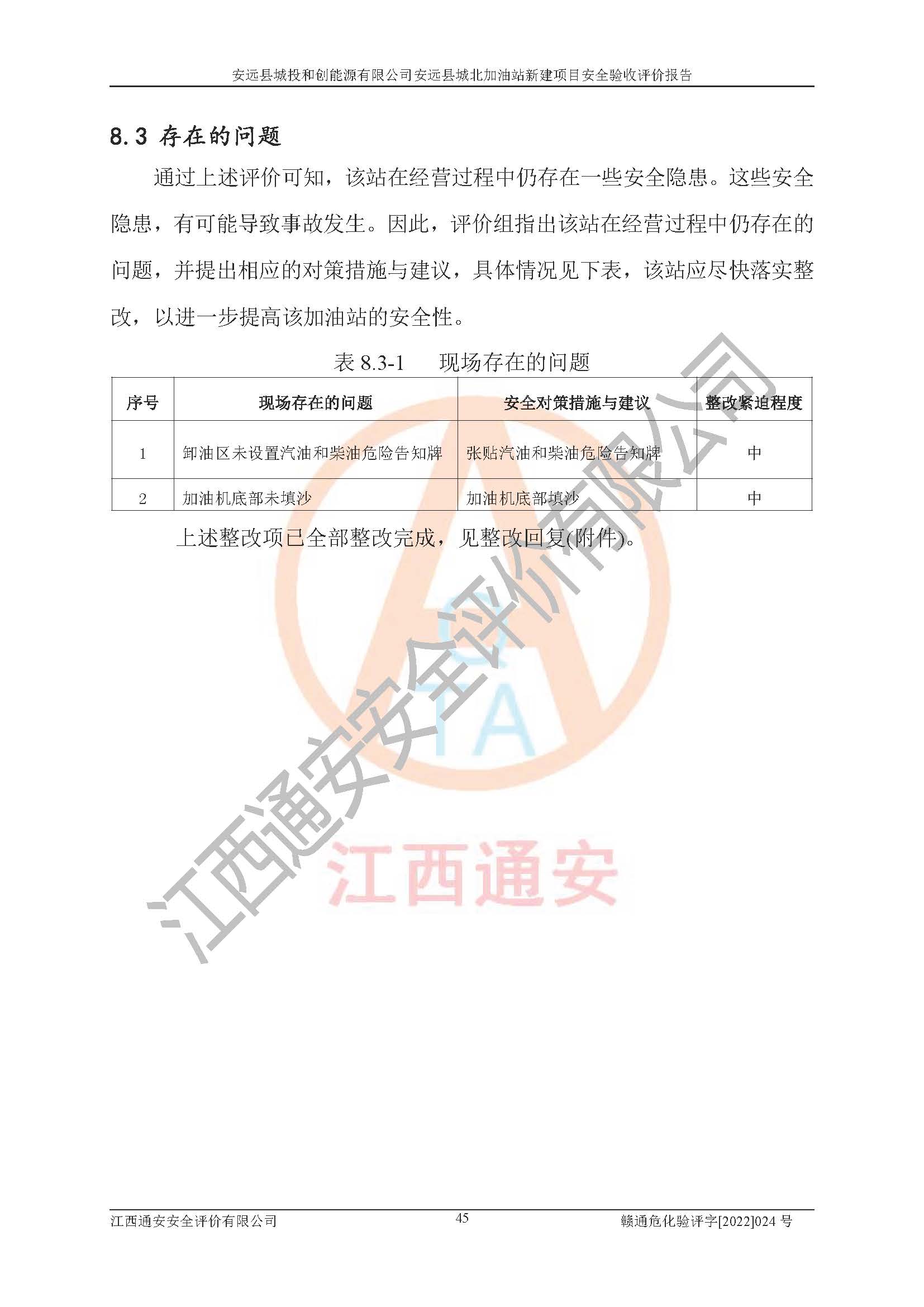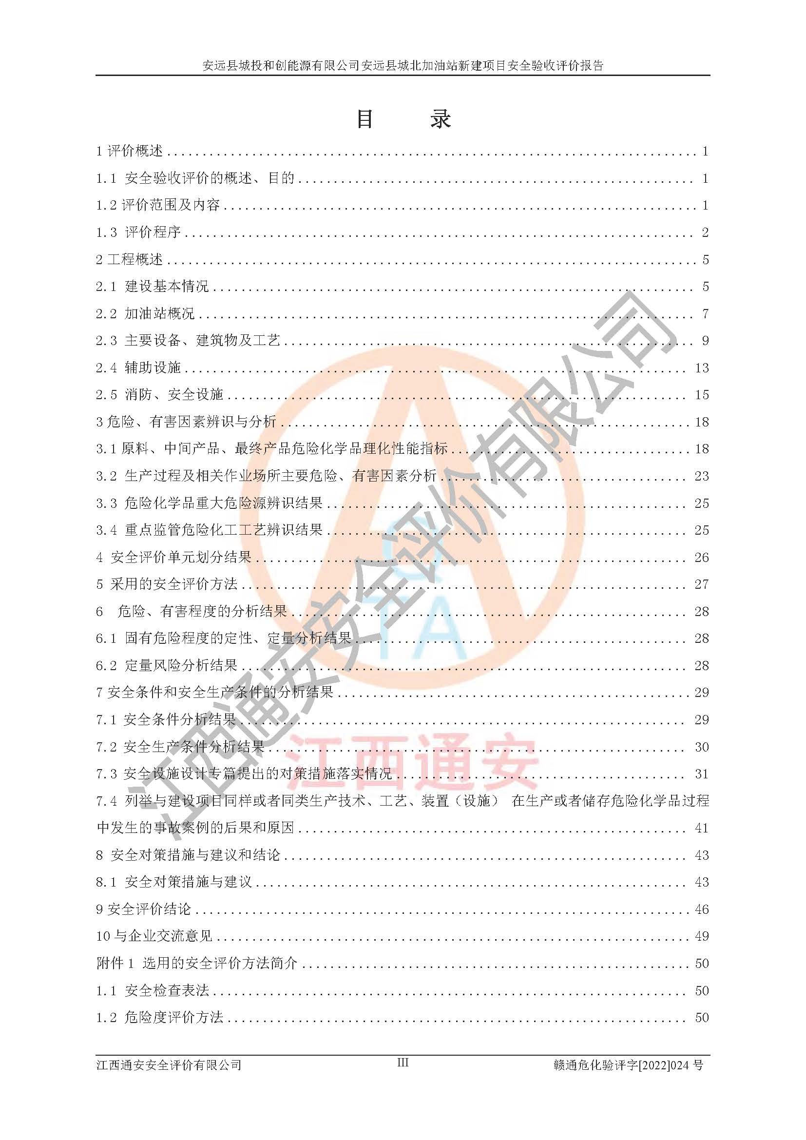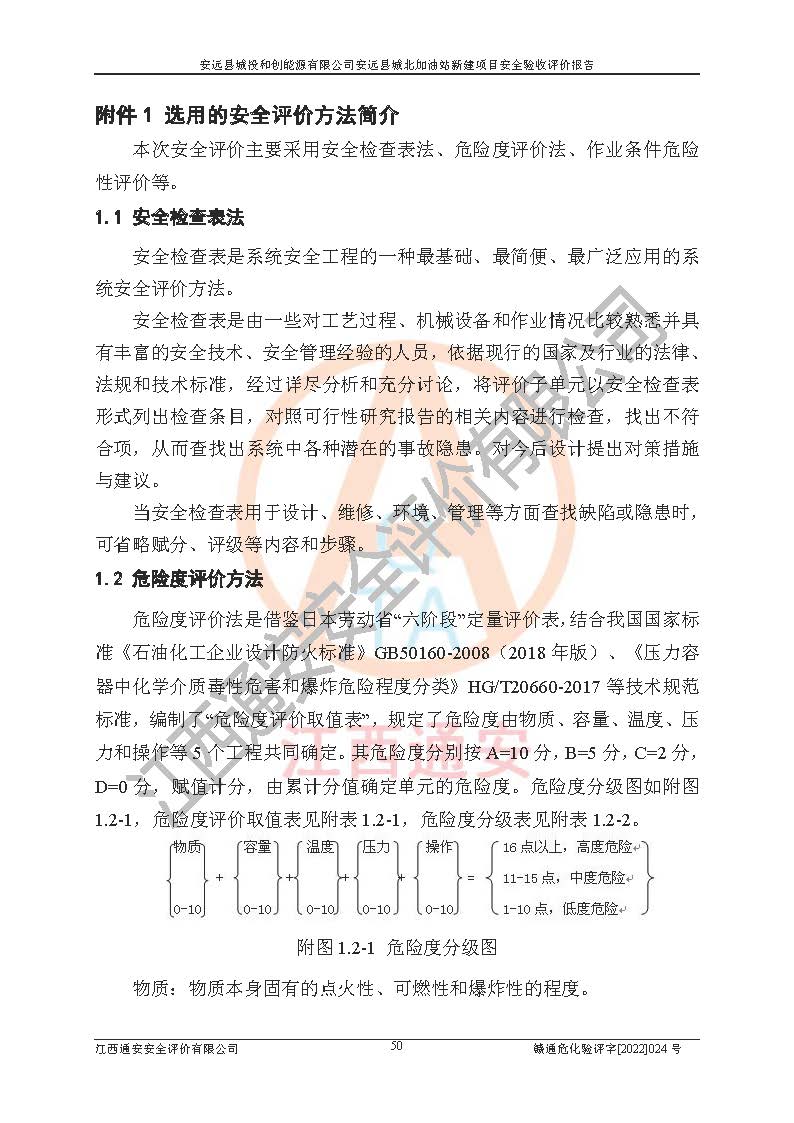 主要任务 | 江西通安安全评价有限公司2022年10月15日组织安全评价人员,对安远县城投和创能源有限公司安远县城北加油站的现场以及提供的资料、文件进行了分析和讨论,对评价人员进行了工作职责分工,并编制了现场安全检查表。在委托方有关管理人员的陪同下,评价人员进行了现场安全设施检验和检查,对安远县城投和创能源有限公司安远县城北加油站的安全设施和技术措施进行符合性和**性进行验证,对安全生产管理状况进行检查,并提出安全生产方面的问题当场与委托方相关人员进行了交流的基础上,依据按照《安全评价通则》(AQ8001-2007)和《安全验收评价导则》(AQ8003-2007)编制了《安远县城投和创能源有限公司安远县城北加油站安全验收报告》。 | ||||