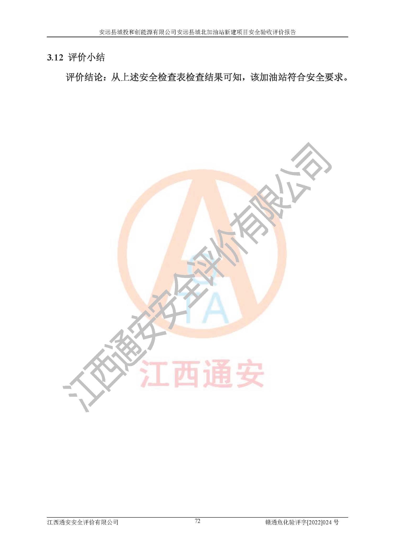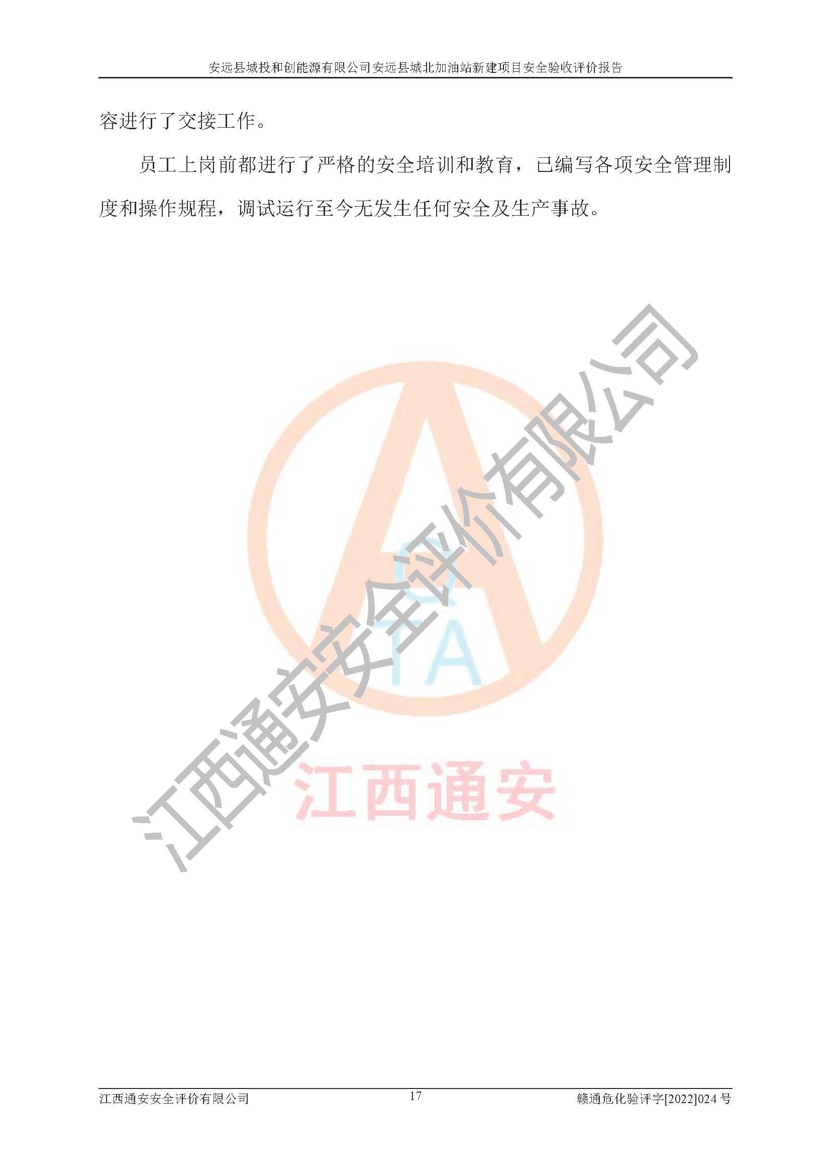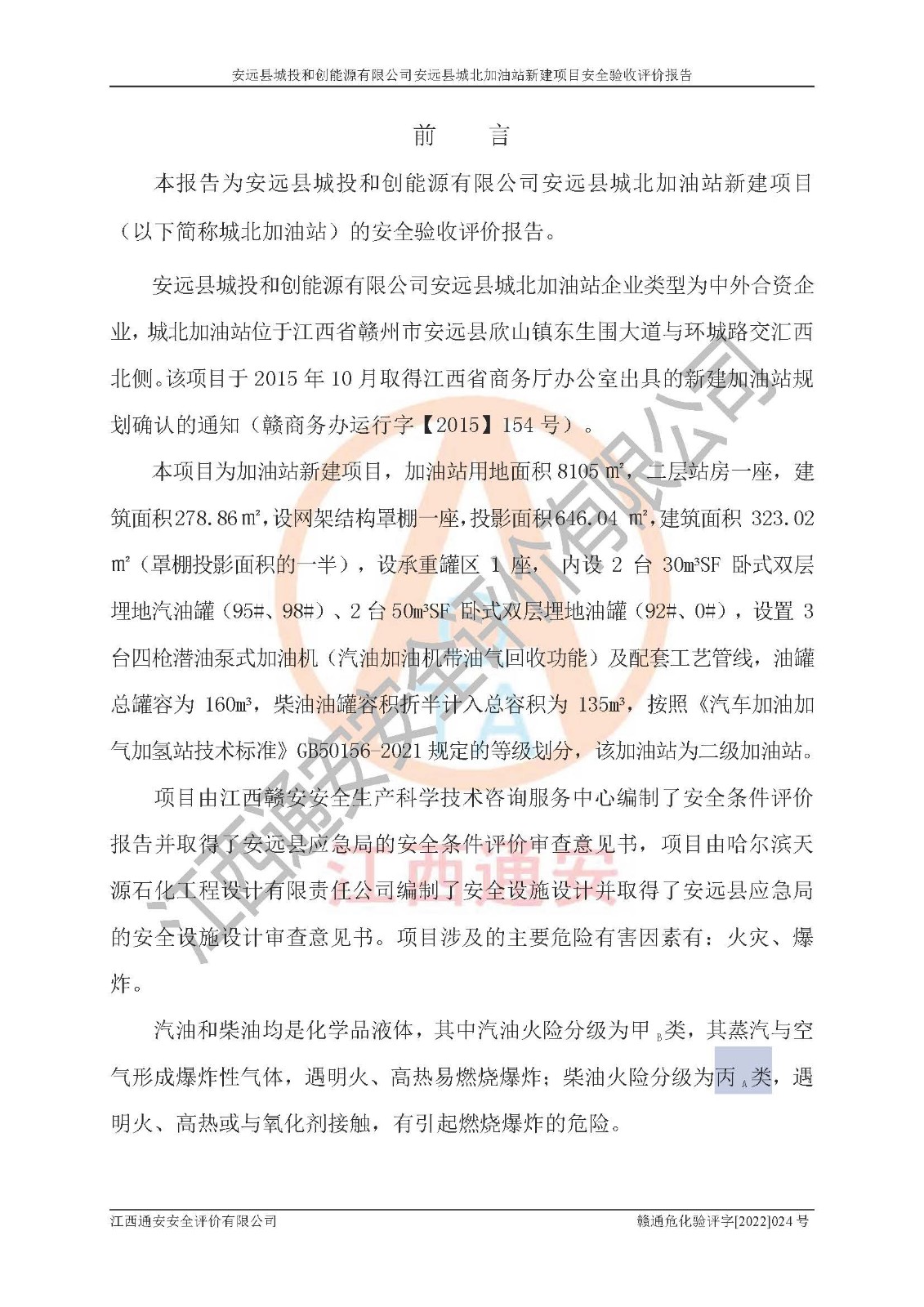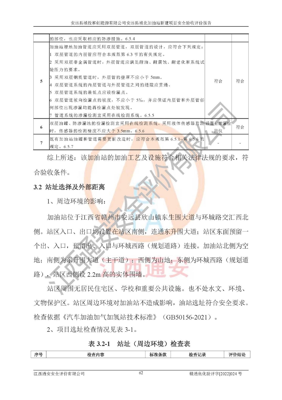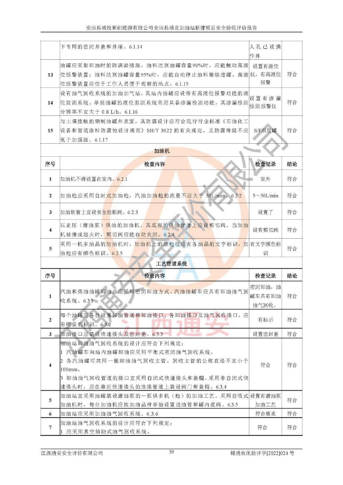 主要任务 | 江西通安安全评价有限公司2022年10月15日组织安全评价人员,对安远县城投和创能源有限公司安远县城北加油站的现场以及提供的资料、文件进行了分析和讨论,对评价人员进行了工作职责分工,并编制了现场安全检查表。在委托方有关管理人员的陪同下,评价人员进行了现场安全设施检验和检查,对安远县城投和创能源有限公司安远县城北加油站的安全设施和技术措施进行符合性和**性进行验证,对安全生产管理状况进行检查,并提出安全生产方面的问题当场与委托方相关人员进行了交流的基础上,依据按照《安全评价通则》(AQ8001-2007)和《安全验收评价导则》(AQ8003-2007)编制了《安远县城投和创能源有限公司安远县城北加油站安全验收报告》。 | ||||