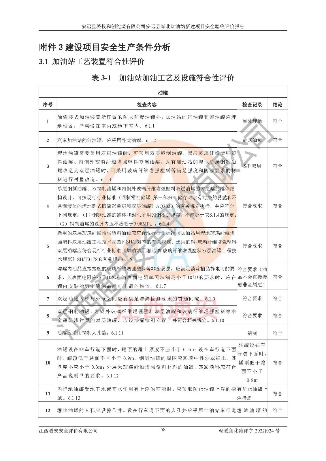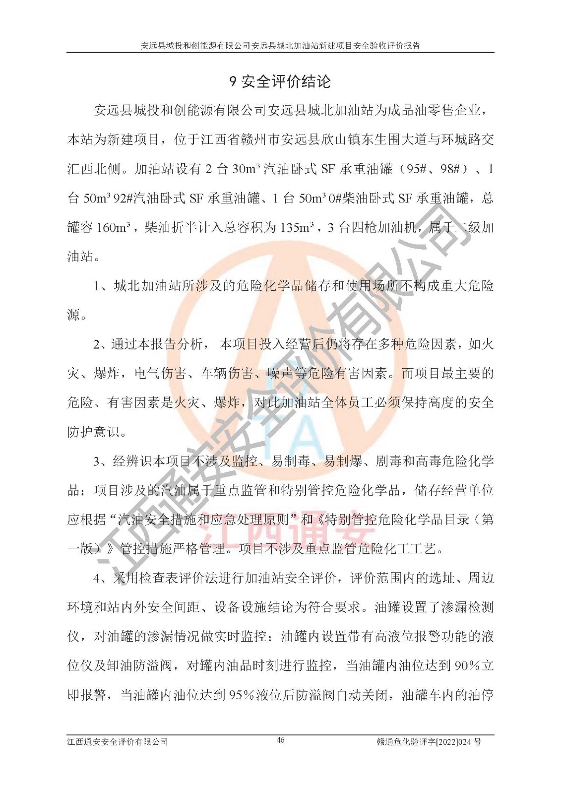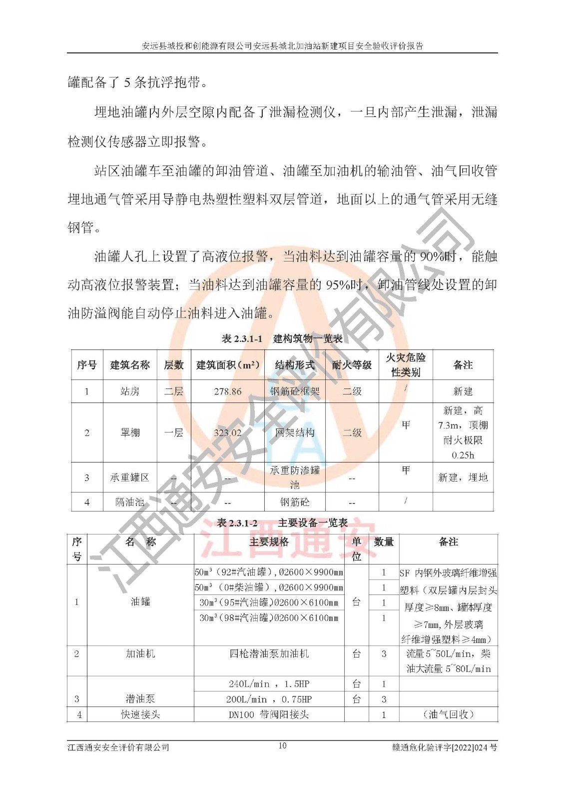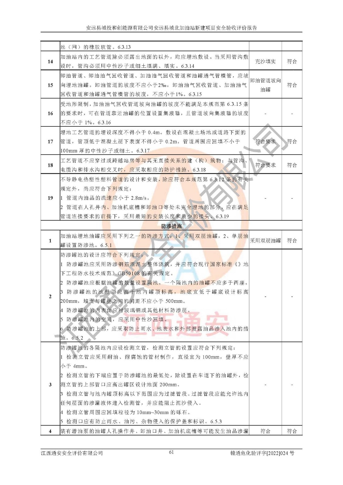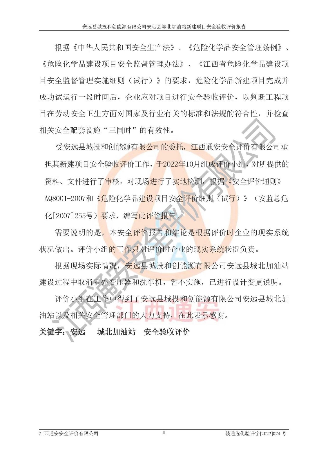 主要任务 | 江西通安安全评价有限公司2022年10月15日组织安全评价人员,对安远县城投和创能源有限公司安远县城北加油站的现场以及提供的资料、文件进行了分析和讨论,对评价人员进行了工作职责分工,并编制了现场安全检查表。在委托方有关管理人员的陪同下,评价人员进行了现场安全设施检验和检查,对安远县城投和创能源有限公司安远县城北加油站的安全设施和技术措施进行符合性和**性进行验证,对安全生产管理状况进行检查,并提出安全生产方面的问题当场与委托方相关人员进行了交流的基础上,依据按照《安全评价通则》(AQ8001-2007)和《安全验收评价导则》(AQ8003-2007)编制了《安远县城投和创能源有限公司安远县城北加油站安全验收报告》。 | ||||