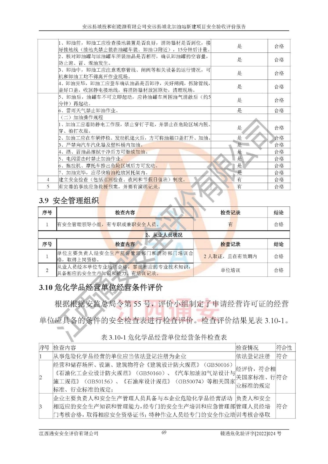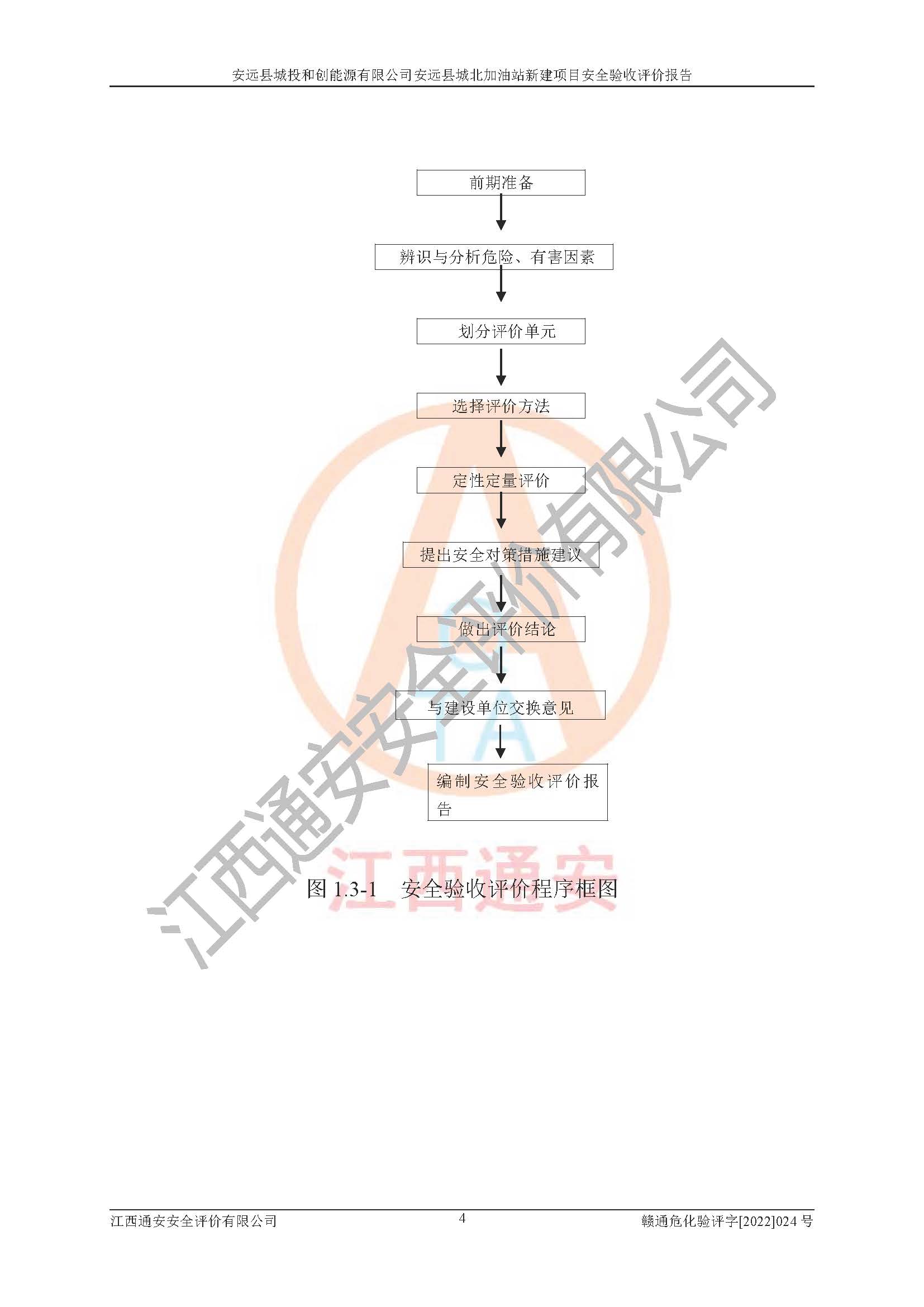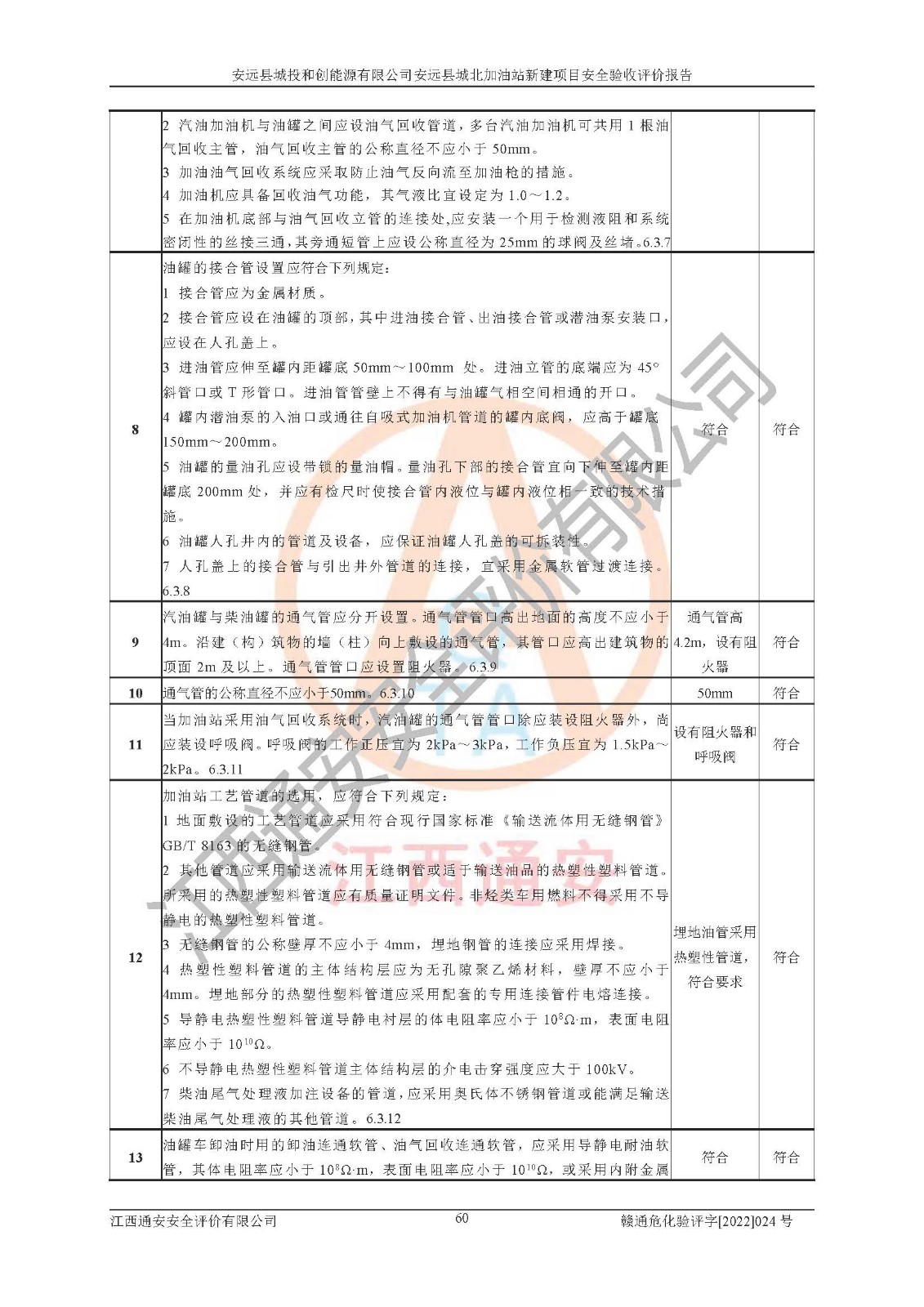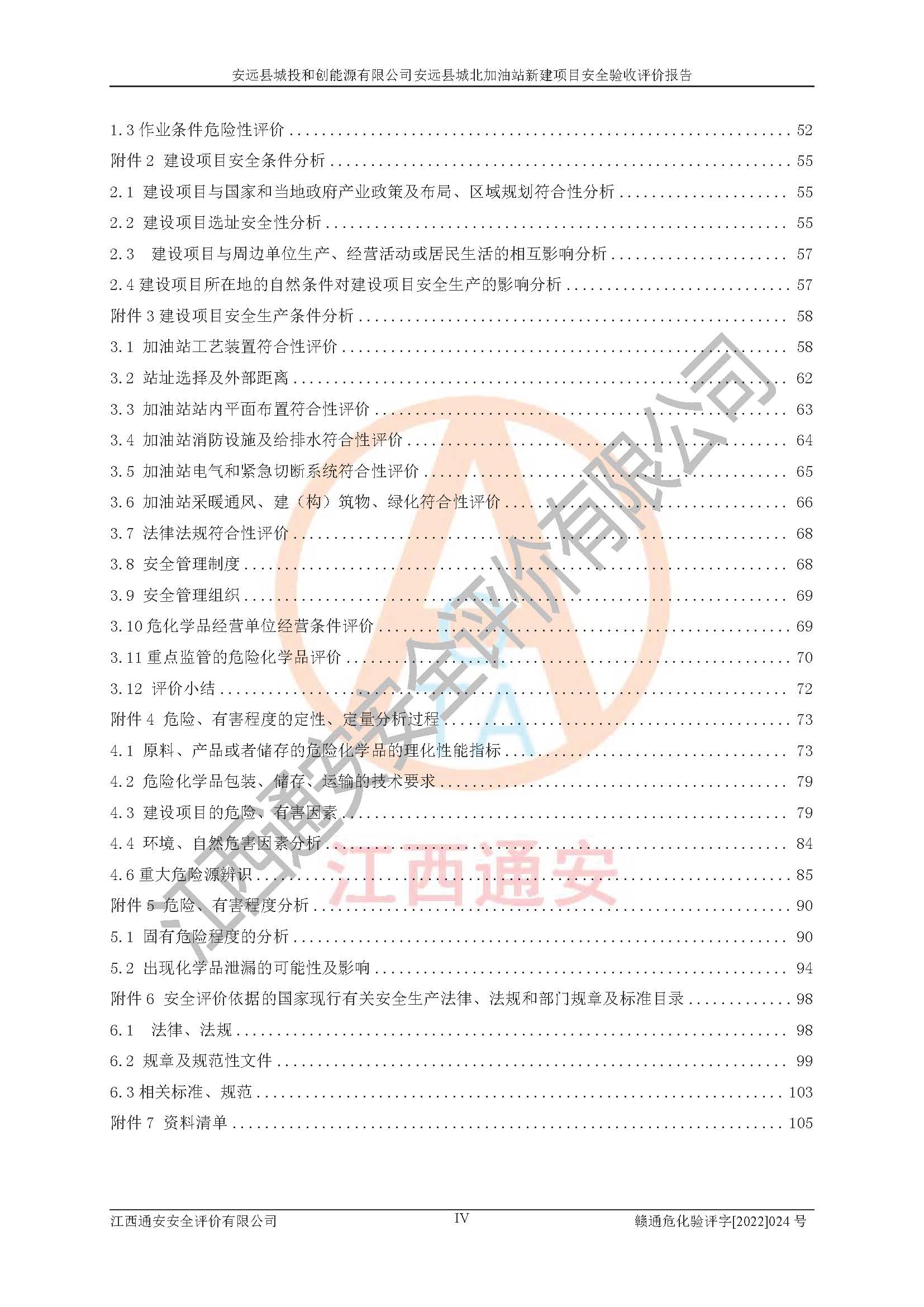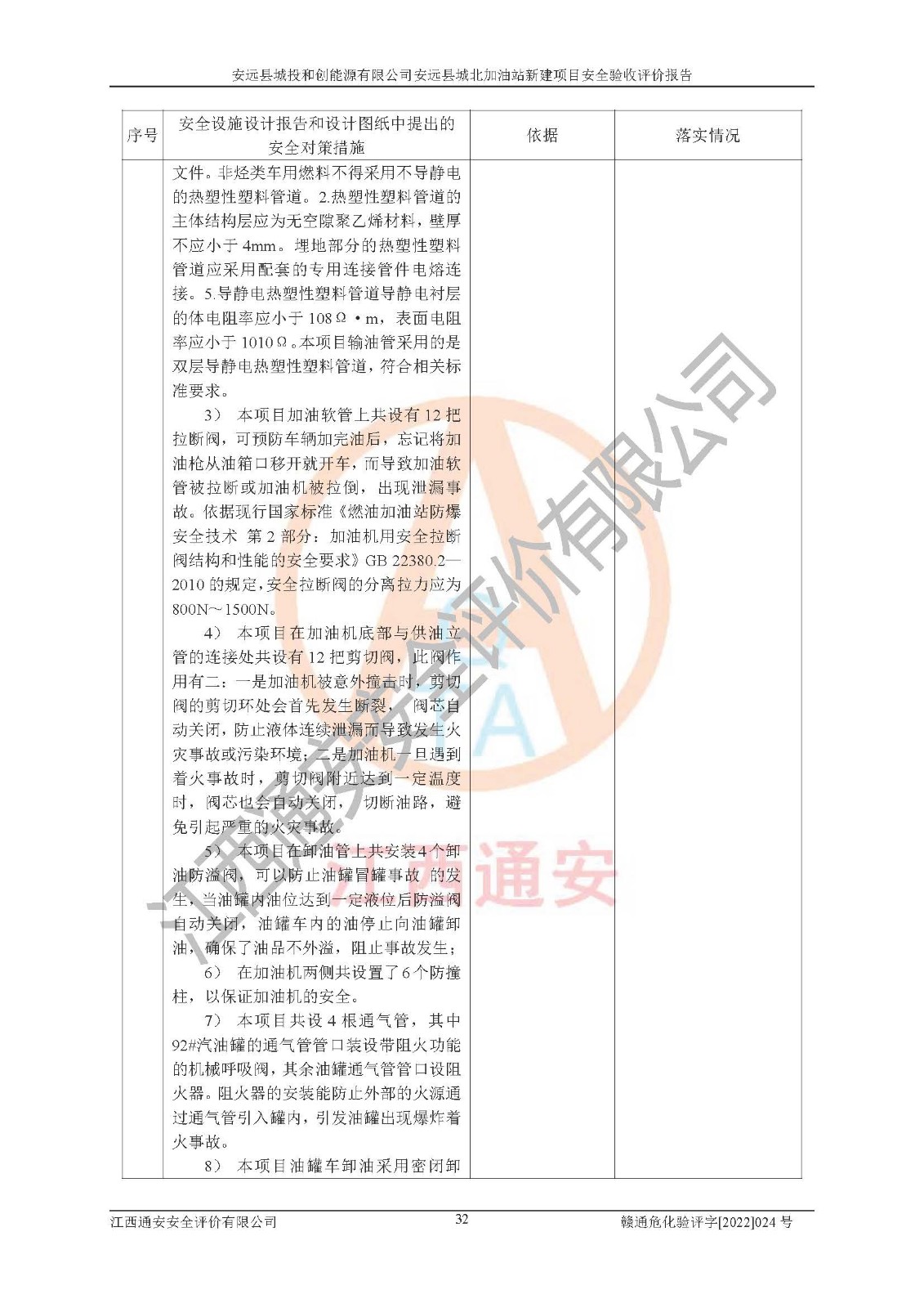 主要任务 | 江西通安安全评价有限公司2022年10月15日组织安全评价人员,对安远县城投和创能源有限公司安远县城北加油站的现场以及提供的资料、文件进行了分析和讨论,对评价人员进行了工作职责分工,并编制了现场安全检查表。在委托方有关管理人员的陪同下,评价人员进行了现场安全设施检验和检查,对安远县城投和创能源有限公司安远县城北加油站的安全设施和技术措施进行符合性和**性进行验证,对安全生产管理状况进行检查,并提出安全生产方面的问题当场与委托方相关人员进行了交流的基础上,依据按照《安全评价通则》(AQ8001-2007)和《安全验收评价导则》(AQ8003-2007)编制了《安远县城投和创能源有限公司安远县城北加油站安全验收报告》。 | ||||