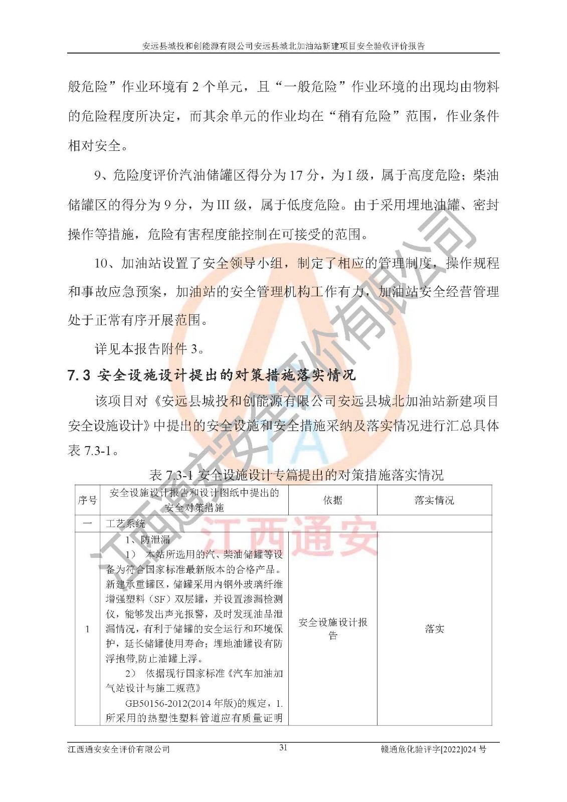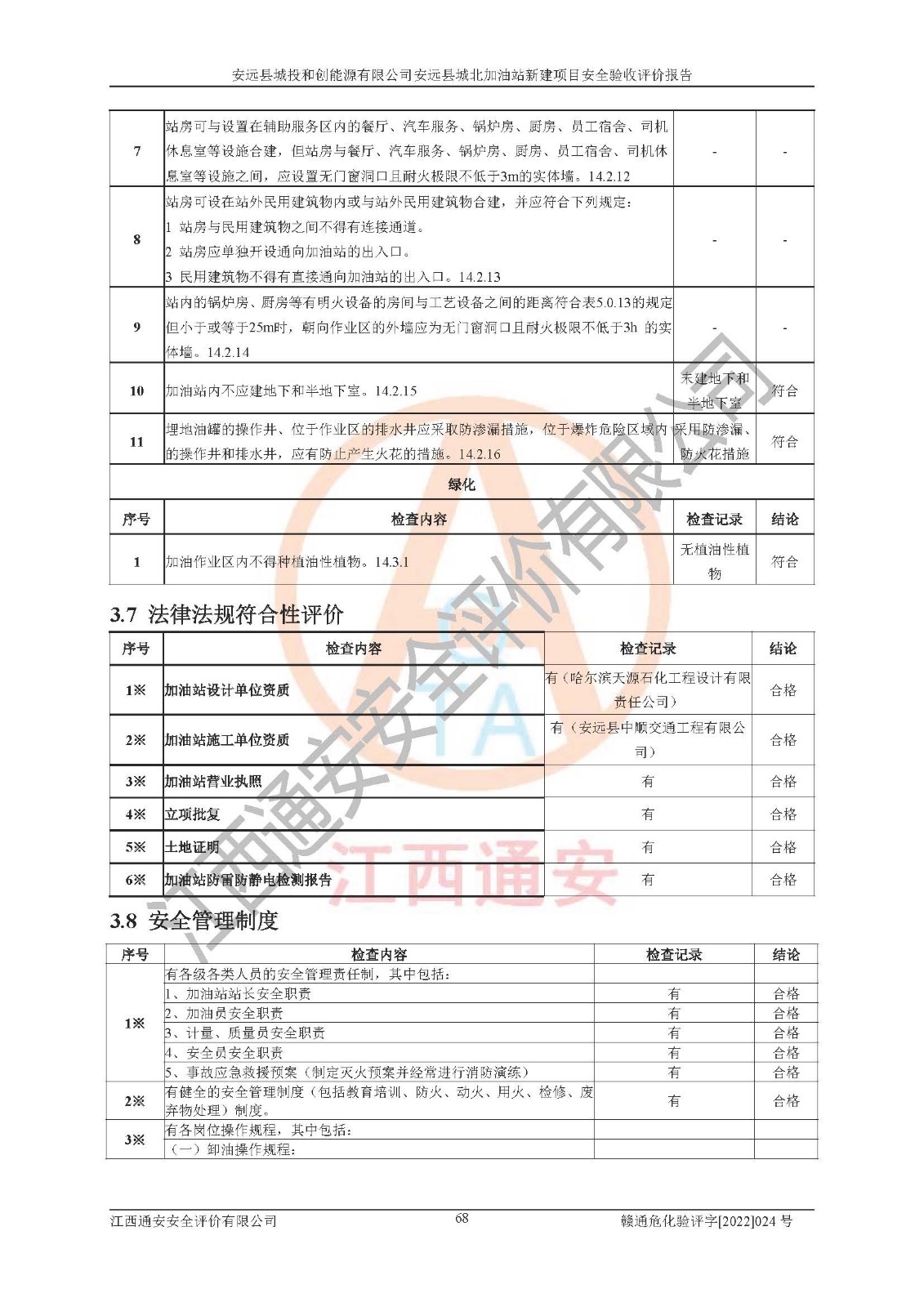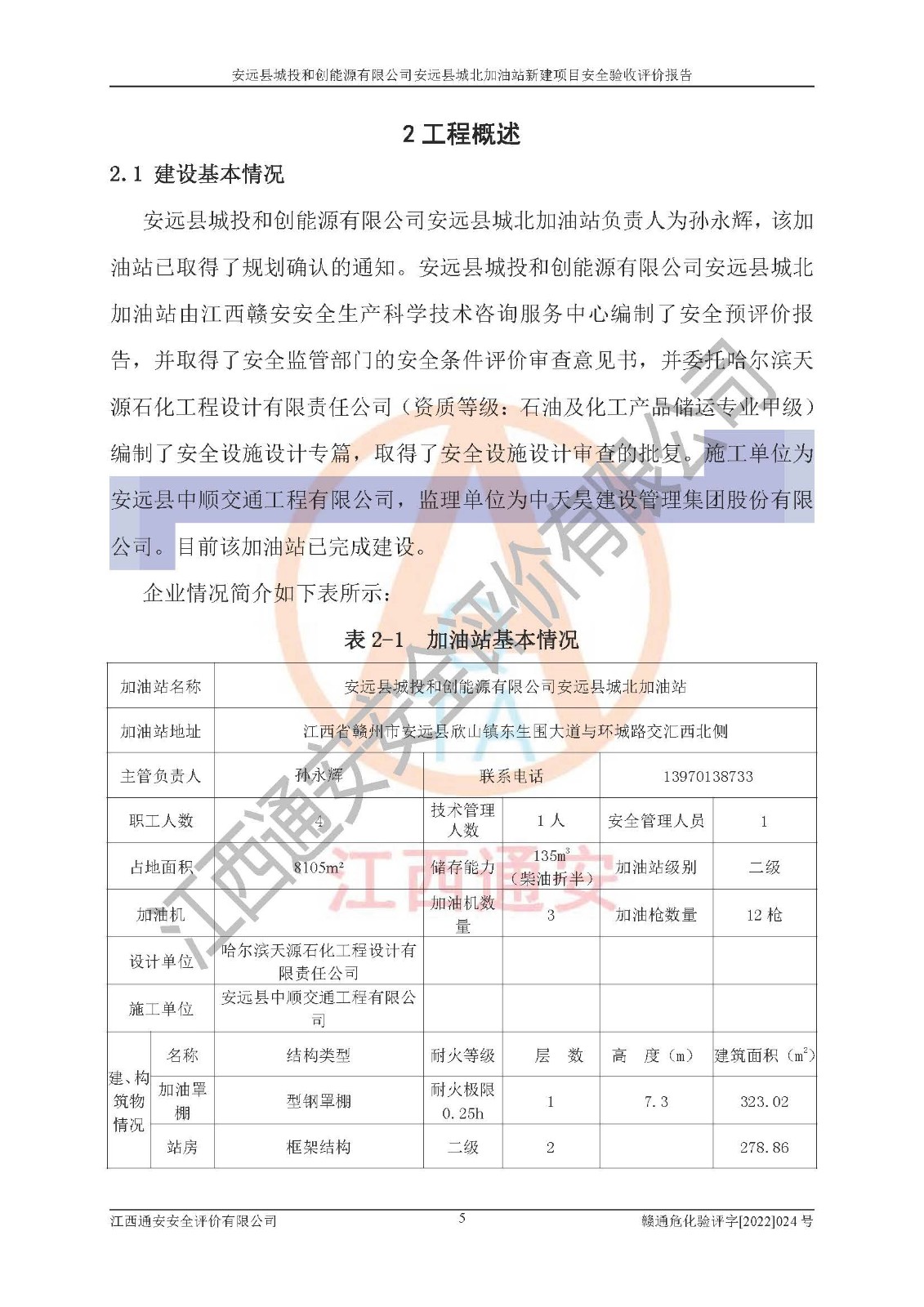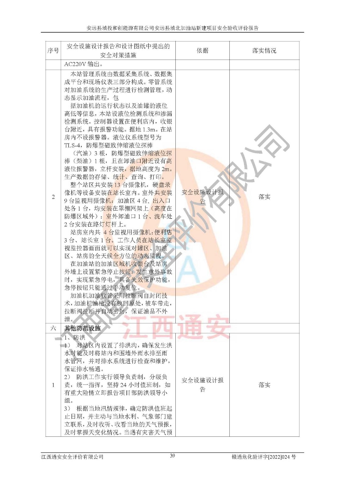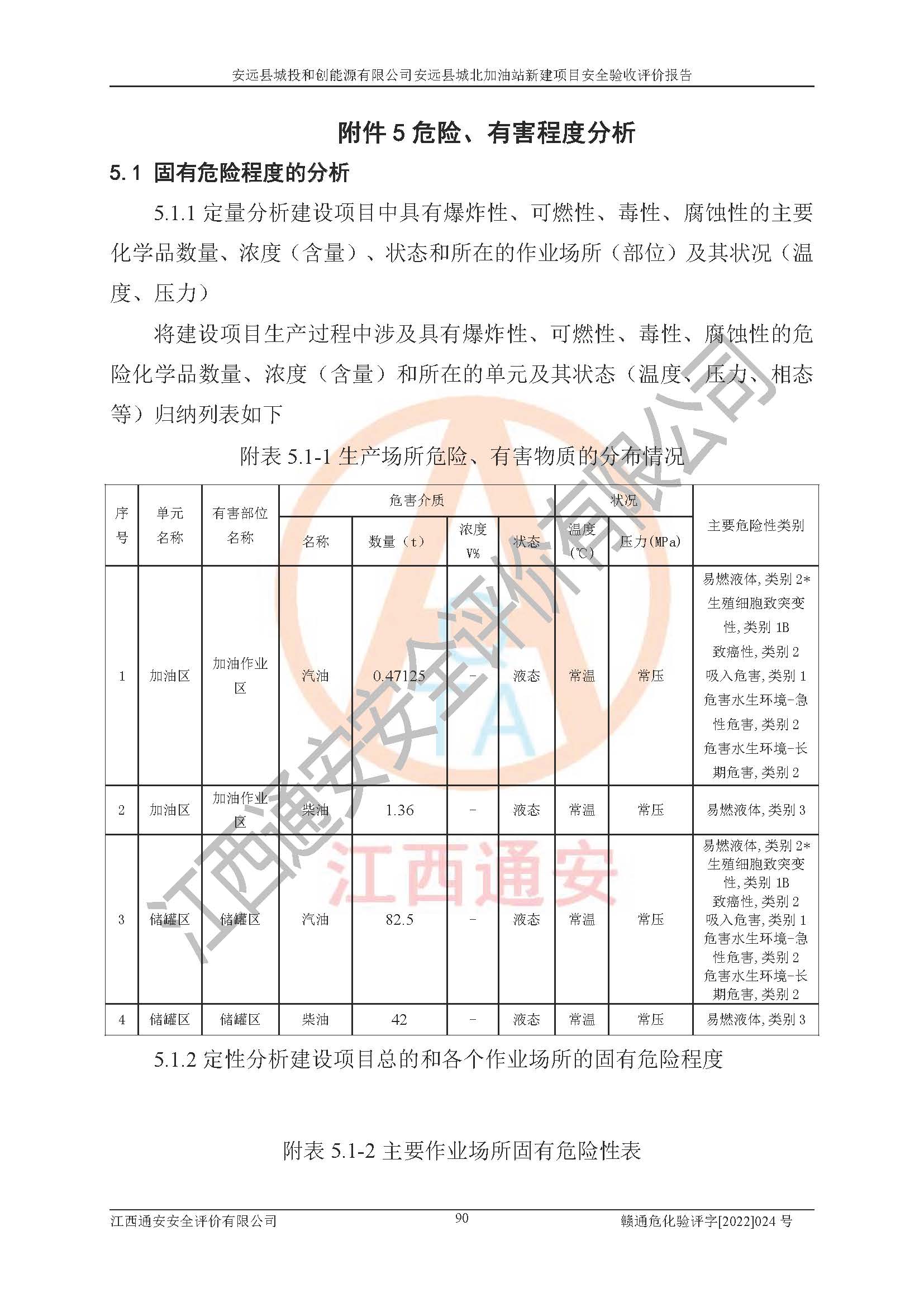 主要任务 | 江西通安安全评价有限公司2022年10月15日组织安全评价人员,对安远县城投和创能源有限公司安远县城北加油站的现场以及提供的资料、文件进行了分析和讨论,对评价人员进行了工作职责分工,并编制了现场安全检查表。在委托方有关管理人员的陪同下,评价人员进行了现场安全设施检验和检查,对安远县城投和创能源有限公司安远县城北加油站的安全设施和技术措施进行符合性和**性进行验证,对安全生产管理状况进行检查,并提出安全生产方面的问题当场与委托方相关人员进行了交流的基础上,依据按照《安全评价通则》(AQ8001-2007)和《安全验收评价导则》(AQ8003-2007)编制了《安远县城投和创能源有限公司安远县城北加油站安全验收报告》。 | ||||