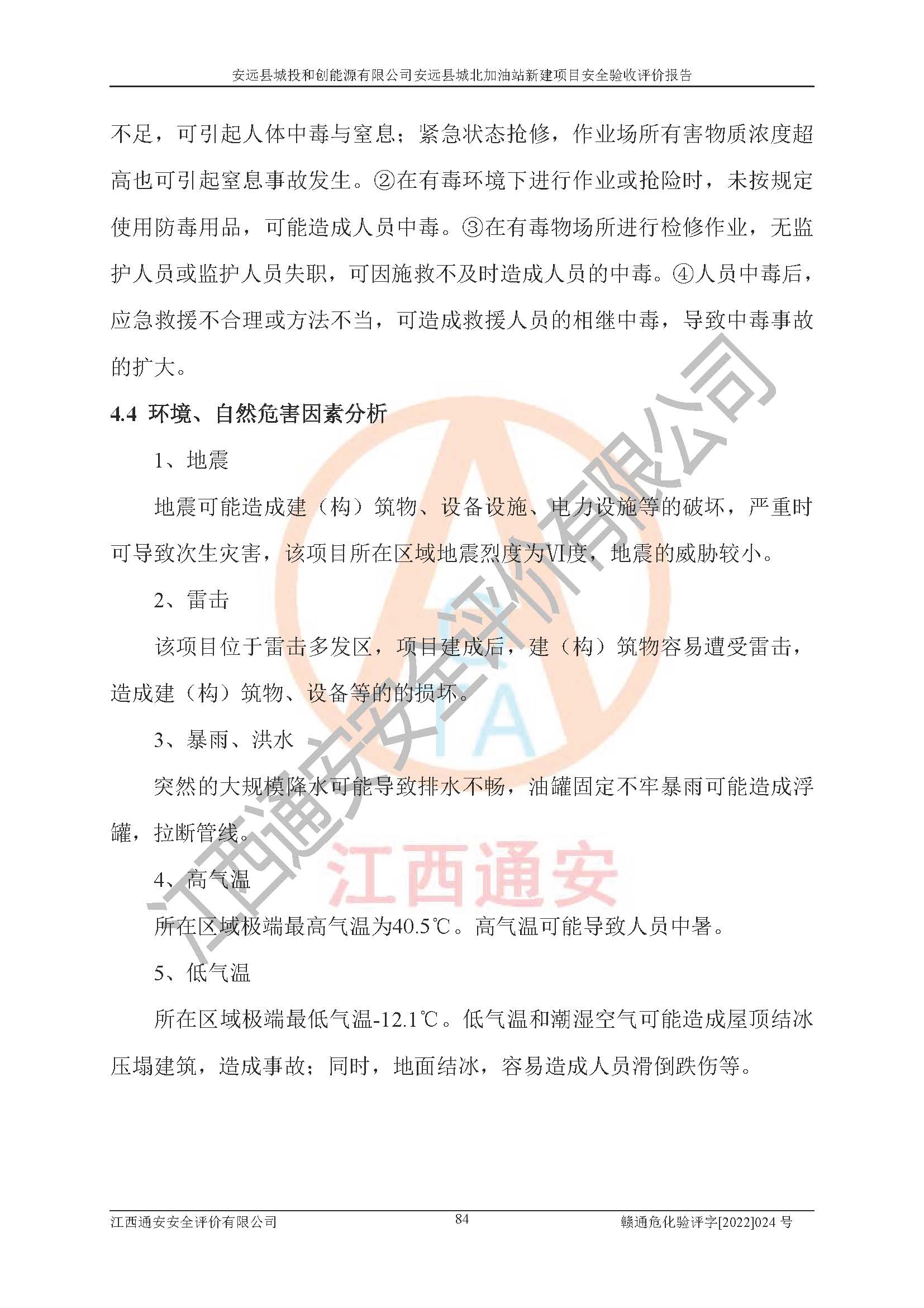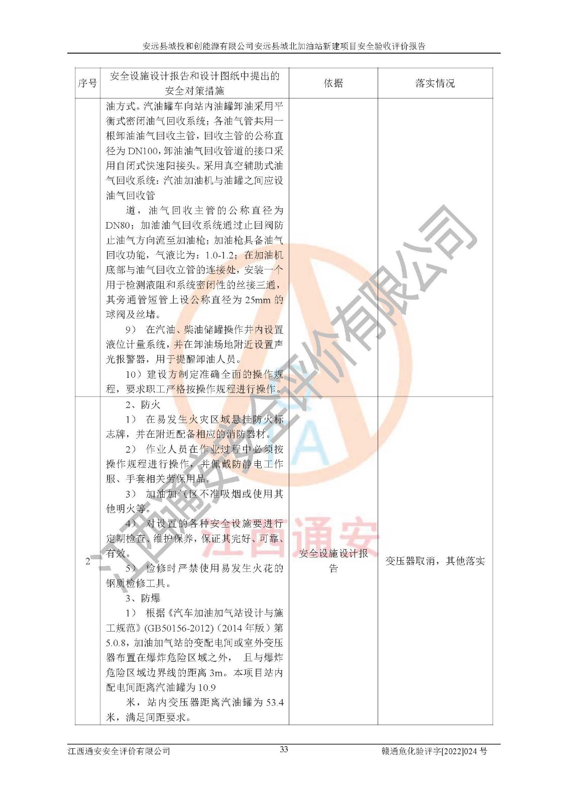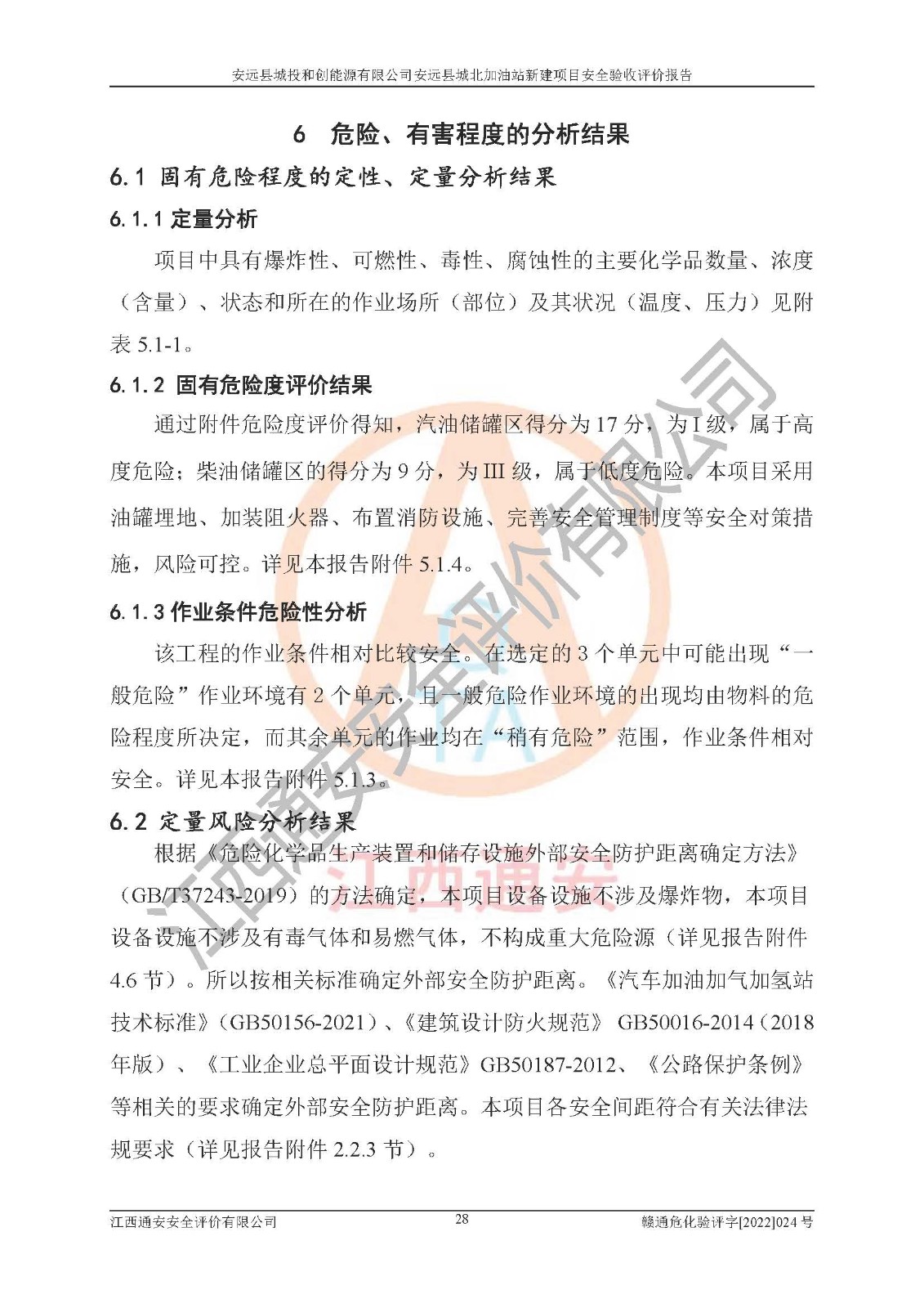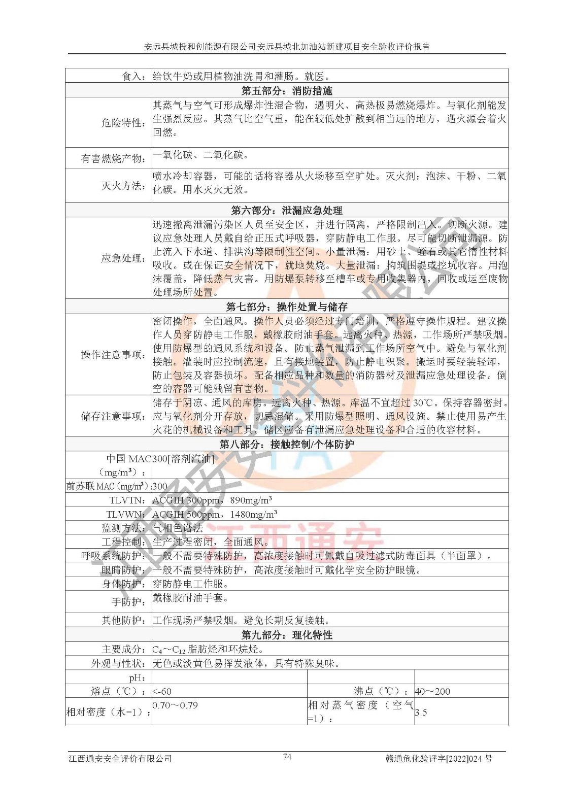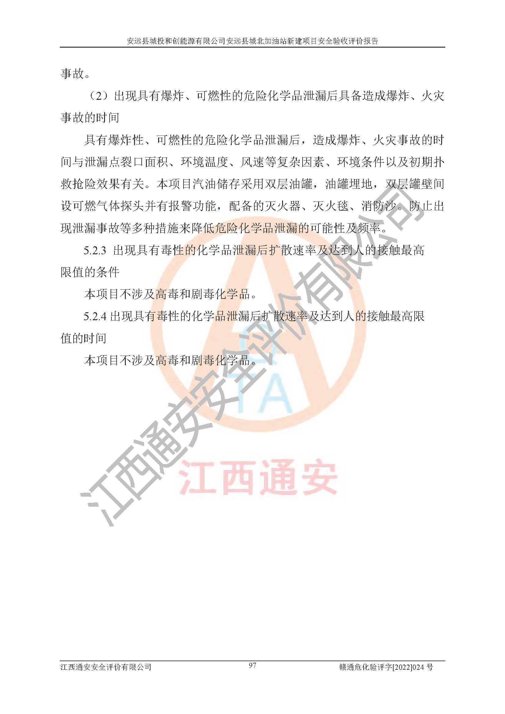 主要任务 | 江西通安安全评价有限公司2022年10月15日组织安全评价人员,对安远县城投和创能源有限公司安远县城北加油站的现场以及提供的资料、文件进行了分析和讨论,对评价人员进行了工作职责分工,并编制了现场安全检查表。在委托方有关管理人员的陪同下,评价人员进行了现场安全设施检验和检查,对安远县城投和创能源有限公司安远县城北加油站的安全设施和技术措施进行符合性和**性进行验证,对安全生产管理状况进行检查,并提出安全生产方面的问题当场与委托方相关人员进行了交流的基础上,依据按照《安全评价通则》(AQ8001-2007)和《安全验收评价导则》(AQ8003-2007)编制了《安远县城投和创能源有限公司安远县城北加油站安全验收报告》。 | ||||