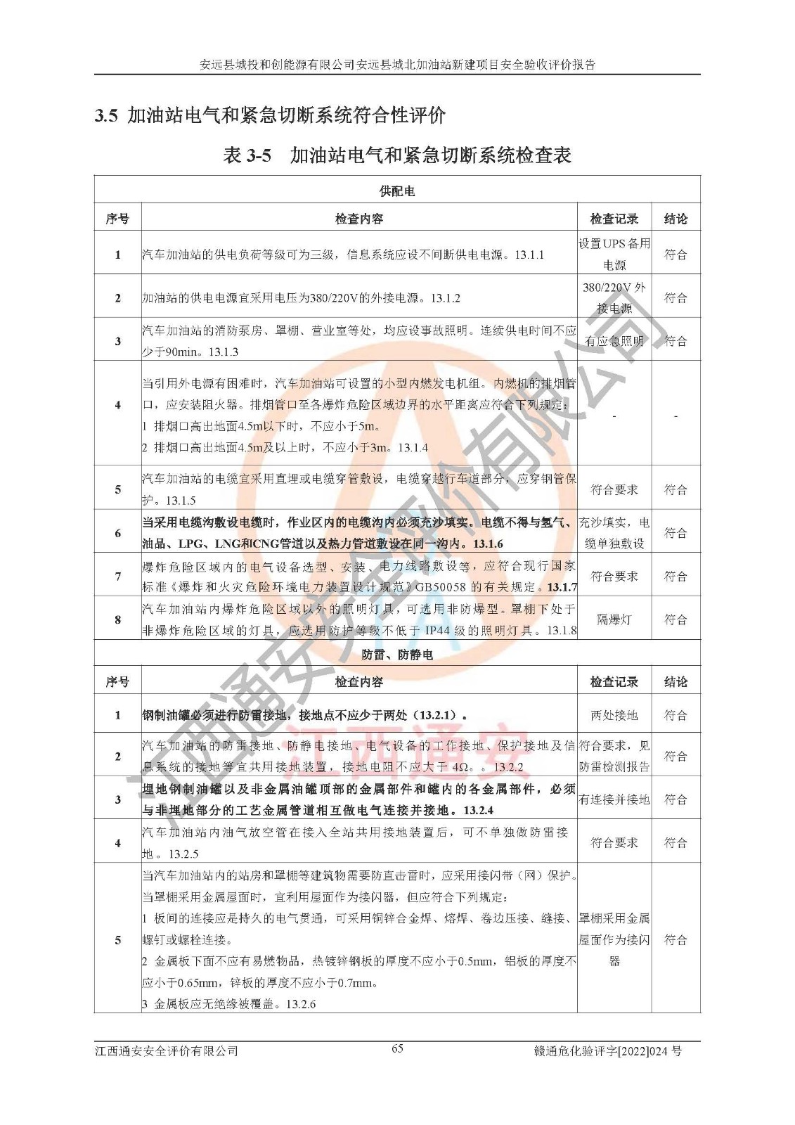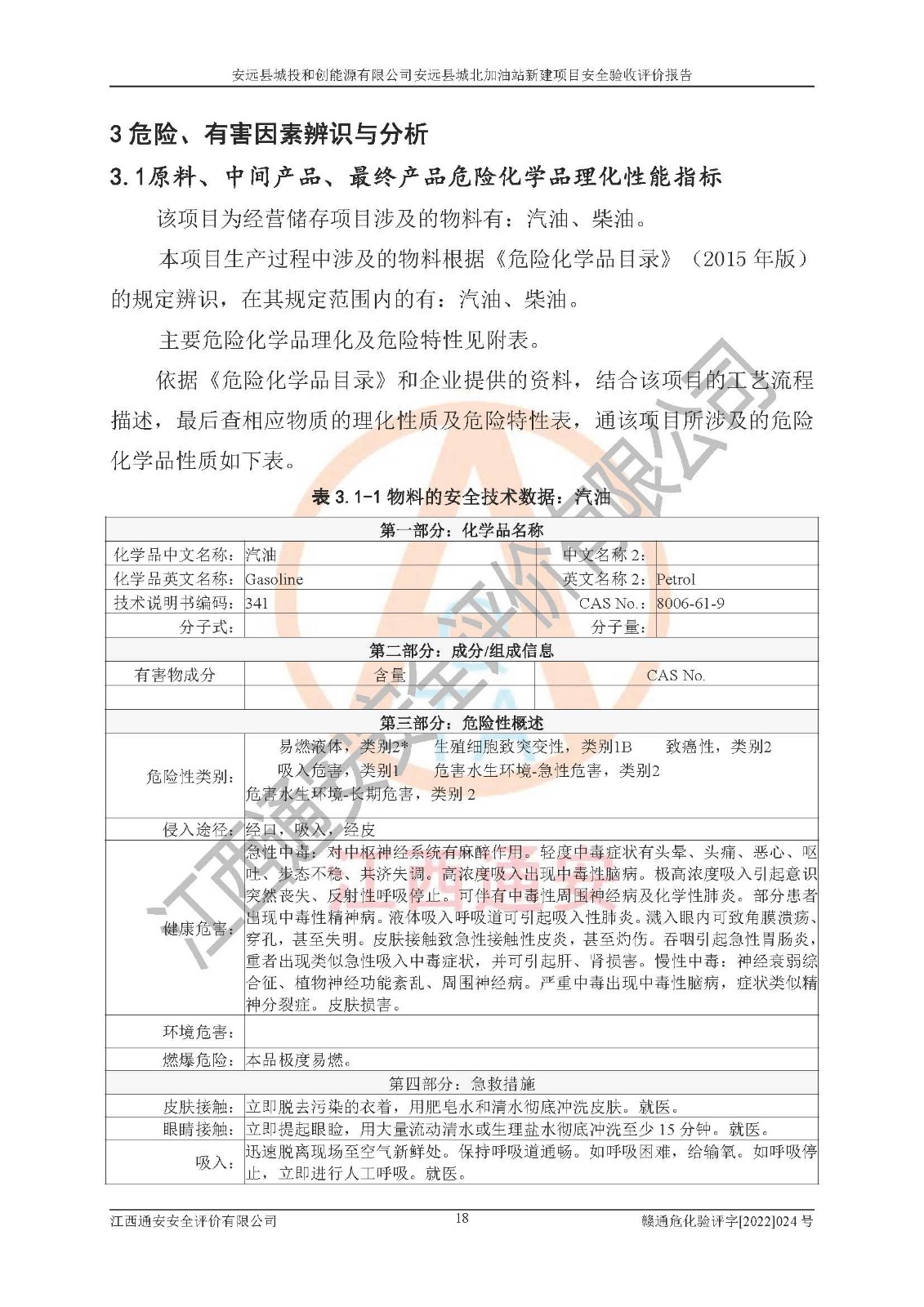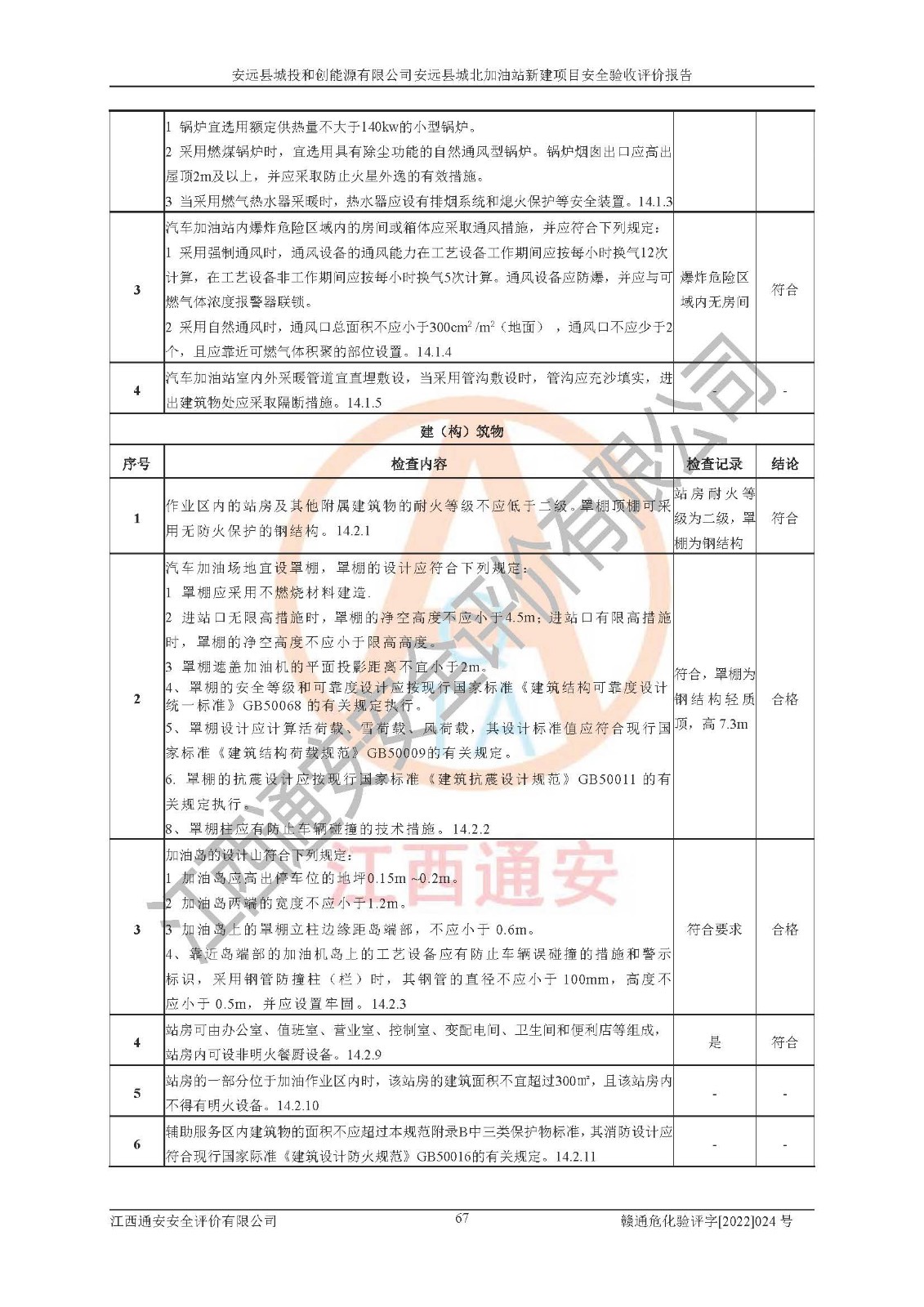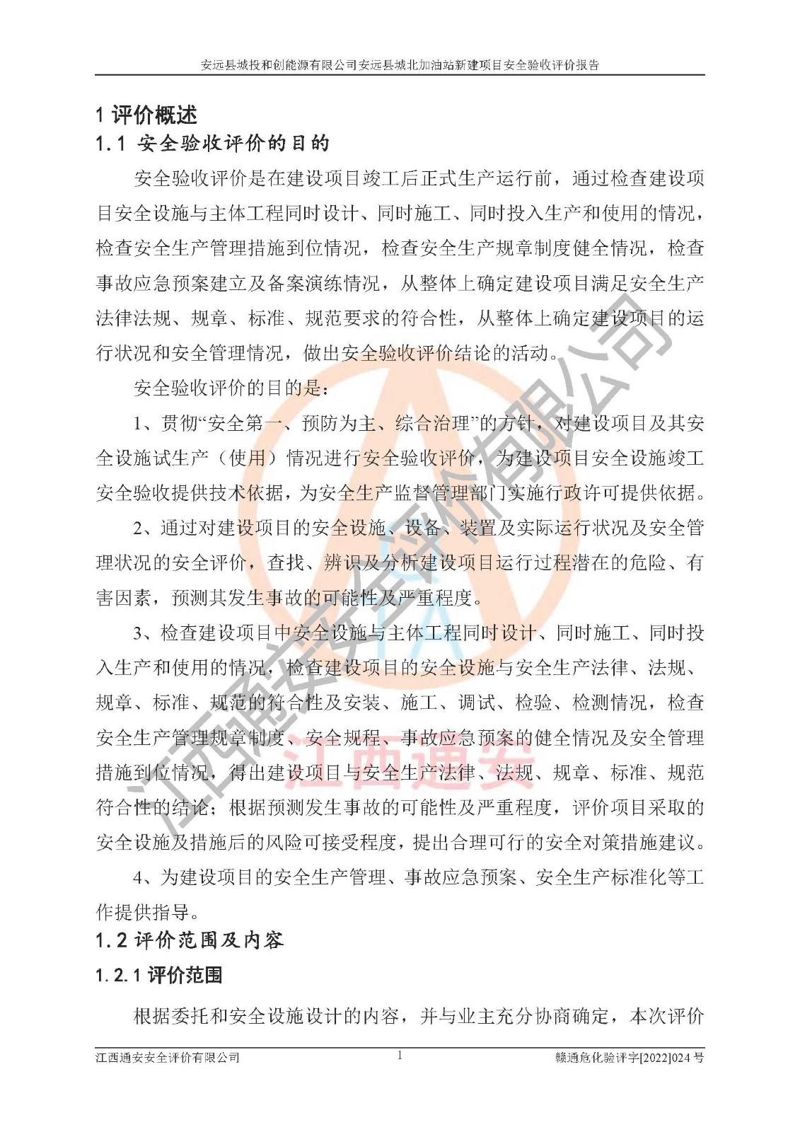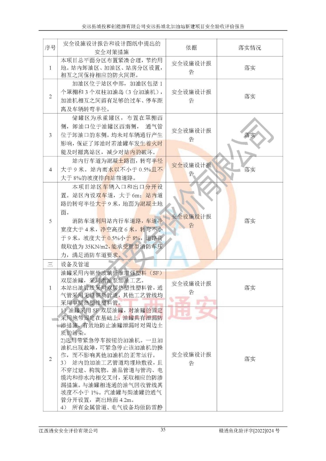 主要任务 | 江西通安安全评价有限公司2022年10月15日组织安全评价人员,对安远县城投和创能源有限公司安远县城北加油站的现场以及提供的资料、文件进行了分析和讨论,对评价人员进行了工作职责分工,并编制了现场安全检查表。在委托方有关管理人员的陪同下,评价人员进行了现场安全设施检验和检查,对安远县城投和创能源有限公司安远县城北加油站的安全设施和技术措施进行符合性和**性进行验证,对安全生产管理状况进行检查,并提出安全生产方面的问题当场与委托方相关人员进行了交流的基础上,依据按照《安全评价通则》(AQ8001-2007)和《安全验收评价导则》(AQ8003-2007)编制了《安远县城投和创能源有限公司安远县城北加油站安全验收报告》。 | ||||
