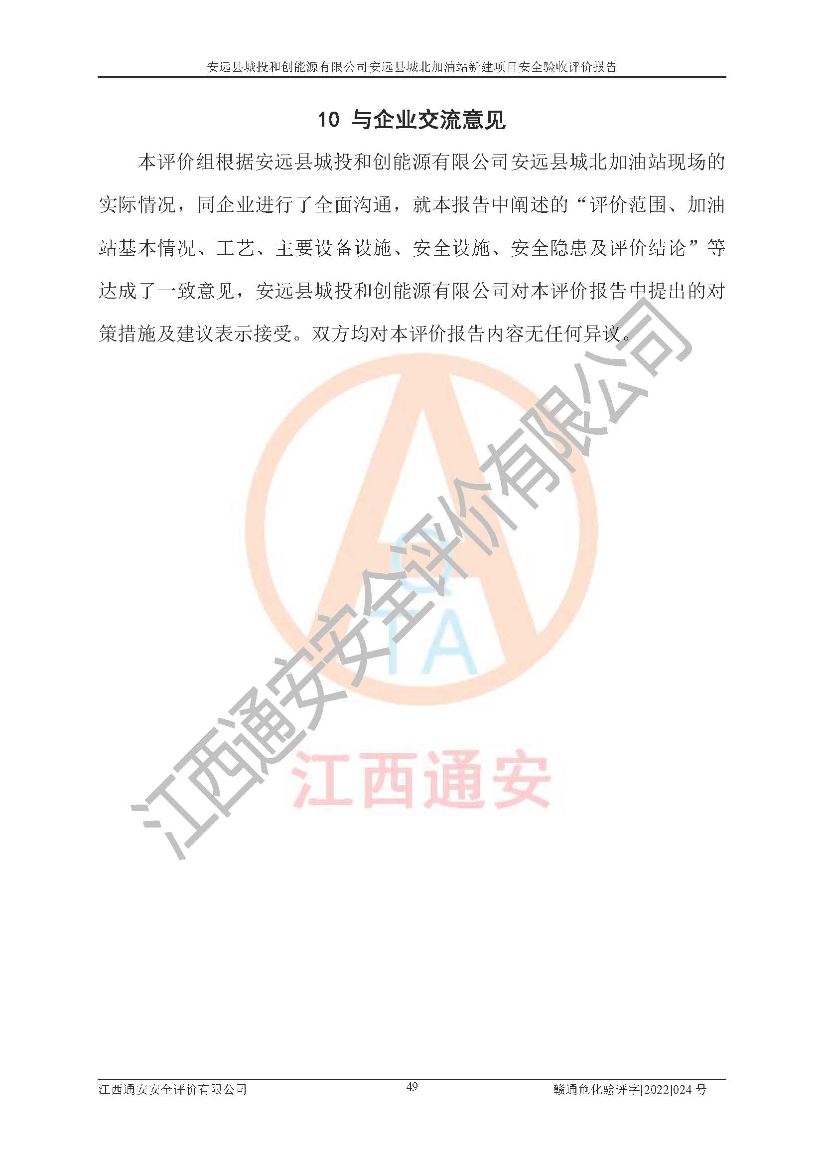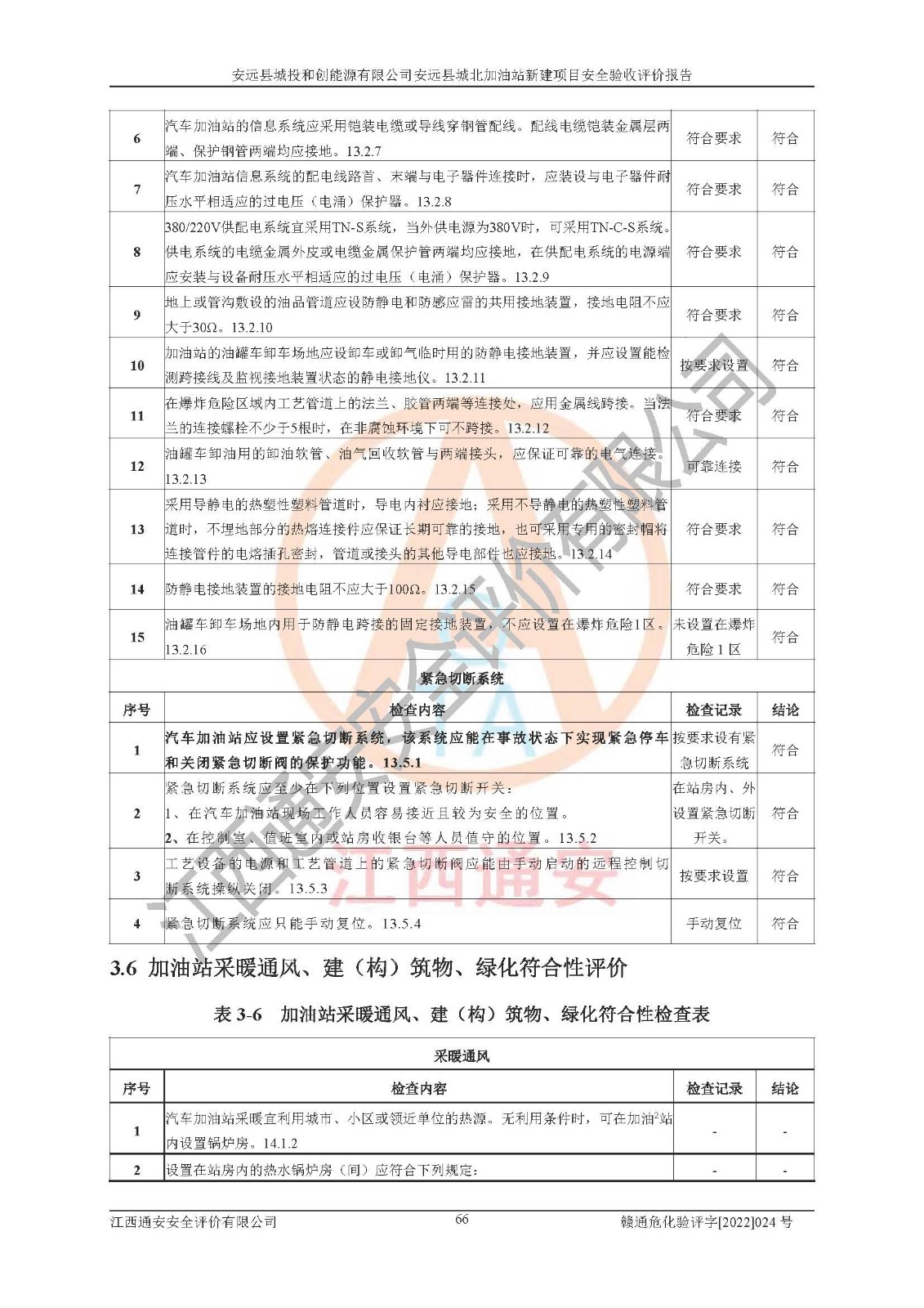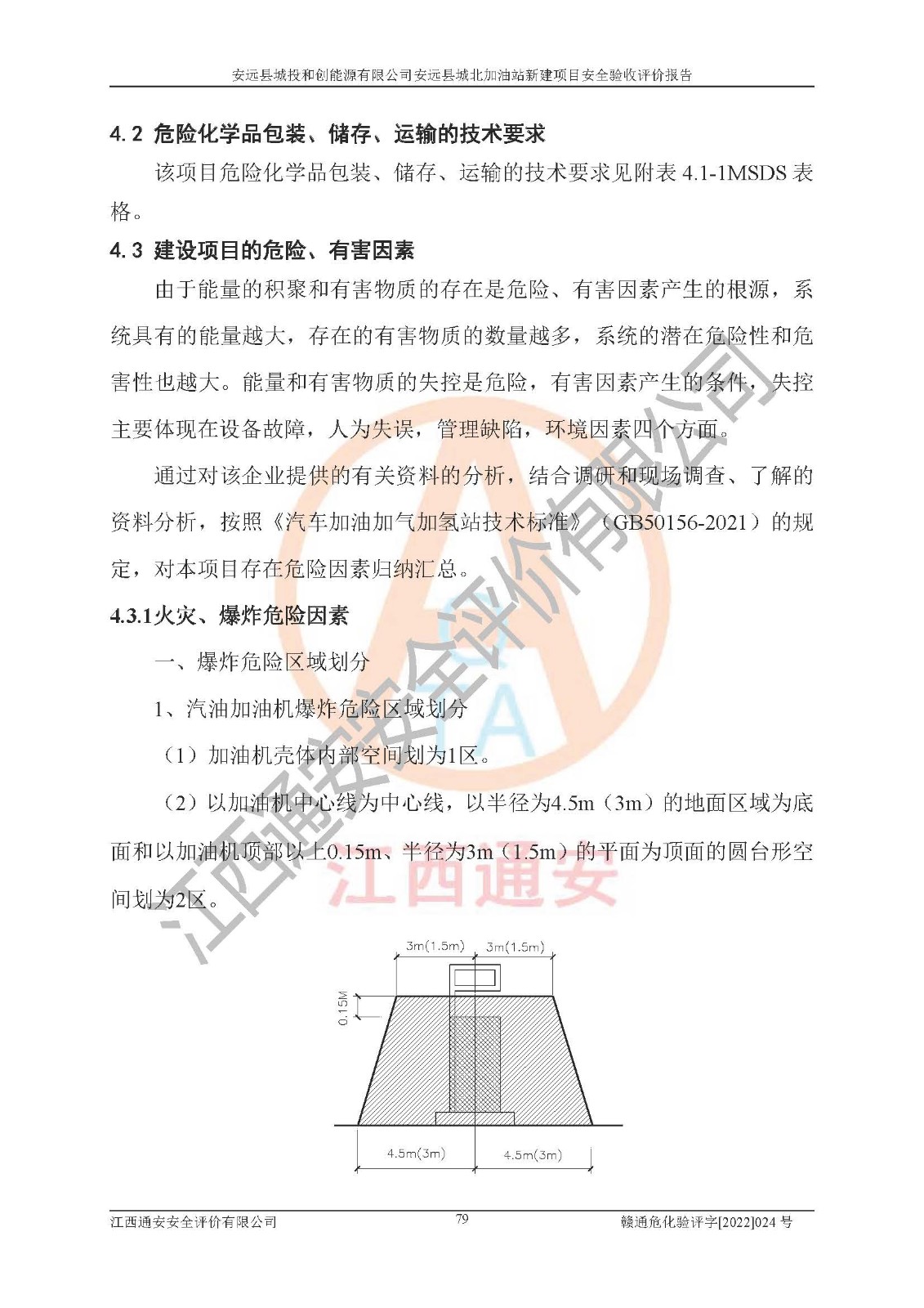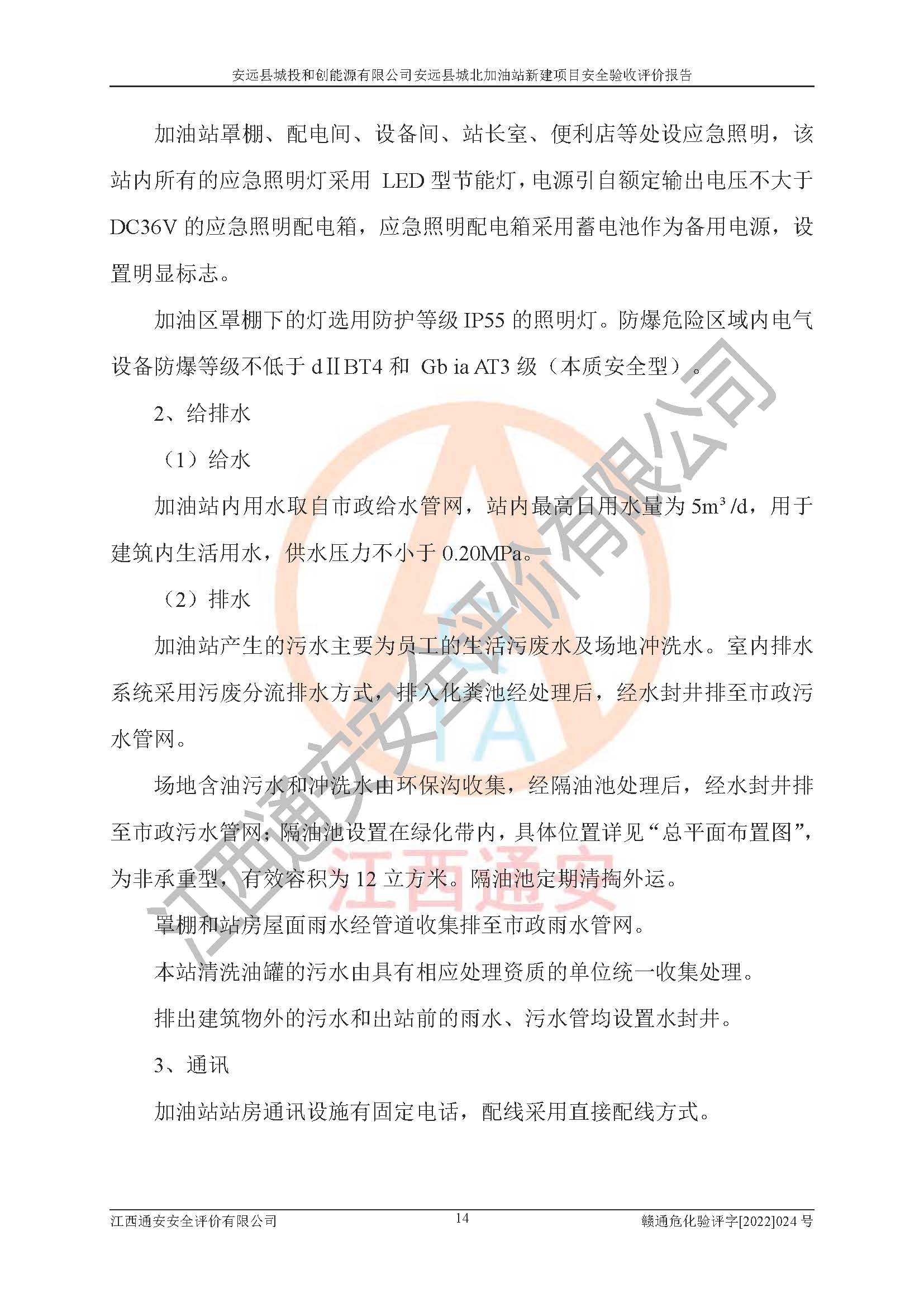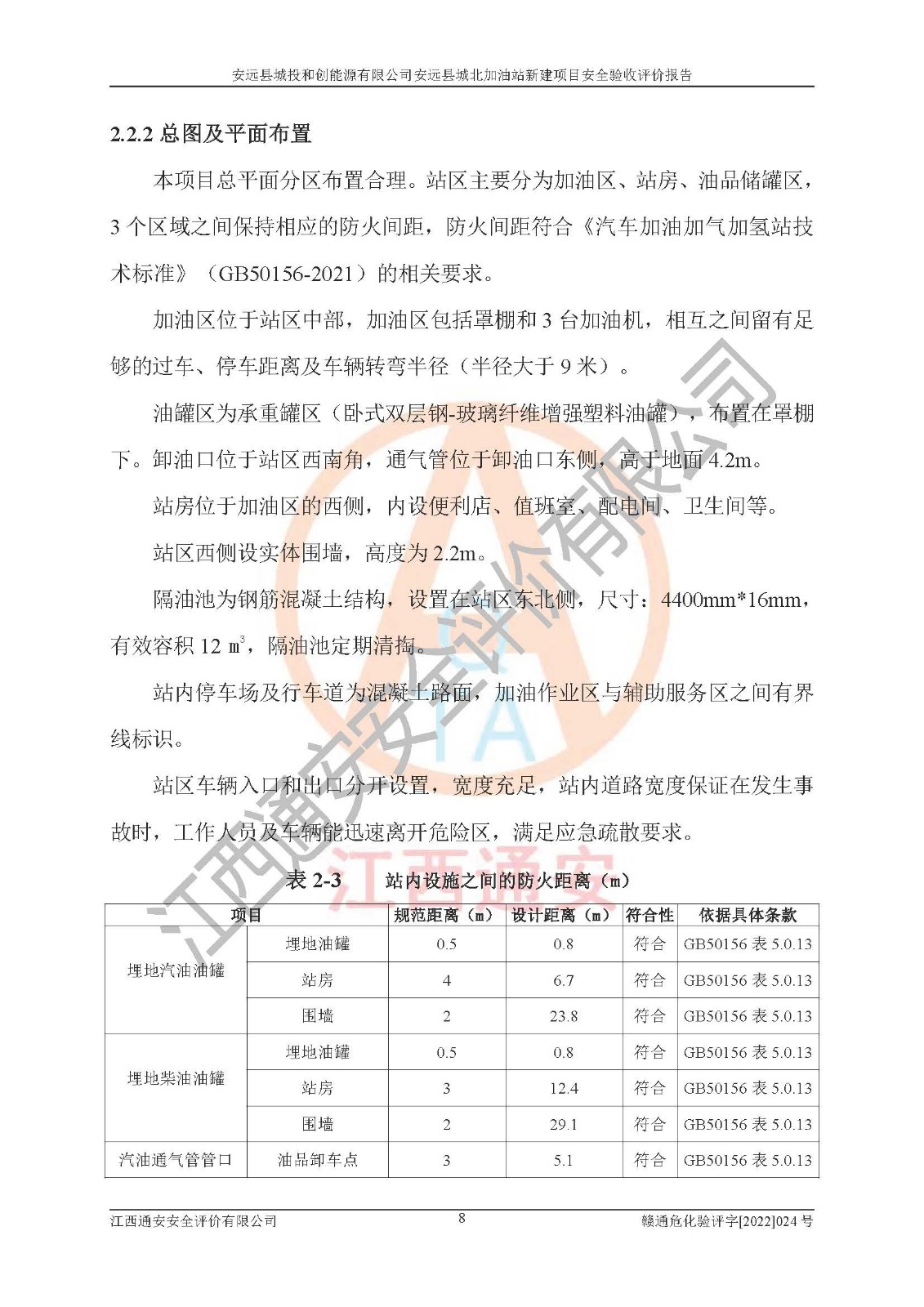 主要任务 | 江西通安安全评价有限公司2022年10月15日组织安全评价人员,对安远县城投和创能源有限公司安远县城北加油站的现场以及提供的资料、文件进行了分析和讨论,对评价人员进行了工作职责分工,并编制了现场安全检查表。在委托方有关管理人员的陪同下,评价人员进行了现场安全设施检验和检查,对安远县城投和创能源有限公司安远县城北加油站的安全设施和技术措施进行符合性和**性进行验证,对安全生产管理状况进行检查,并提出安全生产方面的问题当场与委托方相关人员进行了交流的基础上,依据按照《安全评价通则》(AQ8001-2007)和《安全验收评价导则》(AQ8003-2007)编制了《安远县城投和创能源有限公司安远县城北加油站安全验收报告》。 | ||||