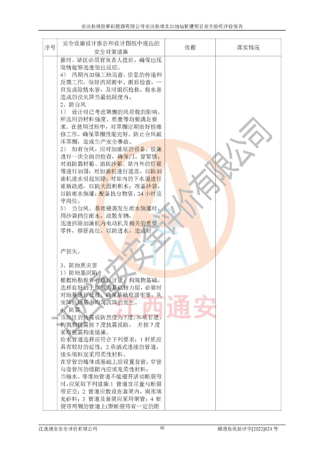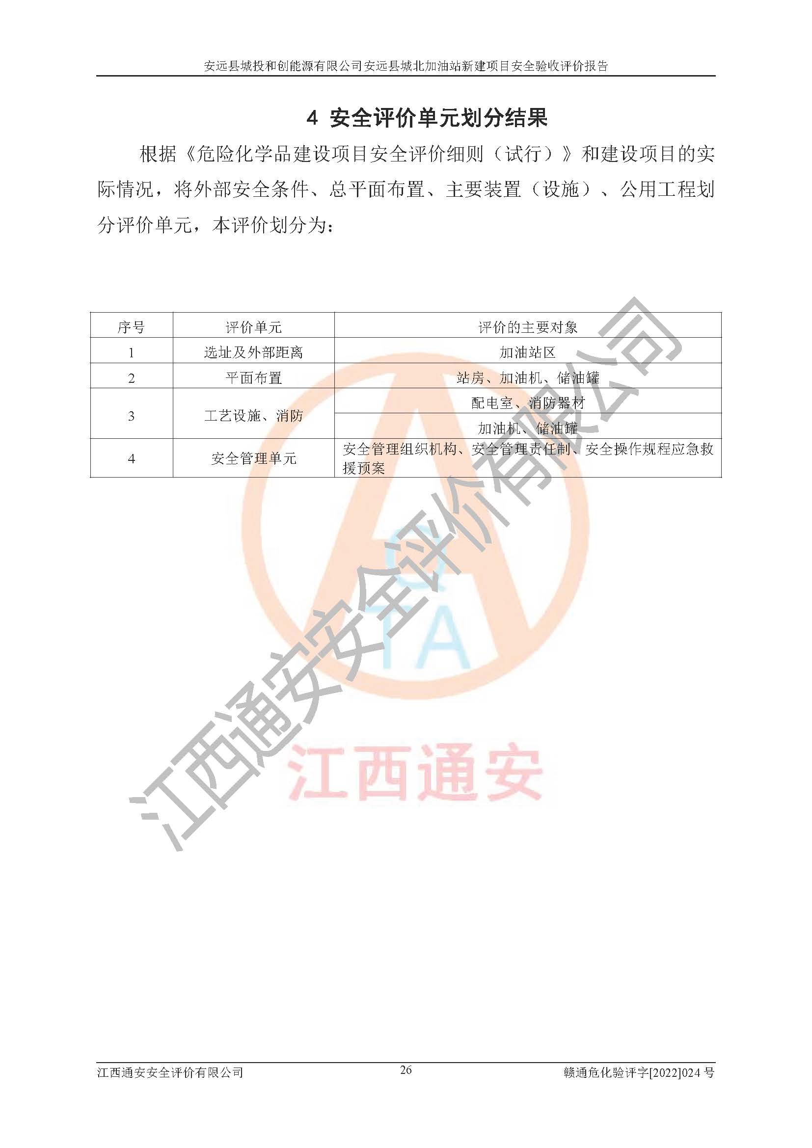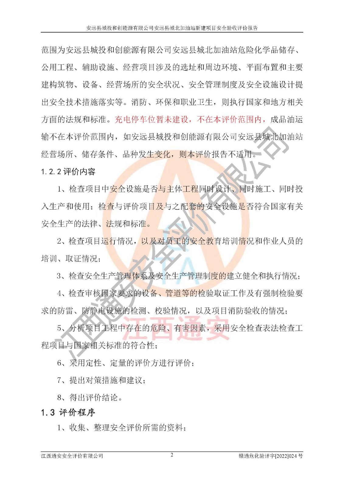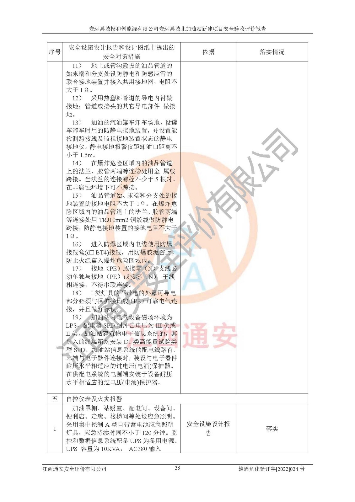 主要任务 | 江西通安安全评价有限公司2022年10月15日组织安全评价人员,对安远县城投和创能源有限公司安远县城北加油站的现场以及提供的资料、文件进行了分析和讨论,对评价人员进行了工作职责分工,并编制了现场安全检查表。在委托方有关管理人员的陪同下,评价人员进行了现场安全设施检验和检查,对安远县城投和创能源有限公司安远县城北加油站的安全设施和技术措施进行符合性和**性进行验证,对安全生产管理状况进行检查,并提出安全生产方面的问题当场与委托方相关人员进行了交流的基础上,依据按照《安全评价通则》(AQ8001-2007)和《安全验收评价导则》(AQ8003-2007)编制了《安远县城投和创能源有限公司安远县城北加油站安全验收报告》。 | ||||