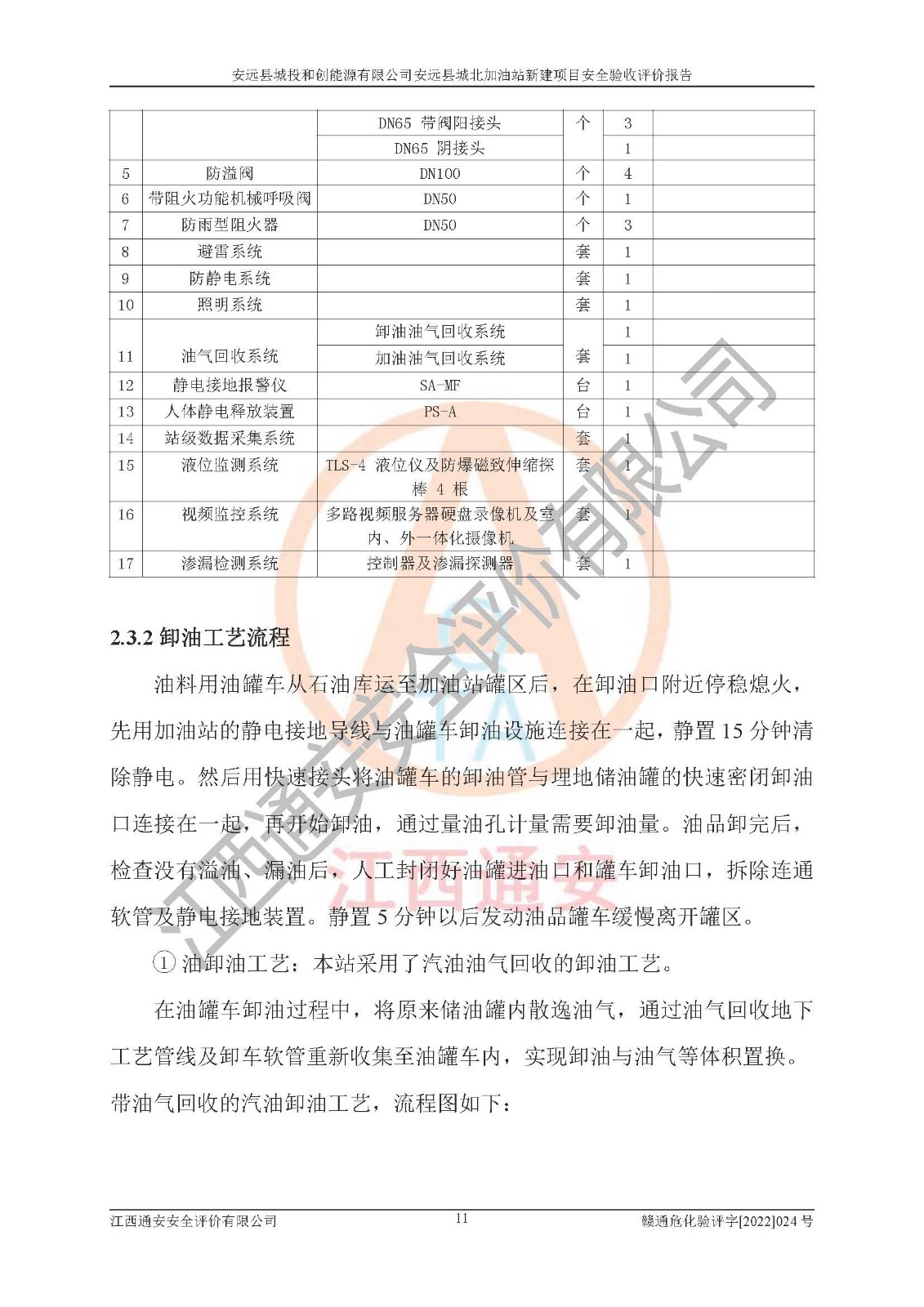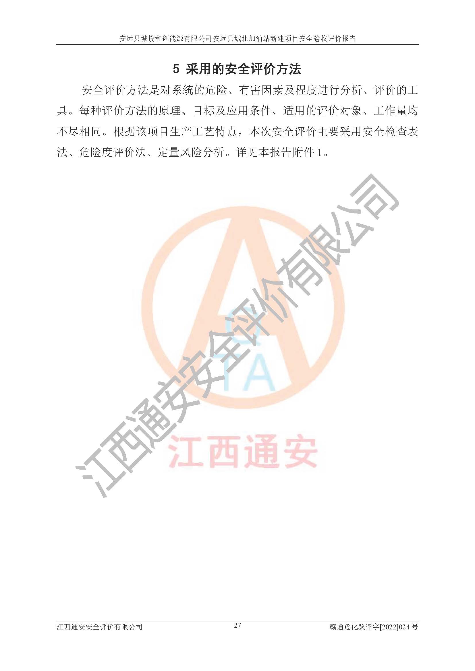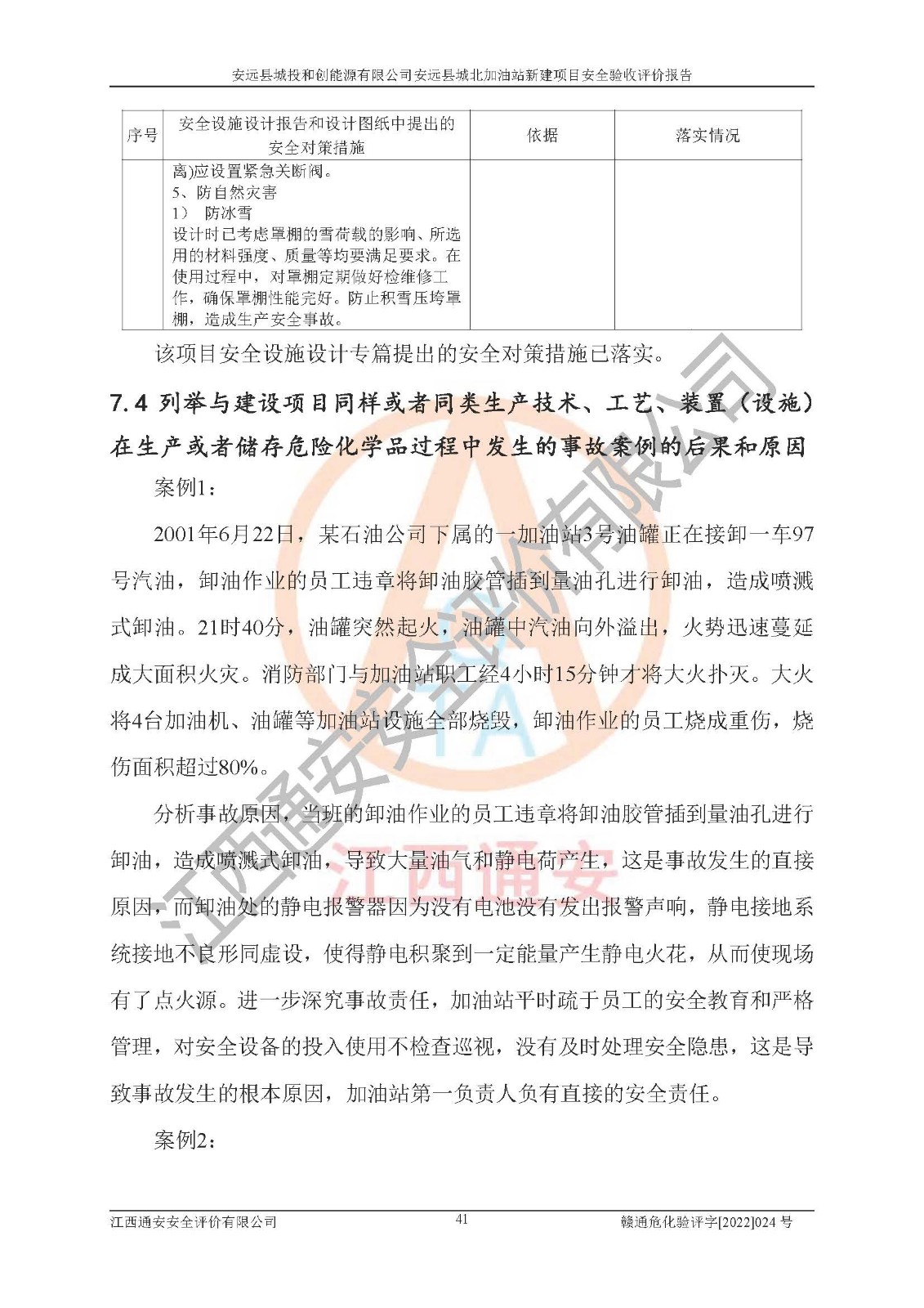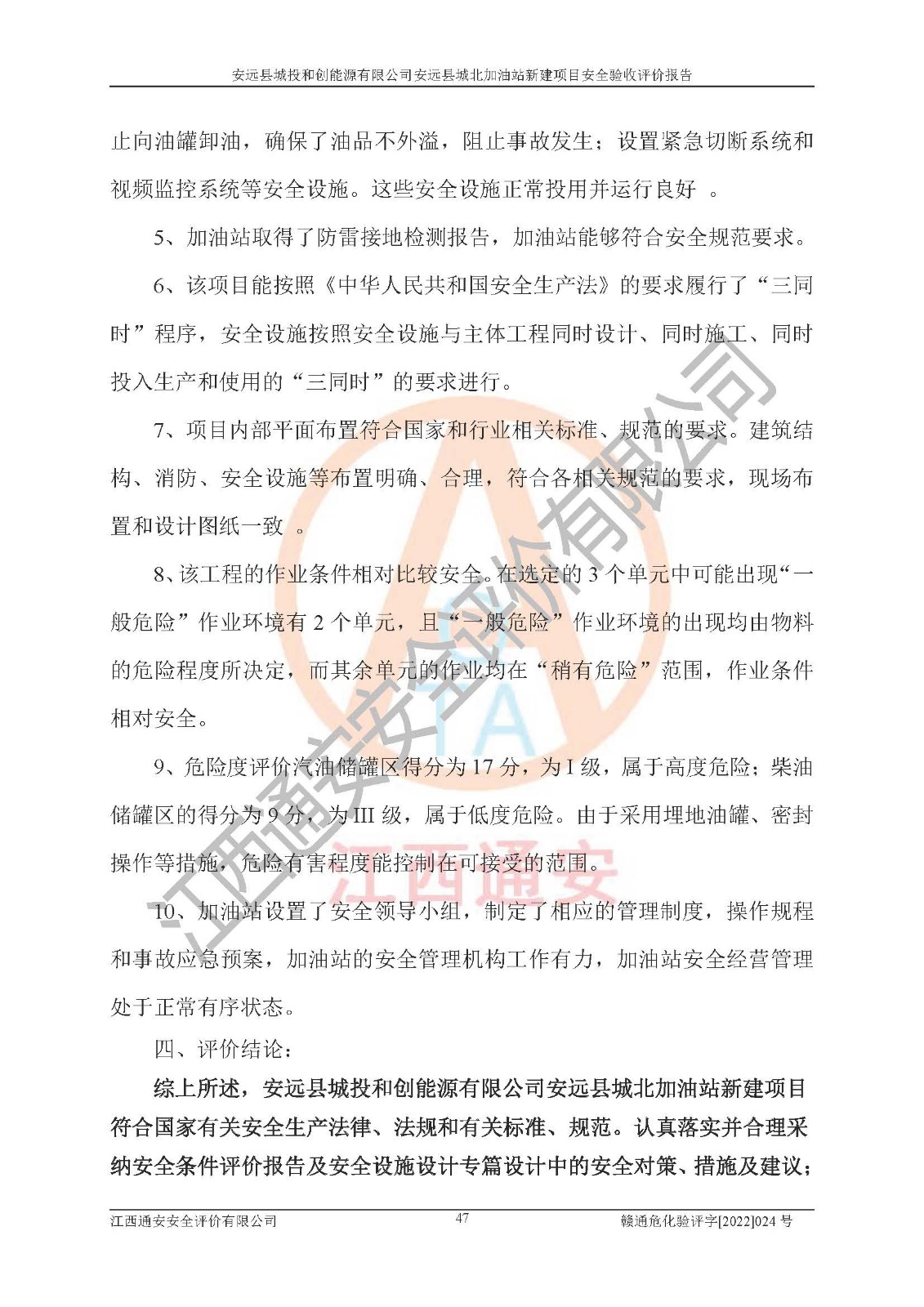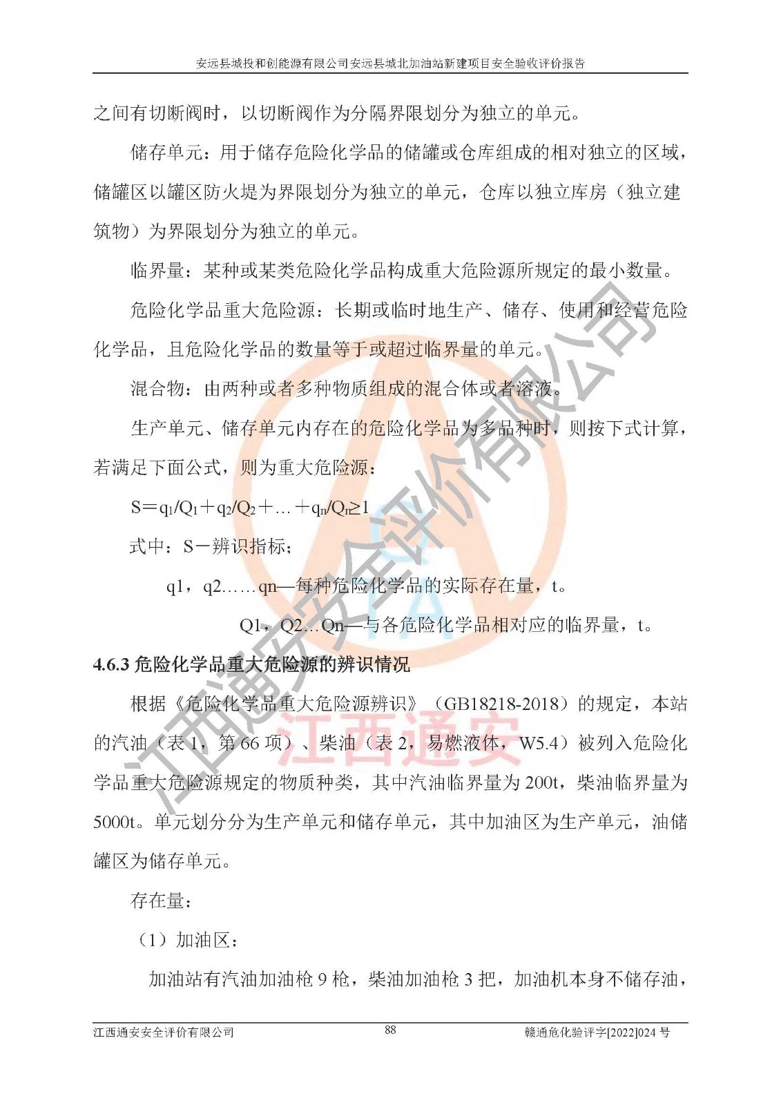 主要任务 | 江西通安安全评价有限公司2022年10月15日组织安全评价人员,对安远县城投和创能源有限公司安远县城北加油站的现场以及提供的资料、文件进行了分析和讨论,对评价人员进行了工作职责分工,并编制了现场安全检查表。在委托方有关管理人员的陪同下,评价人员进行了现场安全设施检验和检查,对安远县城投和创能源有限公司安远县城北加油站的安全设施和技术措施进行符合性和**性进行验证,对安全生产管理状况进行检查,并提出安全生产方面的问题当场与委托方相关人员进行了交流的基础上,依据按照《安全评价通则》(AQ8001-2007)和《安全验收评价导则》(AQ8003-2007)编制了《安远县城投和创能源有限公司安远县城北加油站安全验收报告》。 | ||||