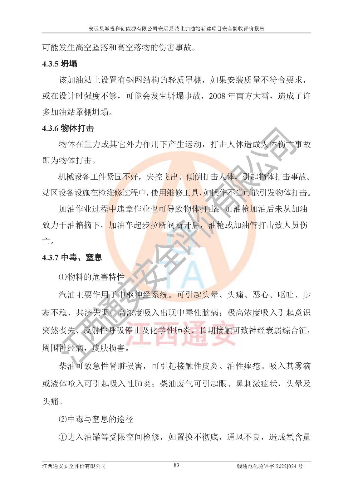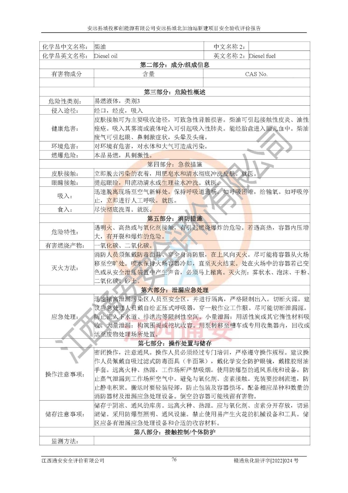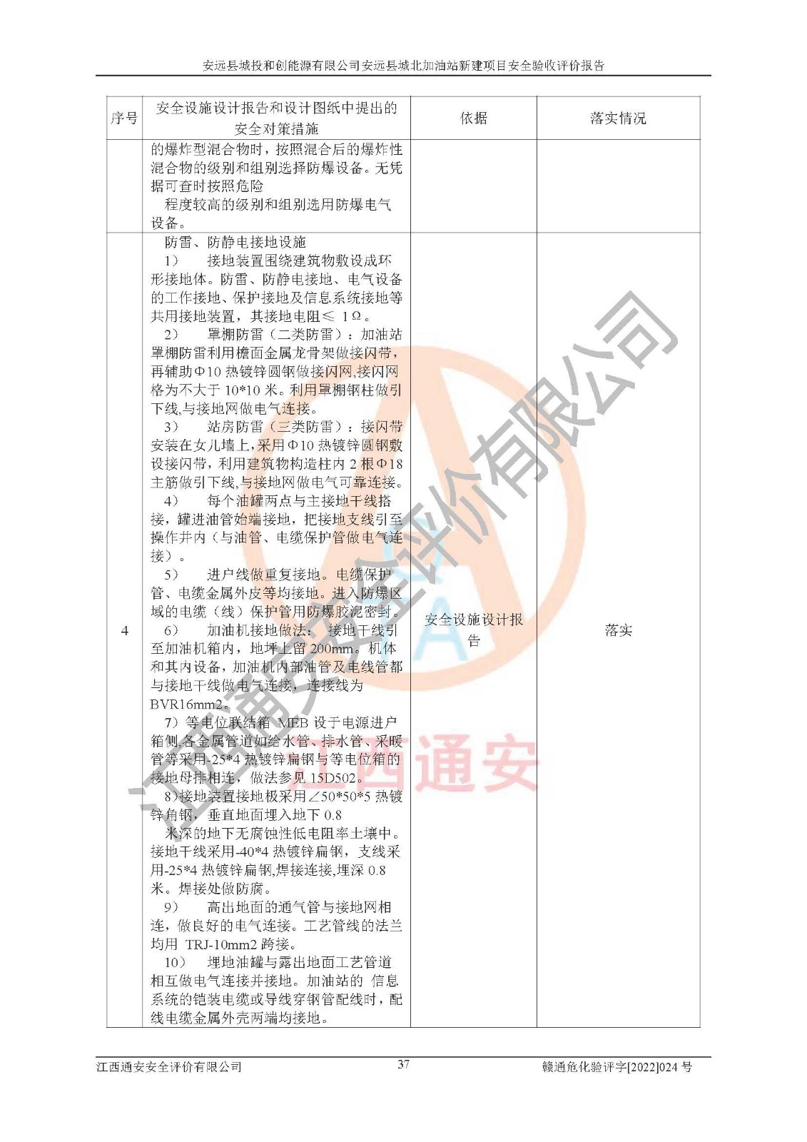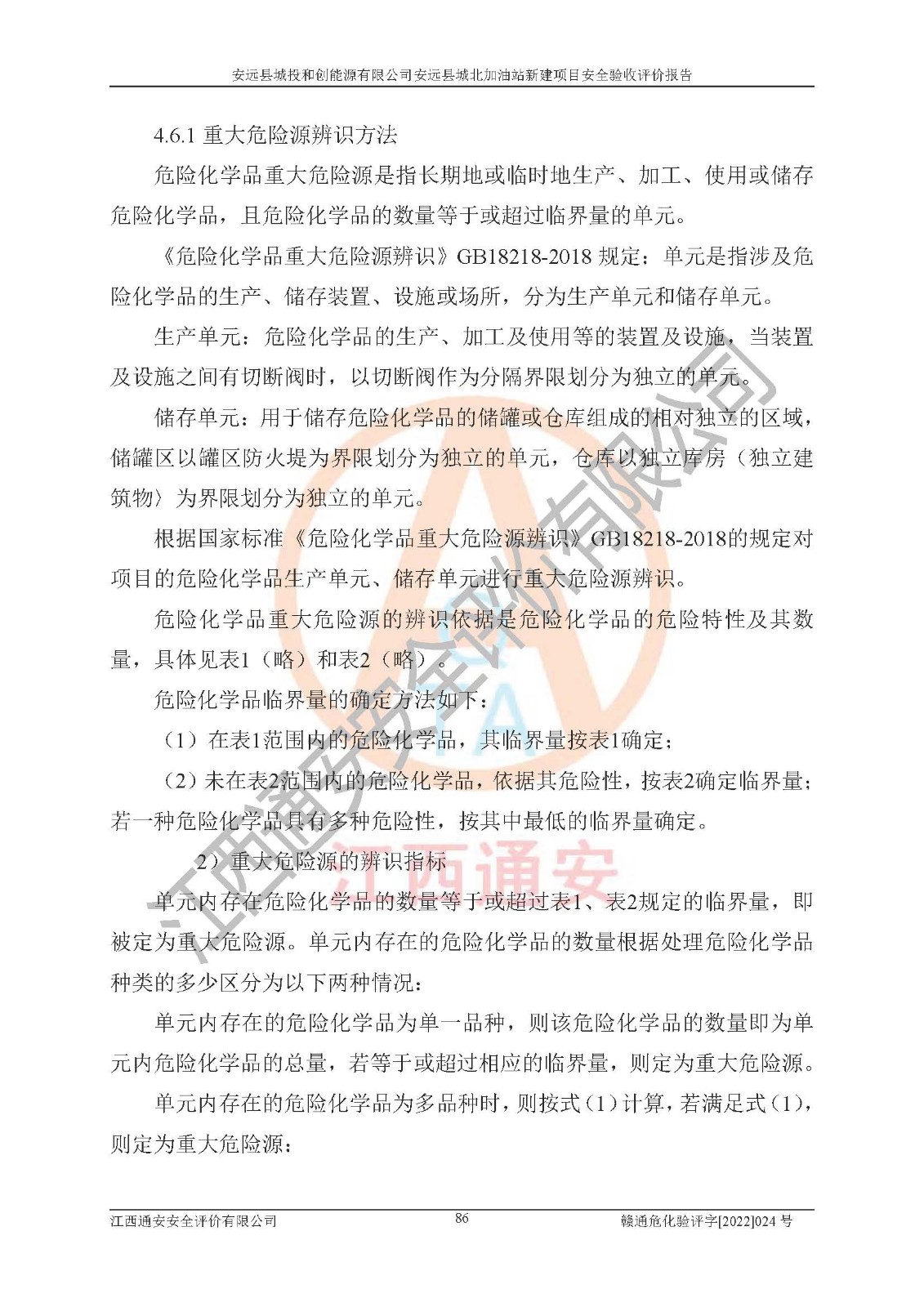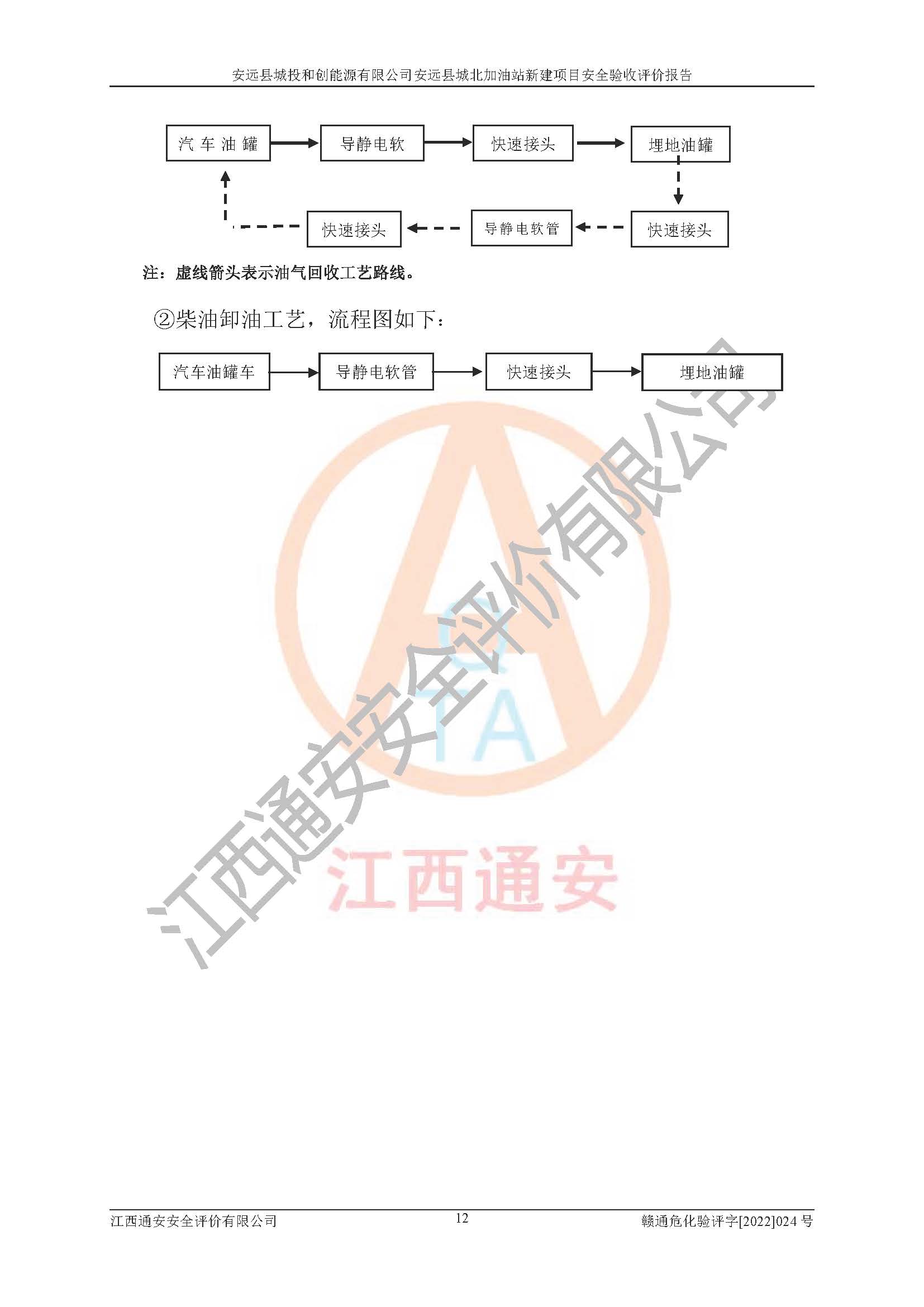 主要任务 | 江西通安安全评价有限公司2022年10月15日组织安全评价人员,对安远县城投和创能源有限公司安远县城北加油站的现场以及提供的资料、文件进行了分析和讨论,对评价人员进行了工作职责分工,并编制了现场安全检查表。在委托方有关管理人员的陪同下,评价人员进行了现场安全设施检验和检查,对安远县城投和创能源有限公司安远县城北加油站的安全设施和技术措施进行符合性和**性进行验证,对安全生产管理状况进行检查,并提出安全生产方面的问题当场与委托方相关人员进行了交流的基础上,依据按照《安全评价通则》(AQ8001-2007)和《安全验收评价导则》(AQ8003-2007)编制了《安远县城投和创能源有限公司安远县城北加油站安全验收报告》。 | ||||