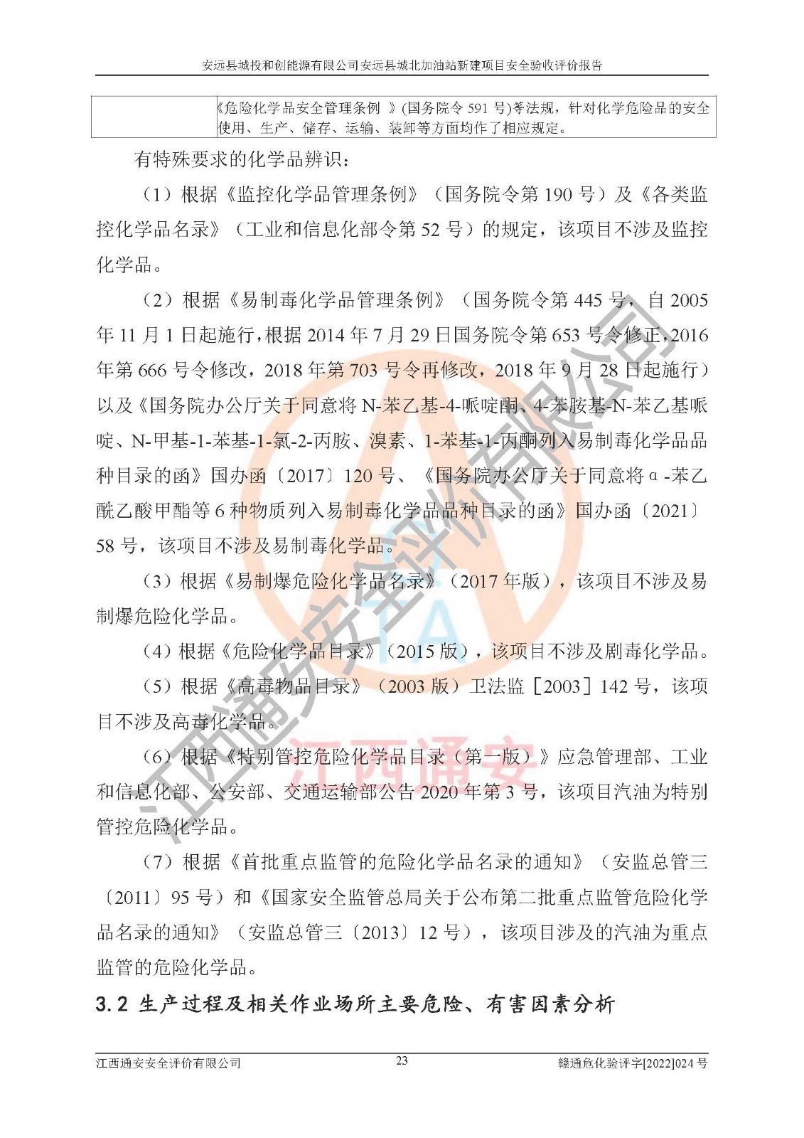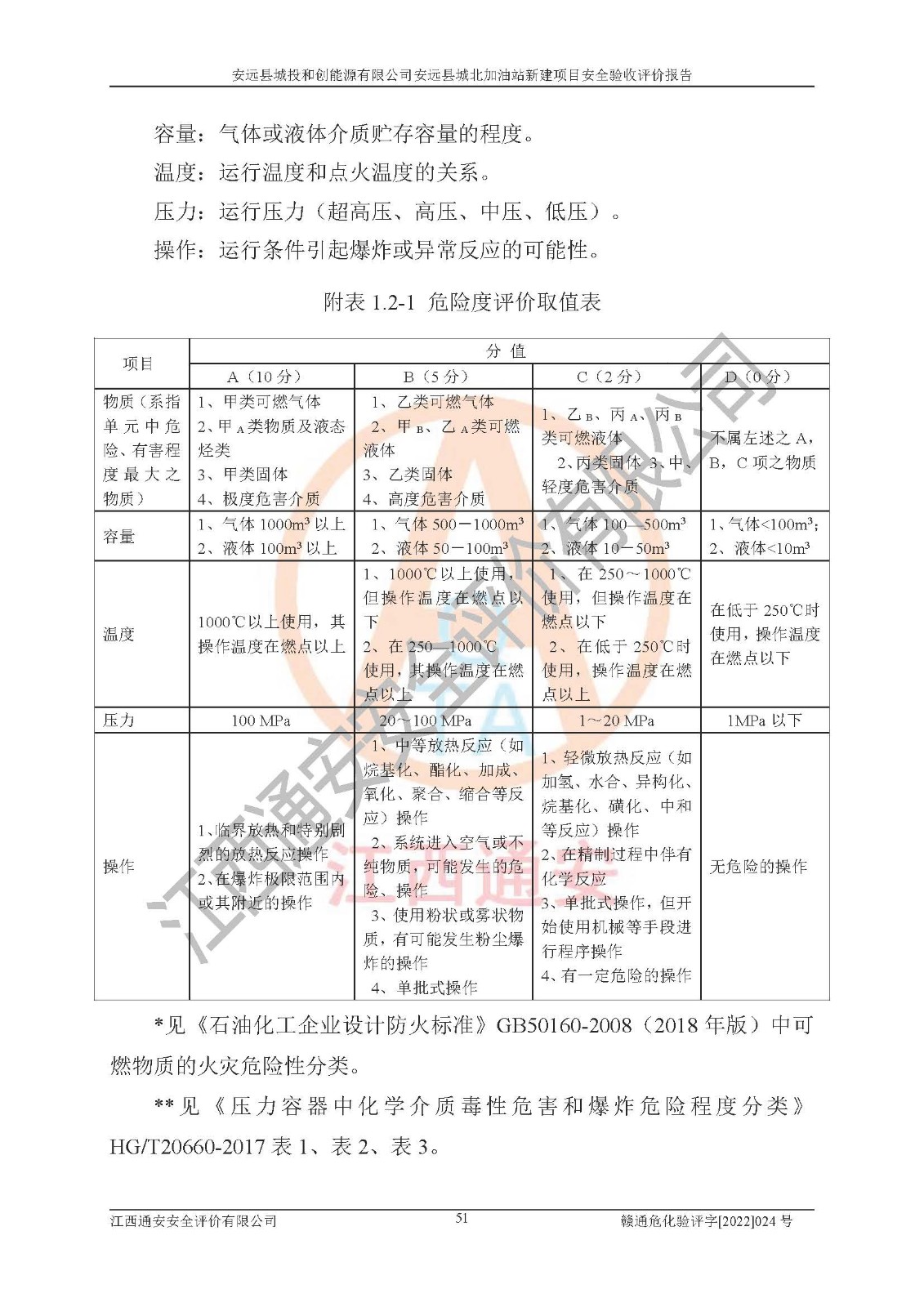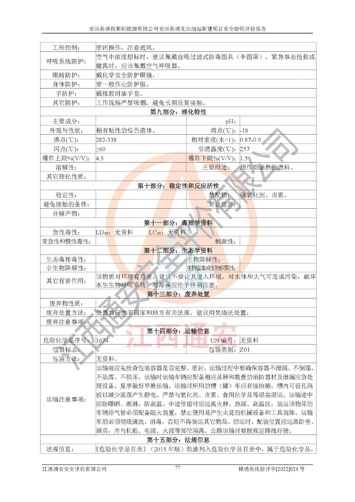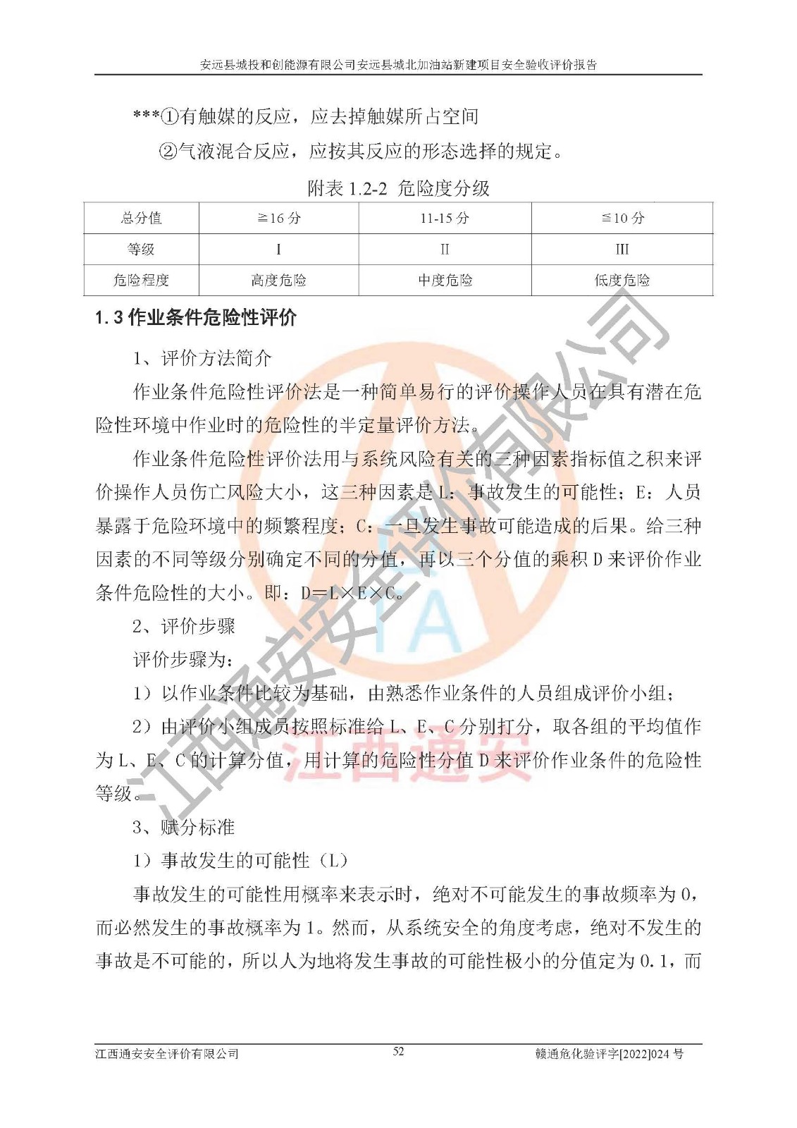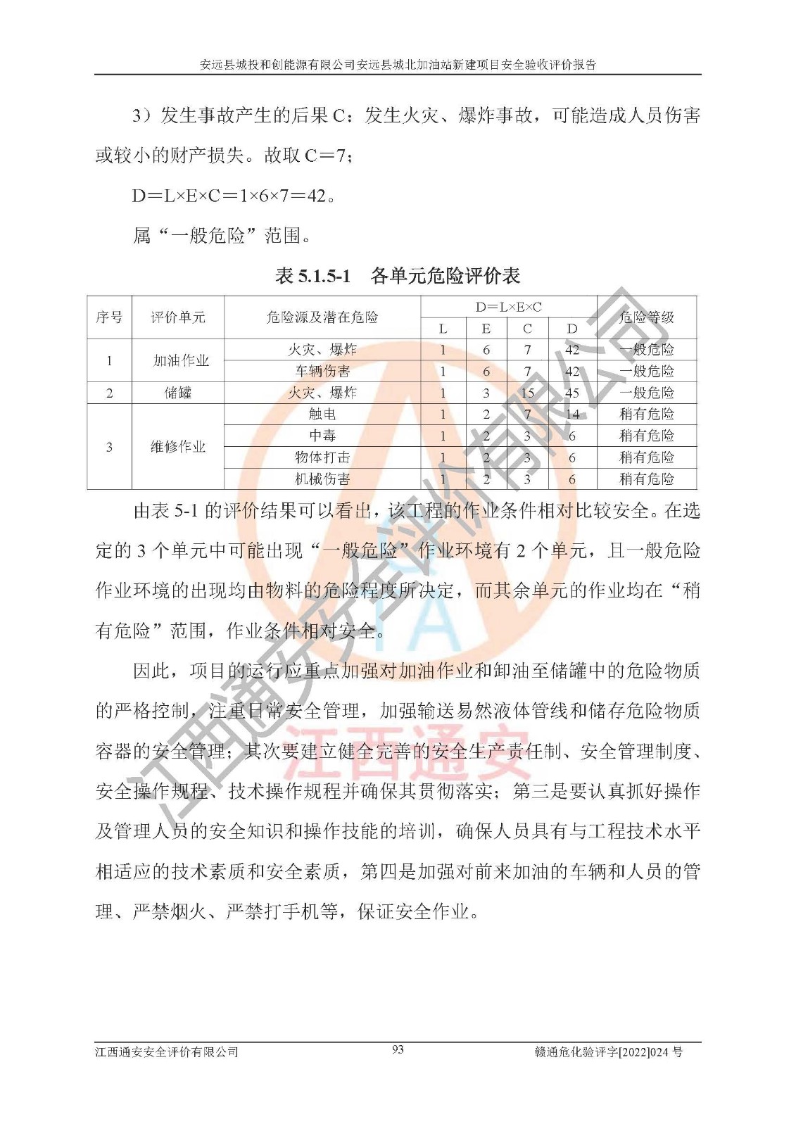 主要任务 | 江西通安安全评价有限公司2022年10月15日组织安全评价人员,对安远县城投和创能源有限公司安远县城北加油站的现场以及提供的资料、文件进行了分析和讨论,对评价人员进行了工作职责分工,并编制了现场安全检查表。在委托方有关管理人员的陪同下,评价人员进行了现场安全设施检验和检查,对安远县城投和创能源有限公司安远县城北加油站的安全设施和技术措施进行符合性和**性进行验证,对安全生产管理状况进行检查,并提出安全生产方面的问题当场与委托方相关人员进行了交流的基础上,依据按照《安全评价通则》(AQ8001-2007)和《安全验收评价导则》(AQ8003-2007)编制了《安远县城投和创能源有限公司安远县城北加油站安全验收报告》。 | ||||