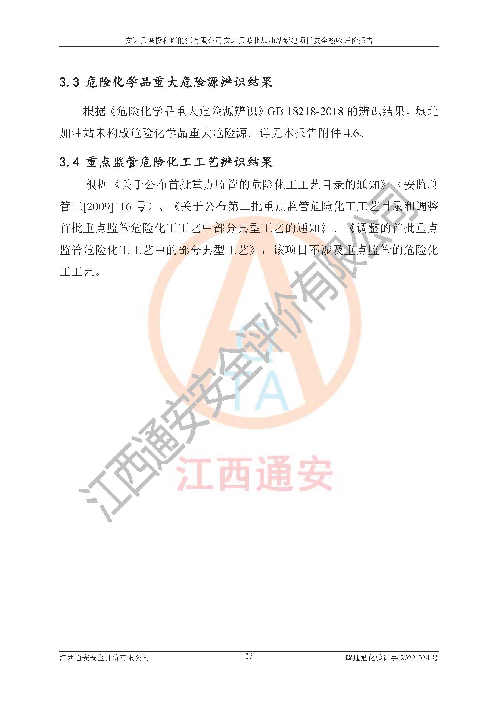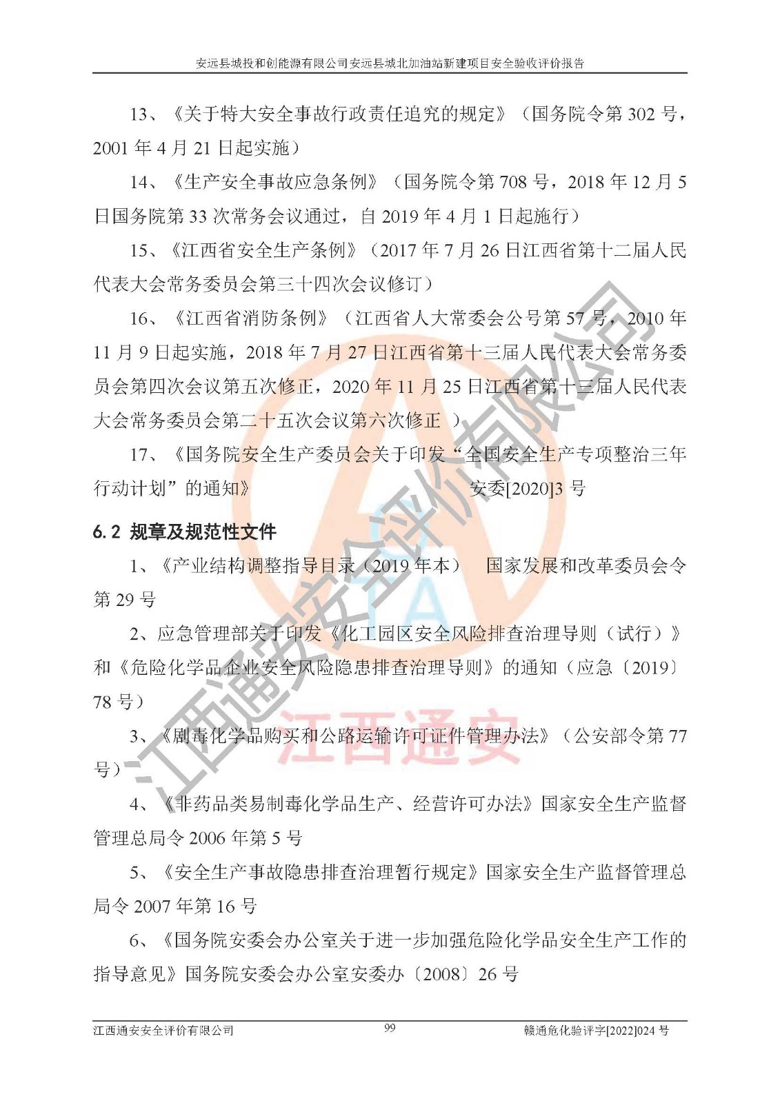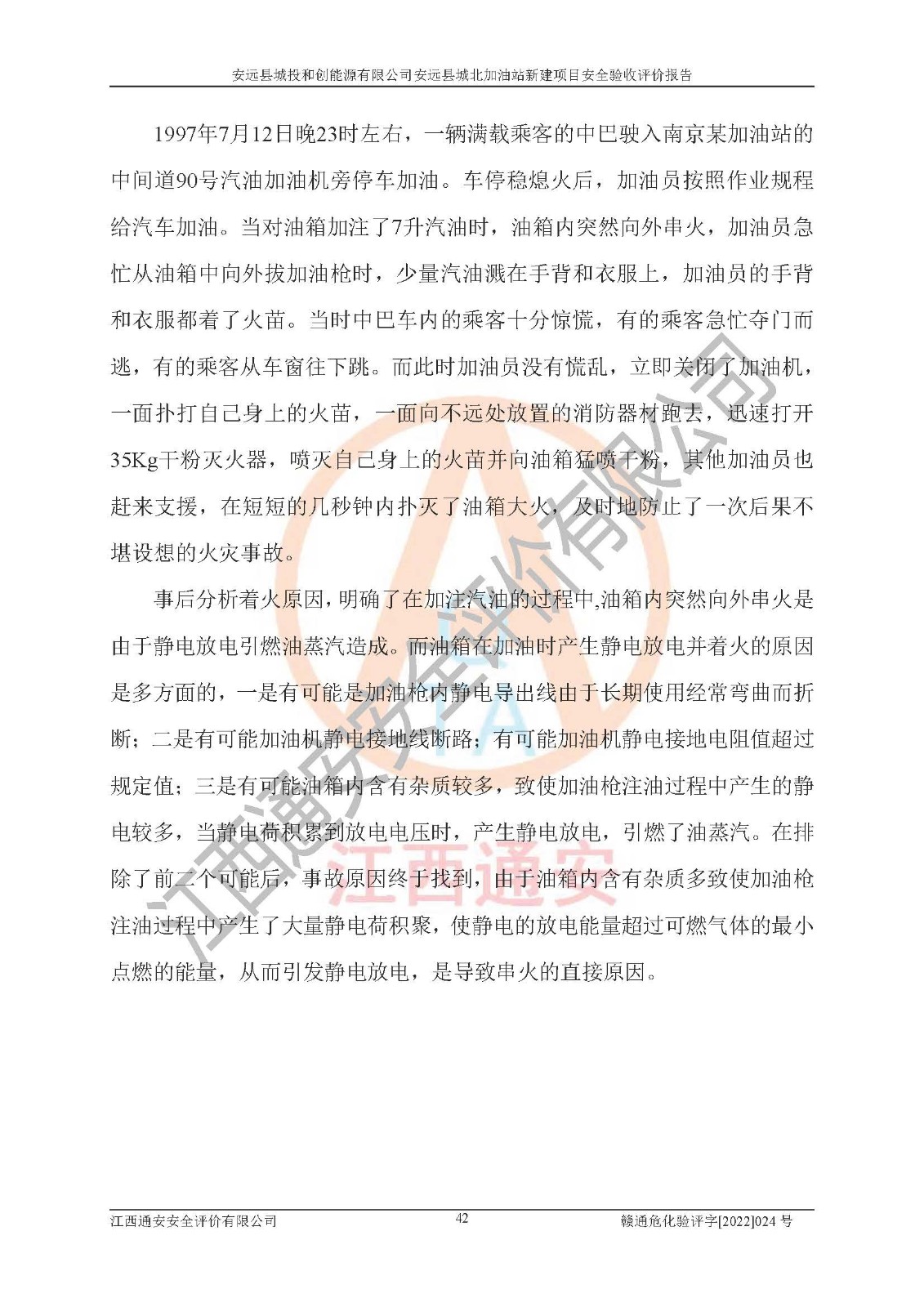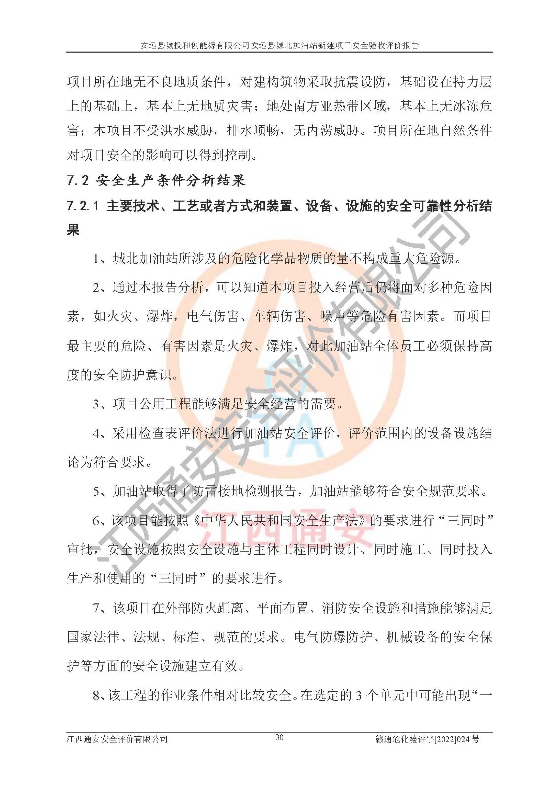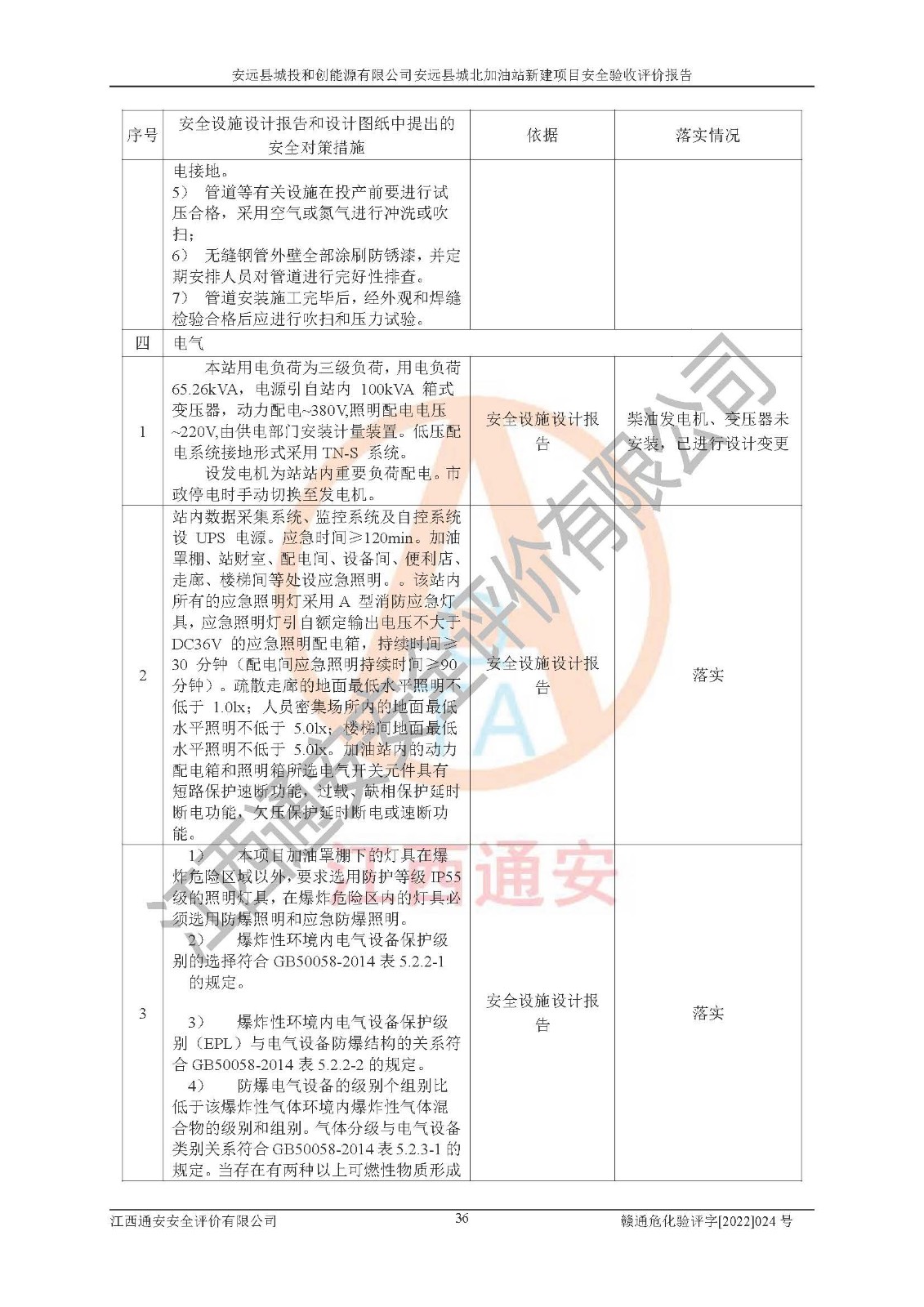 主要任务 | 江西通安安全评价有限公司2022年10月15日组织安全评价人员,对安远县城投和创能源有限公司安远县城北加油站的现场以及提供的资料、文件进行了分析和讨论,对评价人员进行了工作职责分工,并编制了现场安全检查表。在委托方有关管理人员的陪同下,评价人员进行了现场安全设施检验和检查,对安远县城投和创能源有限公司安远县城北加油站的安全设施和技术措施进行符合性和**性进行验证,对安全生产管理状况进行检查,并提出安全生产方面的问题当场与委托方相关人员进行了交流的基础上,依据按照《安全评价通则》(AQ8001-2007)和《安全验收评价导则》(AQ8003-2007)编制了《安远县城投和创能源有限公司安远县城北加油站安全验收报告》。 | ||||