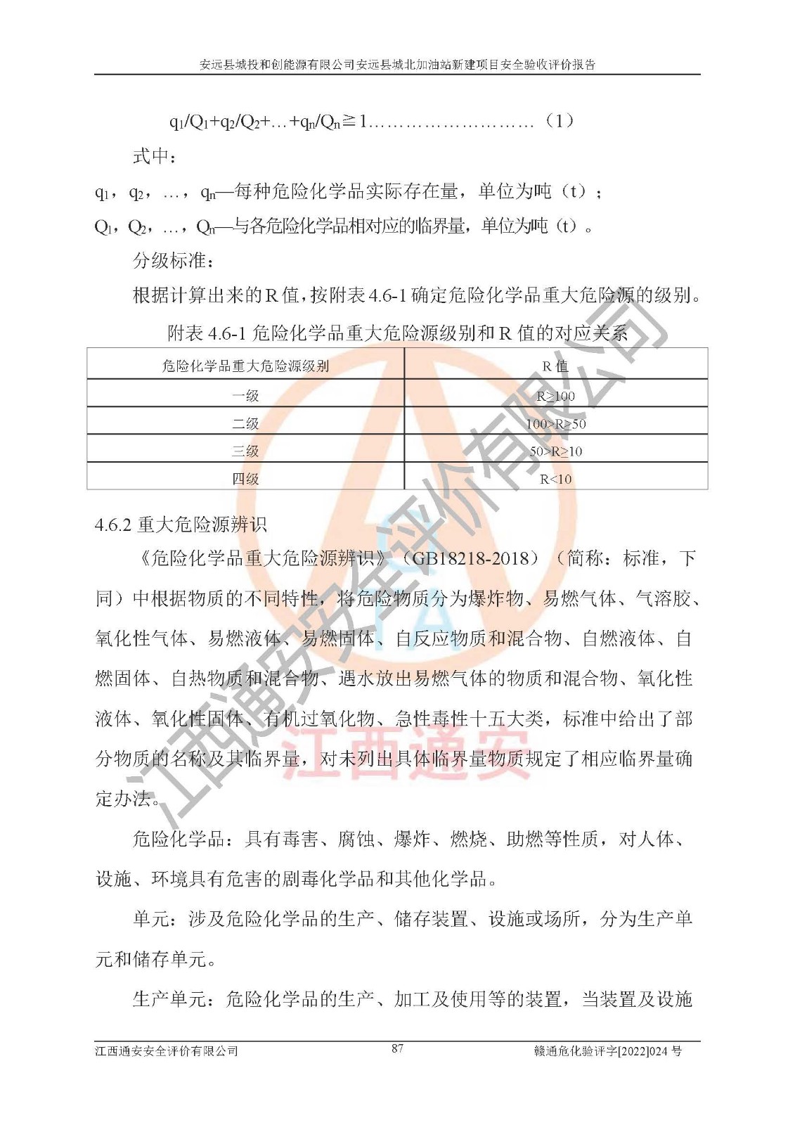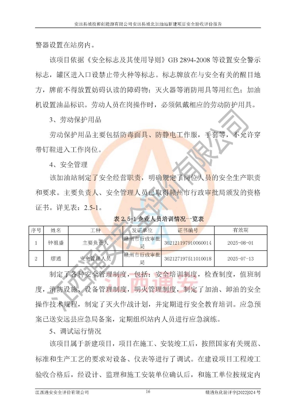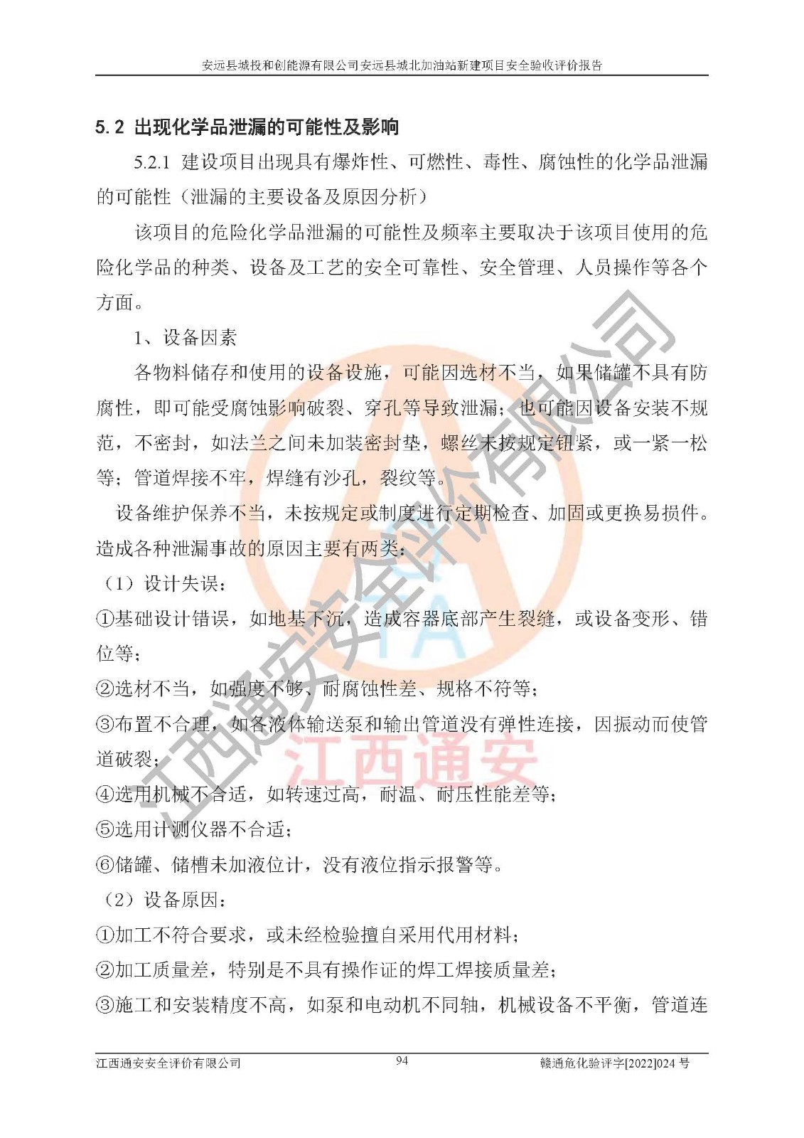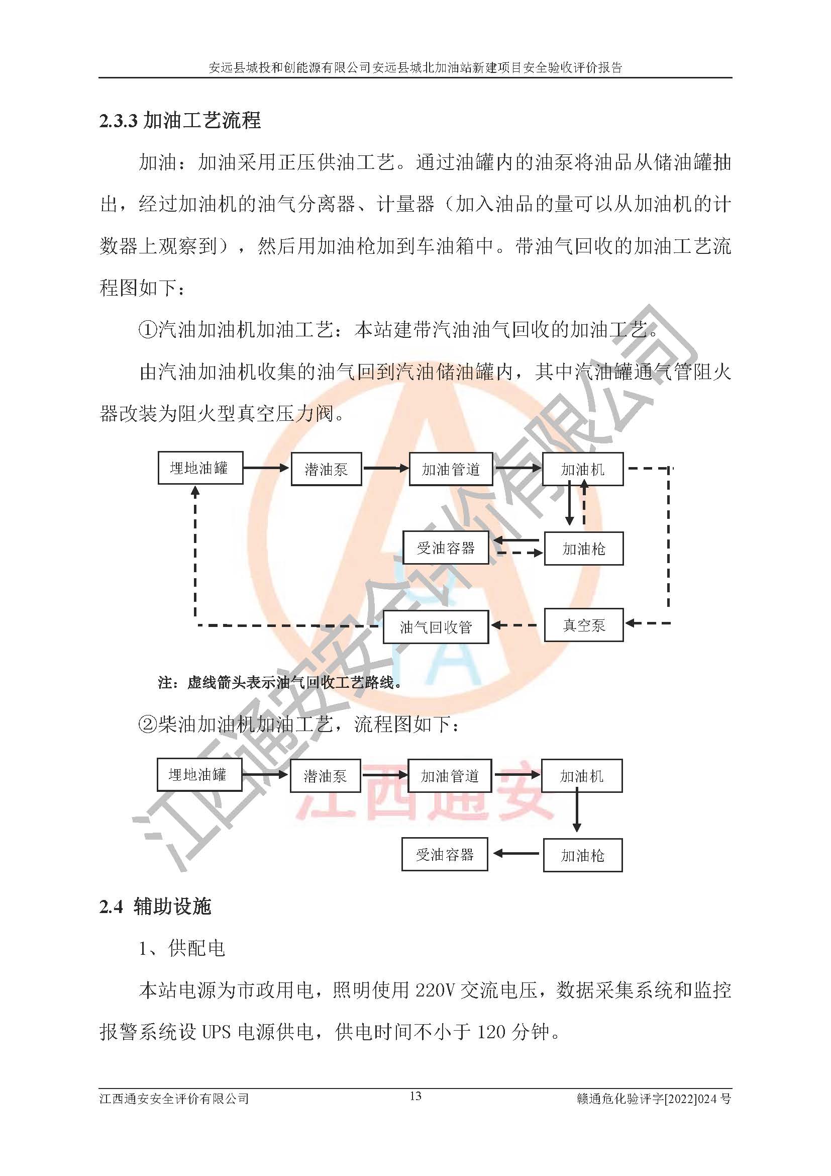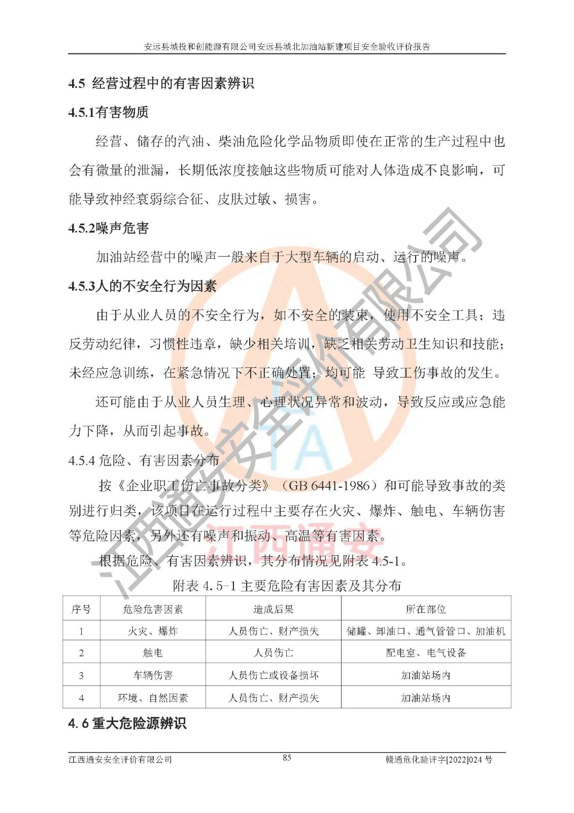 主要任务 | 江西通安安全评价有限公司2022年10月15日组织安全评价人员,对安远县城投和创能源有限公司安远县城北加油站的现场以及提供的资料、文件进行了分析和讨论,对评价人员进行了工作职责分工,并编制了现场安全检查表。在委托方有关管理人员的陪同下,评价人员进行了现场安全设施检验和检查,对安远县城投和创能源有限公司安远县城北加油站的安全设施和技术措施进行符合性和**性进行验证,对安全生产管理状况进行检查,并提出安全生产方面的问题当场与委托方相关人员进行了交流的基础上,依据按照《安全评价通则》(AQ8001-2007)和《安全验收评价导则》(AQ8003-2007)编制了《安远县城投和创能源有限公司安远县城北加油站安全验收报告》。 | ||||