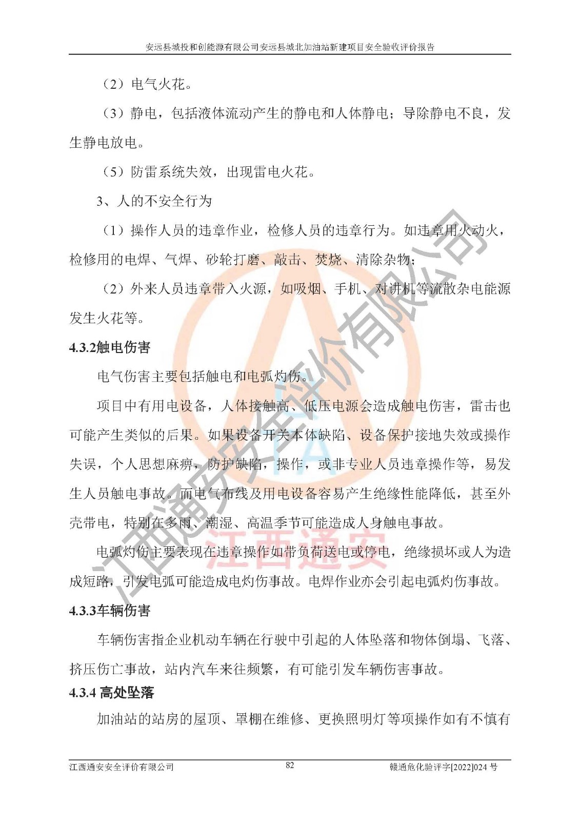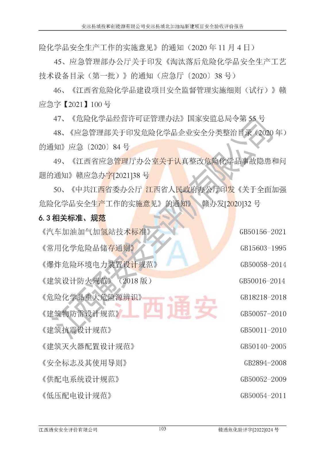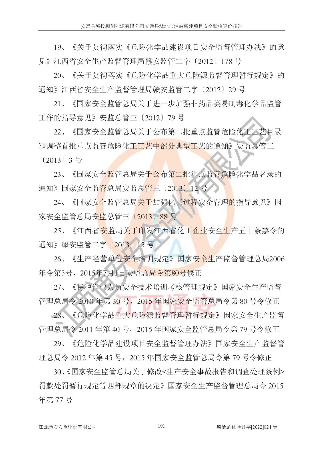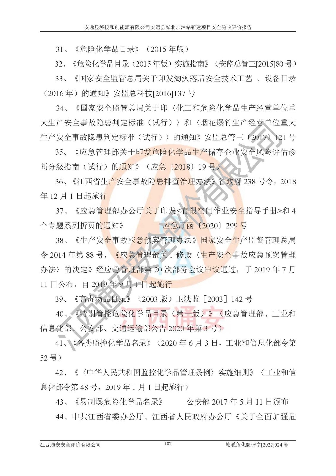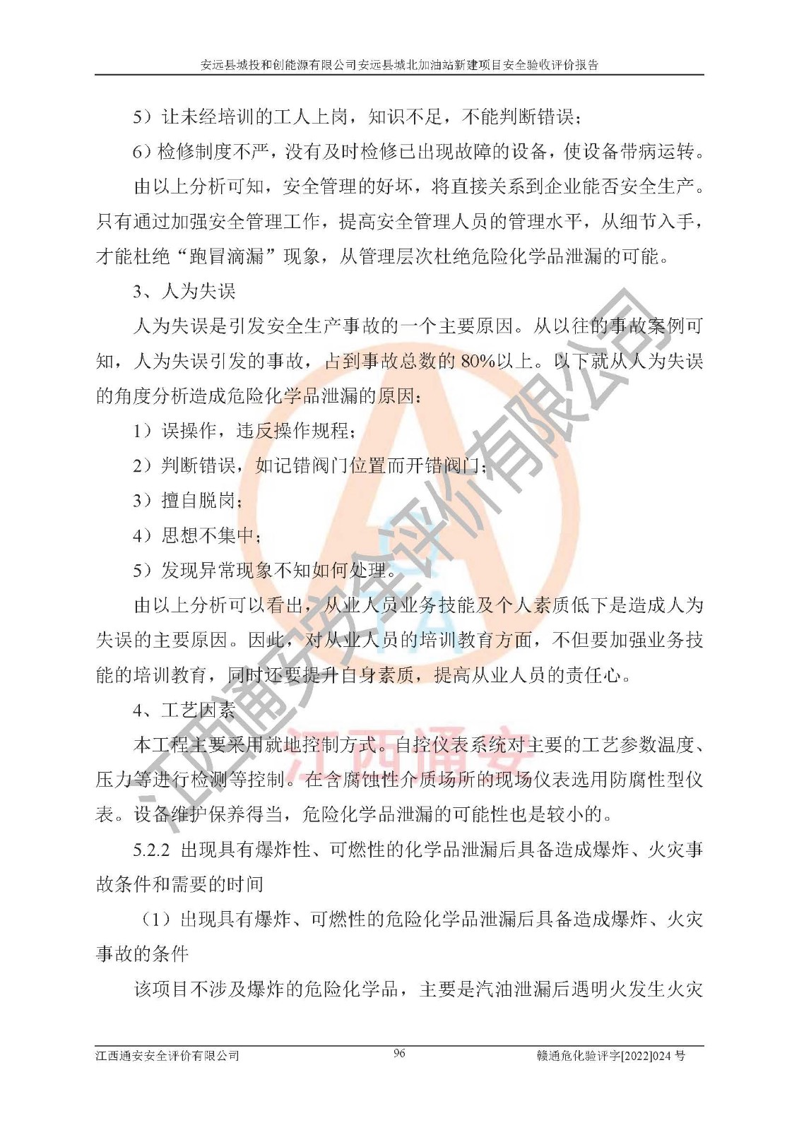 主要任务 | 江西通安安全评价有限公司2022年10月15日组织安全评价人员,对安远县城投和创能源有限公司安远县城北加油站的现场以及提供的资料、文件进行了分析和讨论,对评价人员进行了工作职责分工,并编制了现场安全检查表。在委托方有关管理人员的陪同下,评价人员进行了现场安全设施检验和检查,对安远县城投和创能源有限公司安远县城北加油站的安全设施和技术措施进行符合性和**性进行验证,对安全生产管理状况进行检查,并提出安全生产方面的问题当场与委托方相关人员进行了交流的基础上,依据按照《安全评价通则》(AQ8001-2007)和《安全验收评价导则》(AQ8003-2007)编制了《安远县城投和创能源有限公司安远县城北加油站安全验收报告》。 | ||||