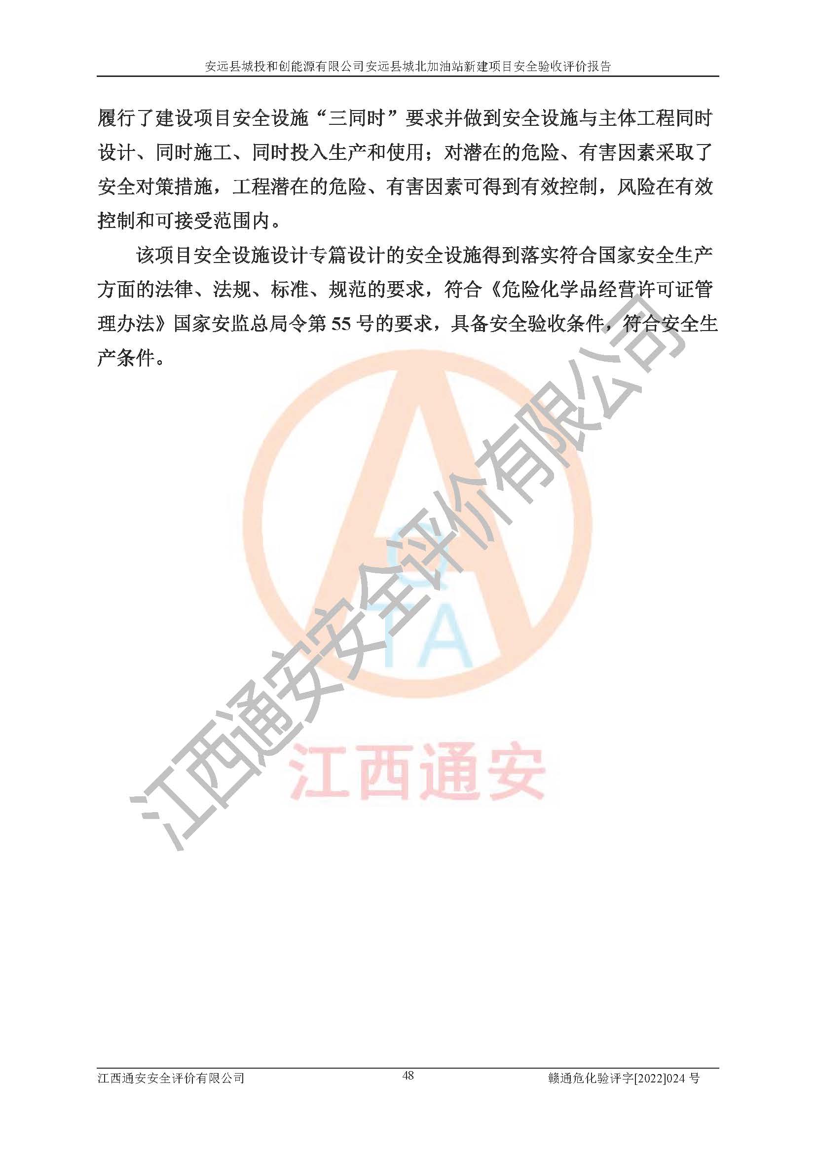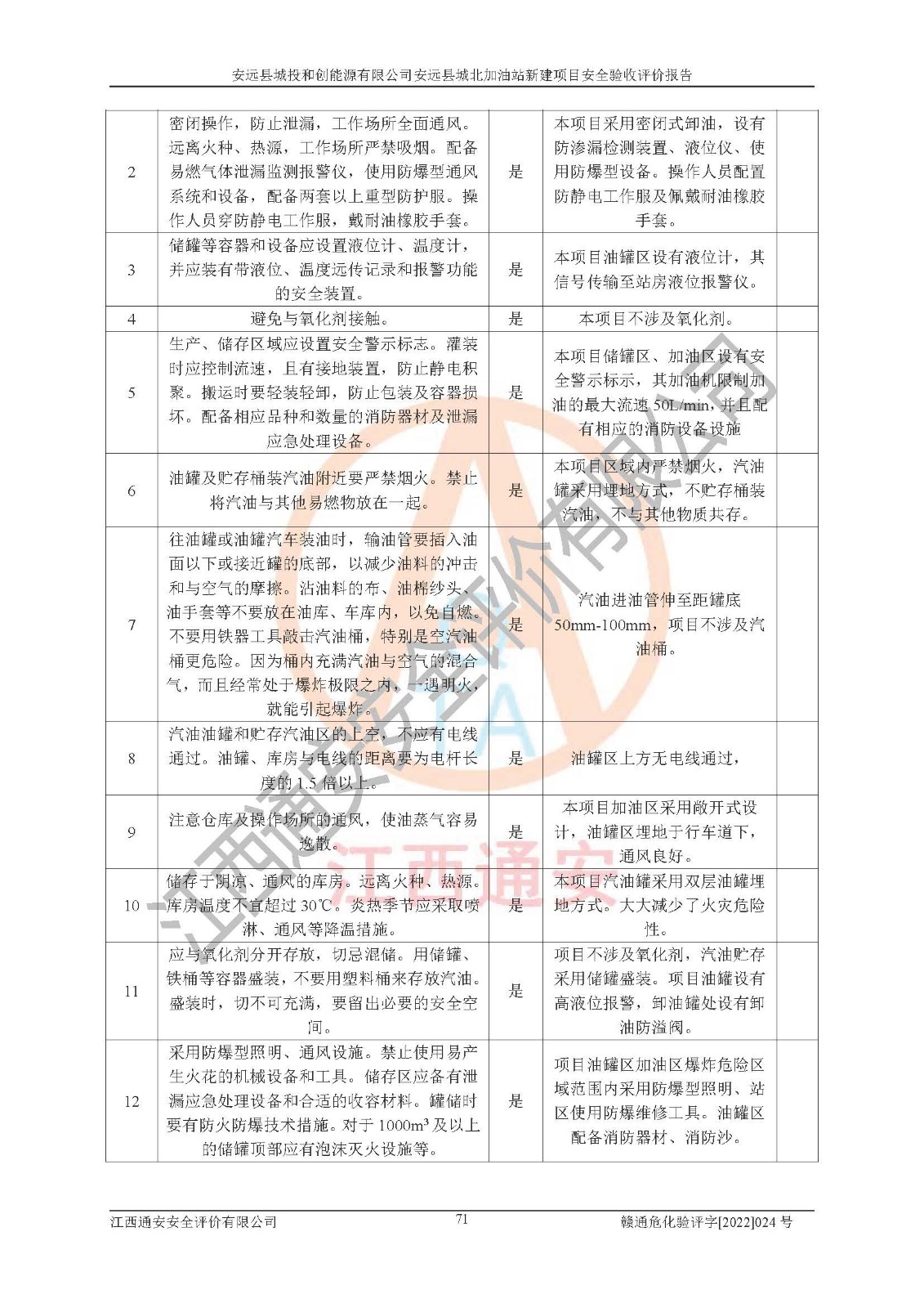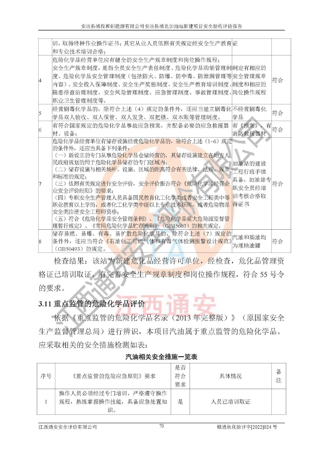 其它 | 安远县城投和创能源有限公司安远县城北加油站新建项目符合**有关安全生产法律、法规和有关标准、规范。认真落实并合理采纳安全条件评价报告及安全设施设计专篇设计中的安全对策、措施及建议;履行了建设项目安全设施“三同时”要求并做到安全设施与主体工程同时设计、同时施工、同时投入生产和使用;对潜在的危险、有害因素采取了安全对策措施,工程潜在的危险、有害因素可得到**控制,风险在**控制和可接受范围内。 该项目安全设施设计专篇设计的安全设施得到落实符合**安全生产方面的法律、法规、标准、规范的要求,符合《危险化学品经营许可证管理办法》**安监总局令第55号的要求,具备安全验收条件,符合安全生产条件。 | ||||