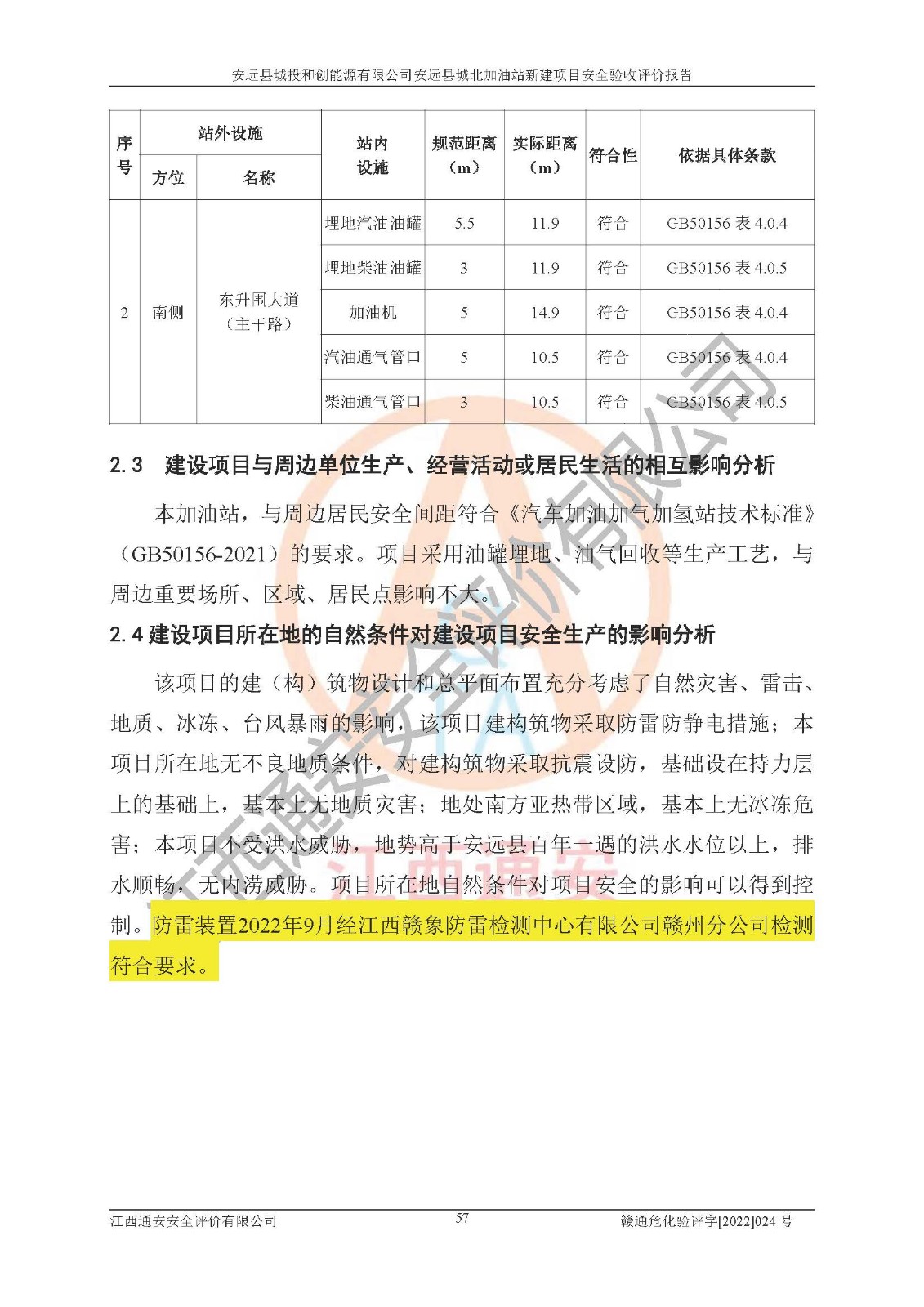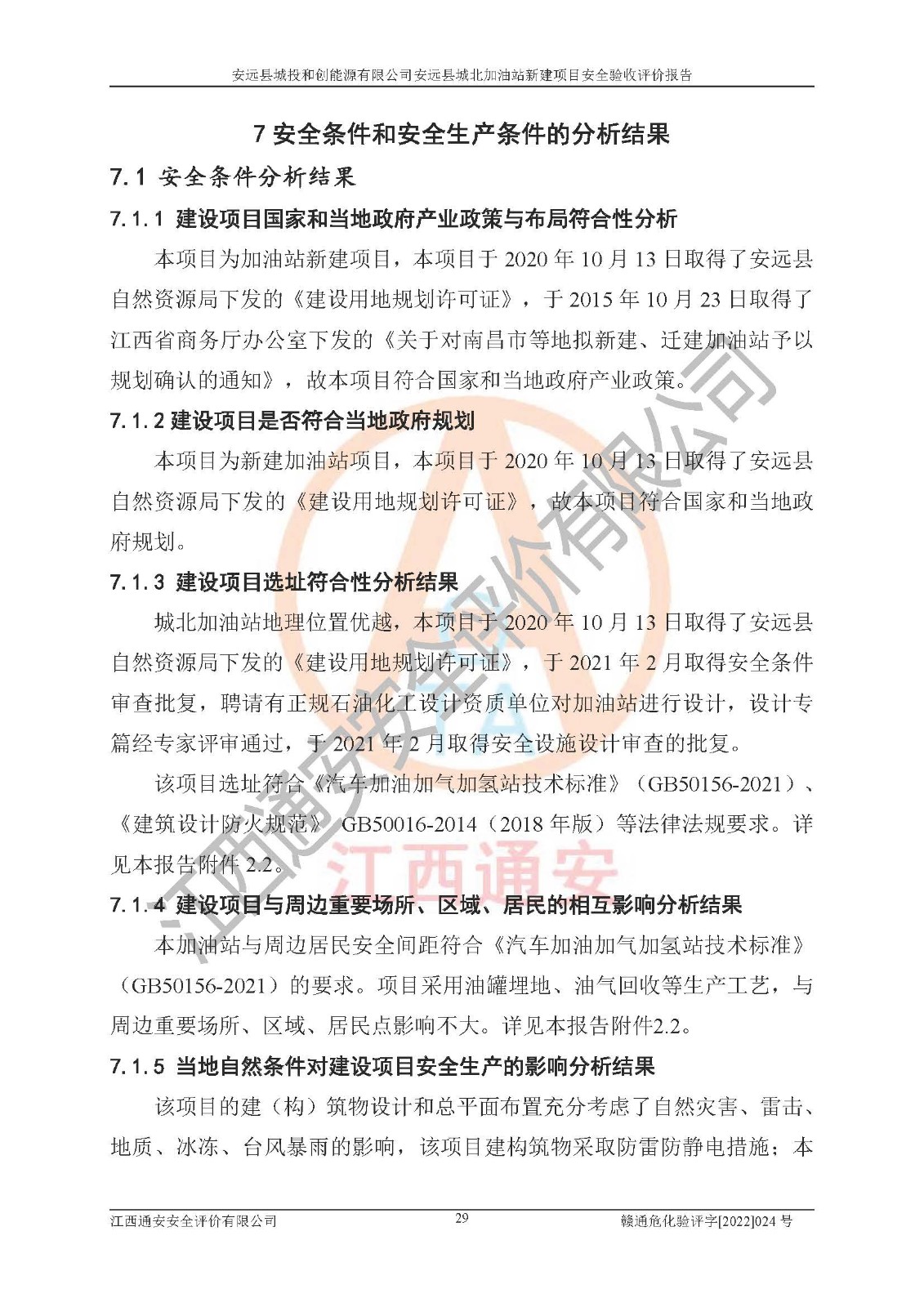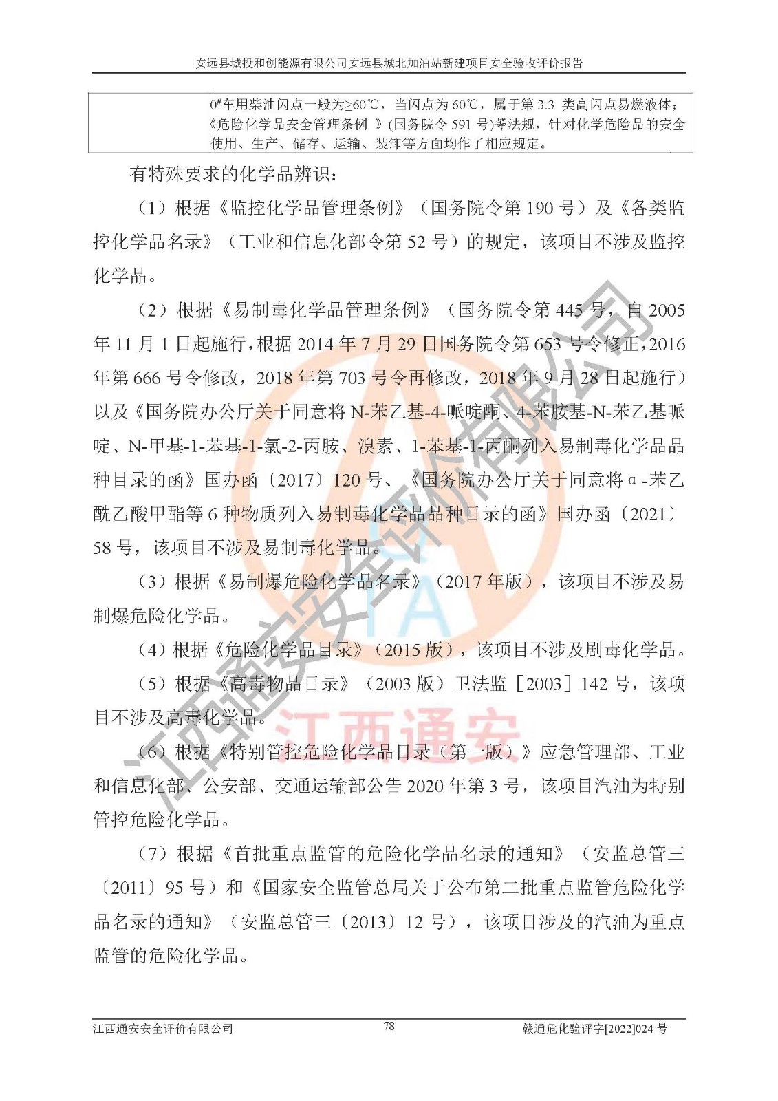 其它 | 安远县城投和创能源有限公司安远县城北加油站新建项目符合**有关安全生产法律、法规和有关标准、规范。认真落实并合理采纳安全条件评价报告及安全设施设计专篇设计中的安全对策、措施及建议;履行了建设项目安全设施“三同时”要求并做到安全设施与主体工程同时设计、同时施工、同时投入生产和使用;对潜在的危险、有害因素采取了安全对策措施,工程潜在的危险、有害因素可得到**控制,风险在**控制和可接受范围内。 该项目安全设施设计专篇设计的安全设施得到落实符合**安全生产方面的法律、法规、标准、规范的要求,符合《危险化学品经营许可证管理办法》**安监总局令第55号的要求,具备安全验收条件,符合安全生产条件。 | ||||