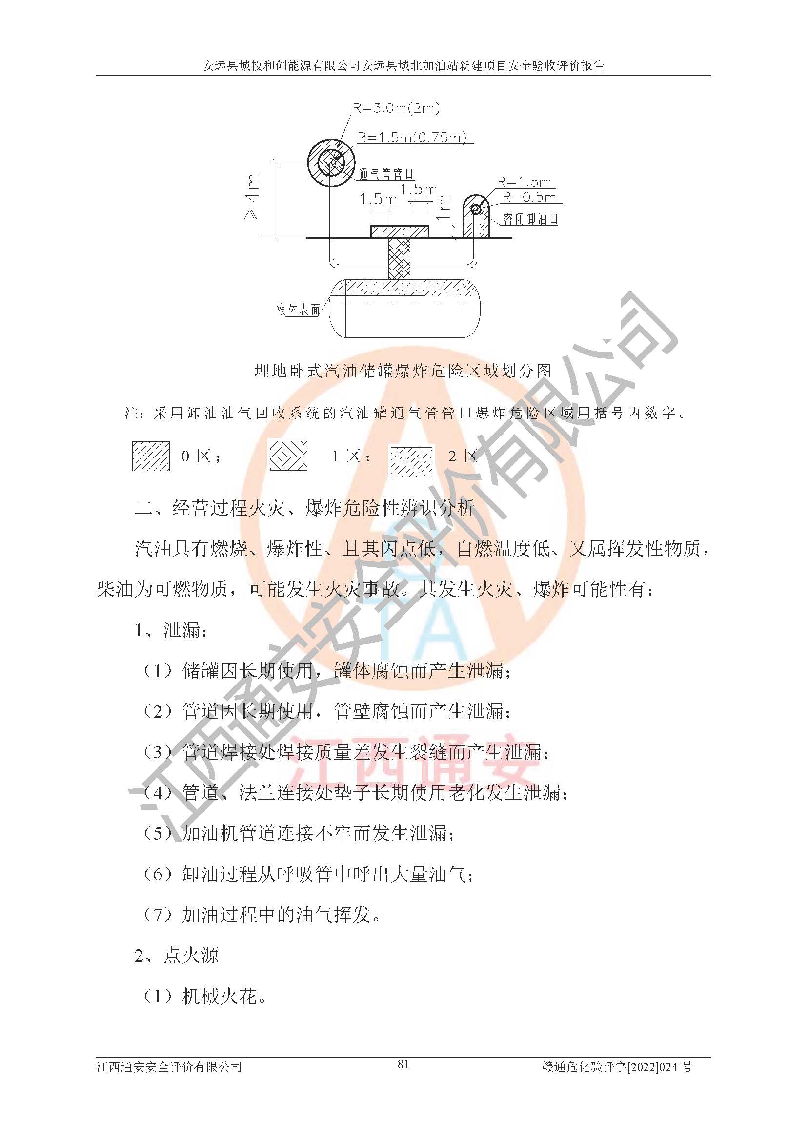 项目简介 | 安远县城投和创能源有限公司安远县城北加油站为成品油零售企业,本站为新建项目,位于江西省赣州市安远县欣山镇东生围大道与环城路交汇西北侧。加油站设有2台30m³汽油卧式SF承重油罐(95#、98#)、1台50m³92#汽油卧式SF承重油罐、1台50m³0#柴油卧式SF承重油罐,总罐容160m³,柴油折半计入总容积为135m³,3台四枪加油机,属于二级加油站。 1、城北加油站所涉及的危险化学品储存和使用场所不构成重大危险源。 2、通过本报告分析, 本项目投入经营后仍将存在多种危险因素,如火灾、爆炸,电气伤害、**伤害、噪声等危险有害因素。而项目*主要的危险、有害因素是火灾、爆炸,对此加油站全体员工**保持**的安全防护意识。 3、经辨识本项目不涉及监控、易制毒、易制爆、剧毒和高毒危险化学品;项目涉及的汽油属于重点监管和特别管控危险化学品,储存经营单位应根据“汽油安全措施和应急处理原则”和《特别管控危险化学品目录(**版)》管控措施严格管理。项目不涉及重点监管危险化工工艺。 4、采用检查表评价法进行加油站安全评价,评价范围内的选址、周边环境和站内外安全间距、设备设施结论为符合要求。油罐设置了渗漏检测仪,对油罐的渗漏情况做实时监控;油罐内设置带有高液位报警功能的液位仪及卸油防溢阀,对罐内油品时刻进行监控,当油罐内油位达到90%立即报警,当油罐内油位达到95%液位后防溢阀自动关闭,油罐车内的油停止向油罐卸油,**了油品不外溢,阻止事故发生;设置紧急切断系统和视频监控系统等安全设施。这些安全设施正常投用并运行良好 。 5、加油站取得了防雷接地检测报告,加油站能够符合安全规范要求。 6、该项目能按照《中华人民共和国安全生产法》的要求履行了“三同时”程序,安全设施按照安全设施与主体工程同时设计、同时施工、同时投入生产和使用的“三同时”的要求进行。 7、项目内部平面布置符合**和行业相关标准、规范的要求。建筑结构、消防、安全设施等布置明确、合理,符合各相关规范的要求,现场布置和设计图纸一致 。 8、该工程的作业条件相对比较安全。在选定的3个单元中可能出现“一般危险”作业环境有2个单元,且“一般危险”作业环境的出现均由物料的危险程度所决定,而其余单元的作业均在“稍有危险”范围,作业条件相对安全。 9、危险度评价汽油储罐区得分为17分,为I级,属于高度危险;柴油储罐区的得分为9分,为III级,属于低度危险。由于采用埋地油罐、密封操作等措施,危险有害程度能控制在可接受的范围。 10、加油站设置了安全**小组,制定了相应的管理制度,操作规程和事故应急预案,加油站的安全管理机构工作有力,加油站安全经营管理处于正常有序状态。 | ||||